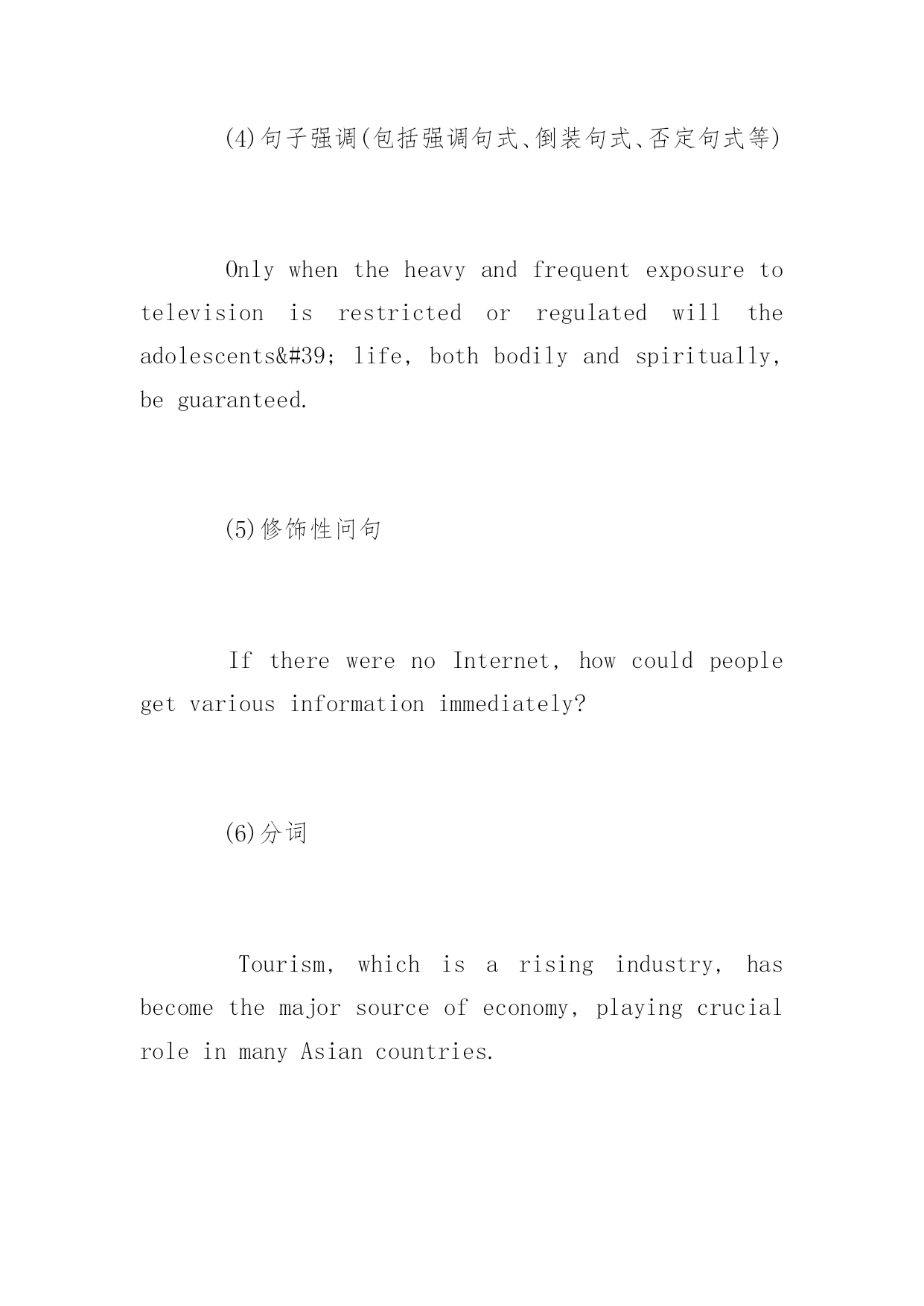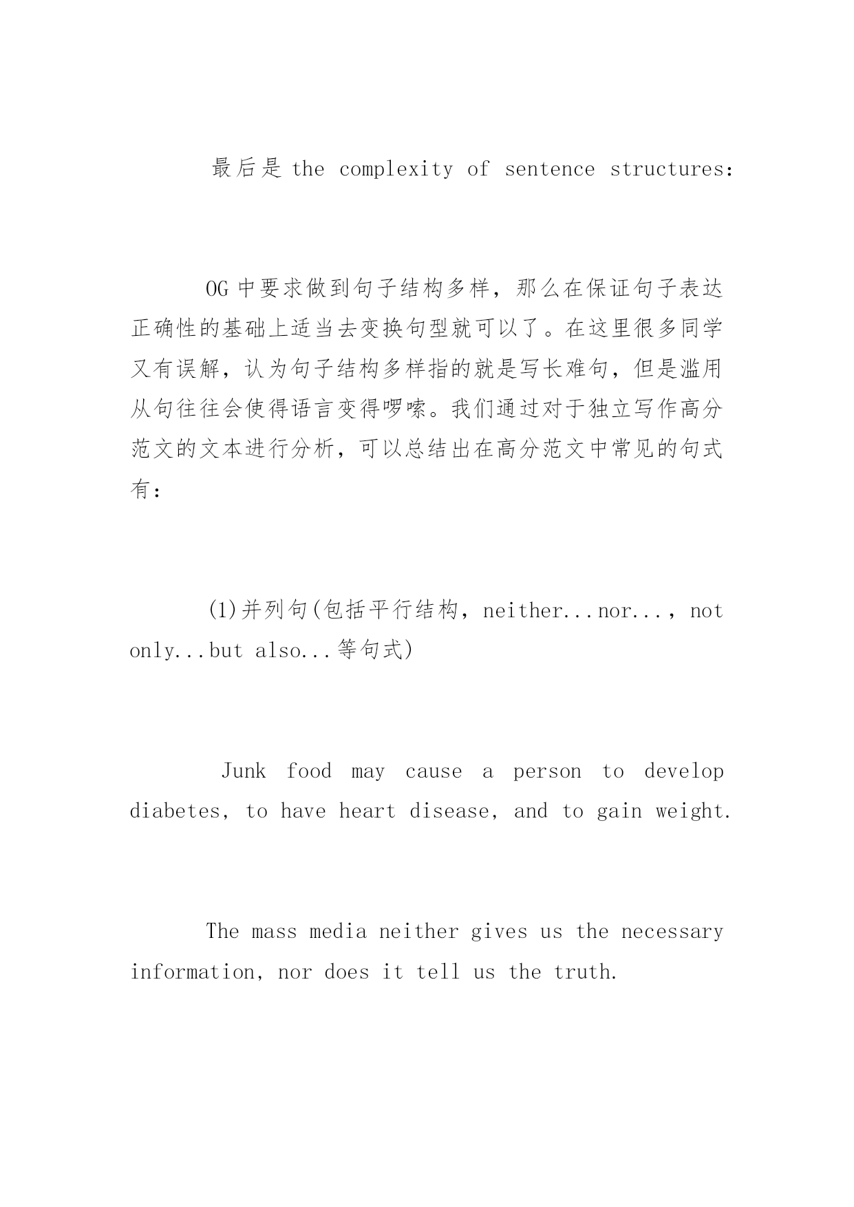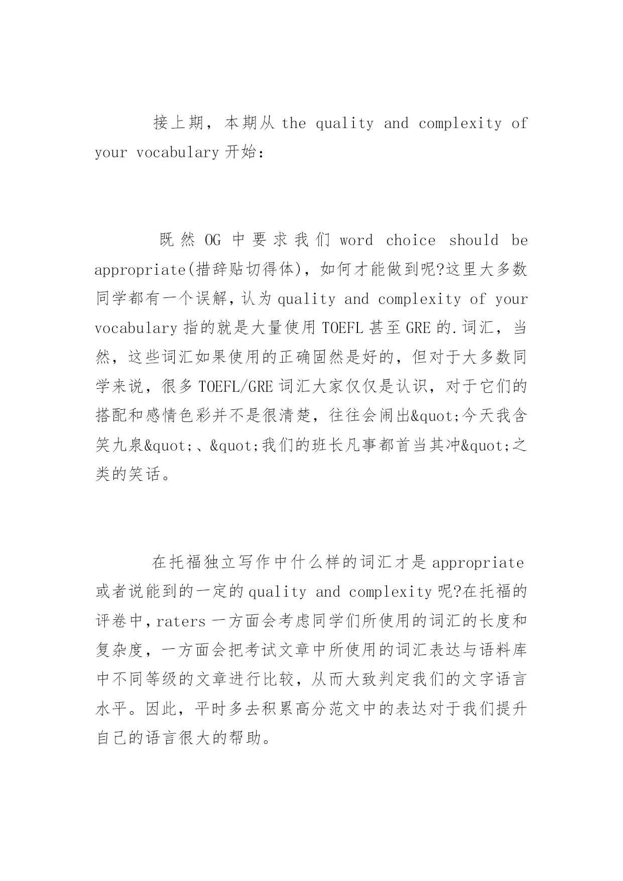 托福写作备考高分技巧 2017年托福写作备考高分技巧 作为一种语言测试方式,托福考试的重点是检测考生的英语语言水平,如何写出正确流畅的语言是得到托福写作单项高分的必备条件。那么如何才能得到阅读高分呢?以下是百分网小编整理的托福写作备考高分技巧,希望对大家有所帮助!更多信息请关注应届毕业生考试网! 托福独立写作部分对于我们写作的总体要求是consistentfacilityintheuseoflanguage(语言运用的和谐流畅),给我们的具体建议是avarietyofsentencestructures(句子结构多样)和wordchoiceshouldbeappropriate(措辞贴切得体),评分者的审查角度是lexicalorgrammarerrors(词汇和语法错误)以及thecomplexityofsentencestructures(句子结构的复杂程度)和thequalityandcomplexityofyourvocabulary(考生所使用的词汇的质量和复杂程度)。接下来李盛老师分别先从语法错误、措辞和句子结构三个方面来探讨备考过程中应该注意的事项: 接上期,本期从thequalityandcomplexityofyourvocabulary开始: 既然OG中要求我们wordchoiceshouldbeappropriate(措辞贴切得体),如何才能做到呢?这里大多数同学都有一个误解,认为qualityandcomplexityofyourvocabulary指的就是大量使用TOEFL甚至GRE的.词汇,当然,这些词汇如果使用的正确固然是好的,但对于大多数同学来说,很多TOEFL/GRE词汇大家仅仅是认识,对于它们的搭配和感情色彩并不是很清楚,往往会闹出"今天我含笑九泉"、"我们的班长凡事都首当其冲"之类的笑话。 在托福独立写作中什么样的词汇才是appropriate或者说能到的一定的qualityandcomplexity呢?在托福的评卷中,raters一方面会考虑同学们所使用的词汇的长度和复杂度,一方面会把考试文章中所使用的词汇表达与语料库中不同等级的文章进行比较,从而大致判定我们的文字语言水平。因此,平时多去积累高分范文中的表达对于我们提升自己的语言很大的帮助。 最后是thecomplexityofsentencestructures: OG中要求做到句子结构多样,那么在保证句子表达正确性的基础上适当去变换句型就可以了。在这里很多同学又有误解,认为句子结构多样指的就是写长难句,但是滥用从句往往会使得语言变得啰嗦。我们通过对于独立写作高分范文的文本进行分析,可以总结出在高分范文中常见的句式有: (1)并列句(包括平行结构,neither...nor...,notonly...butalso...等句式) Junkfoodmaycauseapersontodevelopdiabetes,tohaveheartdisease,andtogainweight. Themassmedianeithergivesusthenecessaryinformation,nordoesittellusthetruth. (2)从句(包括名词性从句、形容词性从句、副词性从句) Whatkindofpersonyouwishtobecomeismoreimportantthanwhatkindofjobyouwillhave. Noonecandenythebasicfactthatitisimpossibleforaverageworkerstomasterthosehigh-technologyskillseasily. (3)插入语 After-hoursstudy,ifproperlymanaged,holdsthekeytosuccessinthe21stcentury. Collegestudents,lackingsocialexperience,areeasilycheated. (4)句子强调(包括强调句式、倒装句式、否定句式等) Onlywhentheheavyandfrequentexposuretotelevisionisrestrictedorregulatedwilltheadolescents'life,bothbodilyandspiritually,beguaranteed. (5)修饰性问句 IftherewerenoInternet,howcouldpeoplegetvariousinformationimmediately? (6)分词 Tourism,whichisarisingindustry,hasbecomethemajorsourc