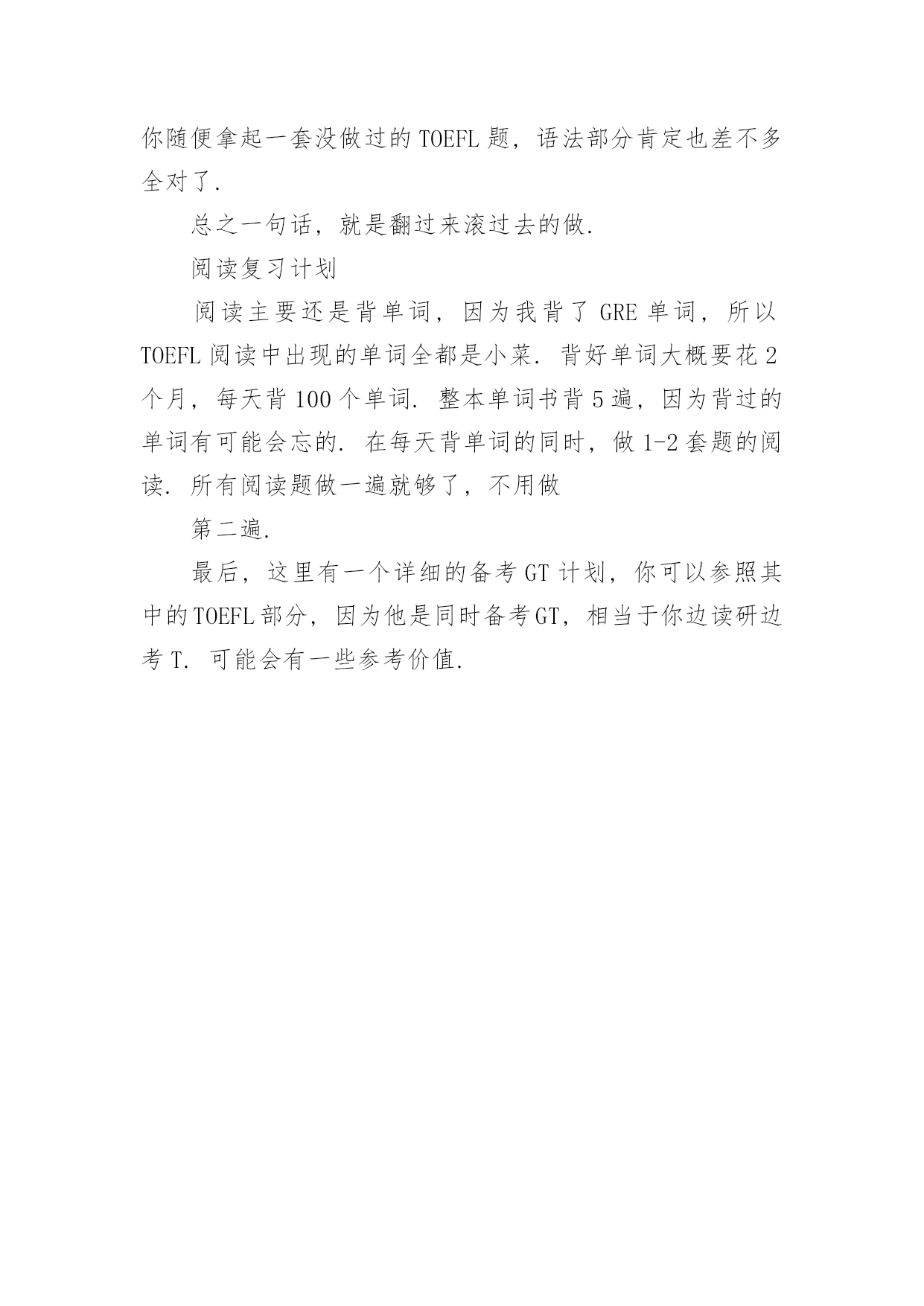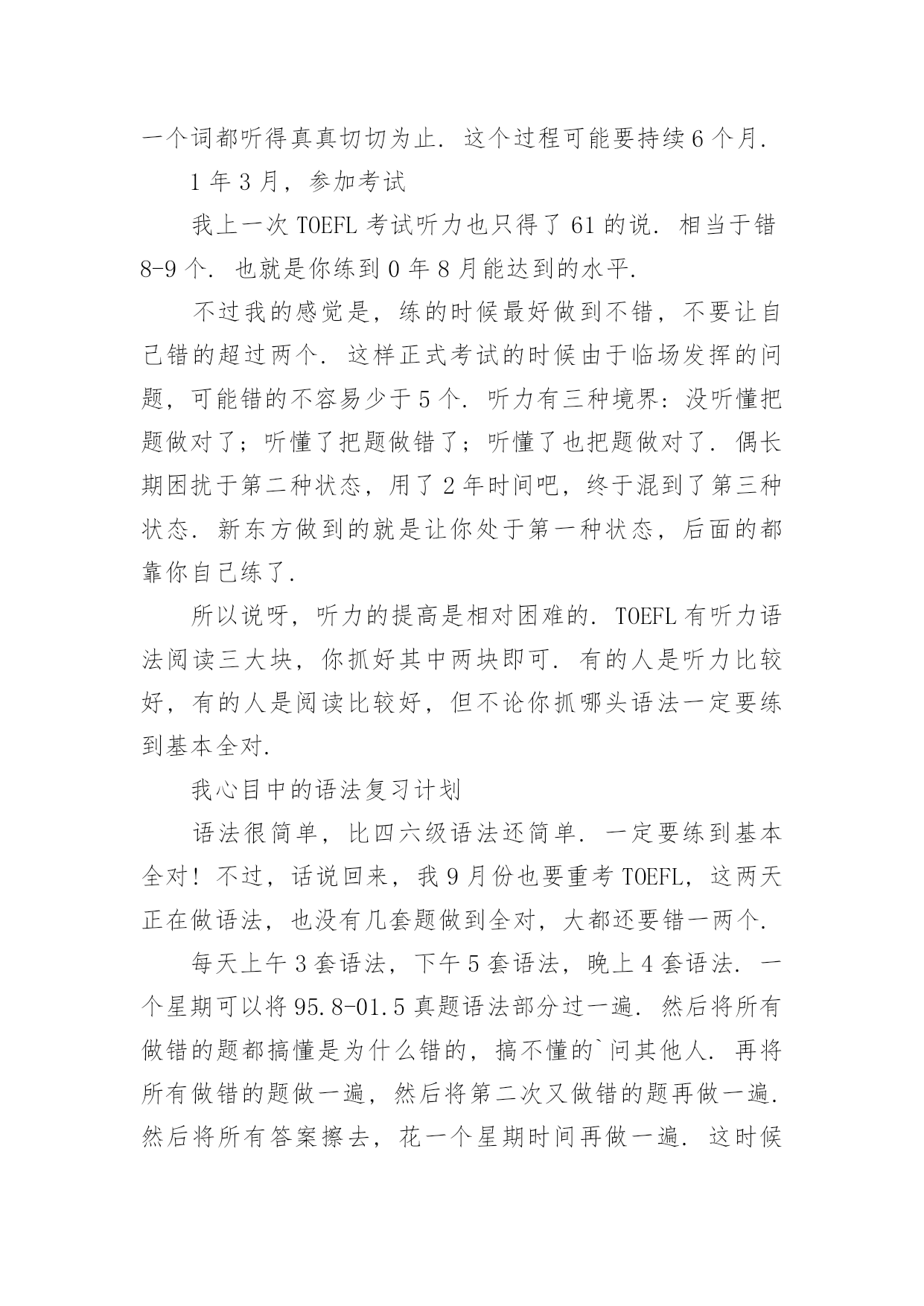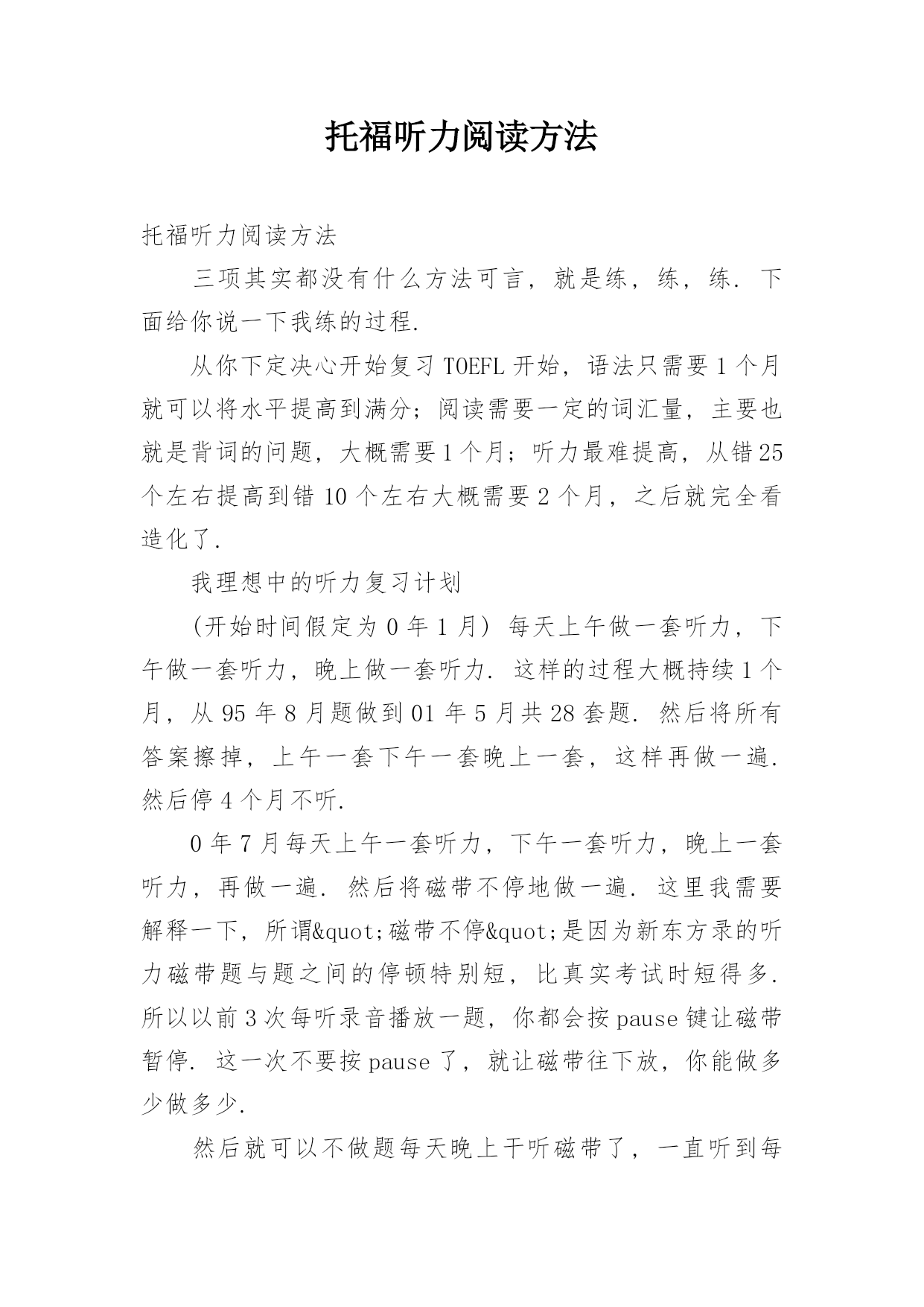 托福听力阅读方法 托福听力阅读方法三项其实都没有什么方法可言,就是练,练,练.下面给你说一下我练的过程.从你下定决心开始复习TOEFL开始,语法只需要1个月就可以将水平提高到满分;阅读需要一定的词汇量,主要也就是背词的问题,大概需要1个月;听力最难提高,从错25个左右提高到错10个左右大概需要2个月,之后就完全看造化了.我理想中的听力复习计划(开始时间假定为0年1月)每天上午做一套听力,下午做一套听力,晚上做一套听力.这样的过程大概持续1个月,从95年8月题做到01年5月共28套题.然后将所有答案擦掉,上午一套下午一套晚上一套,这样再做一遍.然后停4个月不听.0年7月每天上午一套听力,下午一套听力,晚上一套听力,再做一遍.然后将磁带不停地做一遍.这里我需要解释一下,所谓"磁带不停"是因为新东方录的听力磁带题与题之间的停顿特别短,比真实考试时短得多.所以以前3次每听录音播放一题,你都会按pause键让磁带暂停.这一次不要按pause了,就让磁带往下放,你能做多少做多少.然后就可以不做题每天晚上干听磁带了,一直听到每一个词都听得真真切切为止.这个过程可能要持续6个月.1年3月,参加考试我上一次TOEFL考试听力也只得了61的说.相当于错8-9个.也就是你练到0年8月能达到的水平.不过我的感觉是,练的时候最好做到不错,不要让自己错的超过两个.这样正式考试的时候由于临场发挥的问题,可能错的不容易少于5个.听力有三种境界:没听懂把题做对了;听懂了把题做错了;听懂了也把题做对了.偶长期困扰于第二种状态,用了2年时间吧,终于混到了第三种状态.新东方做到的就是让你处于第一种状态,后面的都靠你自己练了.所以说呀,听力的提高是相对困难的.TOEFL有听力语法阅读三大块,你抓好其中两块即可.有的人是听力比较好,有的人是阅读比较好,但不论你抓哪头语法一定要练到基本全对.我心目中的语法复习计划语法很简单,比四六级语法还简单.一定要练到基本全对!不过,话说回来,我9月份也要重考TOEFL,这两天正在做语法,也没有几套题做到全对,大都还要错一两个.每天上午3套语法,下午5套语法,晚上4套语法.一个星期可以将95.8-01.5真题语法部分过一遍.然后将所有做错的题都搞懂是为什么错的,搞不懂的`问其他人.再将所有做错的题做一遍,然后将第二次又做错的题再做一遍.然后将所有答案擦去,花一个星期时间再做一遍.这时候你随便拿起一套没做过的TOEFL题,语法部分肯定也差不多全对了.总之一句话,就是翻过来滚过去的做.阅读复习计划阅读主要还是背单词,因为我背了GRE单词,所以TOEFL阅读中出现的单词全都是小菜.背好单词大概要花2个月,每天背100个单词.整本单词书背5遍,因为背过的单词有可能会忘的.在每天背单词的同时,做1-2套题的阅读.所有阅读题做一遍就够了,不用做第二遍.最后,这里有一个详细的备考GT计划,你可以参照其中的TOEFL部分,因为他是同时备考GT,相当于你边读研边考T.可能会有一些参考价值.