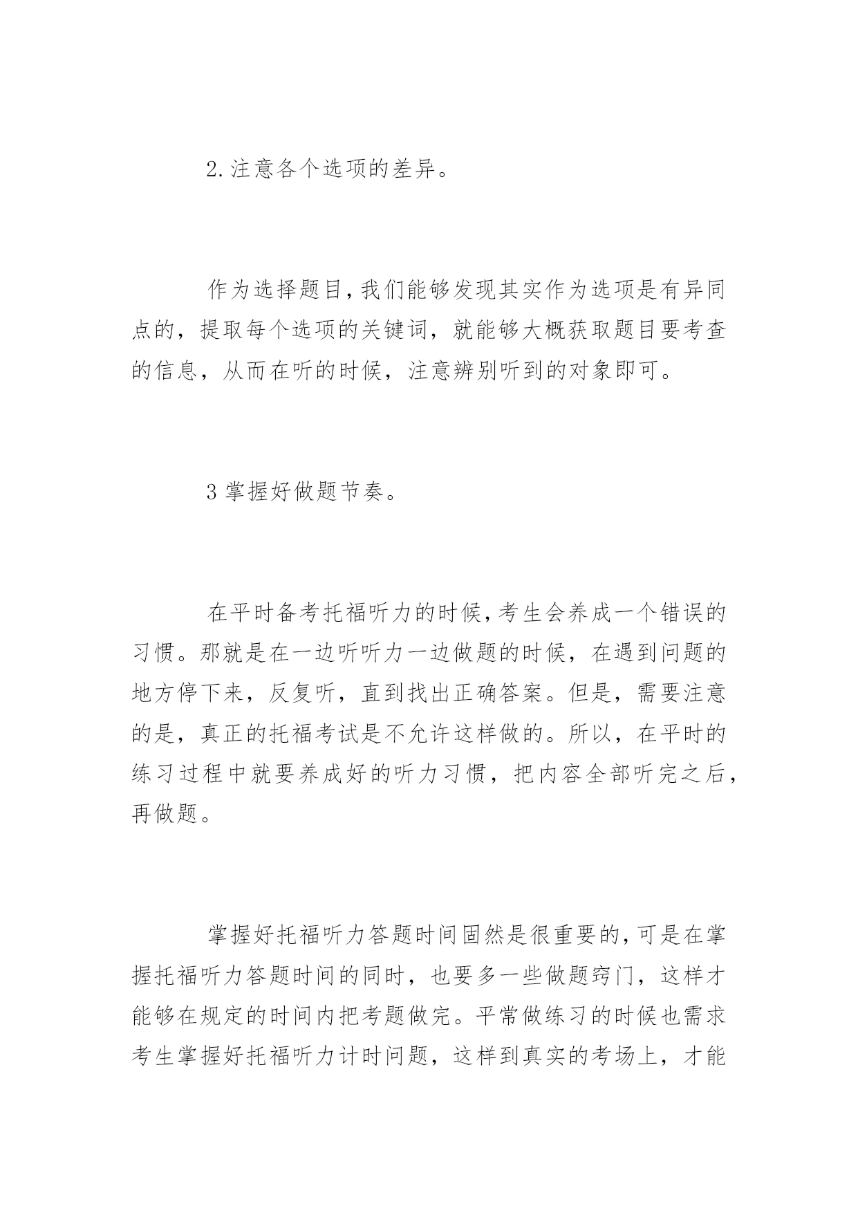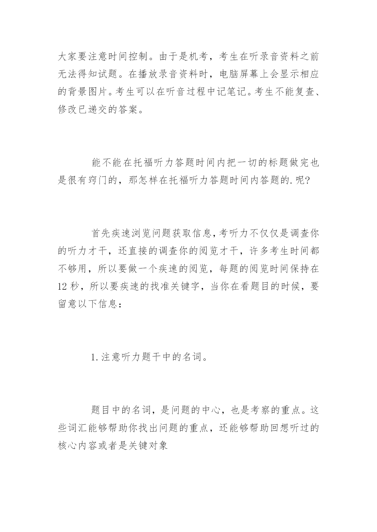 托福听力计时问题答题技巧 2016年托福听力计时问题答题技巧 针对托福考试中,小编自认为最难的就是听力部分。对于考生来说听力部分最难的就是时间的把握。针对听力中稍纵即逝的音频,我们如何把握时间会比较科学呢?本文主要和大家分享托福听力计时问题,帮助大家规划好答题方法和技巧。 托福听力一般情况下是60分钟,包括两个section。如果遇到加试就是90分钟,三个section。 每个section里有20分钟录音时间和10分钟答题时间。每个section里有1个对话(包括5个问题)2个讲座(每个讲座6个问题,共12个问题)。一个section共17个问题,答题时间是10分钟。这样算来,平均每个题目的答题时间是30多秒。 每道题目回答完成之后会自动进入下一个题目,因此大家要注意时间控制。由于是机考,考生在听录音资料之前无法得知试题。在播放录音资料时,电脑屏幕上会显示相应的背景图片。考生可以在听音过程中记笔记。考生不能复查、修改已递交的答案。 能不能在托福听力答题时间内把一切的标题做完也是很有窍门的,那怎样在托福听力答题时间内答题的.呢? 首先疾速浏览问题获取信息,考听力不仅仅是调查你的听力才干,还直接的调查你的阅览才干,许多考生时间都不够用,所以要做一个疾速的阅览,每题的阅览时间保持在12秒,所以要疾速的找准关键字,当你在看题目的时候,要留意以下信息: 1.注意听力题干中的名词。 题目中的名词,是问题的中心,也是考察的重点。这些词汇能够帮助你找出问题的重点,还能够帮助回想听过的核心内容或者是关键对象 2.注意各个选项的差异。 作为选择题目,我们能够发现其实作为选项是有异同点的,提取每个选项的关键词,就能够大概获取题目要考查的信息,从而在听的时候,注意辨别听到的对象即可。 3掌握好做题节奏。 在平时备考托福听力的时候,考生会养成一个错误的习惯。那就是在一边听听力一边做题的时候,在遇到问题的地方停下来,反复听,直到找出正确答案。但是,需要注意的是,真正的托福考试是不允许这样做的。所以,在平时的练习过程中就要养成好的听力习惯,把内容全部听完之后,再做题。 掌握好托福听力答题时间固然是很重要的,可是在掌握托福听力答题时间的同时,也要多一些做题窍门,这样才能够在规定的时间内把考题做完。平常做练习的时候也需求考生掌握好托福听力计时问题,这样到真实的考场上,才能临危不乱。