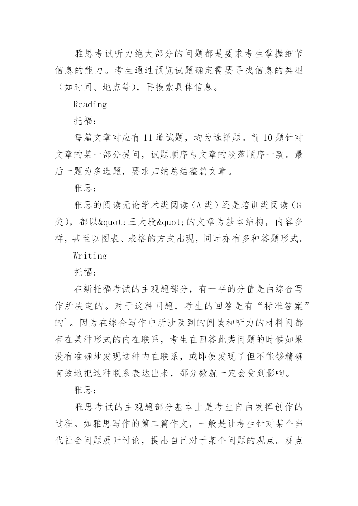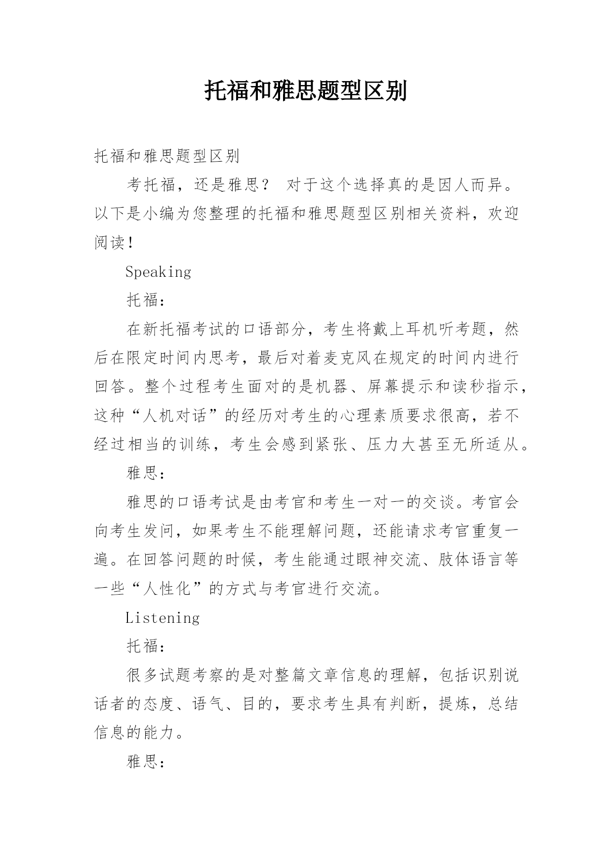 托福和雅思题型区别 托福和雅思题型区别考托福,还是雅思?对于这个选择真的是因人而异。以下是小编为您整理的托福和雅思题型区别相关资料,欢迎阅读!Speaking托福:在新托福考试的口语部分,考生将戴上耳机听考题,然后在限定时间内思考,最后对着麦克风在规定的时间内进行回答。整个过程考生面对的是机器、屏幕提示和读秒指示,这种“人机对话”的经历对考生的心理素质要求很高,若不经过相当的训练,考生会感到紧张、压力大甚至无所适从。雅思:雅思的口语考试是由考官和考生一对一的交谈。考官会向考生发问,如果考生不能理解问题,还能请求考官重复一遍。在回答问题的时候,考生能通过眼神交流、肢体语言等一些“人性化”的方式与考官进行交流。Listening托福:很多试题考察的是对整篇文章信息的理解,包括识别说话者的态度、语气、目的,要求考生具有判断,提炼,总结信息的能力。雅思:雅思考试听力绝大部分的问题都是要求考生掌握细节信息的能力。考生通过预览试题确定需要寻找信息的类型(如时间、地点等),再搜索具体信息。Reading托福:每篇文章对应有11道试题,均为选择题。前10题针对文章的某一部分提问,试题顺序与文章的段落顺序一致。最后一题为多选题,要求归纳总结整篇文章。雅思:雅思的阅读无论学术类阅读(A类)还是培训类阅读(G类),都以"三大段"的文章为基本结构,内容多样,甚至以图表、表格的方式出现,同时亦有多种答题形式。Writing托福:在新托福考试的主观题部分,有一半的分值是由综合写作所决定的。对于这种问题,考生的回答是有“标准答案”的`。因为在综合写作中所涉及到的阅读和听力的材料间都存在某种形式的内在联系,考生在回答此类问题的时候如果没有准确地发现这种内在联系,或即使发现了但不能够精确有效地把这种联系表达出来,那分数就一定会受到影响。雅思:雅思考试的主观题部分基本上是考生自由发挥创作的过程。如雅思写作的第二篇作文,一般是让考生针对某个当代社会问题展开讨论,提出自己对于某个问题的观点。观点的提出是很自由的,论证的过程也可以极具个性化,因为雅思写作考察的不是观点的正误,而是考生用合适的论据证明自己观点的能力。