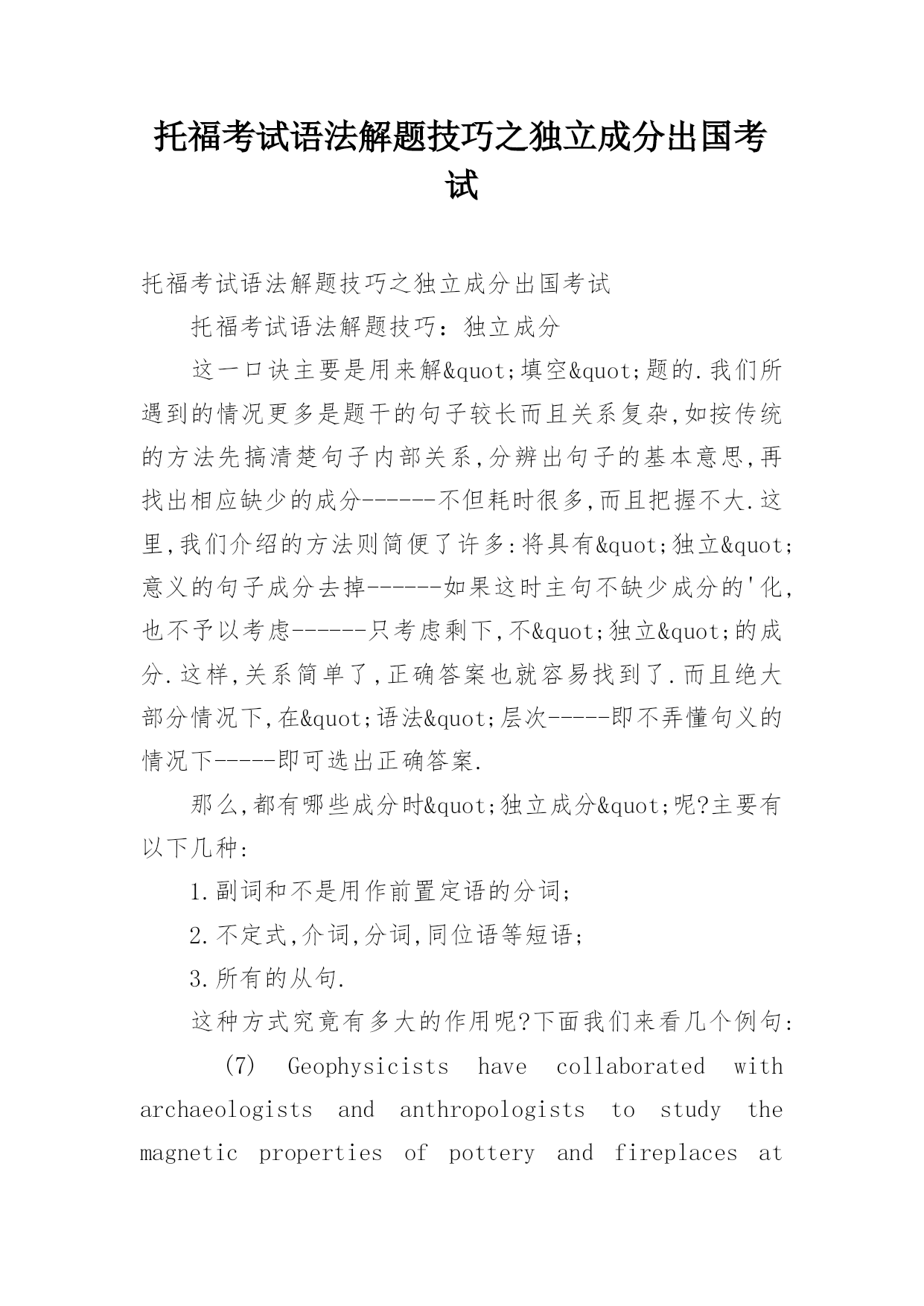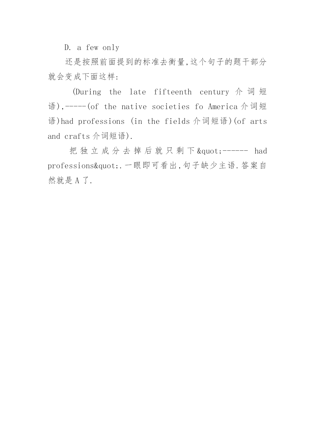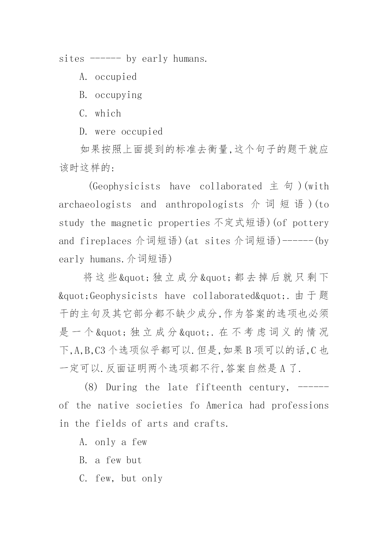 托福考试语法解题技巧之独立成分出国考试 托福考试语法解题技巧之独立成分出国考试托福考试语法解题技巧:独立成分这一口诀主要是用来解"填空"题的.我们所遇到的情况更多是题干的句子较长而且关系复杂,如按传统的方法先搞清楚句子内部关系,分辨出句子的基本意思,再找出相应缺少的成分------不但耗时很多,而且把握不大.这里,我们介绍的方法则简便了许多:将具有"独立"意义的句子成分去掉------如果这时主句不缺少成分的'化,也不予以考虑------只考虑剩下,不"独立"的成分.这样,关系简单了,正确答案也就容易找到了.而且绝大部分情况下,在"语法"层次-----即不弄懂句义的情况下-----即可选出正确答案.那么,都有哪些成分时"独立成分"呢?主要有以下几种:1.副词和不是用作前置定语的分词;2.不定式,介词,分词,同位语等短语;3.所有的从句.这种方式究竟有多大的作用呢?下面我们来看几个例句:(7)Geophysicistshavecollaboratedwitharchaeologistsandanthropologiststostudythemagneticpropertiesofpotteryandfireplacesatsites------byearlyhumans.A.occupiedB.occupyingC.whichD.wereoccupied如果按照上面提到的标准去衡量,这个句子的题干就应该时这样的:(Geophysicistshavecollaborated主句)(witharchaeologistsandanthropologists介词短语)(tostudythemagneticproperties不定式短语)(ofpotteryandfireplaces介词短语)(atsites介词短语)------(byearlyhumans.介词短语)将这些"独立成分"都去掉后就只剩下"Geophysicistshavecollaborated".由于题干的主句及其它部分都不缺少成分,作为答案的选项也必须是一个"独立成分".在不考虑词义的情况下,A,B,C3个选项似乎都可以.但是,如果B项可以的话,C也一定可以.反面证明两个选项都不行,答案自然是A了.(8)Duringthelatefifteenthcentury,------ofthenativesocietiesfoAmericahadprofessionsinthefieldsofartsandcrafts.A.onlyafewB.afewbutC.few,butonlyD.afewonly还是按照前面提到的标准去衡量,这个句子的题干部分就会变成下面这样:(Duringthelatefifteenthcentury介词短语),-----(ofthenativesocietiesfoAmerica介词短语)hadprofessions(inthefields介词短语)(ofartsandcrafts介词短语).把独立成分去掉后就只剩下"------hadprofessions".一眼即可看出,句子缺少主语.答案自然就是A了.
