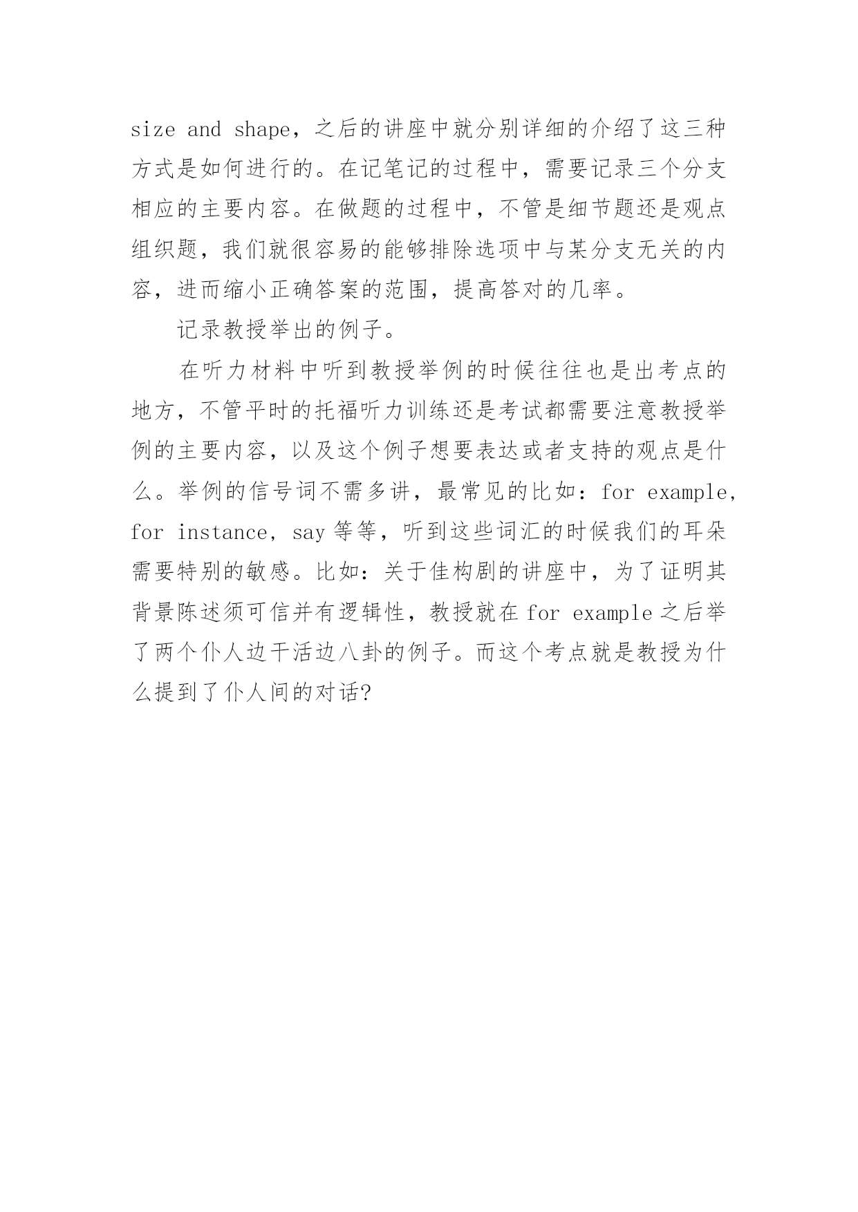 托福英语听力技巧 托福英语听力技巧记清开头。托福听力的开头部分一般是出主旨题的考点,所以我们需要特别注意听力材料开头部分关键词之后的内容,也就是我们需要找到的主旨。只有抓住了文章的主旨,才能更好的去理解文章的筋骨和脉络,以及涉及到的分支。我们需要记录的`是“let’stalkabout…/TodayIwannatalkabout…/let’scontinueourdiscussionabout…”等之后的名词性短语,也就是文章的主旨。比如:Todaywearegoingtotalkaboutafilm-makerwhobeganmakingveryuniquefilmsinthelate1920s.关键词“wearegoingtotalkabout”之后的名词性短语就是我们需要文章的主旨——一个风格独特的早期电影人。记录主要分支、分论点。分支和分论点一般在总分结构的文章,以及一些描述事情发展的条件或者过程中都会涉及。我们需要特别注意教授提到的明确或隐含的分支分类,以及过程类的关键词。要对分类,过程,对比的具体内容敏感,并且进行简要的记录,这些都是一些托福听力技巧。比如关于章鱼的讲座中,教授就明确地提到了其保护自己的三种方式:bychangingcolor,bychangingitstexture,andbychangingitssizeandshape,之后的讲座中就分别详细的介绍了这三种方式是如何进行的。在记笔记的过程中,需要记录三个分支相应的主要内容。在做题的过程中,不管是细节题还是观点组织题,我们就很容易的能够排除选项中与某分支无关的内容,进而缩小正确答案的范围,提高答对的几率。记录教授举出的例子。在听力材料中听到教授举例的时候往往也是出考点的地方,不管平时的托福听力训练还是考试都需要注意教授举例的主要内容,以及这个例子想要表达或者支持的观点是什么。举例的信号词不需多讲,最常见的比如:forexample,forinstance,say等等,听到这些词汇的时候我们的耳朵需要特别的敏感。比如:关于佳构剧的讲座中,为了证明其背景陈述须可信并有逻辑性,教授就在forexample之后举了两个仆人边干活边八卦的例子。而这个考点就是教授为什么提到了仆人间的对话?