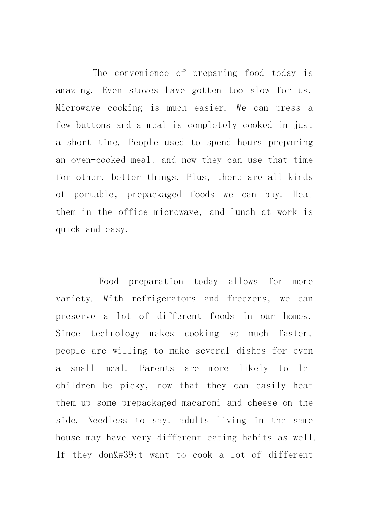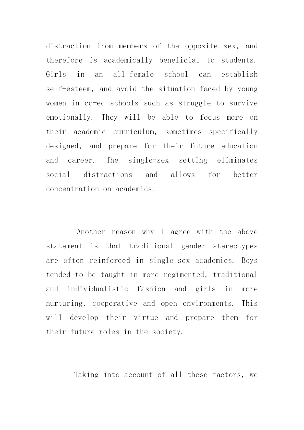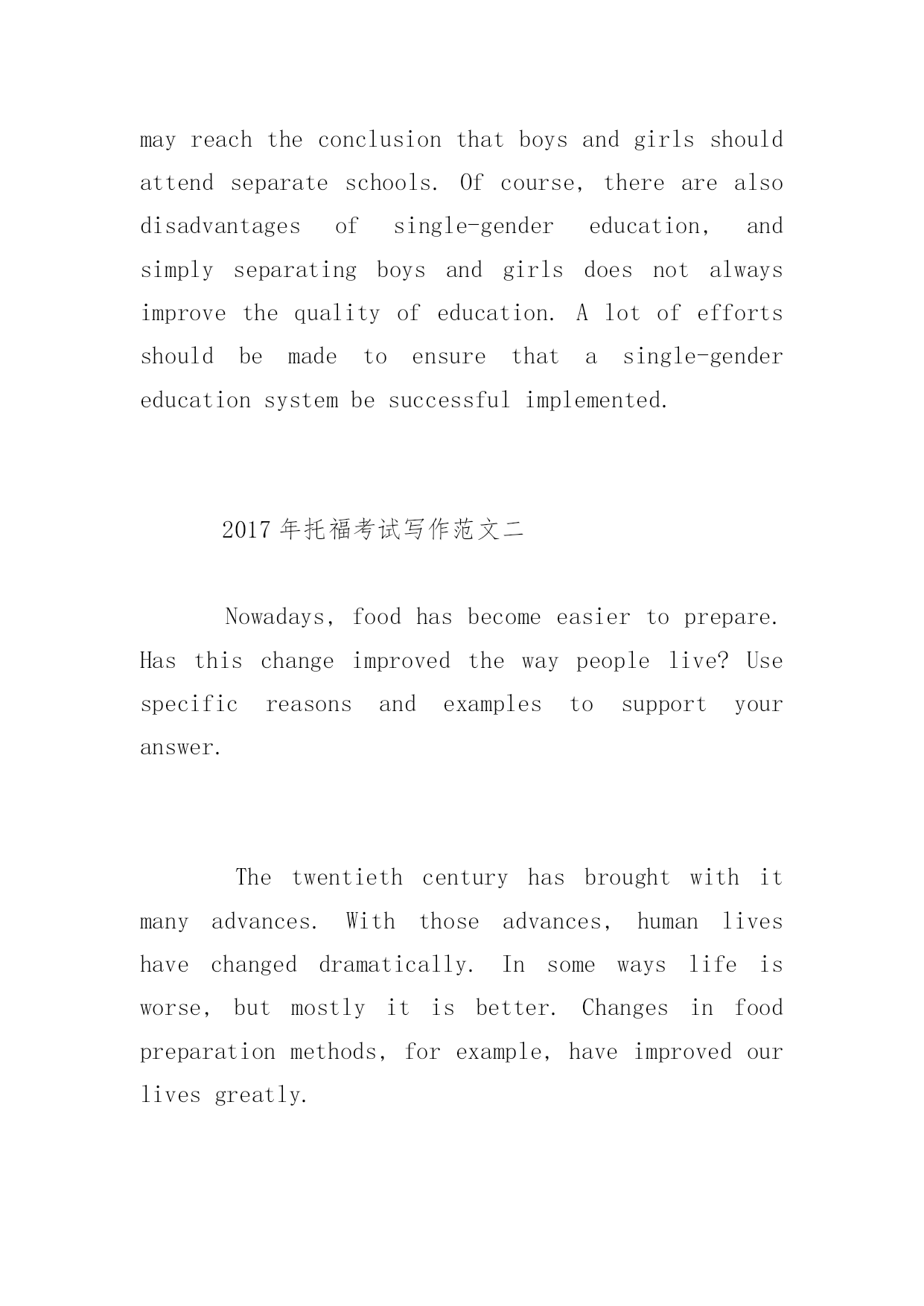 托福考试写作 2017年托福考试写作范文 由于托福考试每年都有许多场,试题更新快,所以考生备考时最好能够选取最新的托福考试复习题。下面,为大家送上2017年托福考试写作范文两篇。 2017年托福考试写作范文一 Nowadays,somemayholdtheopinionthatboysandgirlsshouldattendseparateschools,othershaveanegativeattitude.AsfarasIamconcerned,Iagreethatboysandgirlsshouldgotoseparateschools.Myargumentsforthispointarelistedasfollows. Iagreewiththestatementsincesingle-sexeducationprovideaenvironmentforboysandgirlstoconcentrateontheirstudy.Researchshowsthatasingle-sexschoolenvironmentcaneliminatethedistractionfrommembersoftheoppositesex,andthereforeisacademicallybeneficialtostudents.Girlsinanall-femaleschoolcanestablishself-esteem,andavoidthesituationfacedbyyoungwomeninco-edschoolssuchasstruggletosurviveemotionally.Theywillbeabletofocusmoreontheiracademiccurriculum,sometimesspecificallydesigned,andpreparefortheirfutureeducationandcareer.Thesingle-sexsettingeliminatessocialdistractionsandallowsforbetterconcentrationonacademics. AnotherreasonwhyIagreewiththeabovestatementisthattraditionalgenderstereotypesareoftenreinforcedinsingle-sexacademies.Boystendedtobetaughtinmoreregimented,traditionalandindividualisticfashionandgirlsinmorenurturing,cooperativeandopenenvironments.Thiswilldeveloptheirvirtueandpreparethemfortheirfuturerolesinthesociety. Takingintoaccountofallthesefactors,wemayreachtheconclusionthatboysandgirlsshouldattendseparateschools.Ofcourse,therearealsodisadvantagesofsingle-gendereducation,andsimplyseparatingboysandgirlsdoesnotalwaysimprovethequalityofeducation.Alotofeffortsshouldbemadetoensurethatasingle-gendereducationsystembesuccessfulimplemented. 2017年托福考试写作范文二 Nowadays,foodhasbecomeeasiertoprepare.Hasthischangeimprovedthewaypeoplelive?Usespecificreasonsandexamplestosupportyouranswer. Thetwentiethcenturyhasbroughtwithitmanyadvances.Withthoseadvances,humanliveshavechangeddramatically.Insomewayslifeisworse,butmostlyitisbetter.Changesinfoodpreparationmethods,forexample,haveimprovedourlivesgreatly. Theconvenienceofpreparingfoodtodayisamazing.Evenstoveshavegottentooslowforus.Mic