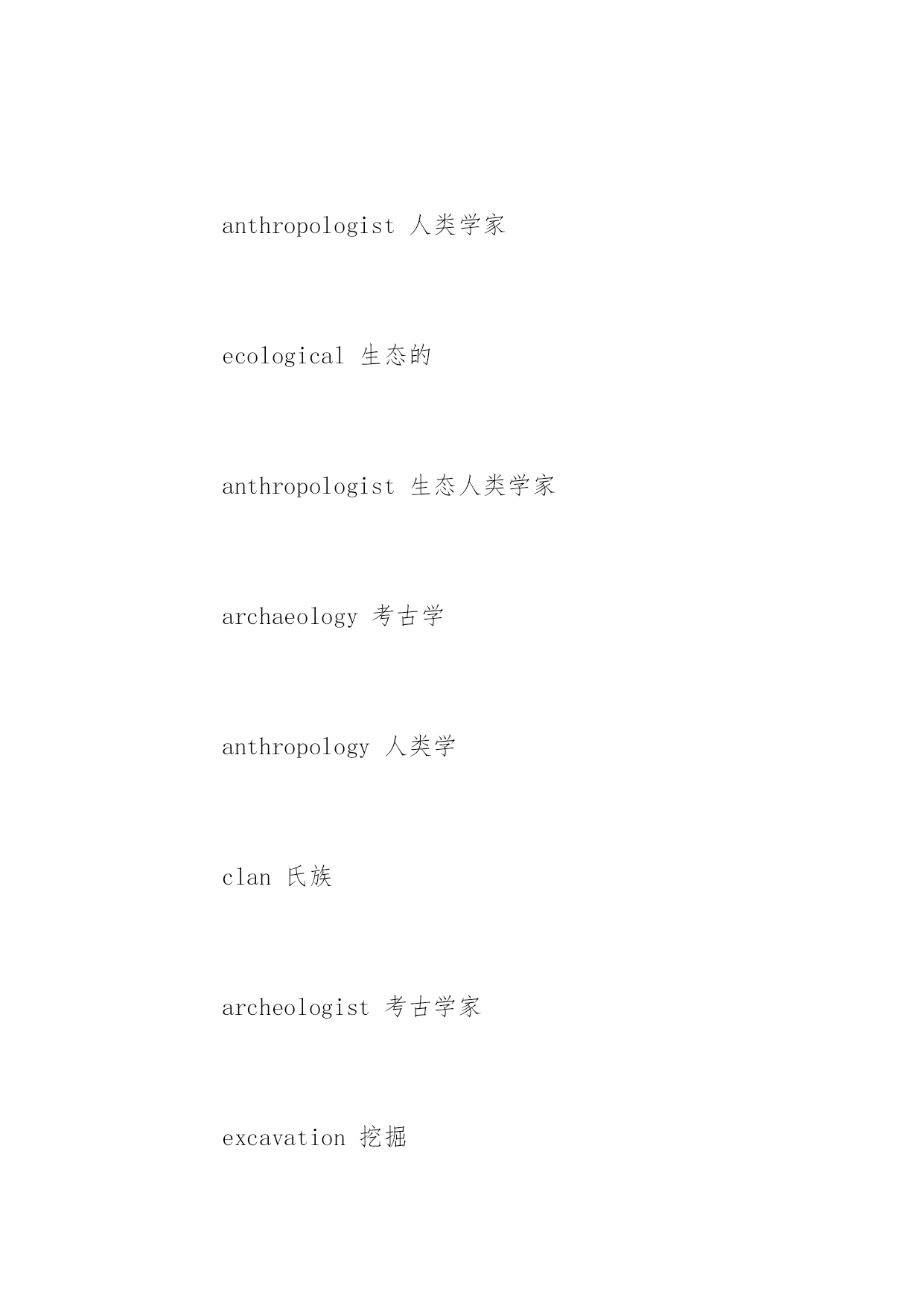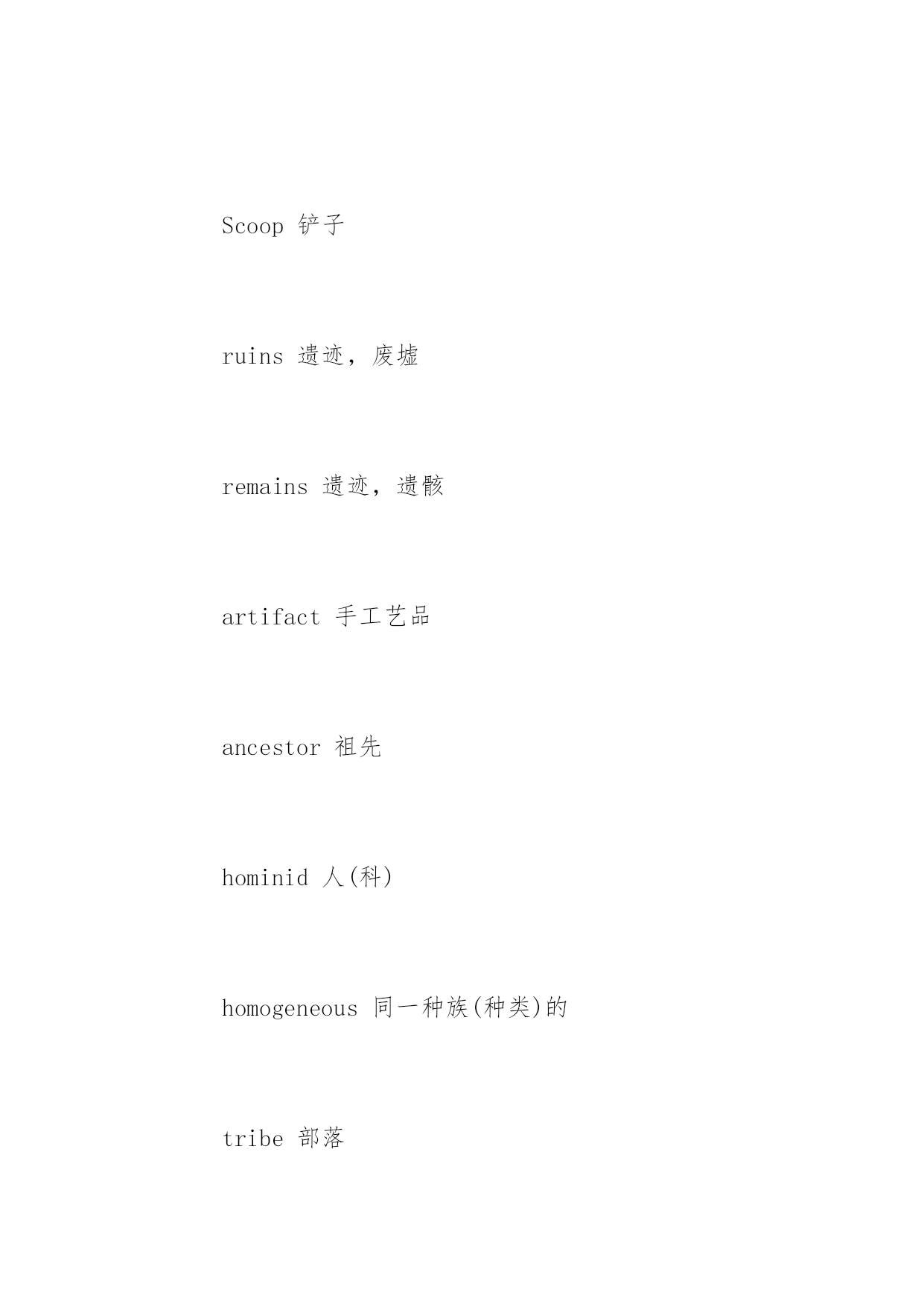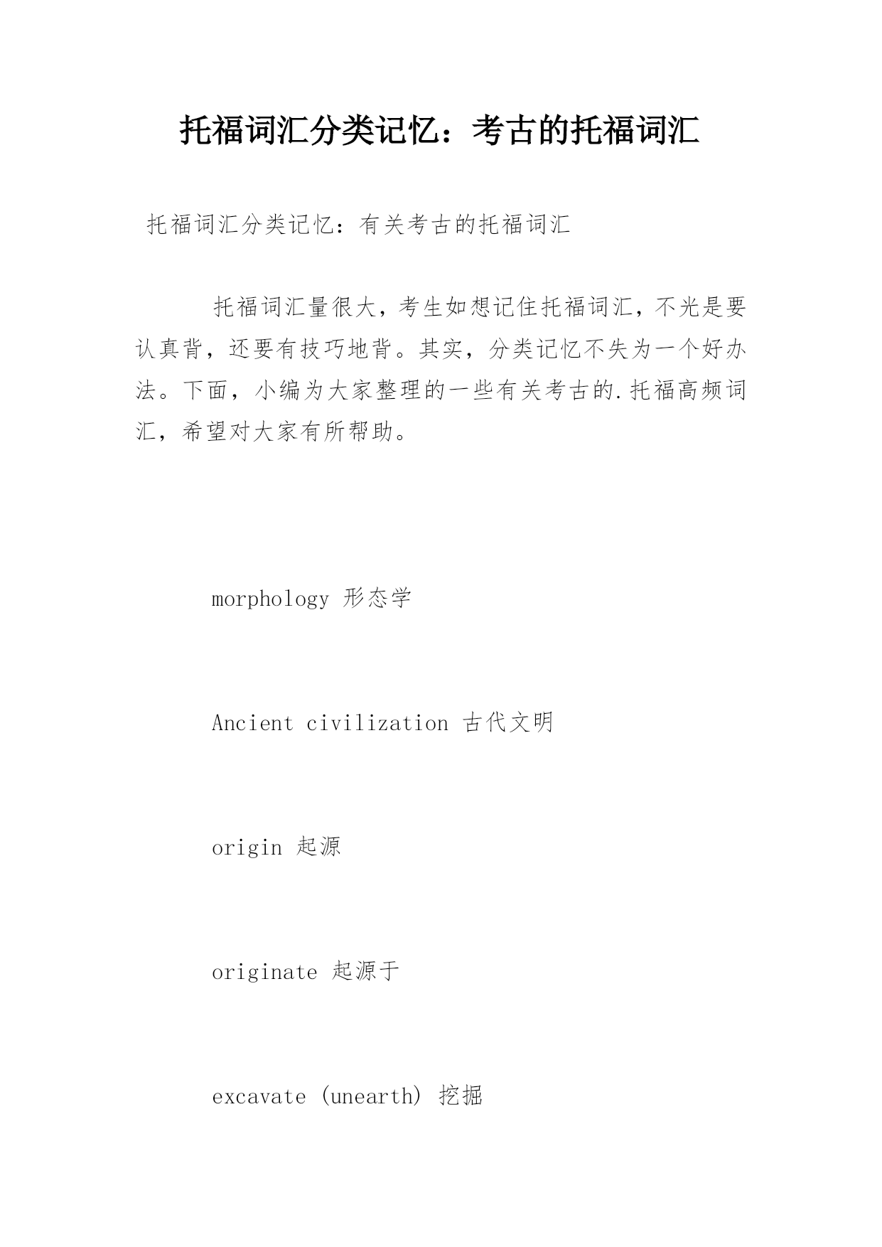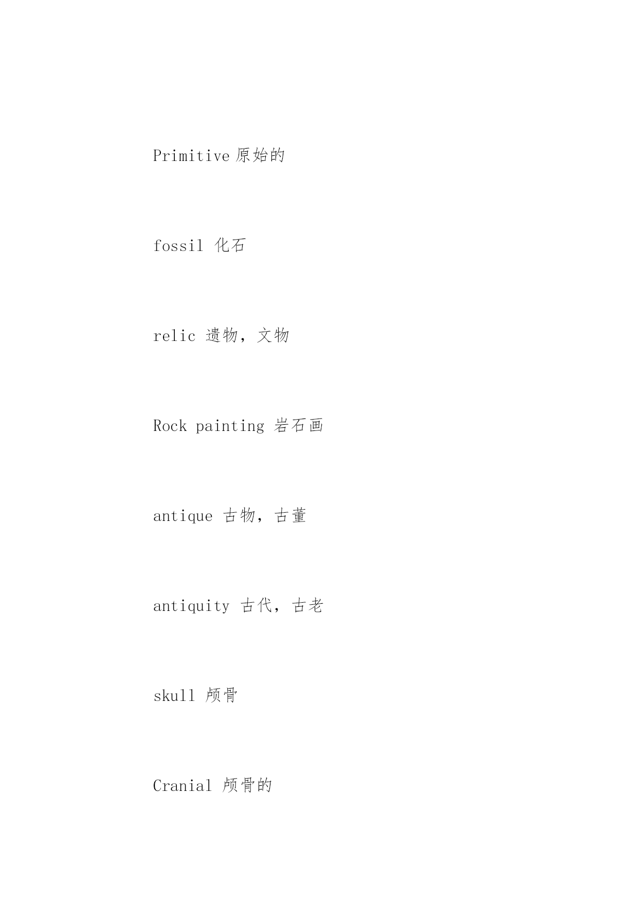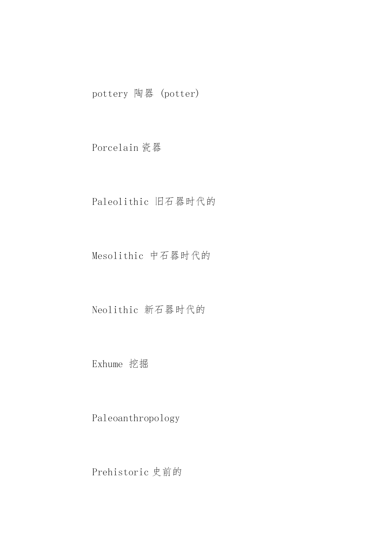 托福词汇分类记忆:考古的托福词汇 托福词汇分类记忆:有关考古的托福词汇 托福词汇量很大,考生如想记住托福词汇,不光是要认真背,还要有技巧地背。其实,分类记忆不失为一个好办法。下面,小编为大家整理的一些有关考古的.托福高频词汇,希望对大家有所帮助。 morphology形态学 Ancientcivilization古代文明 origin起源 originate起源于 excavate(unearth)挖掘 Scoop铲子 ruins遗迹,废墟 remains遗迹,遗骸 artifact手工艺品 ancestor祖先 hominid人(科) homogeneous同一种族(种类)的 tribe部落 anthropologist人类学家 ecological生态的 anthropologist生态人类学家 archaeology考古学 anthropology人类学 clan氏族 archeologist考古学家 excavation挖掘 pottery陶器(potter) Porcelain瓷器 Paleolithic旧石器时代的 Mesolithic中石器时代的 Neolithic新石器时代的 Exhume挖掘 Paleoanthropology Prehistoric史前的 Primitive原始的 fossil化石 relic遗物,文物 Rockpainting岩石画 antique古物,古董 antiquity古代,古老 skull颅骨 Cranial颅骨的 StoneAge石器时代 BronzeAge(青)铜器时代 IronAge铁器时代