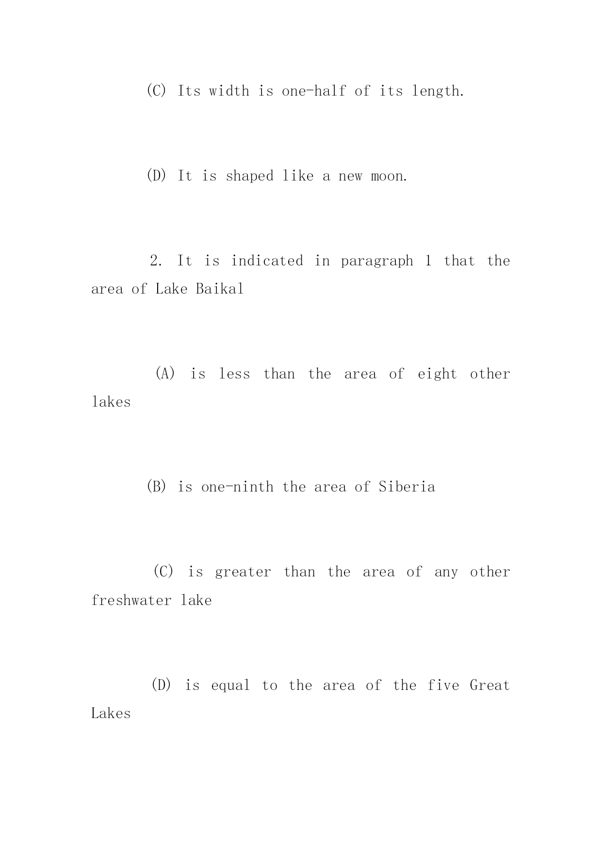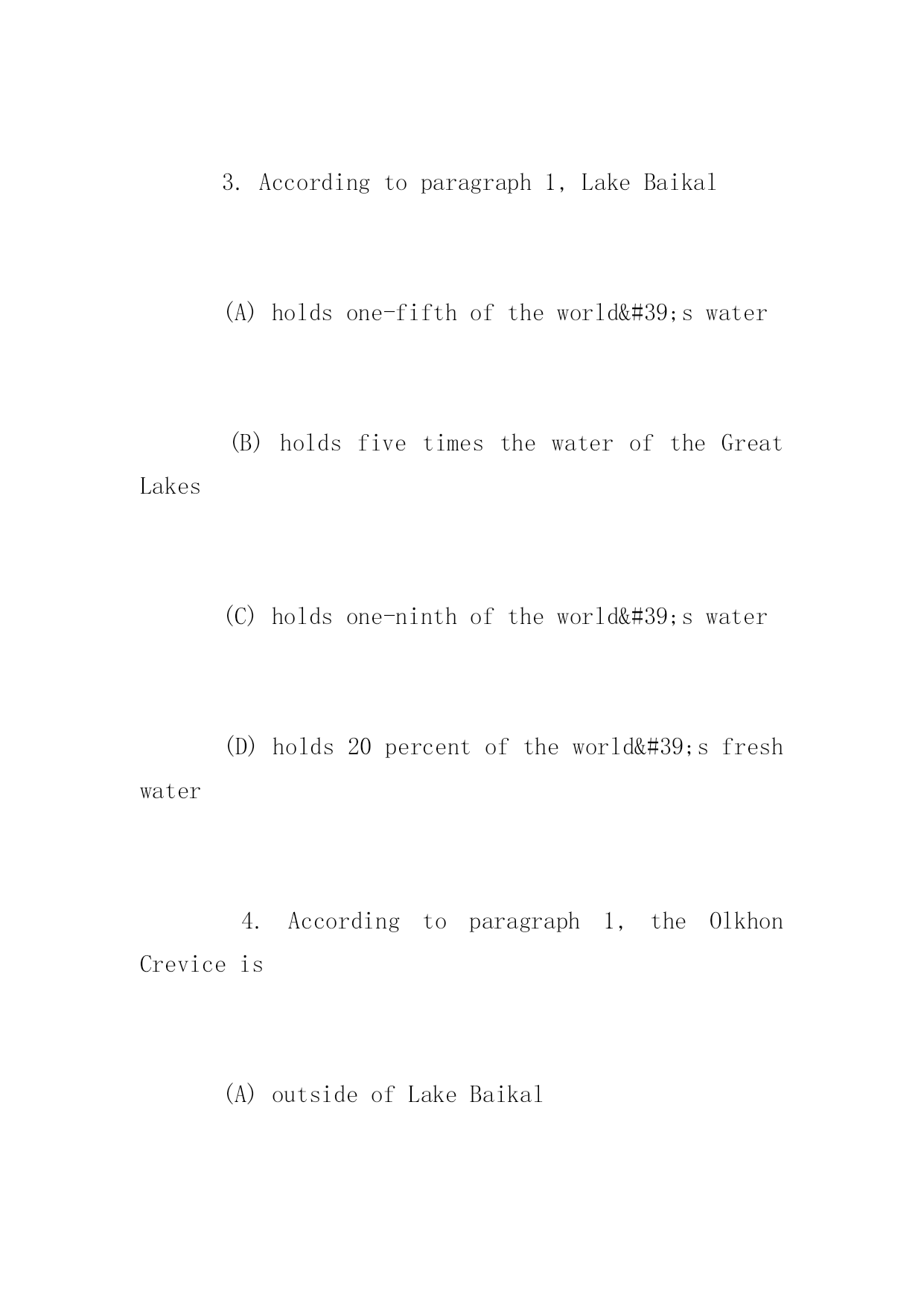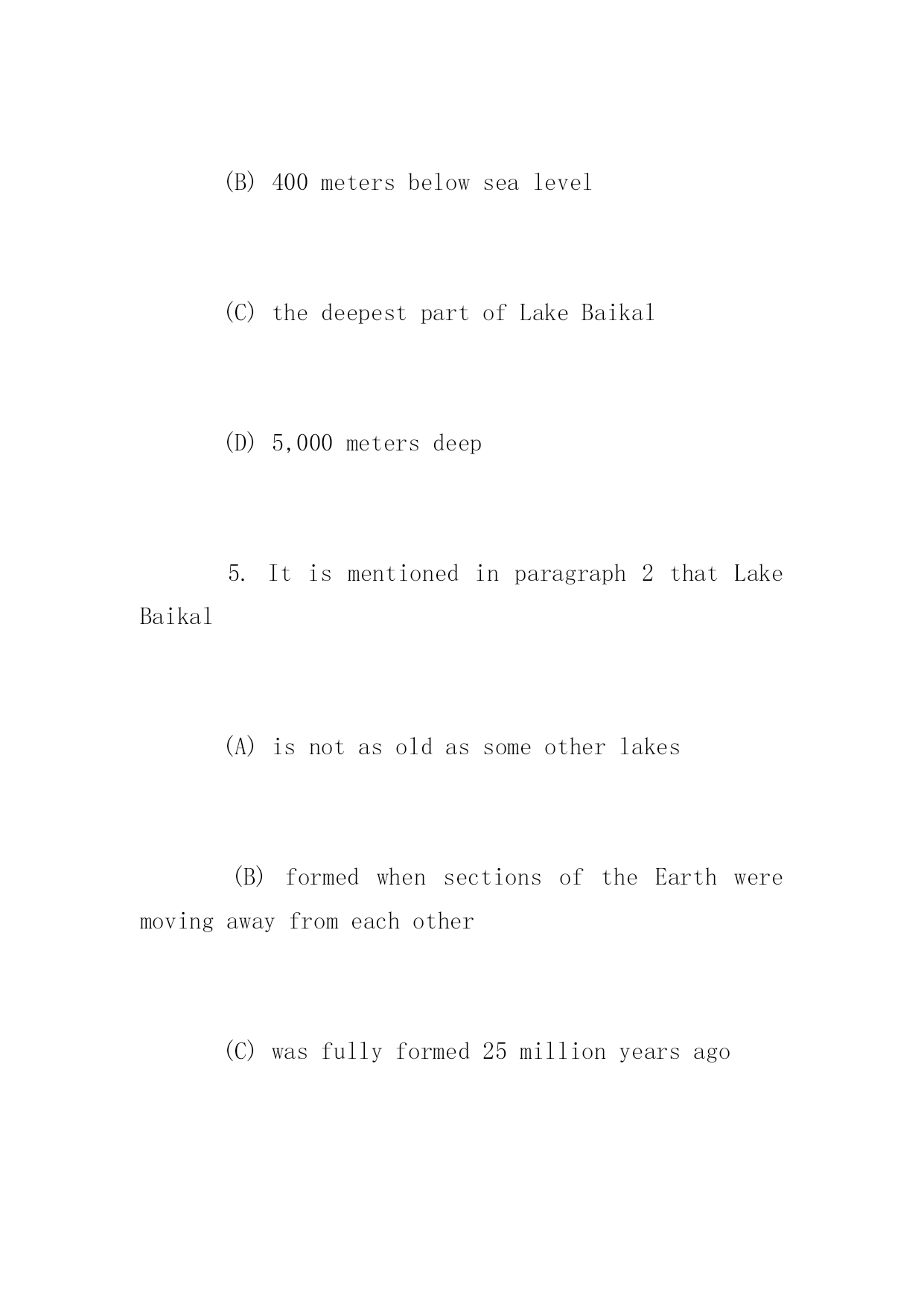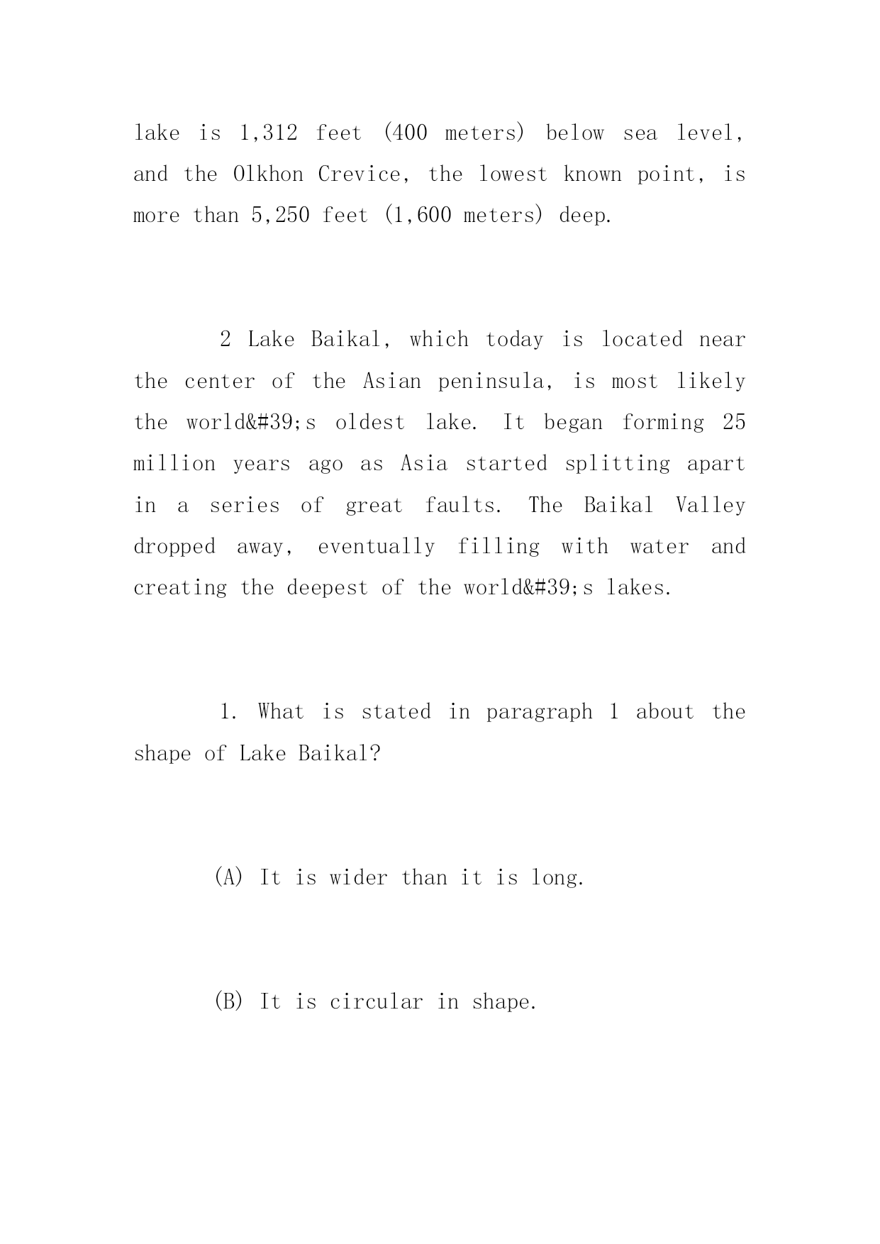 托福考试阅读理解专项训练与答案 2016年托福考试阅读理解专项训练与答案 阅读理解 partA LakeBaikal 1Crescent-shapedLakeBaikal,inSiberia,isonlytheninthlargestlakeinareaat385miles(650km)inlengthand46miles(74km)inwidth,yetitiseasilythelargestbodyoffreshwaterintheworld.Itholdsone-fifthoftheworld'stotalfreshwater,whichismorethanthetotalofallthewaterinthefiveGreatLakes;itholdssomuchfreshwaterinspiteofitsless-than-impressiveareabecauseitisbyfartheworld'sdeepestlake.Theaveragedepthofthelakeis1,312feet(400meters)belowsealevel,andtheOlkhonCrevice,thelowestknownpoint,ismorethan5,250feet(1,600meters)deep. 2LakeBaikal,whichtodayislocatednearthecenteroftheAsianpeninsula,ismostlikelytheworld'soldestlake.Itbeganforming25millionyearsagoasAsiastartedsplittingapartinaseriesofgreatfaults.TheBaikalValleydroppedaway,eventuallyfillingwithwaterandcreatingthedeepestoftheworld'slakes. 1.Whatisstatedinparagraph1abouttheshapeofLakeBaikal? (A)Itiswiderthanitislong. (B)Itiscircularinshape. (C)Itswidthisone-halfofitslength. (D)Itisshapedlikeanewmoon. 2.Itisindicatedinparagraph1thattheareaofLakeBaikal (A)islessthantheareaofeightotherlakes (B)isone-ninththeareaofSiberia (C)isgreaterthantheareaofanyotherfreshwaterlake (D)isequaltotheareaofthefiveGreatLakes 3.Accordingtoparagraph1,LakeBaikal (A)holdsone-fifthoftheworld'swater (B)holdsfivetimesthewateroftheGreatLakes (C)holdsone-ninthoftheworld'swater (D)holds20percentoftheworld'sfreshwater 4.Accordingtoparagraph1,theOlkhonCreviceis (A)outsideofLakeBaikal (B)400metersbelowsealevel (C)thedeepestpartofLakeBaikal (D)5,000metersdeep 5.Itismentionedinparagraph2thatLakeBaikal (A)isnotasoldassomeotherlakes (B)formedwhensectionsoftheEarthweremovingawayfromeachother (C)wasfullyformed25millionyearsago (D)istodaylocatedontheedgeoftheAsianpeninsula 参考答案: 1-5:D、A、D、C、B partB ThePostageStamp 1Thepostagestamphasbeenaroundforonlyarelativelyshortperiodoftime.TheuseofstampsforpostagewasfirstproposedinEnglandin1837,whenSirRowlandHillpublishedapamphletentitled"PostOfficeReform