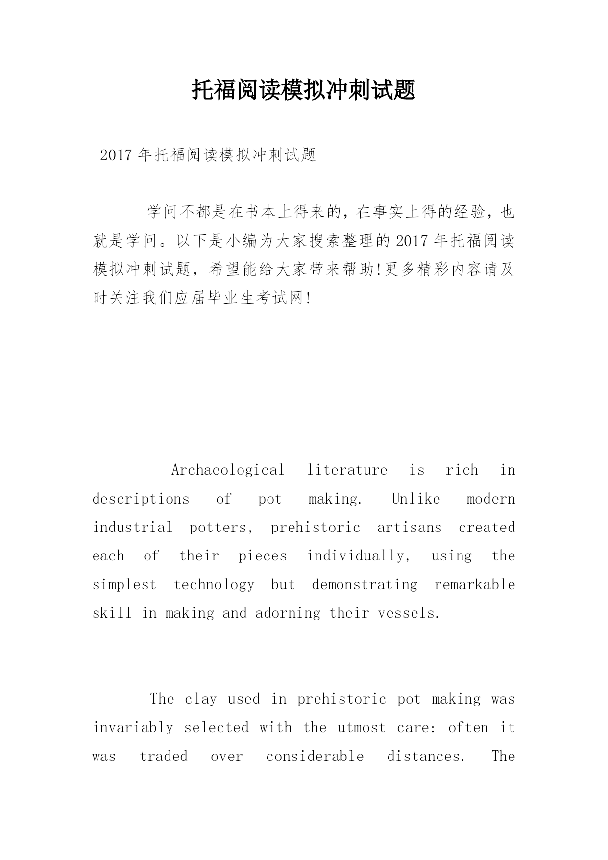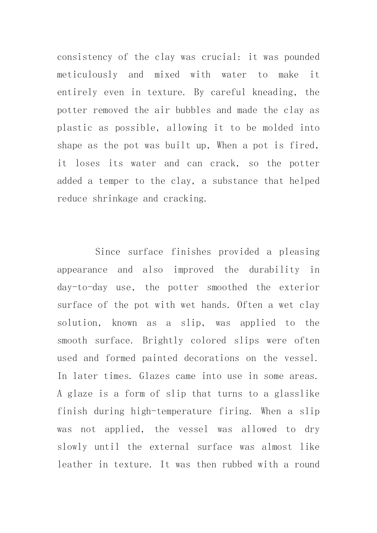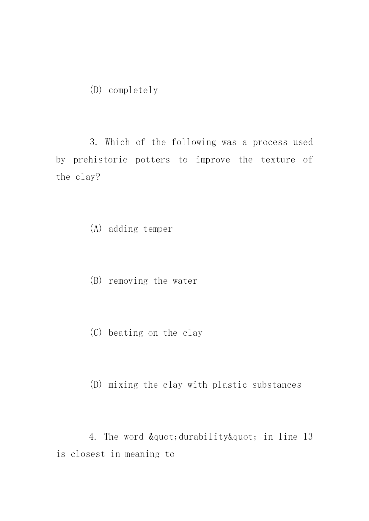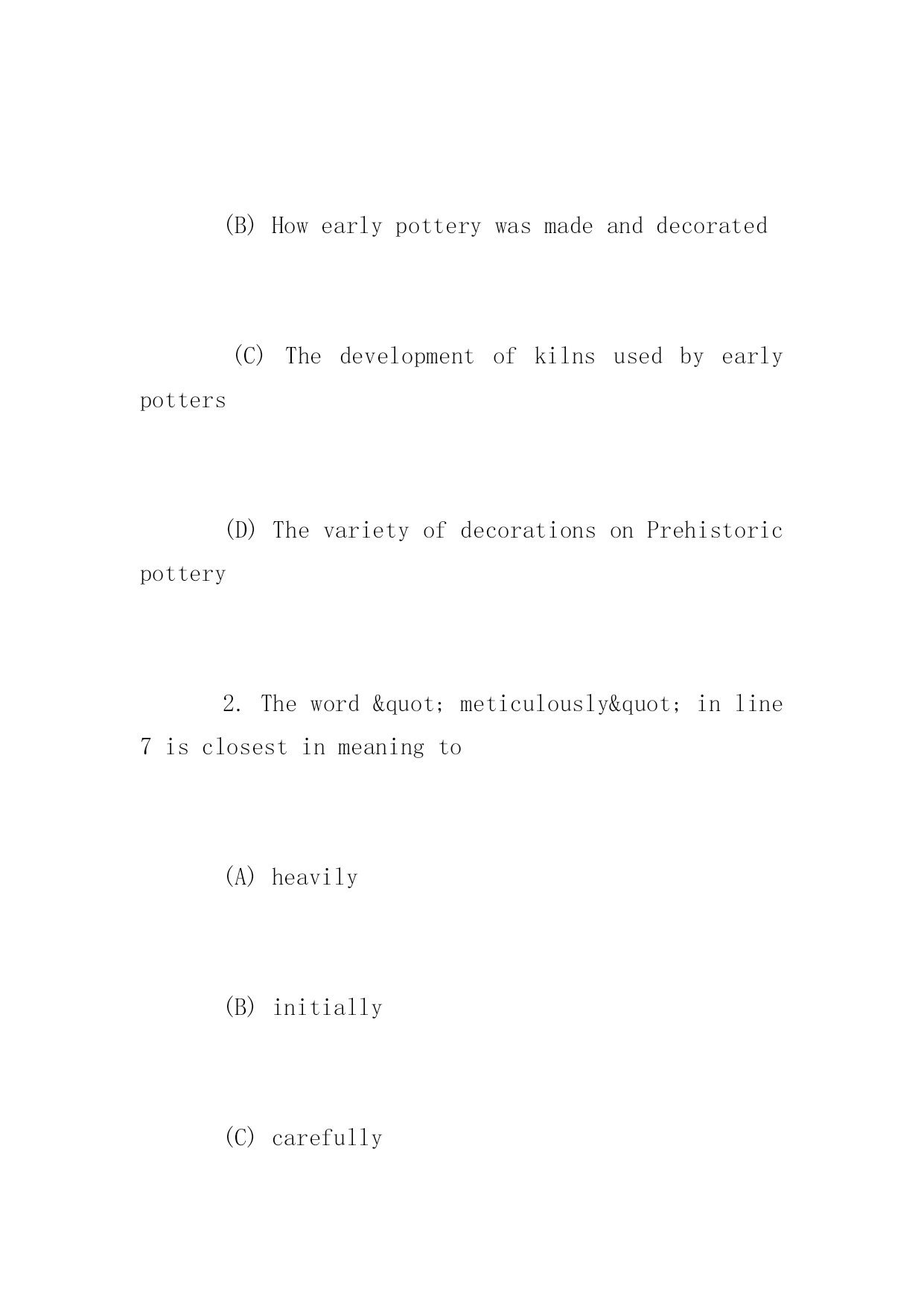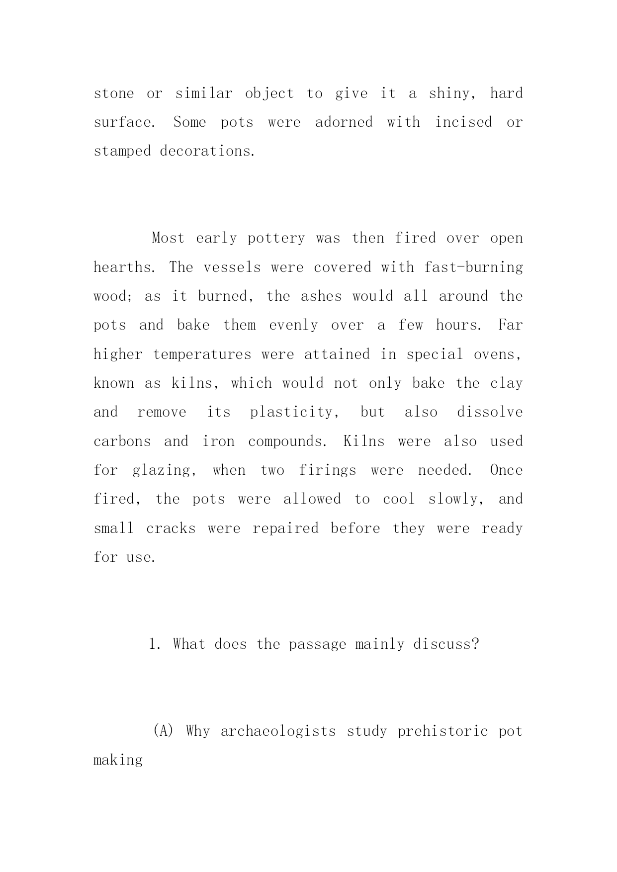 托福阅读模拟冲刺试题 2017年托福阅读模拟冲刺试题 学问不都是在书本上得来的,在事实上得的经验,也就是学问。以下是小编为大家搜索整理的2017年托福阅读模拟冲刺试题,希望能给大家带来帮助!更多精彩内容请及时关注我们应届毕业生考试网! Archaeologicalliteratureisrichindescriptionsofpotmaking.Unlikemodernindustrialpotters,prehistoricartisanscreatedeachoftheirpiecesindividually,usingthesimplesttechnologybutdemonstratingremarkableskillinmakingandadorningtheirvessels. Theclayusedinprehistoricpotmakingwasinvariablyselectedwiththeutmostcare:oftenitwastradedoverconsiderabledistances.Theconsistencyoftheclaywascrucial:itwaspoundedmeticulouslyandmixedwithwatertomakeitentirelyevenintexture.Bycarefulkneading,thepotterremovedtheairbubblesandmadetheclayasplasticaspossible,allowingittobemoldedintoshapeasthepotwasbuiltup,Whenapotisfired,itlosesitswaterandcancrack,sothepotteraddedatempertotheclay,asubstancethathelpedreduceshrinkageandcracking. Sincesurfacefinishesprovidedapleasingappearanceandalsoimprovedthedurabilityinday-to-dayuse,thepottersmoothedtheexteriorsurfaceofthepotwithwethands.Oftenawetclaysolution,knownasaslip,wasappliedtothesmoothsurface.Brightlycoloredslipswereoftenusedandformedpainteddecorationsonthevessel.Inlatertimes.Glazescameintouseinsomeareas.Aglazeisaformofslipthatturnstoaglasslikefinishduringhigh-temperaturefiring.Whenaslipwasnotapplied,thevesselwasallowedtodryslowlyuntiltheexternalsurfacewasalmostlikeleatherintexture.Itwasthenrubbedwitharoundstoneorsimilarobjecttogiveitashiny,hardsurface.Somepotswereadornedwithincisedorstampeddecorations. Mostearlypotterywasthenfiredoveropenhearths.Thevesselswerecoveredwithfast-burningwood;asitburned,theasheswouldallaroundthepotsandbakethemevenlyoverafewhours.Farhighertemperatureswereattainedinspecialovens,knownaskilns,whichwouldnotonlybaketheclayandremoveitsplasticity,butalsodissolvecarbonsandironcompounds.Kilnswerealsousedforglazing,whentwofiringswereneeded.Oncefired,thepotswereallowedtocoolslowly,andsmallcrackswererepairedbeforetheywerereadyforuse. 1.Whatdoesthepassagemainlydiscuss? (A)Whyarchaeologistsstudyprehistoricpotmaking (B)Howearl