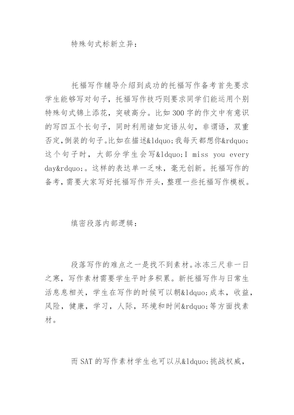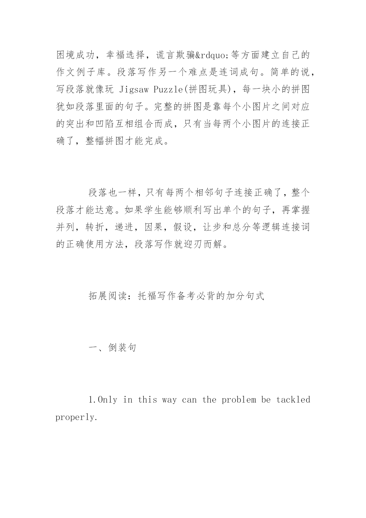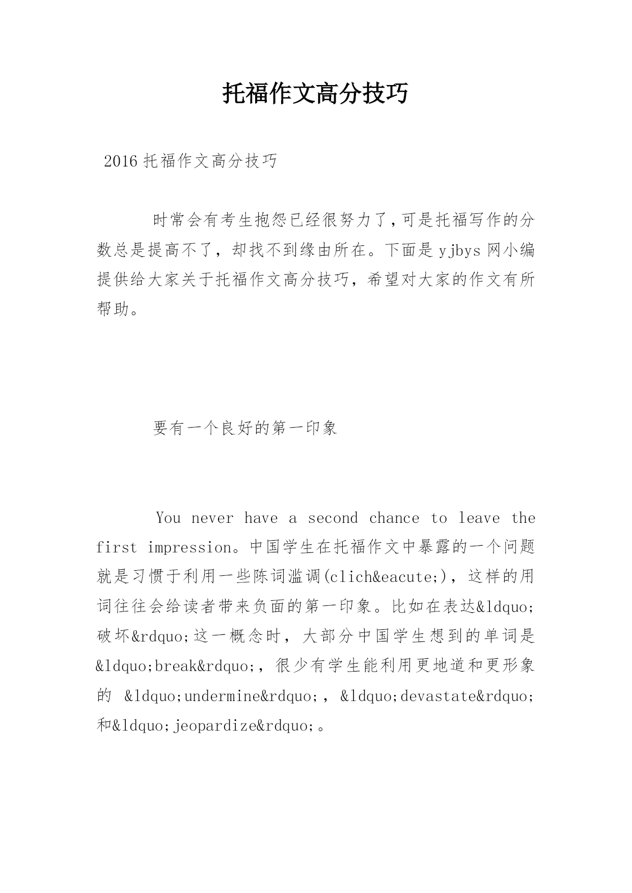 托福作文高分技巧 2016托福作文高分技巧 时常会有考生抱怨已经很努力了,可是托福写作的分数总是提高不了,却找不到缘由所在。下面是yjbys网小编提供给大家关于托福作文高分技巧,希望对大家的作文有所帮助。 要有一个良好的第一印象 Youneverhaveasecondchancetoleavethefirstimpression。中国学生在托福作文中暴露的一个问题就是习惯于利用一些陈词滥调(cliché),这样的用词往往会给读者带来负面的第一印象。比如在表达“破坏”这一概念时,大部分中国学生想到的单词是“break”,很少有学生能利用更地道和更形象的“undermine”,“devastate”和“jeopardize”。 特殊句式标新立异: 托福写作辅导介绍到成功的托福写作备考首先要求学生能够写对句子,托福写作技巧则要求同学们能运用个别特殊句式锦上添花,突破高分。比如300字的作文中有意识的写四五个长句子,同时利用诸如定语从句,非谓语,双重否定,倒装的句子。比如在描述“我每天都想你”这个句子时,大部分学生会写“Imissyoueveryday”。这样的表达单一乏味,毫无创新。托福写作的备考,需要大家写好托福写作开头,整理一些托福写作模板。 缜密段落内部逻辑: 段落写作的难点之一是找不到素材。冰冻三尺非一日之寒,写作素材需要学生平时多积累。新托福写作与日常生活息息相关,学生在写作的时候可以朝“成本,收益,风险,健康,学习,人际,环境和时间”等方面找素材。 而SAT的写作素材学生也可以从“挑战权威,困境成功,幸福选择,谎言欺骗”等方面建立自己的作文例子库。段落写作另一个难点是连词成句。简单的说,写段落就像玩JigsawPuzzle(拼图玩具),每一块小的拼图犹如段落里面的句子。完整的拼图是靠每个小图片之间对应的突出和凹陷互相组合而成,只有当每两个小图片的连接正确了,整幅拼图才能完成。 段落也一样,只有每两个相邻句子连接正确了,整个段落才能达意。如果学生能够顺利写出单个的句子,再掌握并列,转折,递进,因果,假设,让步和总分等逻辑连接词的正确使用方法,段落写作就迎刃而解。 拓展阅读:托福写作备考必背的加分句式 一、倒装句 1.Onlyinthiswaycantheproblembetackledproperly. 只有这样才能妥善地解决这个问题。 2.Onlywhenchildrentakearduouseffortscantheybecomesuccessful. 只有当孩子们付出艰苦的'努力他们才能获得成功。 3.Notonlydoesstudyinginschoolserveacademicpurpose,butstudentslearnhowtohandleinterpersonalrelations. 在校学习不仅为了学术目的,而且还可以学会如何处理人际关系。 4.Undernocircumstancesshouldyoungstersfollownegativeinformationonmassmediablindly. 青少年决不应当盲从大众媒体上的不良信息。 5.Sovaluableiswaterthatwecannotaffordtowasteit. 时间是如此珍贵,我们经不起浪费它。 6.Nowadays,mostdangerousforyoungstersisthetendencytoindulgeinplayingPCgames. 如今对青少年最为危险的事情是倾向于过多地玩电脑游戏。 二、强调句 1.Itisforthebenefitofmaintainingtheecologicalbalancethathumanbeingsoughttoprotecttheendangeredanimalspecies. 正是为了维持生态平衡,人类才应该保护地球上濒危的动物物种。 2.ItisnotuntilpeoplesufferfromsomefataldiseasessuchasSARSandAIDSthattheyarebecomingawareofhowsignificantitisforthegovernmenttoinvestmoremoneyinmedicalcare. 直到人们患了像非典和爱滋病这样致命的疾病时,才意识到政府把更多的钱投入到医疗上的重要性。 三、比较句 1.Studiesshowthatjuveniledelinquencyratesaretwiceashig