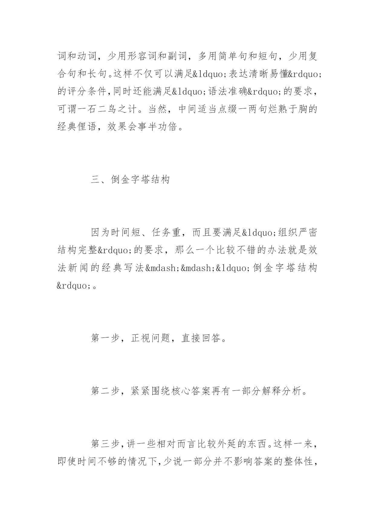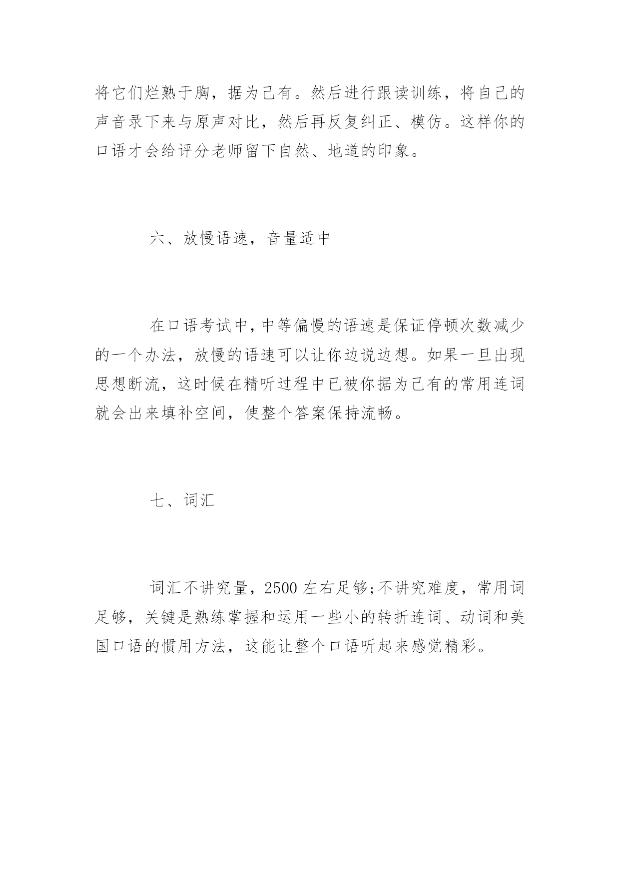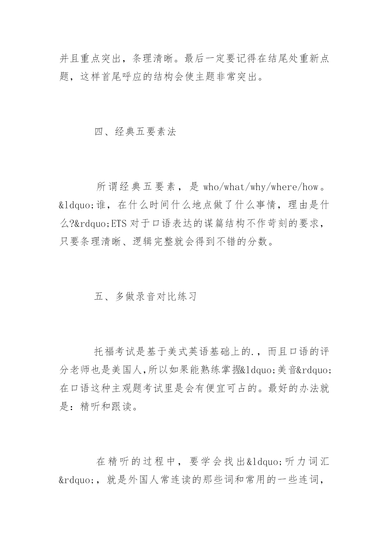 托福口语考试高分技巧 2016年托福口语考试高分技巧 托福口语的提高离不开平时的练习,但是练习也是要讲究方法的,不能盲目。以下是yjbys网小编为大家提供的托福口语高分技巧,希望能帮到大家哦! 一、多做真题和模拟题 要想回答问题深入透彻,首先要摸透托福出题人的思路,弄明白人家想让你回答什么。这需要大量地做真题和模拟题,从规律中掌握题路。这点适用于各个部分的考试,不用多言。 二、多用简单句,少用长句 美国人说话最讲究简洁明快,而且通常只求达意并不注重语法。托福口语考试基于实际应用的角度,更加注重语言的人性化,所以,在做口语题的时候学生应该学会多用名词和动词,少用形容词和副词,多用简单句和短句,少用复合句和长句。这样不仅可以满足“表达清晰易懂”的评分条件,同时还能满足“语法准确”的要求,可谓一石二鸟之计。当然,中间适当点缀一两句烂熟于胸的经典俚语,效果会事半功倍。 三、倒金字塔结构 因为时间短、任务重,而且要满足“组织严密结构完整”的要求,那么一个比较不错的办法就是效法新闻的经典写法——“倒金字塔结构”。 第一步,正视问题,直接回答。 第二步,紧紧围绕核心答案再有一部分解释分析。 第三步,讲一些相对而言比较外延的东西。这样一来,即使时间不够的情况下,少说一部分并不影响答案的整体性,并且重点突出,条理清晰。最后一定要记得在结尾处重新点题,这样首尾呼应的结构会使主题非常突出。 四、经典五要素法 所谓经典五要素,是who/what/why/where/how。“谁,在什么时间什么地点做了什么事情,理由是什么?”ETS对于口语表达的谋篇结构不作苛刻的要求,只要条理清晰、逻辑完整就会得到不错的分数。 五、多做录音对比练习 托福考试是基于美式英语基础上的.,而且口语的评分老师也是美国人,所以如果能熟练掌握“美音”在口语这种主观题考试里是会有便宜可占的。最好的办法就是:精听和跟读。 在精听的过程中,要学会找出“听力词汇”,就是外国人常连读的那些词和常用的一些连词,将它们烂熟于胸,据为己有。然后进行跟读训练,将自己的声音录下来与原声对比,然后再反复纠正、模仿。这样你的口语才会给评分老师留下自然、地道的印象。 六、放慢语速,音量适中 在口语考试中,中等偏慢的语速是保证停顿次数减少的一个办法,放慢的语速可以让你边说边想。如果一旦出现思想断流,这时候在精听过程中已被你据为己有的常用连词就会出来填补空间,使整个答案保持流畅。 七、词汇 词汇不讲究量,2500左右足够;不讲究难度,常用词足够,关键是熟练掌握和运用一些小的转折连词、动词和美国口语的惯用方法,这能让整个口语听起来感觉精彩。