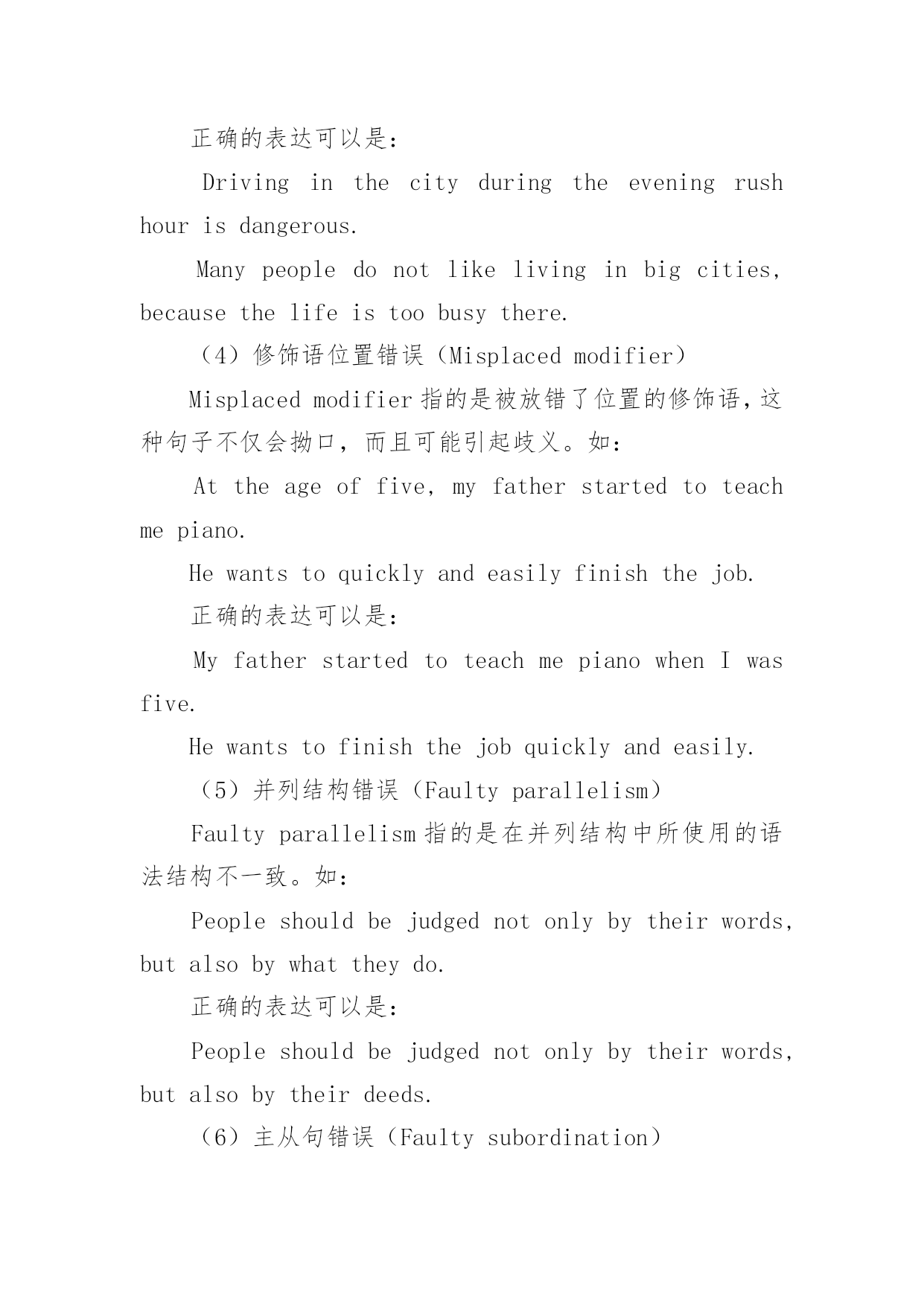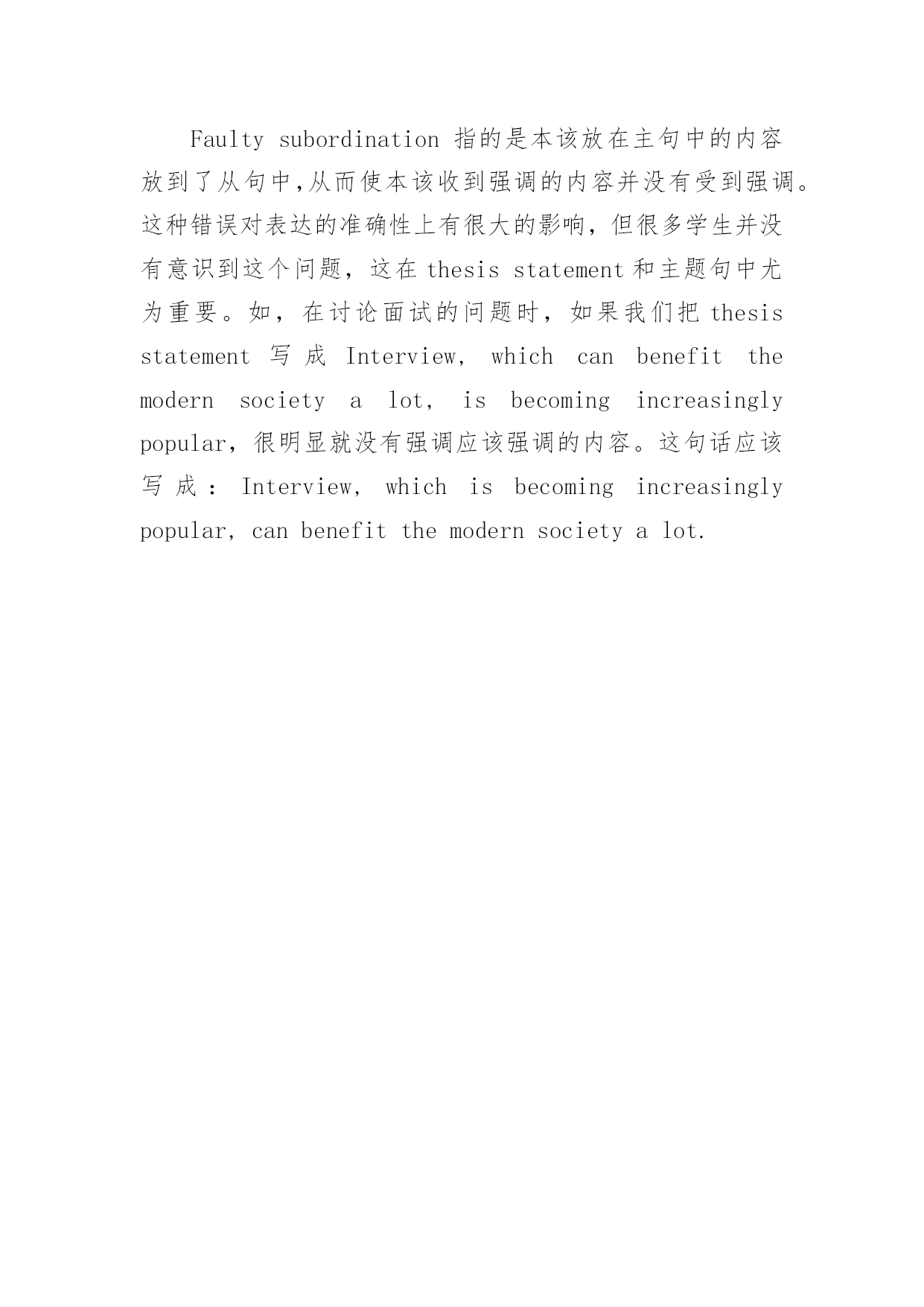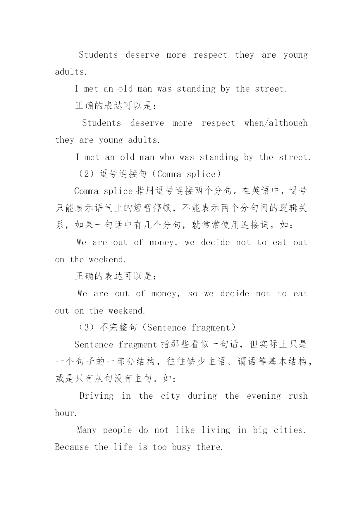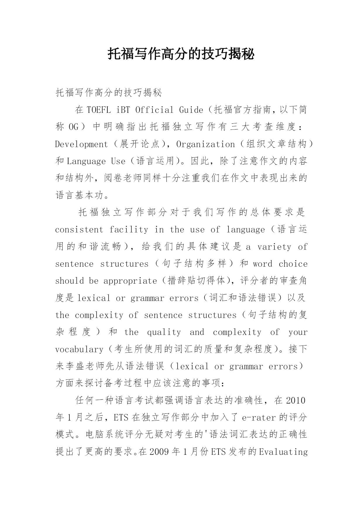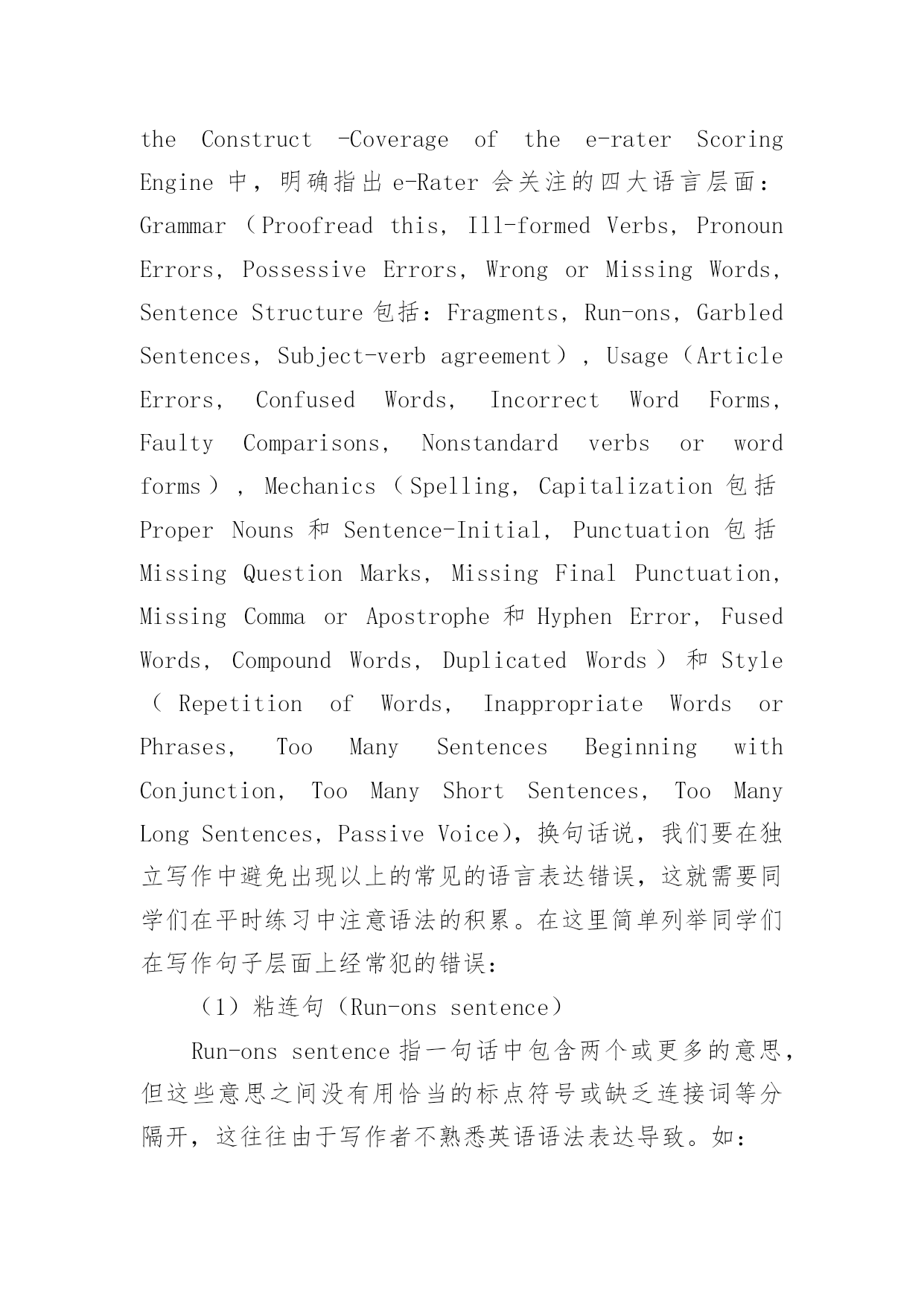 托福写作高分的技巧揭秘 托福写作高分的技巧揭秘在TOEFLiBTOfficialGuide(托福官方指南,以下简称OG)中明确指出托福独立写作有三大考查维度:Development(展开论点),Organization(组织文章结构)和LanguageUse(语言运用)。因此,除了注意作文的内容和结构外,阅卷老师同样十分注重我们在作文中表现出来的语言基本功。托福独立写作部分对于我们写作的总体要求是consistentfacilityintheuseoflanguage(语言运用的和谐流畅),给我们的具体建议是avarietyofsentencestructures(句子结构多样)和wordchoiceshouldbeappropriate(措辞贴切得体),评分者的审查角度是lexicalorgrammarerrors(词汇和语法错误)以及thecomplexityofsentencestructures(句子结构的复杂程度)和thequalityandcomplexityofyourvocabulary(考生所使用的词汇的质量和复杂程度)。接下来李盛老师先从语法错误(lexicalorgrammarerrors)方面来探讨备考过程中应该注意的事项:任何一种语言考试都强调语言表达的准确性,在2010年1月之后,ETS在独立写作部分中加入了e-rater的评分模式。电脑系统评分无疑对考生的'语法词汇表达的正确性提出了更高的要求。在2009年1月份ETS发布的EvaluatingtheConstruct-Coverageofthee-raterScoringEngine中,明确指出e-Rater会关注的四大语言层面:Grammar(Proofreadthis,Ill-formedVerbs,PronounErrors,PossessiveErrors,WrongorMissingWords,SentenceStructure包括:Fragments,Run-ons,GarbledSentences,Subject-verbagreement),Usage(ArticleErrors,ConfusedWords,IncorrectWordForms,FaultyComparisons,Nonstandardverbsorwordforms),Mechanics(Spelling,Capitalization包括ProperNouns和Sentence-Initial,Punctuation包括MissingQuestionMarks,MissingFinalPunctuation,MissingCommaorApostrophe和HyphenError,FusedWords,CompoundWords,DuplicatedWords)和Style(RepetitionofWords,InappropriateWordsorPhrases,TooManySentencesBeginningwithConjunction,TooManyShortSentences,TooManyLongSentences,PassiveVoice),换句话说,我们要在独立写作中避免出现以上的常见的语言表达错误,这就需要同学们在平时练习中注意语法的积累。在这里简单列举同学们在写作句子层面上经常犯的错误:(1)粘连句(Run-onssentence)Run-onssentence指一句话中包含两个或更多的意思,但这些意思之间没有用恰当的标点符号或缺乏连接词等分隔开,这往往由于写作者不熟悉英语语法表达导致。如:Studentsdeservemorerespecttheyareyoungadults.Imetanoldmanwasstandingbythestreet.正确的表达可以是:Studentsdeservemorerespectwhen/althoughtheyareyoungadults.Imetanoldmanwhowasstandingbythestreet.(2)逗号连接句(Commasplice)Commasplice指用逗号连接两个分句。在英语中,逗号只能表示语气上的短暂停顿,不能表示两个分句间的逻辑关系,如果一句话中有几个分句,就常常使用连接词。如:Weareoutofmoney,wedecidenottoeatoutontheweekend.正确的表达可以是:Weareoutofmoney,sowedecidenottoeatoutontheweekend.(3)不完整句(Sentencefragment)Sentencefragment指那些看似一句话,但实际上只是一个句子的一部分结构,往往缺少主语、谓语等基本结构,或是只有从句没有