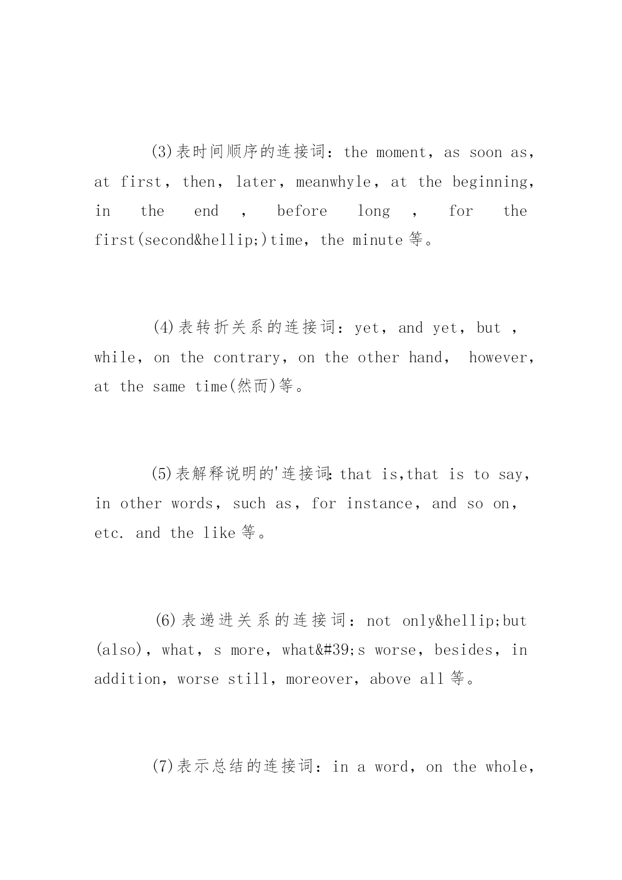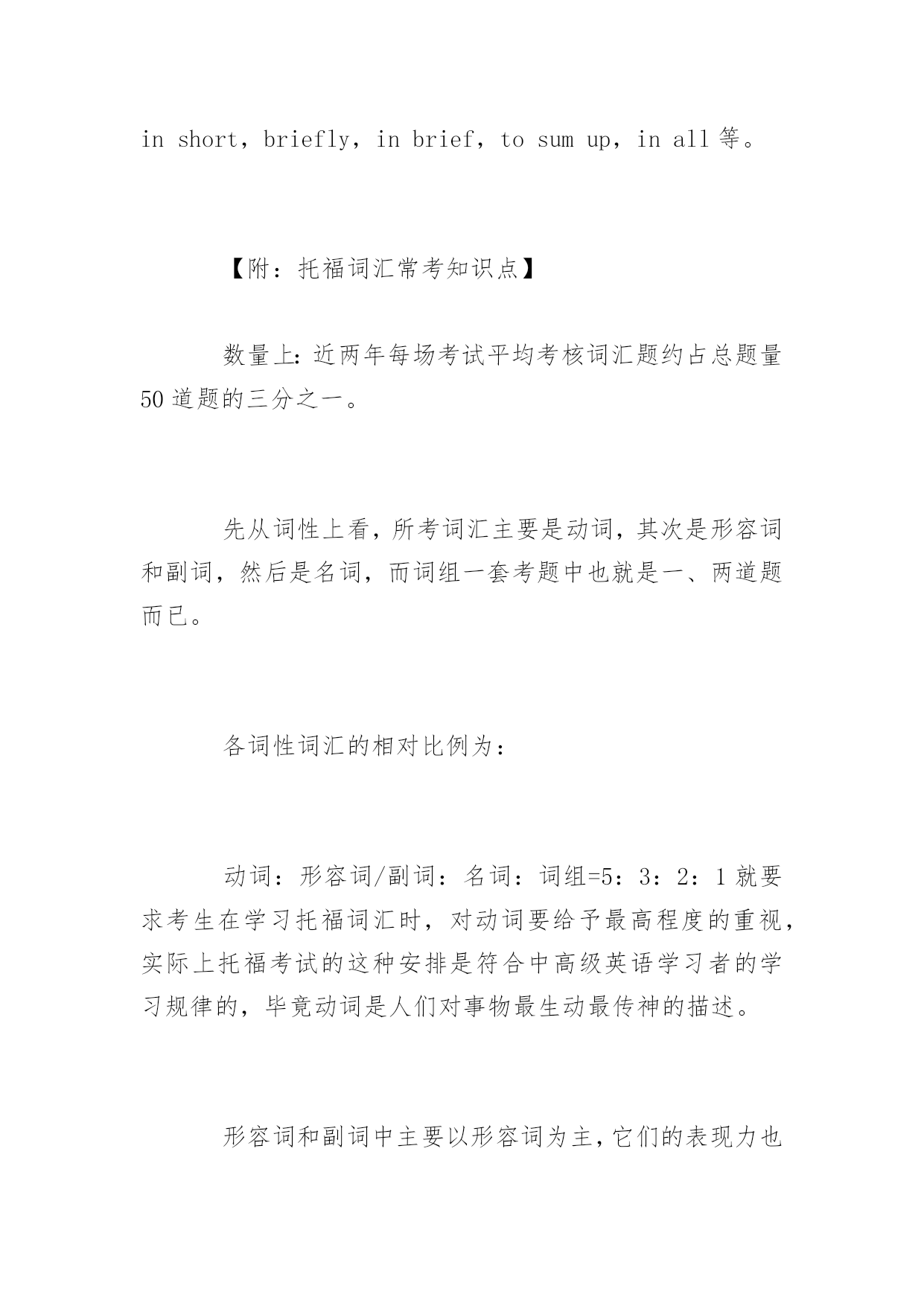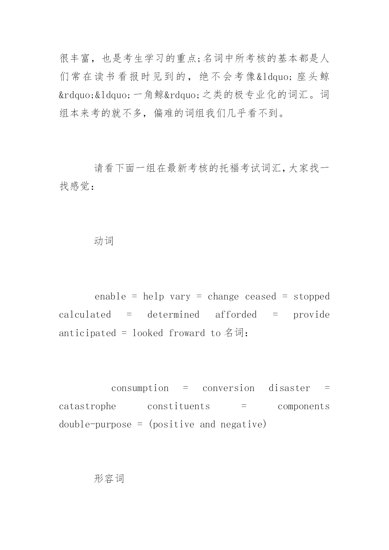 托福口语常用词结 托福口语常用词汇总结 托福口语是托福考试的重要部分,而词汇是托福的基础,托福口语词汇自然是重中之重了,下面小编为大家搜索整理了托福口语常用词汇总结,希望对大家备考托福有所帮助! 关键词汇: airport,boat,bus,coach大客车;conductor售票员;driver,inspector检查员,稽查员;lorry卡车(美作:truck),passenger,plane,pedestrian行人;ride乘车;ship,taxi,taxicab,traffic,trolleybus无轨电车;underground,tube,subway地铁;van厢式货车;etc。 常用短语: busstop汽车站;cargoboat货船;commercialvehicle商用车;double-deckerbus双层公共汽车;elevatedrailway,overheadrailway高架铁路;highwaycode交通法规;minimumfare(ofataxi)最低车费;opentotraffic通车;passengerboat客船;privatecar,railwaynetwork铁路网;railwaytransport铁路运输;roaduser道路使用者;rushhour,taxidriver,cabdriver出租车司机;taxirank,taxistand计程车车站;出租车总站;trafficjam交通拥挤;trafficpoliceman交通警察;urbanrailway市区铁路;utilitycar公共车辆;etc。 连接词: (1)表选择关系或对等关系的连接词:either…or…,neither…nor,or,aswellas…,and,both…and…。 (2)表因果关系或对等关系的连接词:therefore,so,asaresult,astheresultof…,becauseof,dueto…,owingto,thanksto等。 (3)表时间顺序的连接词:themoment,assoonas,atfirst,then,later,meanwhyle,atthebeginning,intheend,beforelong,forthefirst(second…)time,theminute等。 (4)表转折关系的连接词:yet,andyet,but,while,onthecontrary,ontheotherhand,however,atthesametime(然而)等。 (5)表解释说明的'连接词:thatis,thatistosay,inotherwords,suchas,forinstance,andsoon,etc.andthelike等。 (6)表递进关系的连接词:notonly…but(also),what,smore,what'sworse,besides,inaddition,worsestill,moreover,aboveall等。 (7)表示总结的连接词:inaword,onthewhole,inshort,briefly,inbrief,tosumup,inall等。 【附:托福词汇常考知识点】 数量上:近两年每场考试平均考核词汇题约占总题量50道题的三分之一。 先从词性上看,所考词汇主要是动词,其次是形容词和副词,然后是名词,而词组一套考题中也就是一、两道题而已。 各词性词汇的相对比例为: 动词:形容词/副词:名词:词组=5:3:2:1就要求考生在学习托福词汇时,对动词要给予最高程度的重视,实际上托福考试的这种安排是符合中高级英语学习者的学习规律的,毕竟动词是人们对事物最生动最传神的描述。 形容词和副词中主要以形容词为主,它们的表现力也很丰富,也是考生学习的重点;名词中所考核的基本都是人们常在读书看报时见到的,绝不会考像“座头鲸”“一角鲸”之类的极专业化的词汇。词组本来考的就不多,偏难的词组我们几乎看不到。 请看下面一组在最新考核的托福考试词汇,大家找一找感觉: 动词 enable=helpvary=changeceased=stoppedcalculated=determinedafforded=provideanticipated=lookedfrowardto名词: consumption=conversiondisaster=catastropheconstituents=componentsdouble-purpose=(positiveandnegativ