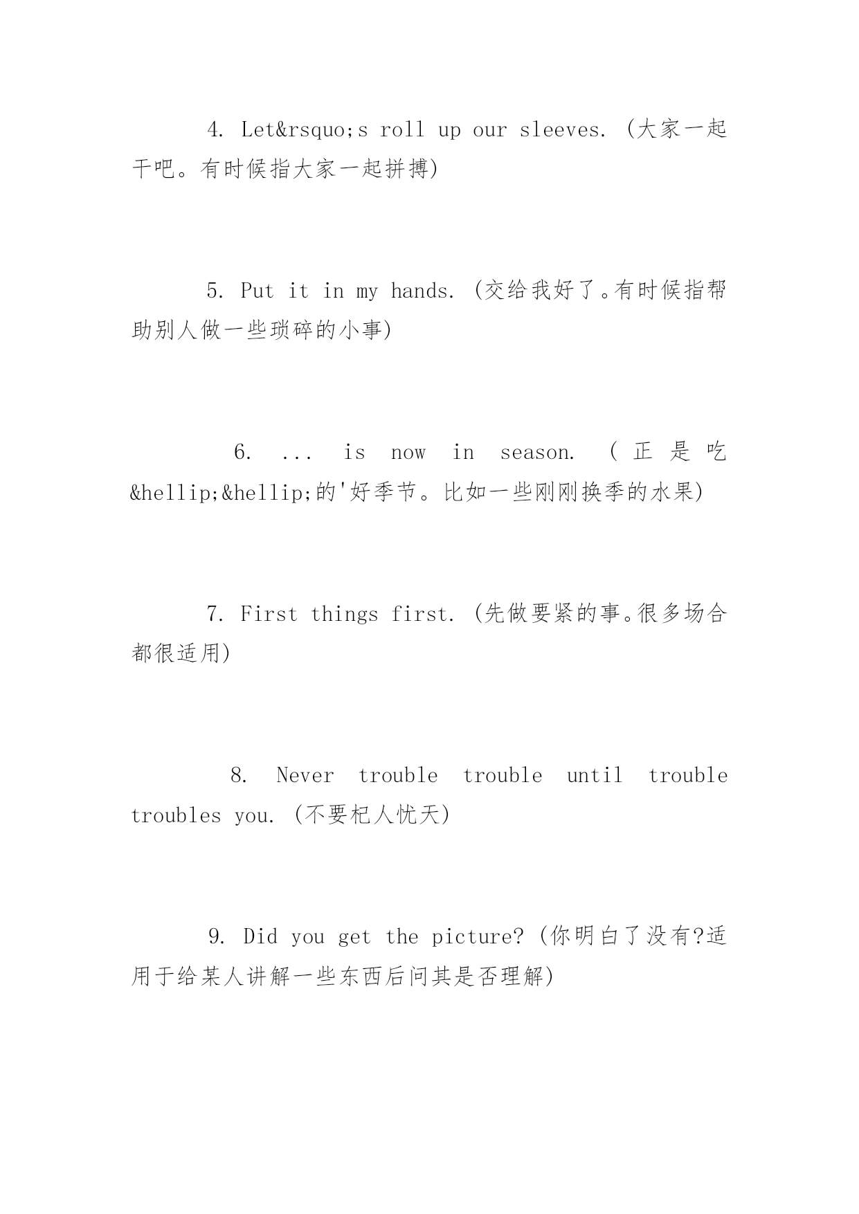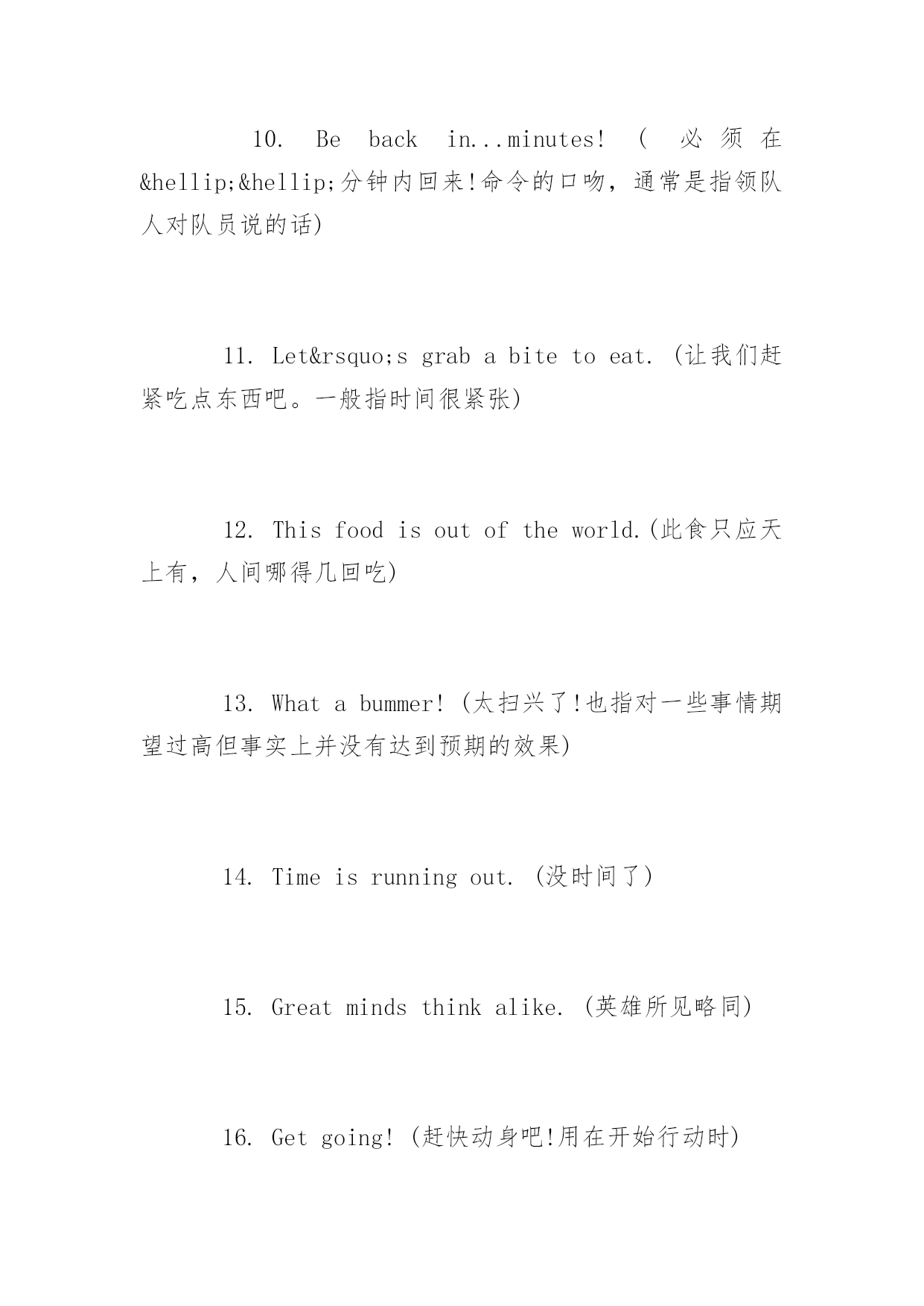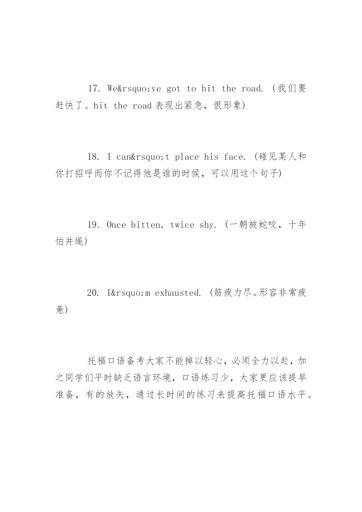 托福口语精彩词汇 2016年托福口语精彩词汇大全 通过长时间练习来提高托福口语水平是托福考生提升口语的重要途径,下面为大家带来托福口语中那些精彩的地道词汇,希望对大家的托福口语模板补充有所帮助。托福口语虽然是要求口语化,但是也不能因此忽略语言表达的质量,考生们准备一些高分词句也是十分必要的,在托福口语考试中能够灵活运用。希望大家可以借鉴,认真备考托福口语。 1.it’sjustmycupoftea.(正合我的口味。指人、事等) 2.Takeiteasy.easydoseit.(慢慢来,别着急) 3.Doasisaid.(照我的意思做) 4.Let’srollupoursleeves.(大家一起干吧。有时候指大家一起拼搏) 5.Putitinmyhands.(交给我好了。有时候指帮助别人做一些琐碎的小事) 6....isnowinseason.(正是吃……的'好季节。比如一些刚刚换季的水果) 7.Firstthingsfirst.(先做要紧的事。很多场合都很适用) 8.Nevertroubletroubleuntiltroubletroublesyou.(不要杞人忧天) 9.Didyougetthepicture?(你明白了没有?适用于给某人讲解一些东西后问其是否理解) 10.Bebackin...minutes!(必须在……分钟内回来!命令的口吻,通常是指领队人对队员说的话) 11.Let’sgrababitetoeat.(让我们赶紧吃点东西吧。一般指时间很紧张) 12.Thisfoodisoutoftheworld.(此食只应天上有,人间哪得几回吃) 13.Whatabummer!(太扫兴了!也指对一些事情期望过高但事实上并没有达到预期的效果) 14.Timeisrunningout.(没时间了) 15.Greatmindsthinkalike.(英雄所见略同) 16.Getgoing!(赶快动身吧!用在开始行动时) 17.We’vegottohittheroad.(我们要赶快了。hittheroad表现出紧急,很形象) 18.Ican’tplacehisface.(碰见某人和你打招呼而你不记得他是谁的时候,可以用这个句子) 19.Oncebitten,twiceshy.(一朝被蛇咬,十年怕井绳) 20.I’mexhausted.(筋疲力尽。形容非常疲惫) 托福口语备考大家不能掉以轻心,必须全力以赴,加之同学们平时缺乏语言环境,口语练习少,大家更应该提早准备,有的放矢,通过长时间的练习来提高托福口语水平。