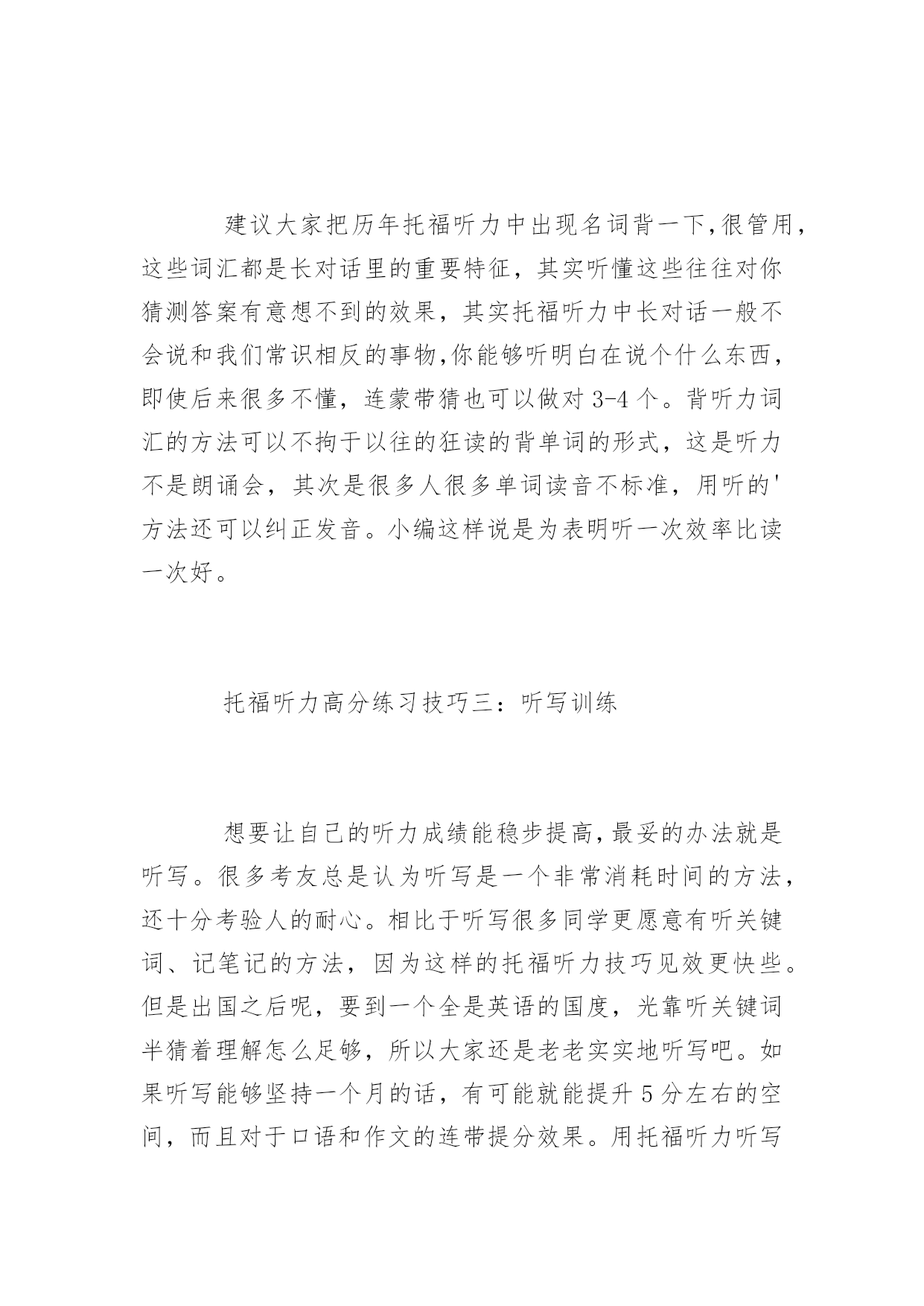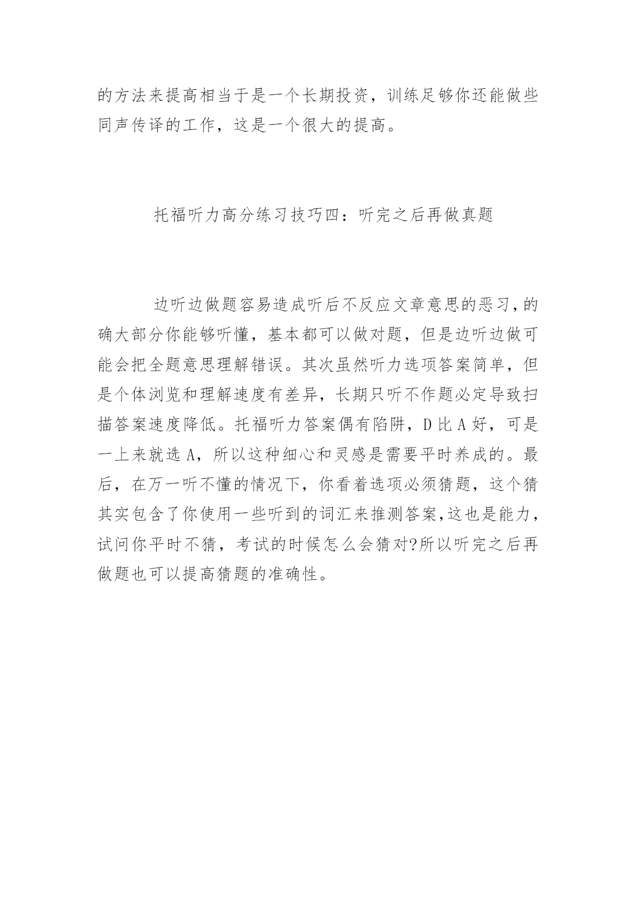 托福听力考试高分技巧 2016年托福听力考试高分技巧 托福听力的提高离不开平时的练习,但是练习也是要讲究方法的,不能盲目。下面yjbys网小编为大家提供托福听力考试高分技巧,希望能帮到大家哦! 托福听力高分练习技巧一:听历年真题 听写用真题。可以找到原来老托福的听力真题,坚持把它们听写下来。在完全翻烂托福听力真题前,不建议去听别的听力材料,像美剧、VOA等,其一是因为各自涵盖的内容有差异,涉及领域不同;其二是因为它们难度太大,等你把它们拿下,留给另外三项的时间也就不多了,所以千万不要好高骛远。在听的过程中不要死磕着,听了4次再不懂就看文章。有些你查字典才能明白的东西,又如何指望自己在一遍遍听中搞懂呢?如果把全部真题听完,可以试着背托福听力里面一些句子。 托福听力高分练习技巧二:背材料里的单词 建议大家把历年托福听力中出现名词背一下,很管用,这些词汇都是长对话里的重要特征,其实听懂这些往往对你猜测答案有意想不到的效果,其实托福听力中长对话一般不会说和我们常识相反的事物,你能够听明白在说个什么东西,即使后来很多不懂,连蒙带猜也可以做对3-4个。背听力词汇的方法可以不拘于以往的狂读的背单词的形式,这是听力不是朗诵会,其次是很多人很多单词读音不标准,用听的'方法还可以纠正发音。小编这样说是为表明听一次效率比读一次好。 托福听力高分练习技巧三:听写训练 想要让自己的听力成绩能稳步提高,最妥的办法就是听写。很多考友总是认为听写是一个非常消耗时间的方法,还十分考验人的耐心。相比于听写很多同学更愿意有听关键词、记笔记的方法,因为这样的托福听力技巧见效更快些。但是出国之后呢,要到一个全是英语的国度,光靠听关键词半猜着理解怎么足够,所以大家还是老老实实地听写吧。如果听写能够坚持一个月的话,有可能就能提升5分左右的空间,而且对于口语和作文的连带提分效果。用托福听力听写的方法来提高相当于是一个长期投资,训练足够你还能做些同声传译的工作,这是一个很大的提高。 托福听力高分练习技巧四:听完之后再做真题 边听边做题容易造成听后不反应文章意思的恶习,的确大部分你能够听懂,基本都可以做对题,但是边听边做可能会把全题意思理解错误。其次虽然听力选项答案简单,但是个体浏览和理解速度有差异,长期只听不作题必定导致扫描答案速度降低。托福听力答案偶有陷阱,D比A好,可是一上来就选A,所以这种细心和灵感是需要平时养成的。最后,在万一听不懂的情况下,你看着选项必须猜题,这个猜其实包含了你使用一些听到的词汇来推测答案,这也是能力,试问你平时不猜,考试的时候怎么会猜对?所以听完之后再做题也可以提高猜题的准确性。
