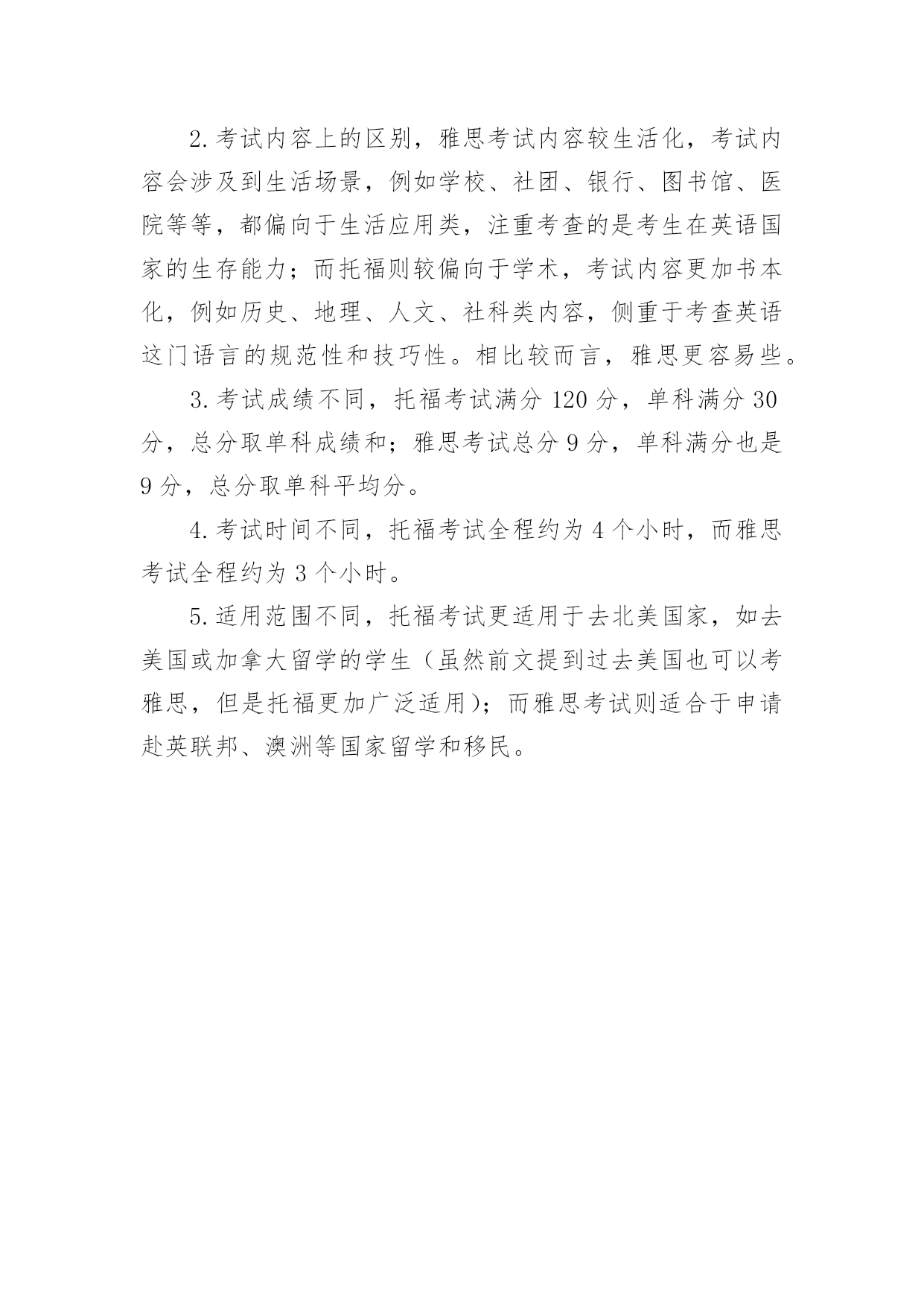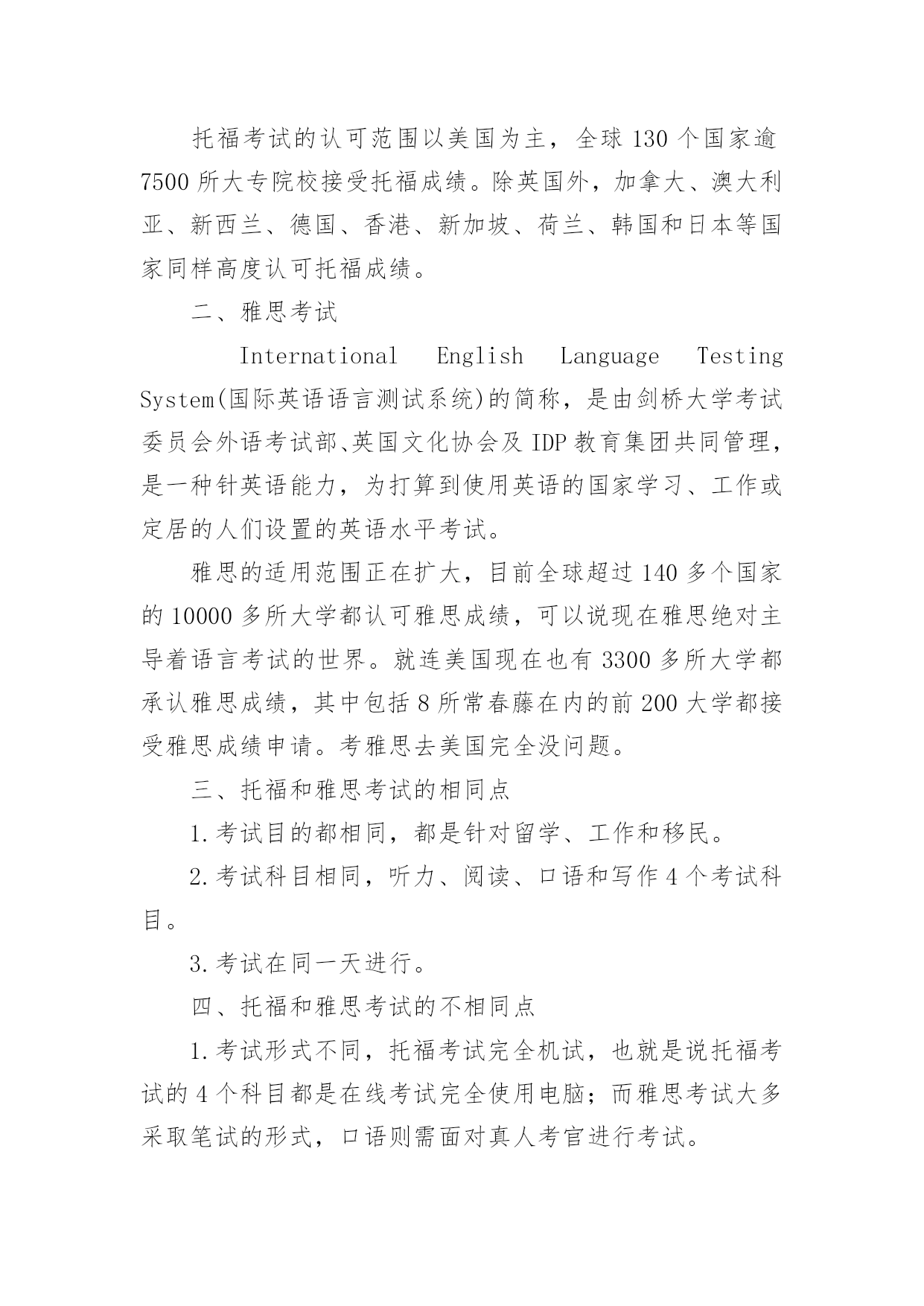托福和雅思单词的区别 托福和雅思单词的区别雅思与托福,不管是参加哪个考试,都需要有一定的单词做基础。以下是小编为您整理的托福和雅思单词的区别相关资料,欢迎阅读!托福和雅思单词的区别雅思和托福单词区别是什么?首先,托福单词比雅思单词多。托福单词甚至可以用来作为GMAT的单词量。不过也不是掌握了托福单词去考雅思就没有问题了。其次,雅思单词和托福单词也有很多的交集,二者的交集大概就是英语六级单词了托福偏向于理工科,而雅思偏向地理(经常考火山、地震、植物、化石什么的'),人文(有什么历史事件,什么学科分类),还有学术(经常考校园里的场景,图书馆教务处实验室什么的)。如果你要考雅思的话,最好不要用托福单词来准备,在托福和雅思单词区别的方面,一是不需要花那么大气力,很多单词都用不到。二是雅思的很多单词托福也不会覆盖。雅思和托福单词没那么难搞,通常集中准备一个月就差不多了。托福和雅思的区别一、托福考试TheTestofEnglishasaForeignLanguage(检定非英语为母语者的英语能力考试)的简称,是由ETS(美国教育考试服务中心)举办的英语能力测试。托福考试的认可范围以美国为主,全球130个国家逾7500所大专院校接受托福成绩。除英国外,加拿大、澳大利亚、新西兰、德国、香港、新加坡、荷兰、韩国和日本等国家同样高度认可托福成绩。二、雅思考试InternationalEnglishLanguageTestingSystem(国际英语语言测试系统)的简称,是由剑桥大学考试委员会外语考试部、英国文化协会及IDP教育集团共同管理,是一种针英语能力,为打算到使用英语的国家学习、工作或定居的人们设置的英语水平考试。雅思的适用范围正在扩大,目前全球超过140多个国家的10000多所大学都认可雅思成绩,可以说现在雅思绝对主导着语言考试的世界。就连美国现在也有3300多所大学都承认雅思成绩,其中包括8所常春藤在内的前200大学都接受雅思成绩申请。考雅思去美国完全没问题。三、托福和雅思考试的相同点1.考试目的都相同,都是针对留学、工作和移民。2.考试科目相同,听力、阅读、口语和写作4个考试科目。3.考试在同一天进行。四、托福和雅思考试的不相同点1.考试形式不同,托福考试完全机试,也就是说托福考试的4个科目都是在线考试完全使用电脑;而雅思考试大多采取笔试的形式,口语则需面对真人考官进行考试。2.考试内容上的区别,雅思考试内容较生活化,考试内容会涉及到生活场景,例如学校、社团、银行、图书馆、医院等等,都偏向于生活应用类,注重考查的是考生在英语国家的生存能力;而托福则较偏向于学术,考试内容更加书本化,例如历史、地理、人文、社科类内容,侧重于考查英语这门语言的规范性和技巧性。相比较而言,雅思更容易些。3.考试成绩不同,托福考试满分120分,单科满分30分,总分取单科成绩和;雅思考试总分9分,单科满分也是9分,总分取单科平均分。4.考试时间不同,托福考试全程约为4个小时,而雅思考试全程约为3个小时。5.适用范围不同,托福考试更适用于去北美国家,如去美国或加拿大留学的学生(虽然前文提到过去美国也可以考雅思,但是托福更加广泛适用);而雅思考试则适合于申请赴英联邦、澳洲等国家留学和移民。