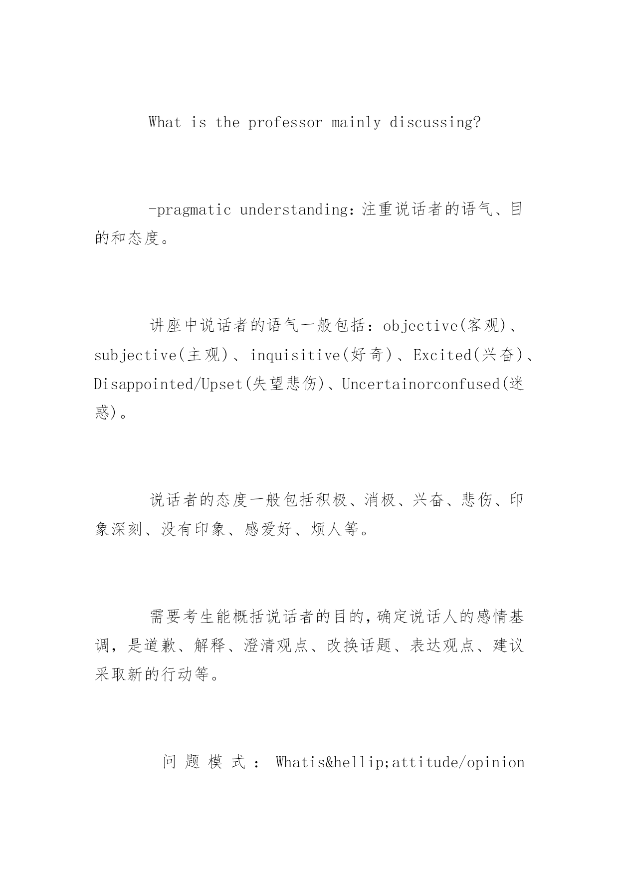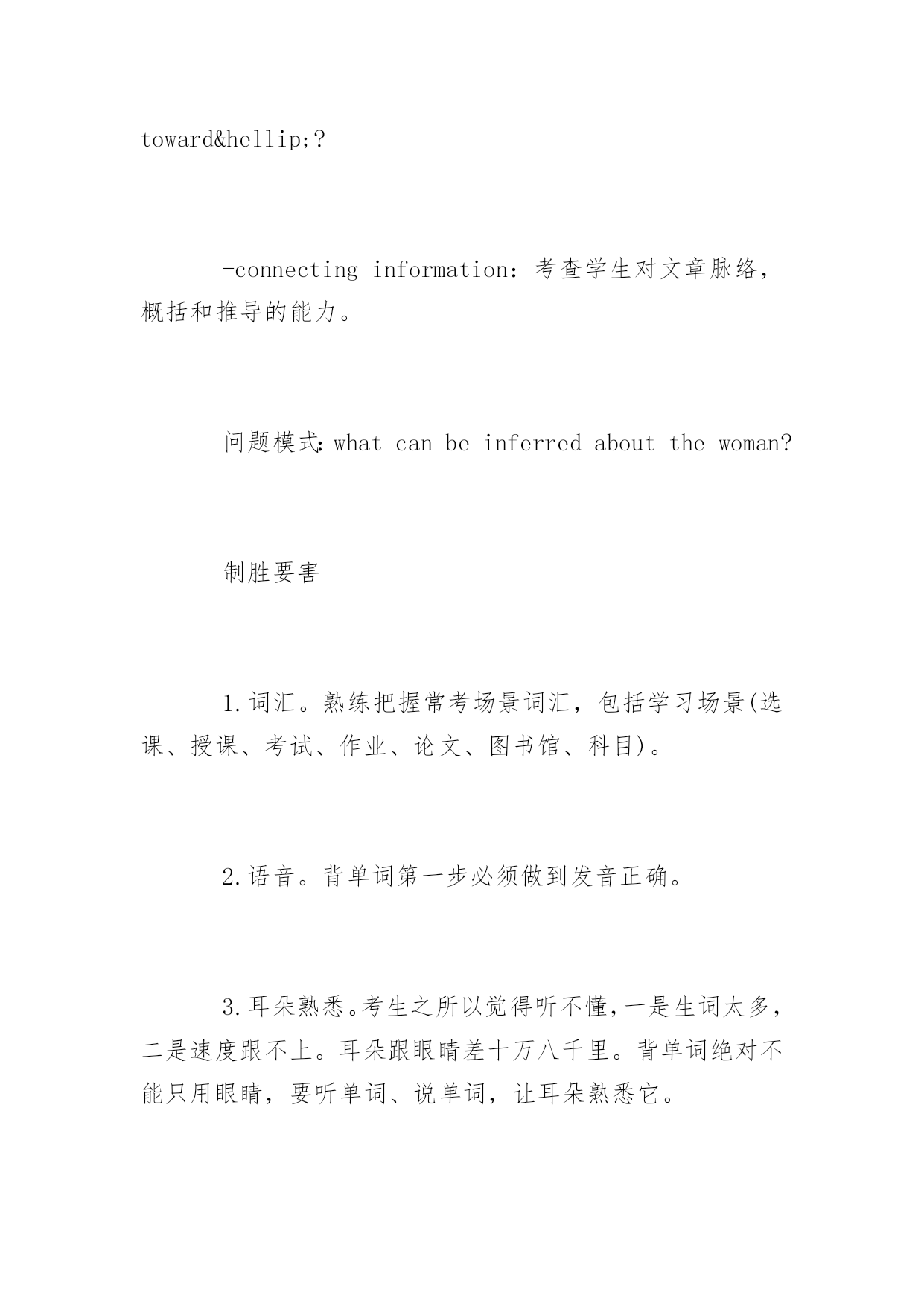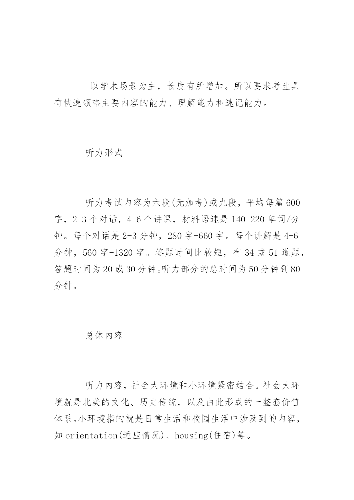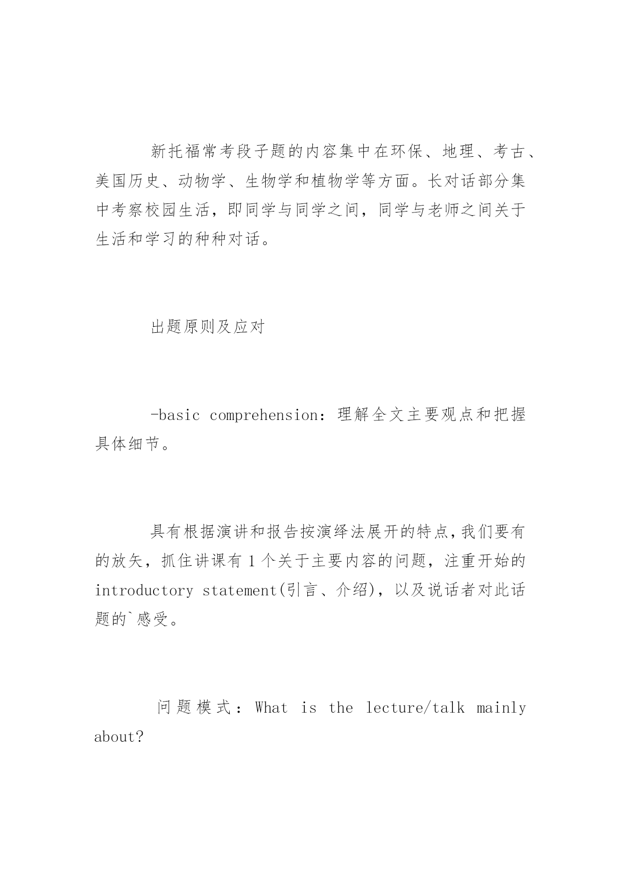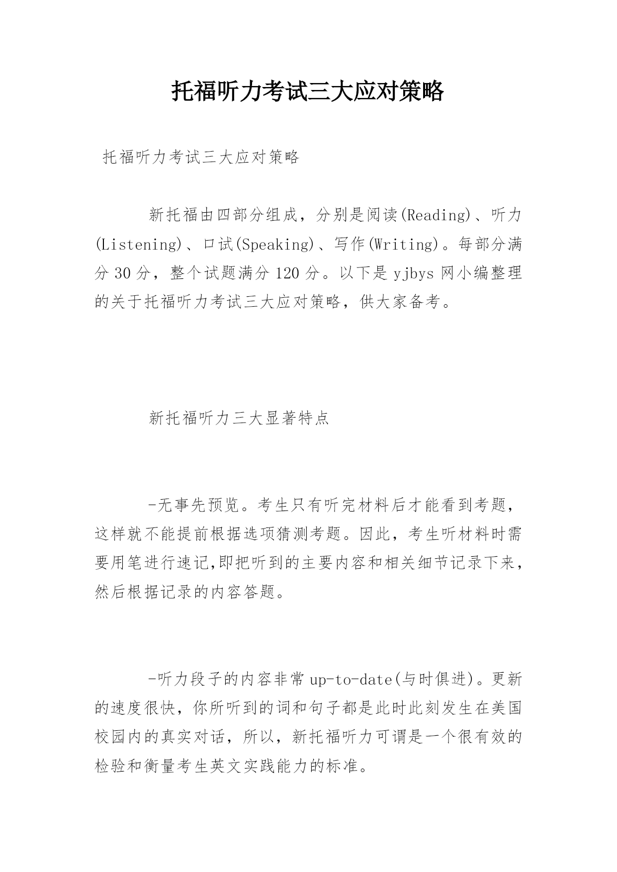 托福听力考试三大应对策略 托福听力考试三大应对策略 新托福由四部分组成,分别是阅读(Reading)、听力(Listening)、口试(Speaking)、写作(Writing)。每部分满分30分,整个试题满分120分。以下是yjbys网小编整理的关于托福听力考试三大应对策略,供大家备考。 新托福听力三大显著特点 -无事先预览。考生只有听完材料后才能看到考题,这样就不能提前根据选项猜测考题。因此,考生听材料时需要用笔进行速记,即把听到的主要内容和相关细节记录下来,然后根据记录的内容答题。 -听力段子的内容非常up-to-date(与时俱进)。更新的速度很快,你所听到的词和句子都是此时此刻发生在美国校园内的真实对话,所以,新托福听力可谓是一个很有效的检验和衡量考生英文实践能力的标准。 -以学术场景为主,长度有所增加。所以要求考生具有快速领略主要内容的能力、理解能力和速记能力。 听力形式 听力考试内容为六段(无加考)或九段,平均每篇600字,2-3个对话,4-6个讲课,材料语速是140-220单词/分钟。每个对话是2-3分钟,280字-660字。每个讲解是4-6分钟,560字-1320字。答题时间比较短,有34或51道题,答题时间为20或30分钟。听力部分的总时间为50分钟到80分钟。 总体内容 听力内容,社会大环境和小环境紧密结合。社会大环境就是北美的文化、历史传统,以及由此形成的一整套价值体系。小环境指的就是日常生活和校园生活中涉及到的内容,如orientation(适应情况)、housing(住宿)等。 新托福常考段子题的内容集中在环保、地理、考古、美国历史、动物学、生物学和植物学等方面。长对话部分集中考察校园生活,即同学与同学之间,同学与老师之间关于生活和学习的种种对话。 出题原则及应对 -basiccomprehension:理解全文主要观点和把握具体细节。 具有根据演讲和报告按演绎法展开的特点,我们要有的放矢,抓住讲课有1个关于主要内容的问题,注重开始的introductorystatement(引言、介绍),以及说话者对此话题的`感受。 问题模式:Whatisthelecture/talkmainlyabout? Whatistheprofessormainlydiscussing? -pragmaticunderstanding:注重说话者的语气、目的和态度。 讲座中说话者的语气一般包括:objective(客观)、subjective(主观)、inquisitive(好奇)、Excited(兴奋)、Disappointed/Upset(失望悲伤)、Uncertainorconfused(迷惑)。 说话者的态度一般包括积极、消极、兴奋、悲伤、印象深刻、没有印象、感爱好、烦人等。 需要考生能概括说话者的目的,确定说话人的感情基调,是道歉、解释、澄清观点、改换话题、表达观点、建议采取新的行动等。 问题模式:Whatis…attitude/opiniontoward…? -connectinginformation:考查学生对文章脉络,概括和推导的能力。 问题模式:whatcanbeinferredaboutthewoman? 制胜要害 1.词汇。熟练把握常考场景词汇,包括学习场景(选课、授课、考试、作业、论文、图书馆、科目)。 2.语音。背单词第一步必须做到发音正确。 3.耳朵熟悉。考生之所以觉得听不懂,一是生词太多,二是速度跟不上。耳朵跟眼睛差十万八千里。背单词绝对不能只用眼睛,要听单词、说单词,让耳朵熟悉它。 4.在托福听力中,考生注重动词和形容词要见一个背一个。因为动词是一个句子的灵魂,而形容词则表明立场、状态和心情。此外还要注重词性的变化,比如carnivore变成了形容词carnivorous,autumn成了形容词autumnal,看懂不成问题。但是听起来由于重音的变化,进而成了生词。所以一定要做到音形同步。 5.把握美音发音特点,注重连读、弱化和爆破。 6.熟练把握语气语调,判定态度和立场。 7.推敲出题规律,边听,边判定出什么地方有题。 8.练习边听边记,不是逐字逐句都记,而是有题的地方才记。