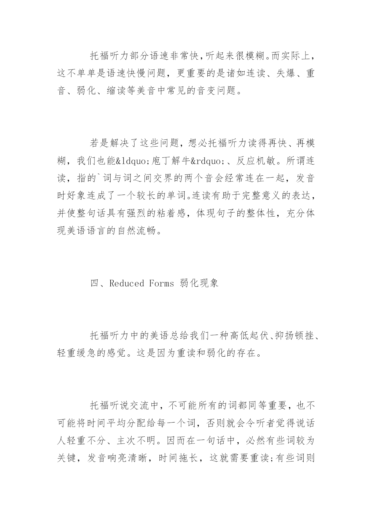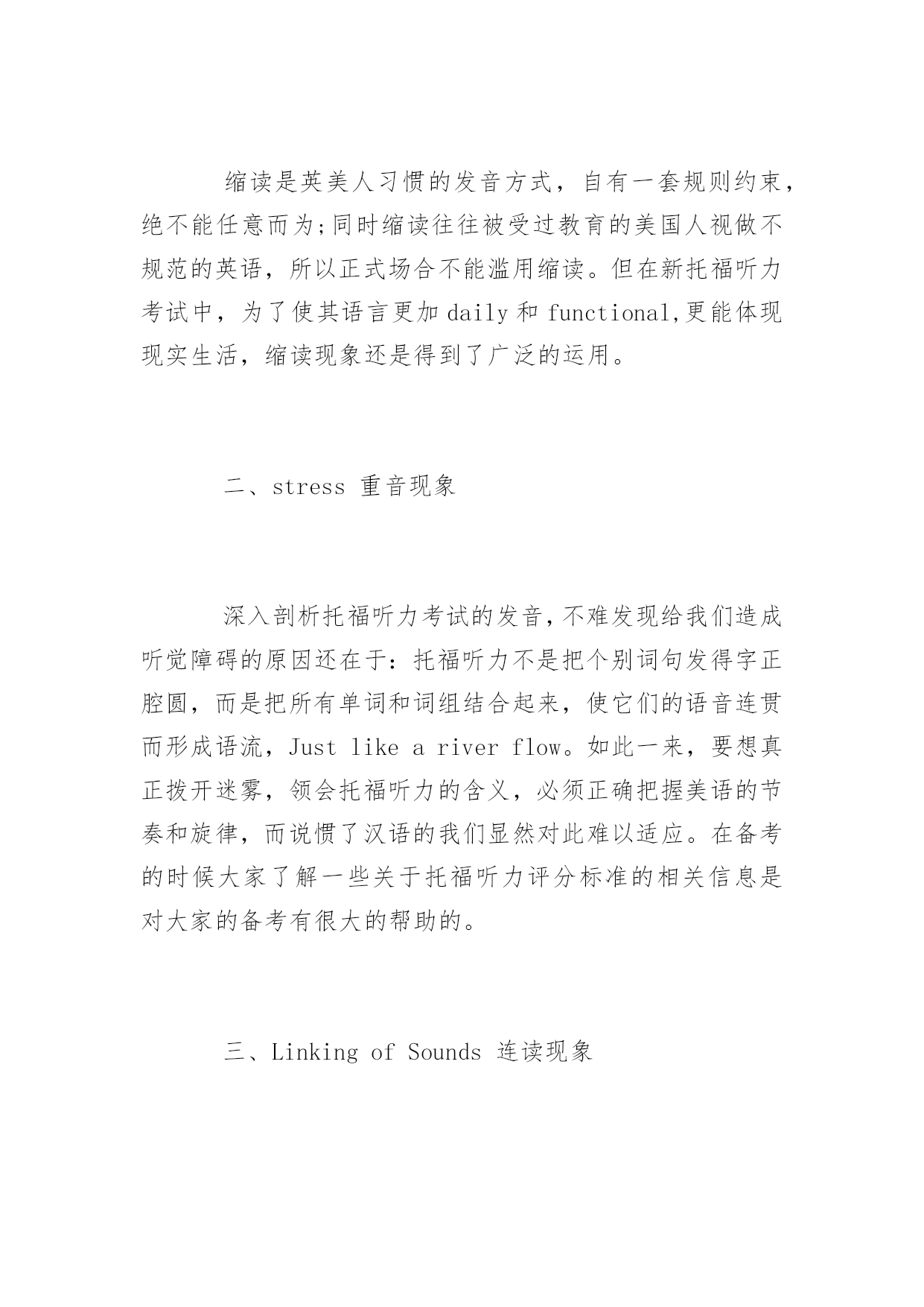 托福听力辨音方法 2016托福听力辨音方法 托福考试的第二部分--听力,题型有两类,一类是conversation,一类是lecture。两类题型的内容都是基于大学里面发生的实际情况而设置的。以下是yjbys网小编整理的关于托福听力辨音方法,希望对考生们有用。 一、Contractions缩读现象 在托福听力中,还有一个造成应试者听觉障碍的大敌是美语的缩读现象,掌握了这种现象的规律就等于掌握了攻克托福听力的另一大诀窍。 由于托福听力中含有大量的托福口语素材,使得讲话人使用大量非正式的口语体,所以在发音中,不仅会把弱读的词弱读,有时会省略某些音,使说话和朗读更自然流畅,达到更加smoothlyandsoftly的效果,这种现象称作缩读。 缩读是英美人习惯的发音方式,自有一套规则约束,绝不能任意而为;同时缩读往往被受过教育的美国人视做不规范的英语,所以正式场合不能滥用缩读。但在新托福听力考试中,为了使其语言更加daily和functional,更能体现现实生活,缩读现象还是得到了广泛的运用。 二、stress重音现象 深入剖析托福听力考试的发音,不难发现给我们造成听觉障碍的原因还在于:托福听力不是把个别词句发得字正腔圆,而是把所有单词和词组结合起来,使它们的语音连贯而形成语流,Justlikeariverflow。如此一来,要想真正拨开迷雾,领会托福听力的含义,必须正确把握美语的节奏和旋律,而说惯了汉语的我们显然对此难以适应。在备考的时候大家了解一些关于托福听力评分标准的相关信息是对大家的备考有很大的帮助的。 三、LinkingofSounds连读现象 托福听力部分语速非常快,听起来很模糊。而实际上,这不单单是语速快慢问题,更重要的是诸如连读、失爆、重音、弱化、缩读等美音中常见的音变问题。 若是解决了这些问题,想必托福听力读得再快、再模糊,我们也能“庖丁解牛”、反应机敏。所谓连读,指的`词与词之间交界的两个音会经常连在一起,发音时好象连成了一个较长的单词。连读有助于完整意义的表达,并使整句话具有强烈的粘着感,体现句子的整体性,充分体现美语语言的自然流畅。 四、ReducedForms弱化现象 托福听力中的美语总给我们一种高低起伏、抑扬顿挫、轻重缓急的感觉。这是因为重读和弱化的存在。 托福听说交流中,不可能所有的词都同等重要,也不可能将时间平均分配给每一个词,否则就会令听者觉得说话人轻重不分、主次不明。因而在一句话中,必然有些词较为关键,发音响亮清晰,时间拖长,这就需要重读;有些词则相应对次要一些,发音时间缩短,同时加以弱化,这样整个句子就显得分配得当。实际上,在朗读句子的时候,只要我们注意到了弱读,重读也就自然而然地体现出来了。