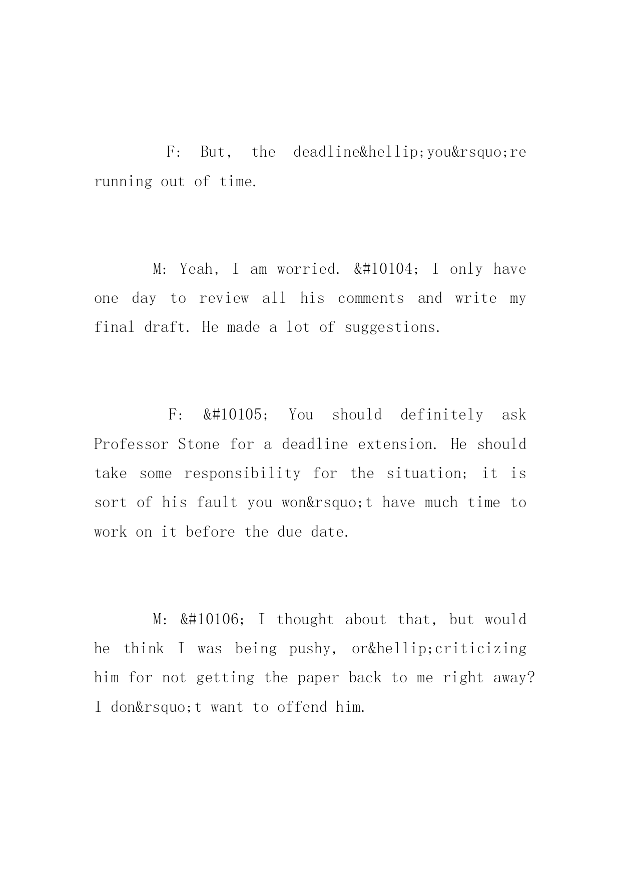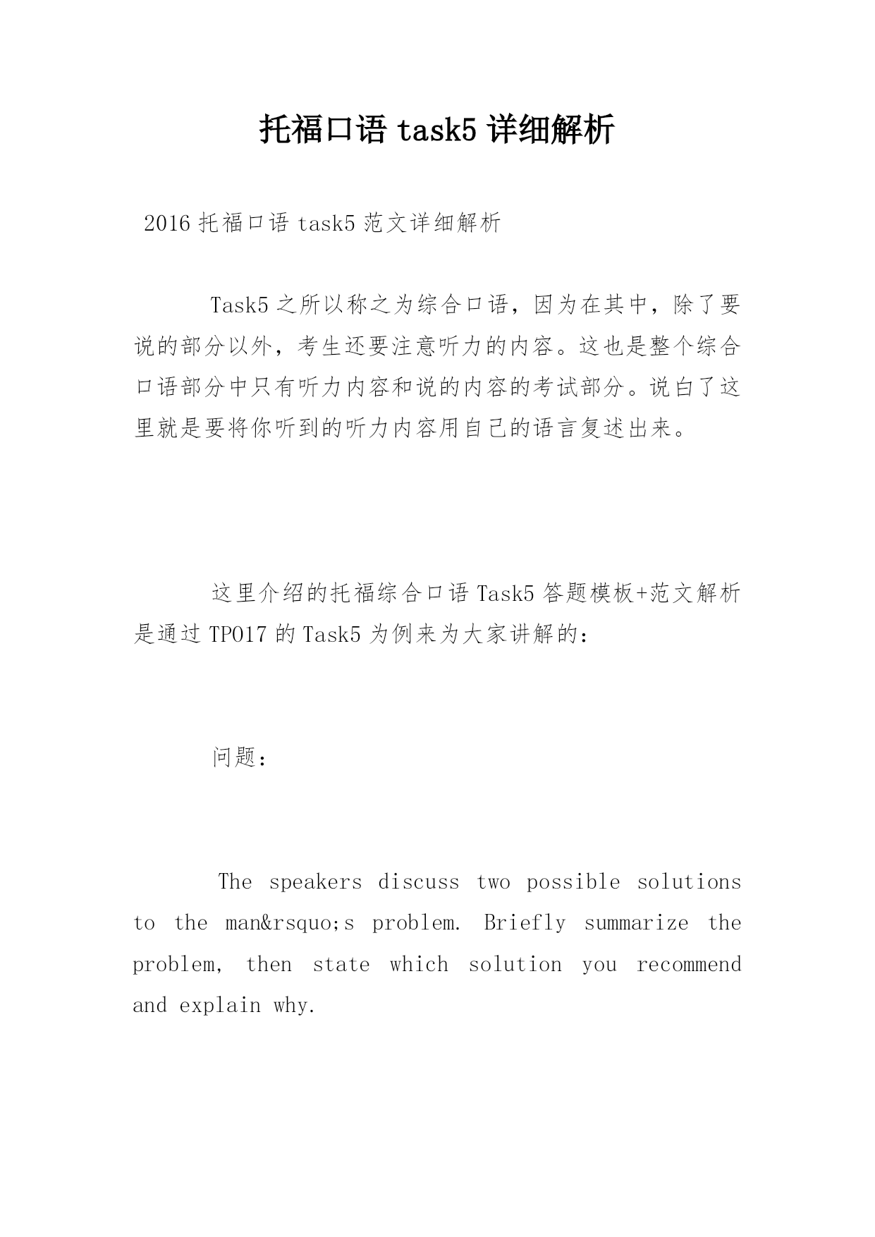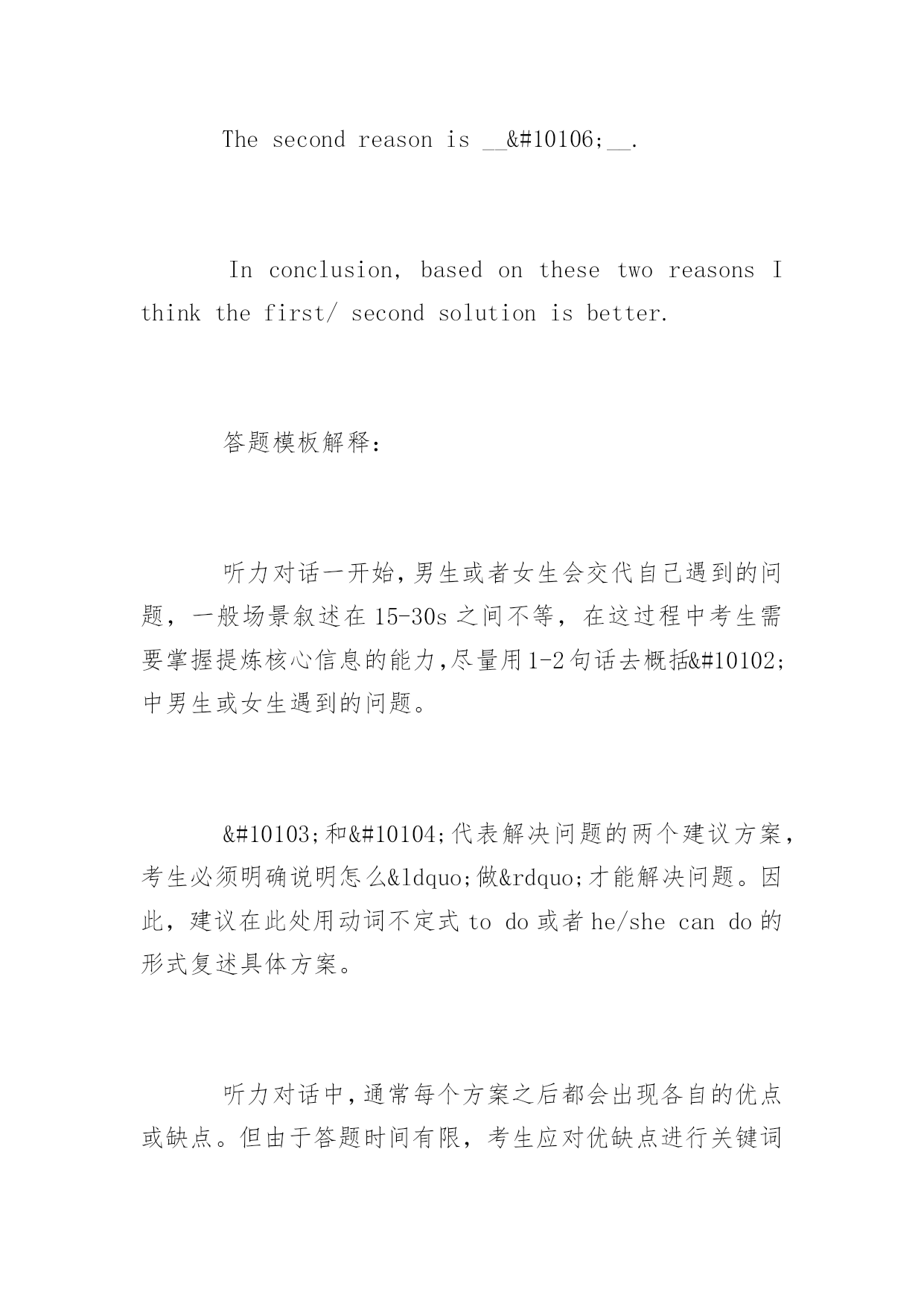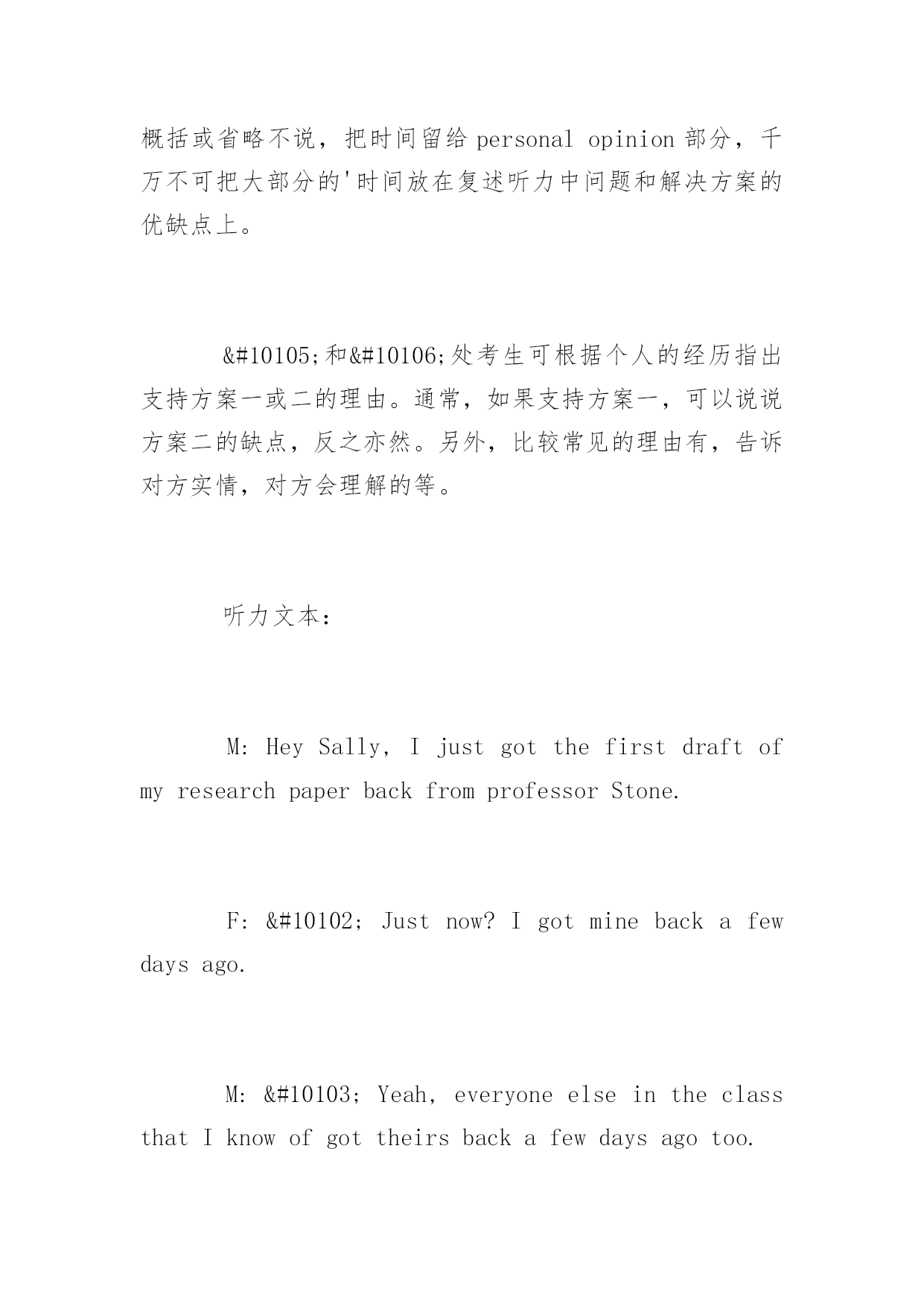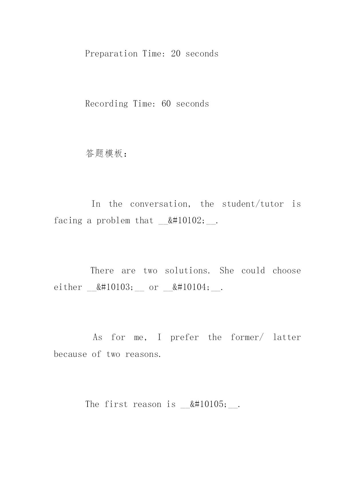托福口语task5详细解析 2016托福口语task5范文详细解析 Task5之所以称之为综合口语,因为在其中,除了要说的部分以外,考生还要注意听力的内容。这也是整个综合口语部分中只有听力内容和说的内容的考试部分。说白了这里就是要将你听到的听力内容用自己的语言复述出来。 这里介绍的托福综合口语Task5答题模板+范文解析是通过TPO17的Task5为例来为大家讲解的: 问题: Thespeakersdiscusstwopossiblesolutionstotheman’sproblem.Brieflysummarizetheproblem,thenstatewhichsolutionyourecommendandexplainwhy. PreparationTime:20seconds RecordingTime:60seconds 答题模板: Intheconversation,thestudent/tutorisfacingaproblemthat__❶__. Therearetwosolutions.Shecouldchooseeither__❷__or__❸__. Asforme,Iprefertheformer/latterbecauseoftworeasons. Thefirstreasonis__❹__. Thesecondreasonis__❺__. Inconclusion,basedonthesetworeasonsIthinkthefirst/secondsolutionisbetter. 答题模板解释: 听力对话一开始,男生或者女生会交代自己遇到的问题,一般场景叙述在15-30s之间不等,在这过程中考生需要掌握提炼核心信息的能力,尽量用1-2句话去概括❶中男生或女生遇到的问题。 ❷和❸代表解决问题的两个建议方案,考生必须明确说明怎么“做”才能解决问题。因此,建议在此处用动词不定式todo或者he/shecando的形式复述具体方案。 听力对话中,通常每个方案之后都会出现各自的优点或缺点。但由于答题时间有限,考生应对优缺点进行关键词概括或省略不说,把时间留给personalopinion部分,千万不可把大部分的'时间放在复述听力中问题和解决方案的优缺点上。 ❹和❺处考生可根据个人的经历指出支持方案一或二的理由。通常,如果支持方案一,可以说说方案二的缺点,反之亦然。另外,比较常见的理由有,告诉对方实情,对方会理解的等。 听力文本: M:HeySally,IjustgotthefirstdraftofmyresearchpaperbackfromprofessorStone. F:❶Justnow?Igotminebackafewdaysago. M:❷Yeah,everyoneelseintheclassthatIknowofgottheirsbackafewdaysagotoo. F:But,thedeadline…you’rerunningoutoftime. M:Yeah,Iamworried.❸Ionlyhaveonedaytoreviewallhiscommentsandwritemyfinaldraft.Hemadealotofsuggestions. F:❹YoushoulddefinitelyaskProfessorStoneforadeadlineextension.Heshouldtakesomeresponsibilityforthesituation;itissortofhisfaultyouwon’thavemuchtimetoworkonitbeforetheduedate. M:❺Ithoughtaboutthat,butwouldhethinkIwasbeingpushy,or…criticizinghimfornotgettingthepaperbacktomerightaway?Idon’twanttooffendhim. F:True,butit’syourgradewe’retalkingabout.You’vegotalegitimateconcern,butit’sunderstandableifyou’reuncomfortableasking. M:Yeah…I’min