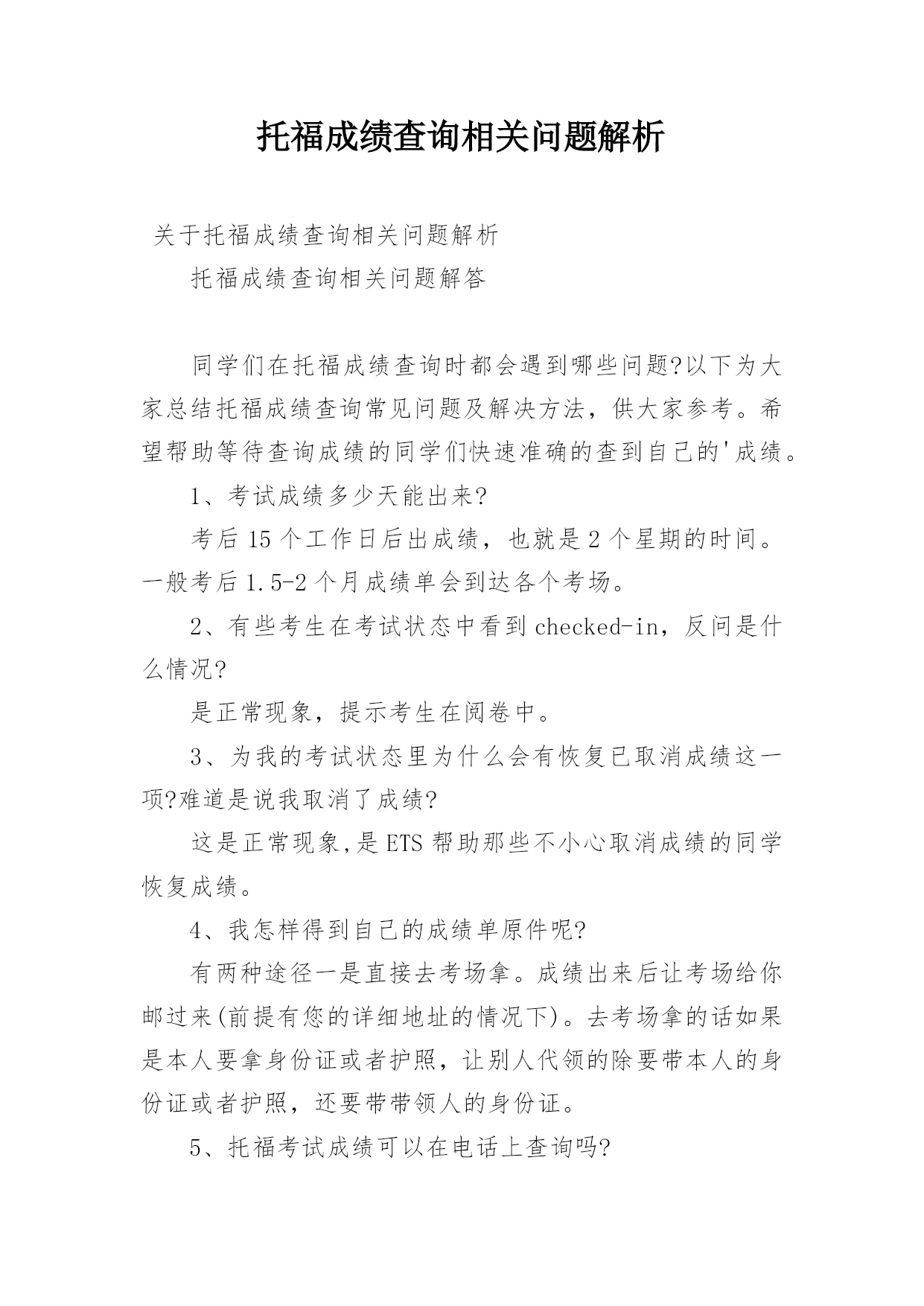 托福成绩查询相关问题解析 关于托福成绩查询相关问题解析托福成绩查询相关问题解答同学们在托福成绩查询时都会遇到哪些问题?以下为大家总结托福成绩查询常见问题及解决方法,供大家参考。希望帮助等待查询成绩的同学们快速准确的查到自己的'成绩。1、考试成绩多少天能出来?考后15个工作日后出成绩,也就是2个星期的时间。一般考后1.5-2个月成绩单会到达各个考场。2、有些考生在考试状态中看到checked-in,反问是什么情况?是正常现象,提示考生在阅卷中。3、为我的考试状态里为什么会有恢复已取消成绩这一项?难道是说我取消了成绩?这是正常现象,是ETS帮助那些不小心取消成绩的同学恢复成绩。4、我怎样得到自己的成绩单原件呢?有两种途径一是直接去考场拿。成绩出来后让考场给你邮过来(前提有您的详细地址的情况下)。去考场拿的话如果是本人要拿身份证或者护照,让别人代领的除要带本人的身份证或者护照,还要带带领人的身份证。5、托福考试成绩可以在电话上查询吗?不好意思没有,请登录官网查询成绩。6、成绩怎么被HOLD了,怎么办?成绩被hold原因很多,其中多数是因为考试时或者考生在考场内违反考场纪律引起的,对于这种情况,需要考生向ETS解释清楚,否则成绩将会被永远hold。也有一些是由于ETS自身的原因导致HOLD,具体咨询托福考试中国大陆地区。