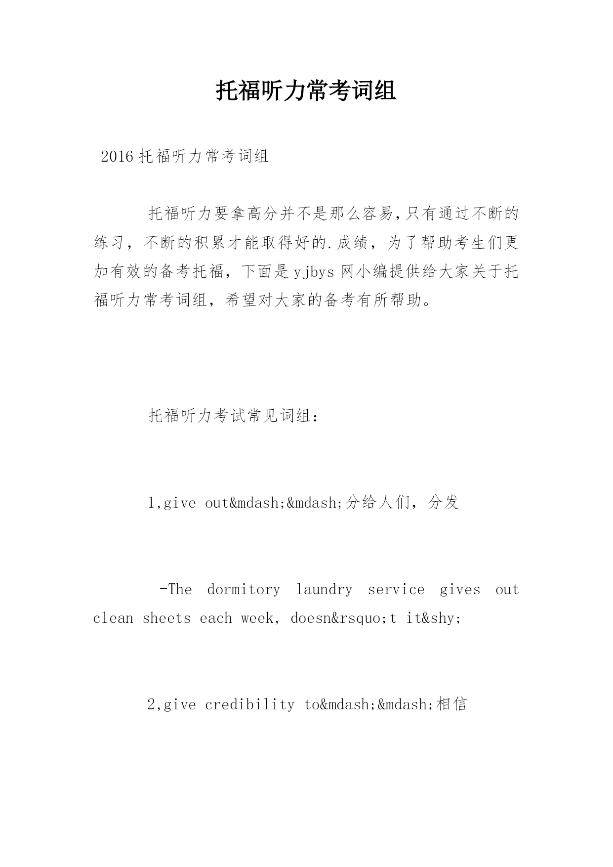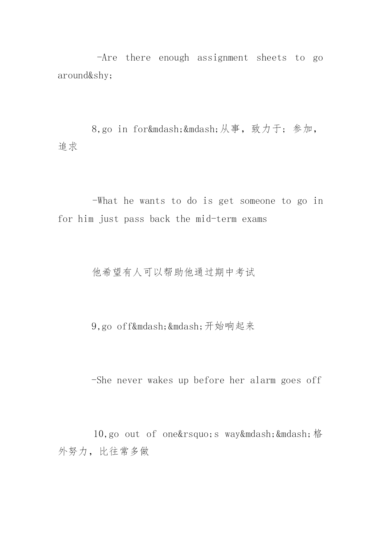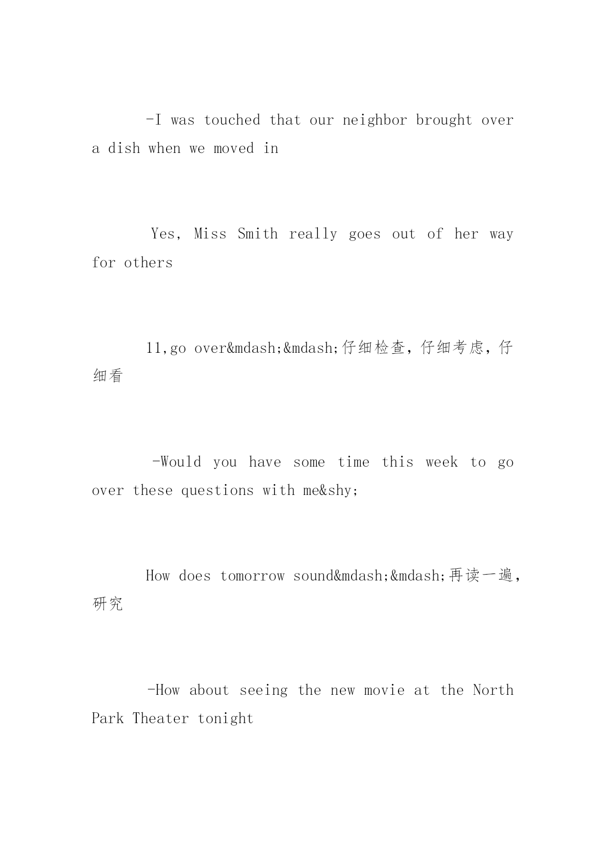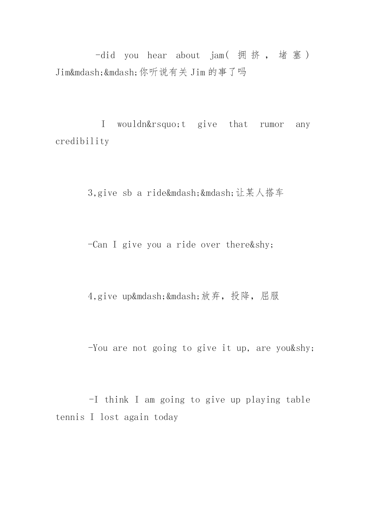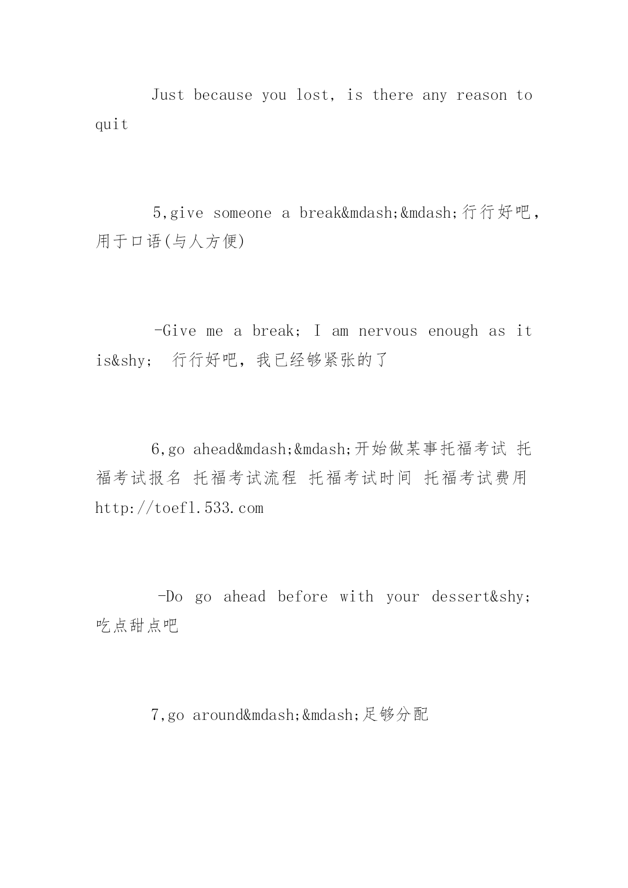 托福听力常考词组 2016托福听力常考词组 托福听力要拿高分并不是那么容易,只有通过不断的练习,不断的积累才能取得好的.成绩,为了帮助考生们更加有效的备考托福,下面是yjbys网小编提供给大家关于托福听力常考词组,希望对大家的备考有所帮助。 托福听力考试常见词组: 1,giveout——分给人们,分发 -Thedormitorylaundryservicegivesoutcleansheetseachweek,doesn’tit­ 2,givecredibilityto——相信 -didyouhearaboutjam(拥挤,堵塞)Jim——你听说有关Jim的事了吗 Iwouldn’tgivethatrumoranycredibility 3,givesbaride——让某人搭车 -CanIgiveyouarideoverthere­ 4,giveup——放弃,投降,屈服 -Youarenotgoingtogiveitup,areyou­ -IthinkIamgoingtogiveupplayingtabletennisIlostagaintoday Justbecauseyoulost,isthereanyreasontoquit 5,givesomeoneabreak——行行好吧,用于口语(与人方便) -Givemeabreak;Iamnervousenoughasitis­行行好吧,我已经够紧张的了 6,goahead——开始做某事托福考试托福考试报名托福考试流程托福考试时间托福考试费用http://toefl.533.com -Dogoaheadbeforewithyourdessert­吃点甜点吧 7,goaround——足够分配 -Arethereenoughassignmentsheetstogoaround­ 8,goinfor——从事,致力于;参加,追求 -Whathewantstodoisgetsomeonetogoinforhimjustpassbackthemid-termexams 他希望有人可以帮助他通过期中考试 9,gooff——开始响起来 -Sheneverwakesupbeforeheralarmgoesoff 10,gooutofone’sway——格外努力,比往常多做 -Iwastouchedthatourneighborbroughtoveradishwhenwemovedin Yes,MissSmithreallygoesoutofherwayforothers 11,goover——仔细检查,仔细考虑,仔细看 -Wouldyouhavesometimethisweektogooverthesequestionswithme­ Howdoestomorrowsound——再读一遍,研究 -HowaboutseeingthenewmovieattheNorthParkTheatertonight Soundsgreat,butIgottogoovermynotesfortomorrow’smid-term 12,gothroughtheproperchannels——通过适当的途径,方式 -Inordertodothat,youhavetogothroughtheproperchannels 13,gothrough——穿过 -Apolicemansawyougothroughthatreadlight Itwasyellow;anyway,heturnedleftatthelastcorner 14,gothroughwith——完成 -Iamgettingabsolutelynowherewiththesephysicsproblems Howaboutmygothroughthemwithyou 15,goodbargain——很便宜 -Didyoubuyanyofthesweatersthatwereonsale­ Buyany­Igotfiveofthem;itwassuchagoodbargain 16,handin——交上 -Ica