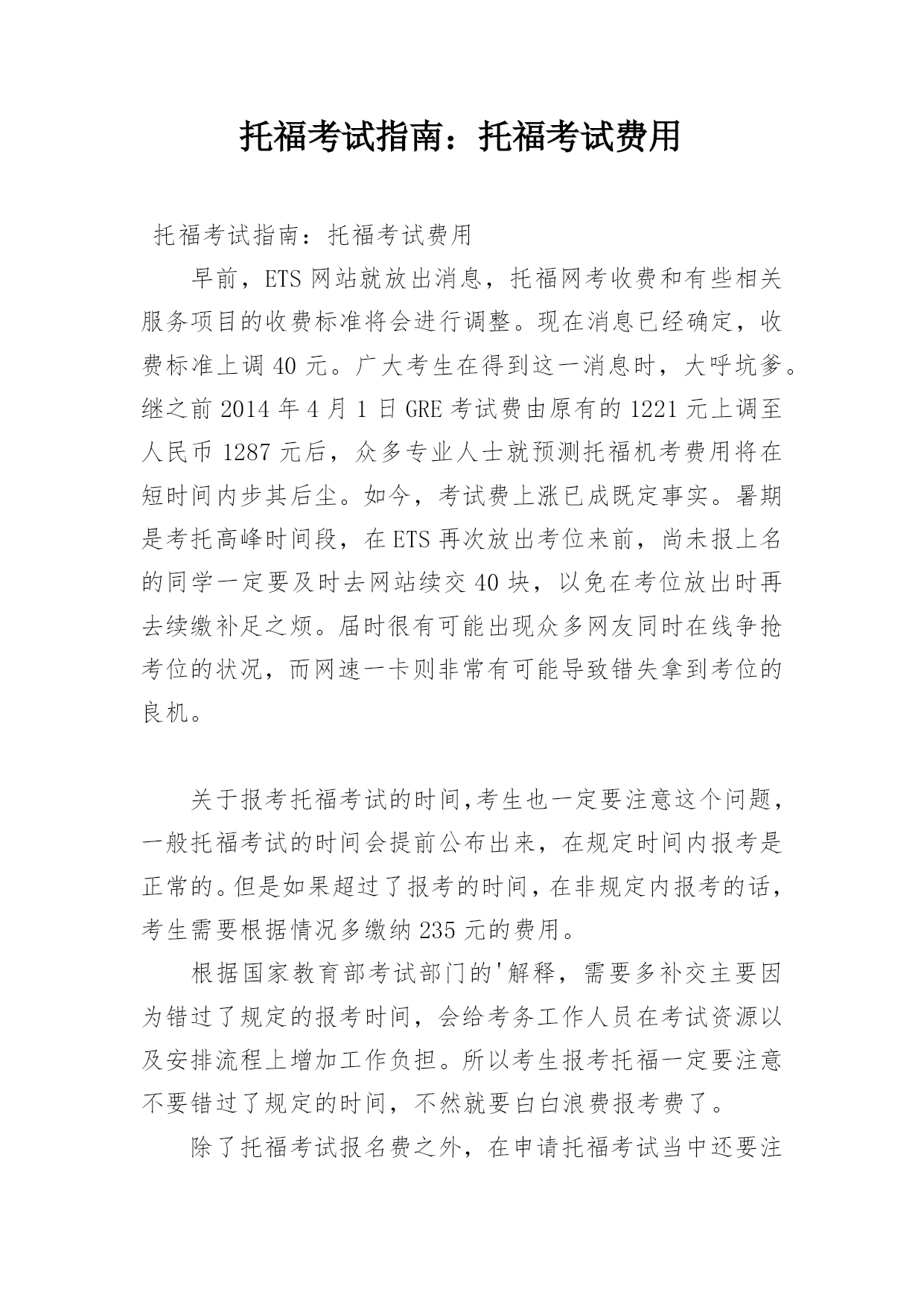 托福考试指南:托福考试费用 托福考试指南:托福考试费用早前,ETS网站就放出消息,托福网考收费和有些相关服务项目的收费标准将会进行调整。现在消息已经确定,收费标准上调40元。广大考生在得到这一消息时,大呼坑爹。继之前2014年4月1日GRE考试费由原有的1221元上调至人民币1287元后,众多专业人士就预测托福机考费用将在短时间内步其后尘。如今,考试费上涨已成既定事实。暑期是考托高峰时间段,在ETS再次放出考位来前,尚未报上名的同学一定要及时去网站续交40块,以免在考位放出时再去续缴补足之烦。届时很有可能出现众多网友同时在线争抢考位的状况,而网速一卡则非常有可能导致错失拿到考位的良机。关于报考托福考试的时间,考生也一定要注意这个问题,一般托福考试的时间会提前公布出来,在规定时间内报考是正常的。但是如果超过了报考的时间,在非规定内报考的话,考生需要根据情况多缴纳235元的费用。根据国家教育部考试部门的'解释,需要多补交主要因为错过了规定的报考时间,会给考务工作人员在考试资源以及安排流程上增加工作负担。所以考生报考托福一定要注意不要错过了规定的时间,不然就要白白浪费报考费了。除了托福考试报名费之外,在申请托福考试当中还要注意一些细节,例如考生通过网上交付托福报名考试费用之后一定要记下交易的操作号码,这样可以便于后期出现问题方便查询。托福网考考试费1635元逾期报名附加费267元转考费535元恢复已取消的成绩135元成绩增送费(每份)126元口语或写作单项复议535元口语和写作双项复议1067元托福复习套餐1(不含考试费)920元托福复习套餐2520元托福复习套餐3325元托福复习套餐4180元折扣后报名费1400元考费差额195元考费差额2817.5元考费差额3865元考费差额41100元