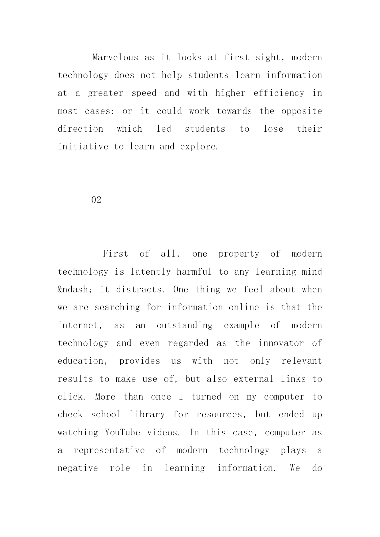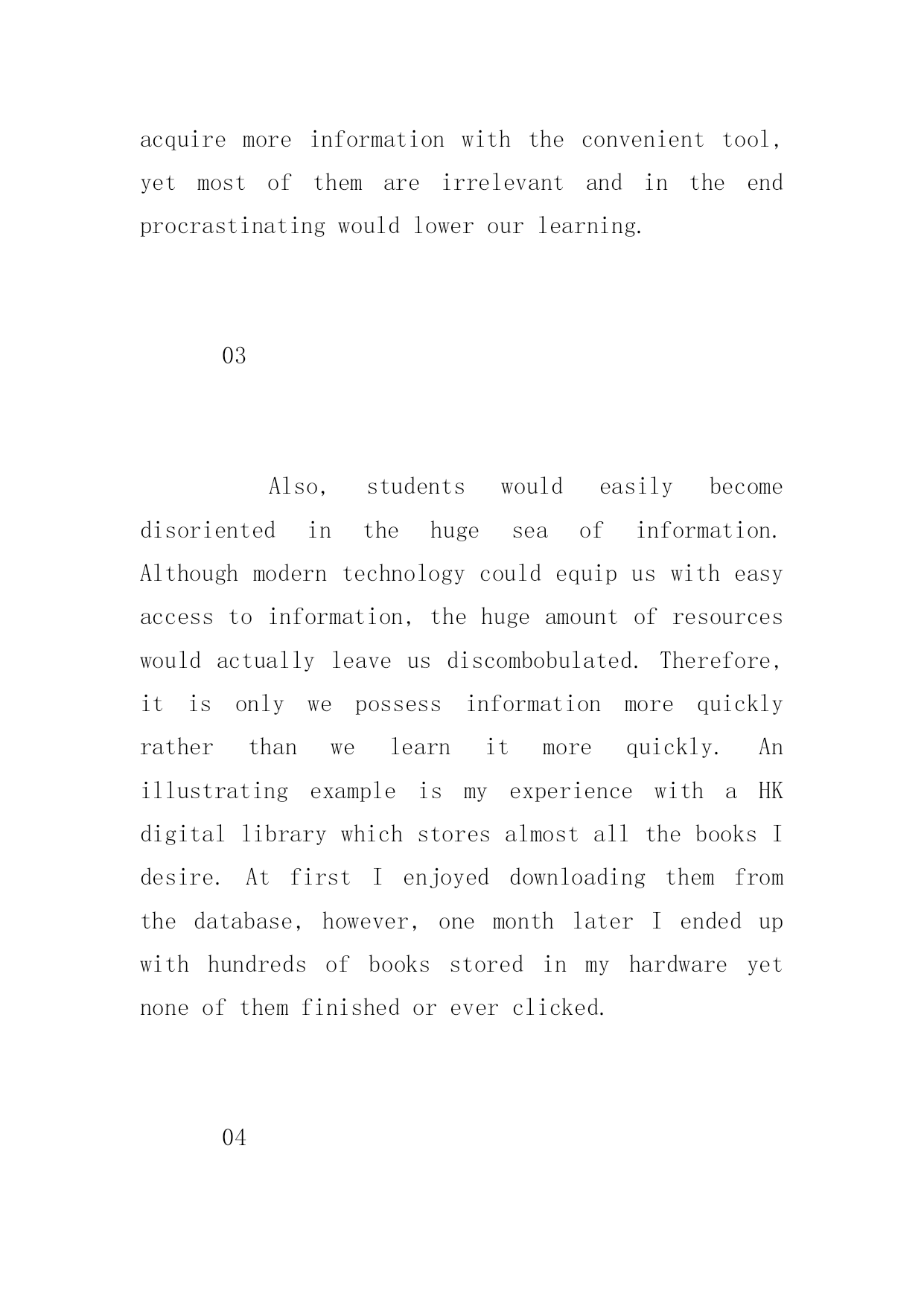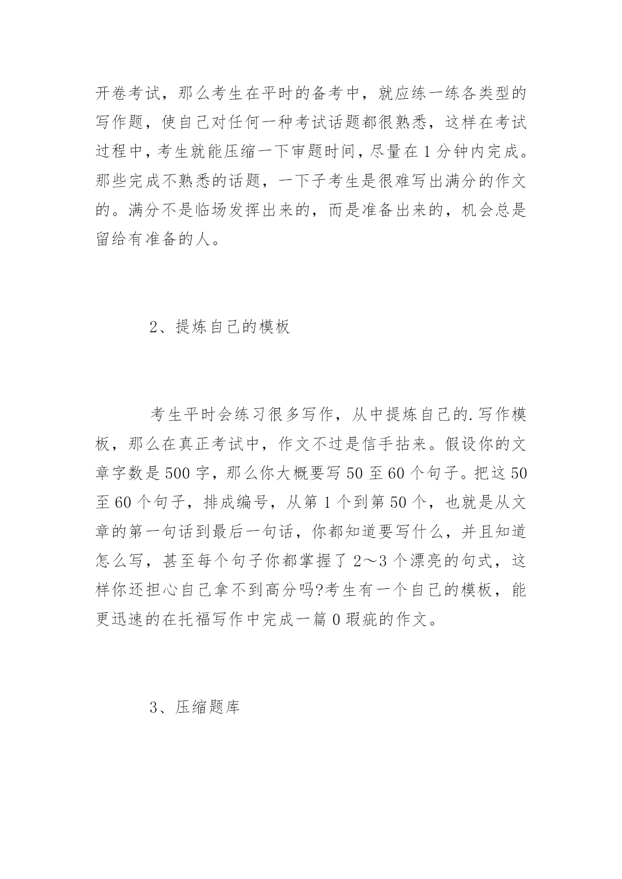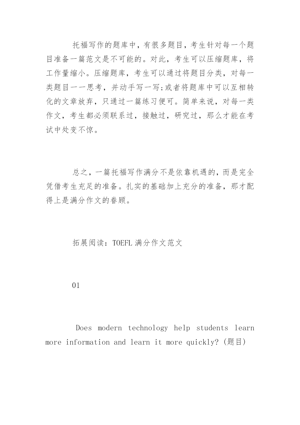 托福满分作文的三大写作技巧 托福满分作文的三大写作技巧 托福考试中,托福写作是最考核考生英语水平及能力的部分。在托福写作部分拿下高分已然不易,写一篇托福满分作文着实不易。但是,考生掌握了扎实的基础,在辅以一定的写作技巧,托福满分作文也触手可得。 要在托福写作中拿到满分,考生老老实实的拿基础去拼是不行的。对于基础较好的考生来说,此时,技巧才是利剑。那么,如何写一篇托福满分作文呢? 1、压缩审题时间 对于写作部分,一般考生都会花个好几分钟来仔细审题,做个构思。但是,托福考试的独立写作,实际上相当于是开卷考试了。首先题库公开,它的题型和题材都不会超出题库的范围,考生可以在题库中找到类似的题目,加之机经的强大力量,使得托福独立写作真的成了开卷考试。既然是开卷考试,那么考生在平时的备考中,就应练一练各类型的写作题,使自己对任何一种考试话题都很熟悉,这样在考试过程中,考生就能压缩一下审题时间,尽量在1分钟内完成。那些完成不熟悉的话题,一下子考生是很难写出满分的作文的。满分不是临场发挥出来的,而是准备出来的,机会总是留给有准备的人。 2、提炼自己的模板 考生平时会练习很多写作,从中提炼自己的.写作模板,那么在真正考试中,作文不过是信手拈来。假设你的文章字数是500字,那么你大概要写50至60个句子。把这50至60个句子,排成编号,从第1个到第50个,也就是从文章的第一句话到最后一句话,你都知道要写什么,并且知道怎么写,甚至每个句子你都掌握了2~3个漂亮的句式,这样你还担心自己拿不到高分吗?考生有一个自己的模板,能更迅速的在托福写作中完成一篇0瑕疵的作文。 3、压缩题库 托福写作的题库中,有很多题目,考生针对每一个题目准备一篇范文是不可能的。对此,考生可以压缩题库,将工作量缩小。压缩题库,考生可以通过将题目分类,对每一类题目一一思考,并动手写一写;或者将题库中可以互相转化的文章放弃,只通过一篇练习便可。简单来说,对每一类作文,考生都必须联系过,接触过,研究过,那么才能在考试中处变不惊。 总之,一篇托福写作满分不是依靠机遇的,而是完全凭借考生充足的准备。扎实的基础加上充分的准备,那才配得上是满分作文的眷顾。 拓展阅读:TOEFL满分作文范文 01 Doesmoderntechnologyhelpstudentslearnmoreinformationandlearnitmorequickly?(题目) Marvelousasitlooksatfirstsight,moderntechnologydoesnothelpstudentslearninformationatagreaterspeedandwithhigherefficiencyinmostcases;oritcouldworktowardstheoppositedirectionwhichledstudentstolosetheirinitiativetolearnandexplore. 02 Firstofall,onepropertyofmoderntechnologyislatentlyharmfultoanylearningmind–itdistracts.Onethingwefeelaboutwhenwearesearchingforinformationonlineisthattheinternet,asanoutstandingexampleofmoderntechnologyandevenregardedastheinnovatorofeducation,providesuswithnotonlyrelevantresultstomakeuseof,butalsoexternallinkstoclick.MorethanonceIturnedonmycomputertocheckschoollibraryforresources,butendedupwatchingYouTubevideos.Inthiscase,computerasarepresentativeofmoderntechnologyplaysanegativeroleinlearninginformation.Wedoacquiremoreinformationwiththeconvenienttool,yetmostofthemareirrelevantandintheendprocrastinatingwouldlowerourlearning. 03 Also,studentswouldeasilybecomedisorientedinthehugeseaofinformation.Althoughmoderntechnologycouldequipuswitheasyaccess