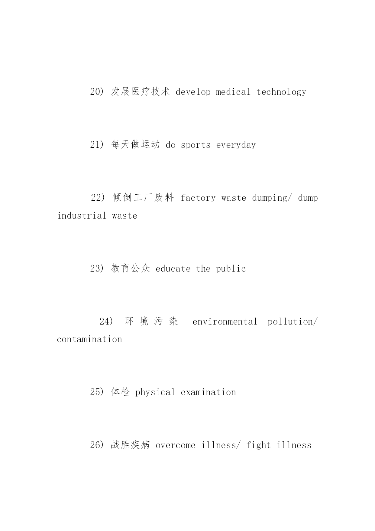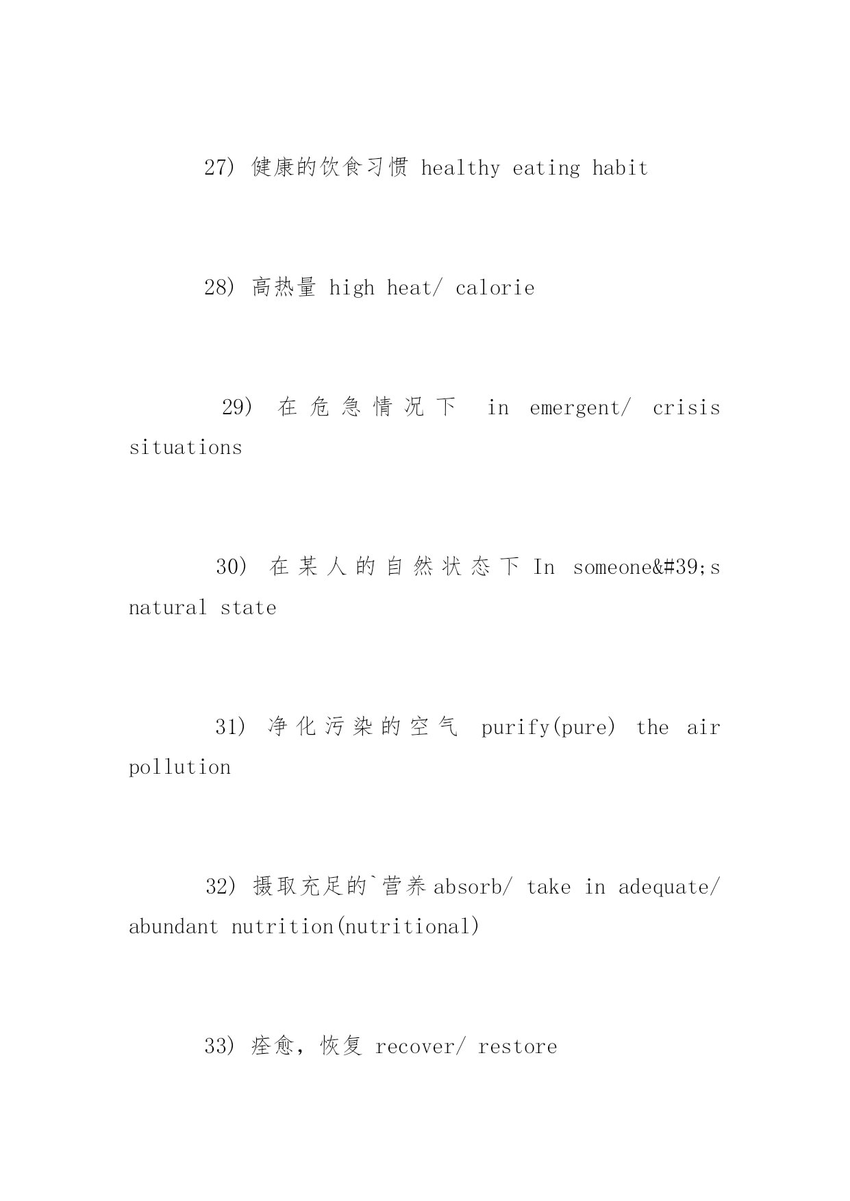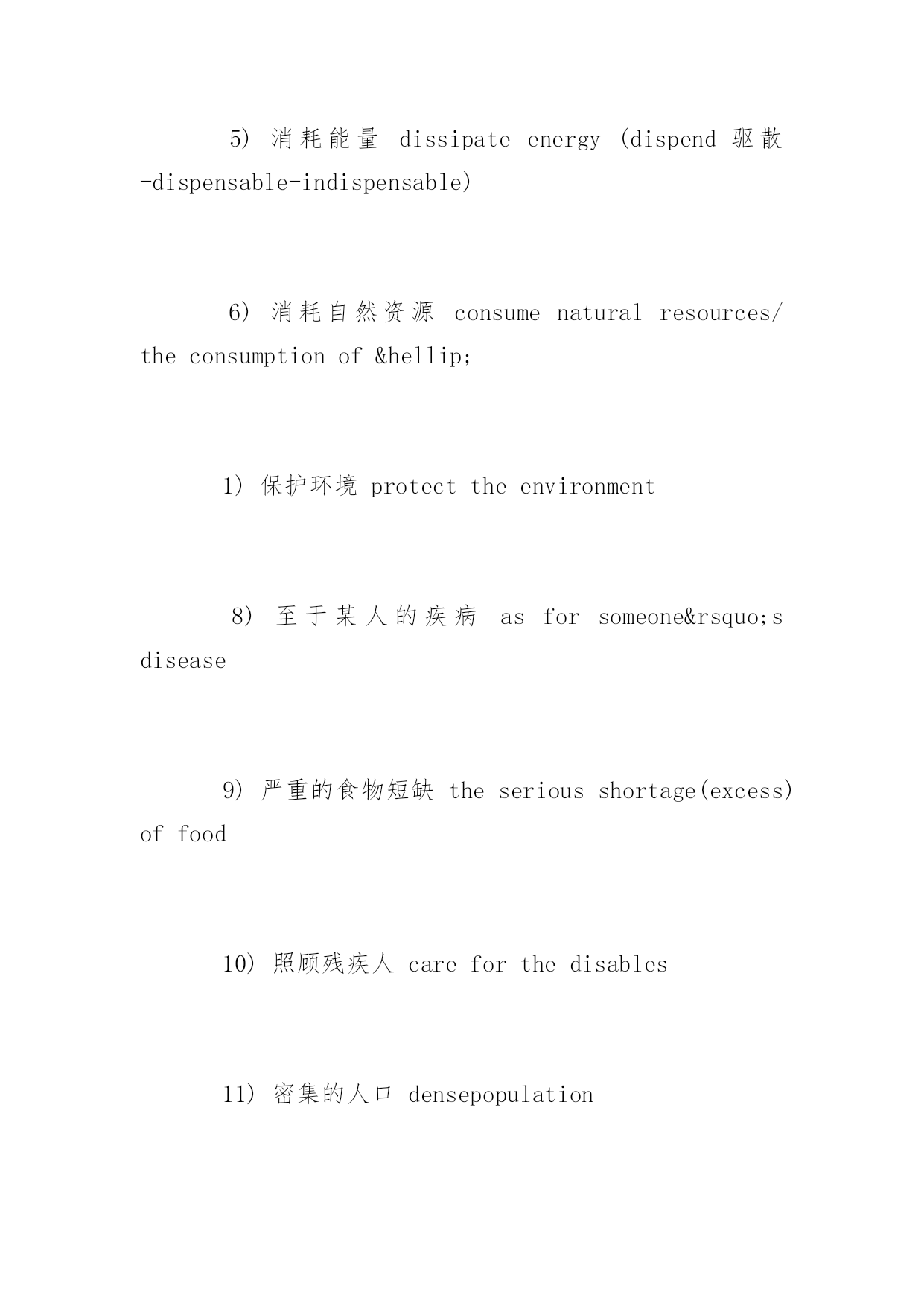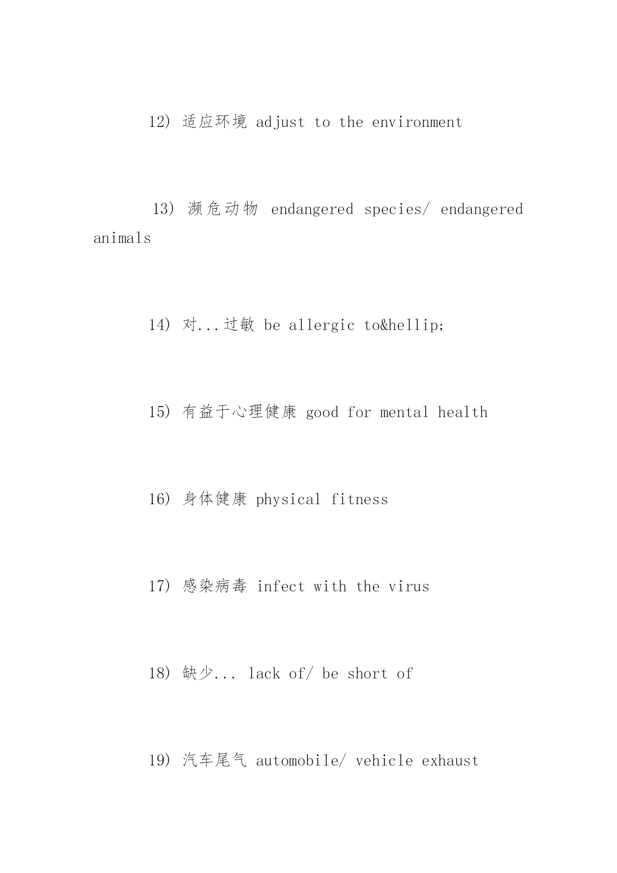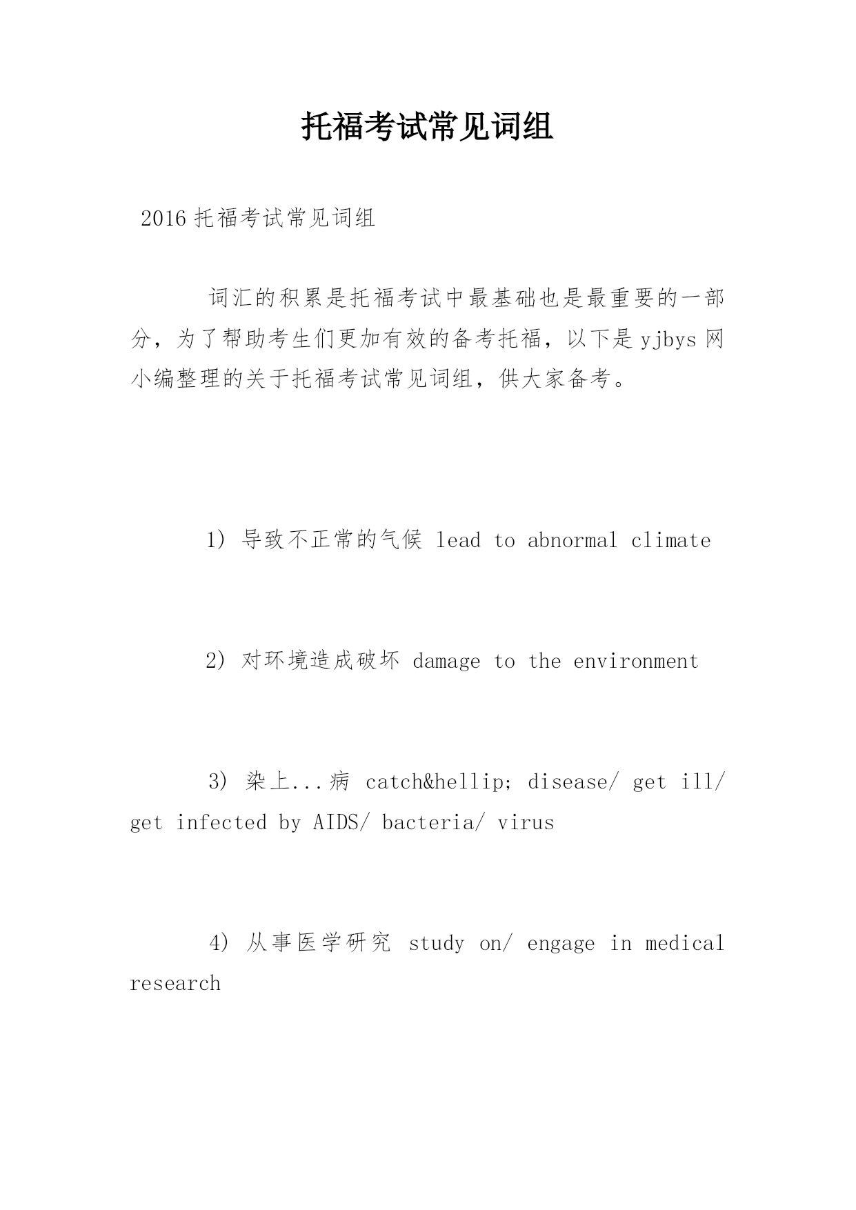托福考试常见词组 2016托福考试常见词组 词汇的积累是托福考试中最基础也是最重要的一部分,为了帮助考生们更加有效的备考托福,以下是yjbys网小编整理的关于托福考试常见词组,供大家备考。 1)导致不正常的气候leadtoabnormalclimate 2)对环境造成破坏damagetotheenvironment 3)染上...病catch…disease/getill/getinfectedbyAIDS/bacteria/virus 4)从事医学研究studyon/engageinmedicalresearch 5)消耗能量dissipateenergy(dispend驱散-dispensable-indispensable) 6)消耗自然资源consumenaturalresources/theconsumptionof… 1)保护环境protecttheenvironment 8)至于某人的疾病asforsomeone’sdisease 9)严重的食物短缺theseriousshortage(excess)offood 10)照顾残疾人careforthedisables 11)密集的人口densepopulation 12)适应环境adjusttotheenvironment 13)濒危动物endangeredspecies/endangeredanimals 14)对...过敏beallergicto… 15)有益于心理健康goodformentalhealth 16)身体健康physicalfitness 17)感染病毒infectwiththevirus 18)缺少...lackof/beshortof 19)汽车尾气automobile/vehicleexhaust 20)发展医疗技术developmedicaltechnology 21)每天做运动dosportseveryday 22)倾倒工厂废料factorywastedumping/dumpindustrialwaste 23)教育公众educatethepublic 24)环境污染environmentalpollution/contamination 25)体检physicalexamination 26)战胜疾病overcomeillness/fightillness 27)健康的饮食习惯healthyeatinghabit 28)高热量highheat/calorie 29)在危急情况下inemergent/crisissituations 30)在某人的自然状态下Insomeone'snaturalstate 31)净化污染的空气purify(pure)theairpollution 32)摄取充足的`营养absorb/takeinadequate/abundantnutrition(nutritional) 33)痊愈,恢复recover/restore 34)缓解人口过剩问题alleviatetheproblemofoverpopulation 35)用尽资源useup/runoutofresources 36)挽救热带雨林savetroopicalrainforest 37)保持身体健康keepfit/keepingoodhealth/maintainphysicalfitness 38)可持续能源sustainableenergy/lastingenergyresources. 39)吃药takemedicine/pills 40)城市扩张urban/cityexpansion;urbansprawl 41)保持均衡的饮食Maintainabalanceddiet 42)平局寿命averagelifetime 43)降低某人的血压reducesomeone’sbloodpressure 44)降低某人的压力水平reducesomeone’stresslevels 45)管理医疗机构medicalinstitutionmanagement 46)不可再生资源non-renewableresources 47)凭处方script(手记)prescription 48)保护环境protecttheenvironment 49)预防疾病preventdisease 50)禁止吸烟nosmoking/smokingprohibited