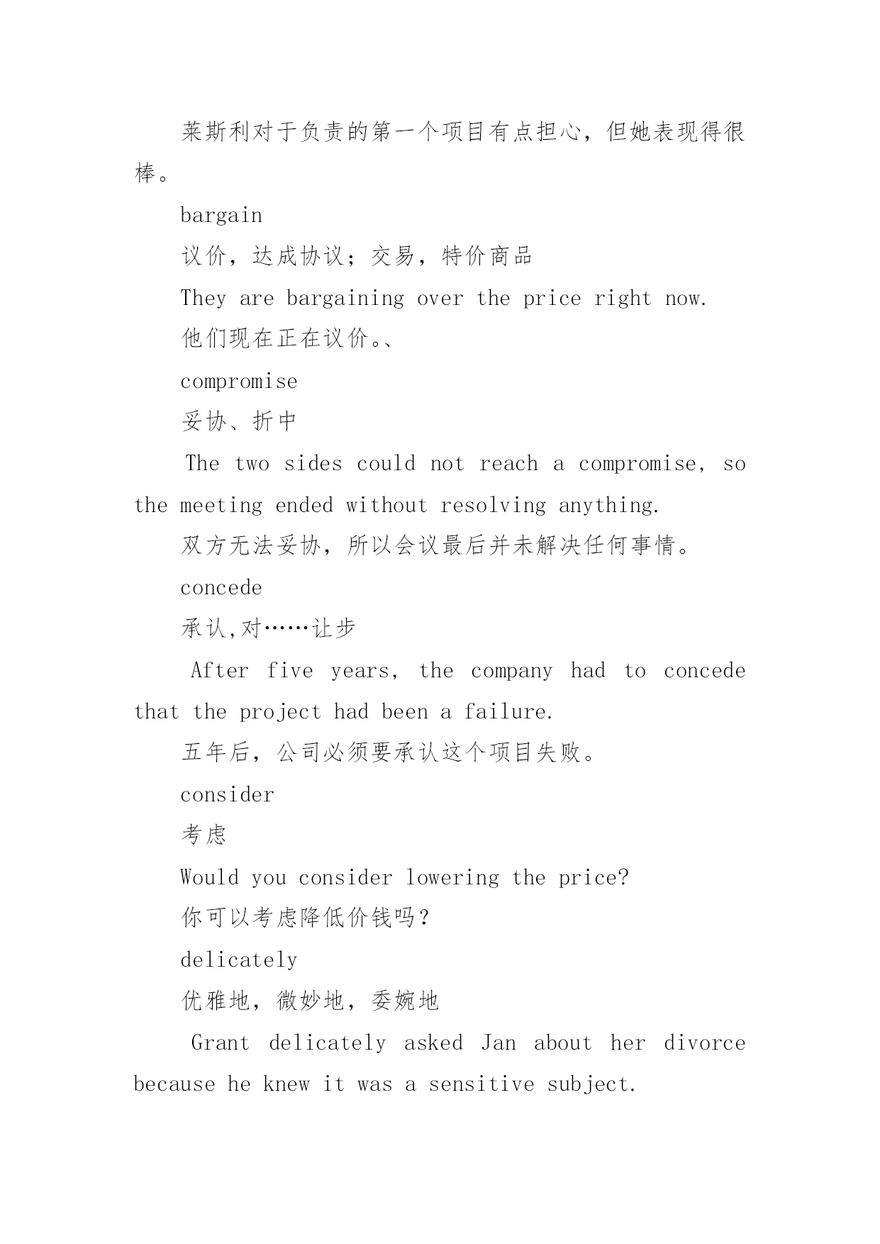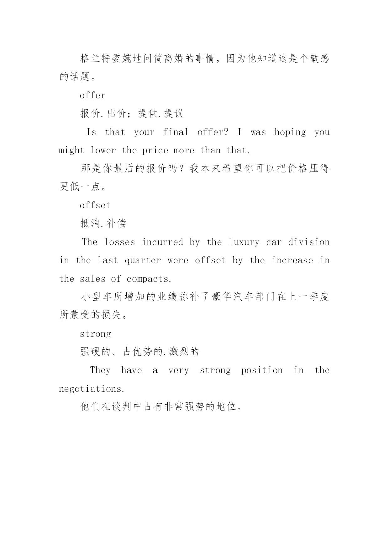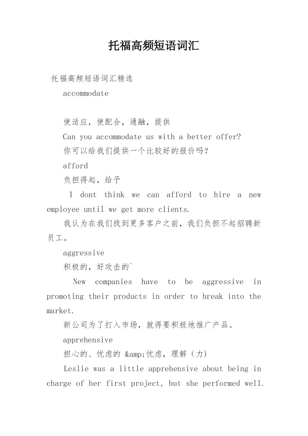 托福高频短语词汇 托福高频短语词汇精选accommodate使适应,使配合,通融,提供Canyouaccommodateuswithabetteroffer?你可以给我们提供一个比较好的报价吗?afford负担得起,给予Idontthinkwecanaffordtohireanewemployeeuntilwegetmoreclients.我认为在我们找到更多客户之前,我们负担不起招聘新员工。aggressive积极的,好攻击的`Newcompanieshavetobeaggressiveinpromotingtheirproductsinordertobreakintothemarket.新公司为了打入市场,就得要积极地推广产品。apprehensive担心的、忧虑的&忧虑,理解(力)Lesliewasalittleapprehensiveaboutbeinginchargeofherfirstproject,butsheperformedwell.莱斯利对于负责的第一个项目有点担心,但她表现得很棒。bargain议价,达成协议;交易,特价商品Theyarebargainingoverthepricerightnow.他们现在正在议价。、compromise妥协、折中Thetwosidescouldnotreachacompromise,sothemeetingendedwithoutresolvinganything.双方无法妥协,所以会议最后并未解决任何事情。concede承认,对……让步Afterfiveyears,thecompanyhadtoconcedethattheprojecthadbeenafailure.五年后,公司必须要承认这个项目失败。consider考虑Wouldyouconsiderloweringtheprice?你可以考虑降低价钱吗?delicately优雅地,微妙地,委婉地GrantdelicatelyaskedJanaboutherdivorcebecauseheknewitwasasensitivesubject.格兰特委婉地问简离婚的事情,因为他知道这是个敏感的话题。offer报价.出价;提供.提议Isthatyourfinaloffer?Iwashopingyoumightlowerthepricemorethanthat.那是你最后的报价吗?我本来希望你可以把价格压得更低一点。offset抵消.补偿Thelossesincurredbytheluxurycardivisioninthelastquarterwereoffsetbytheincreaseinthesalesofcompacts.小型车所增加的业绩弥补了豪华汽车部门在上一季度所蒙受的损失。strong强硬的、占优势的.激烈的Theyhaveaverystrongpositioninthenegotiations.他们在谈判中占有非常强势的地位。