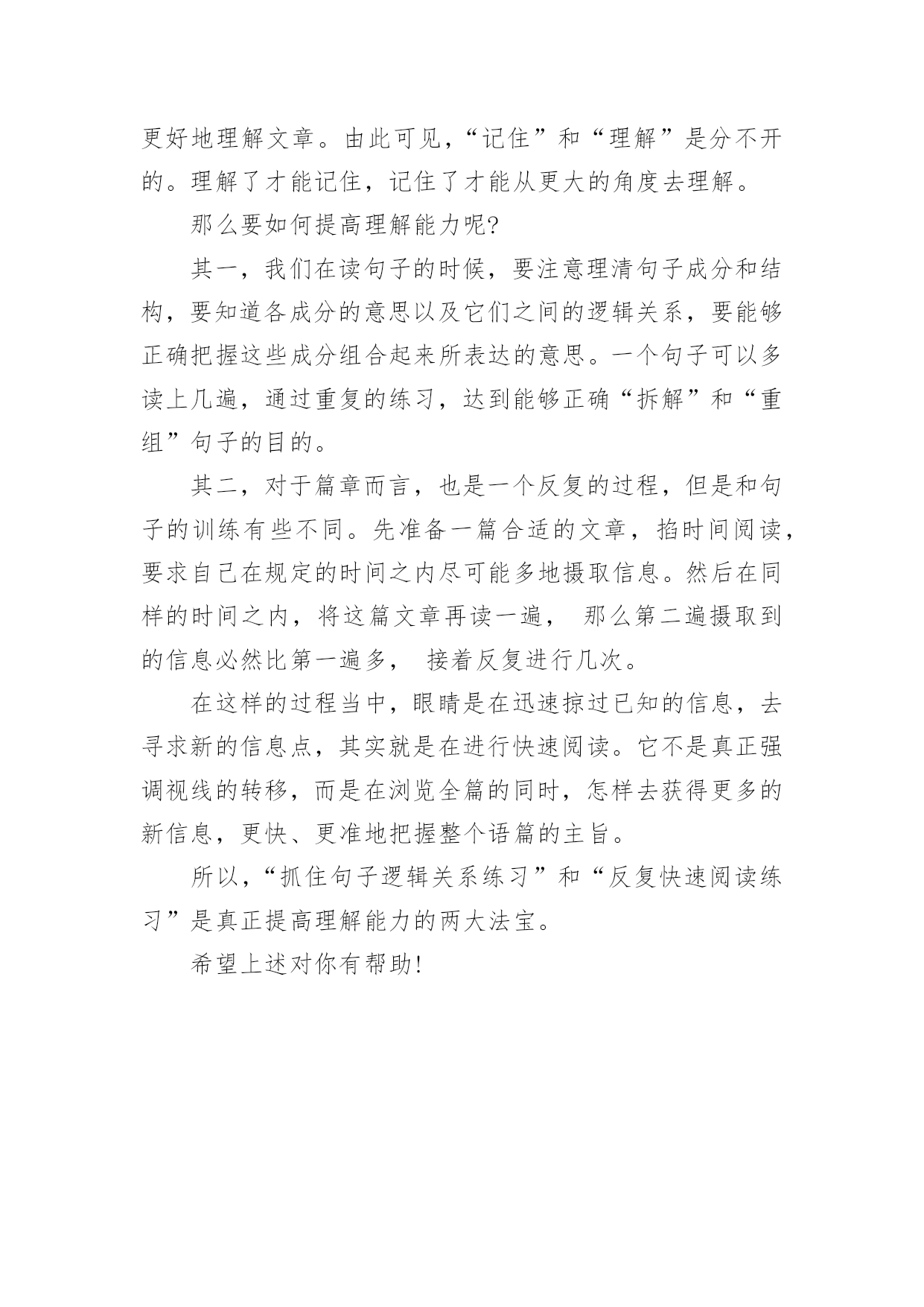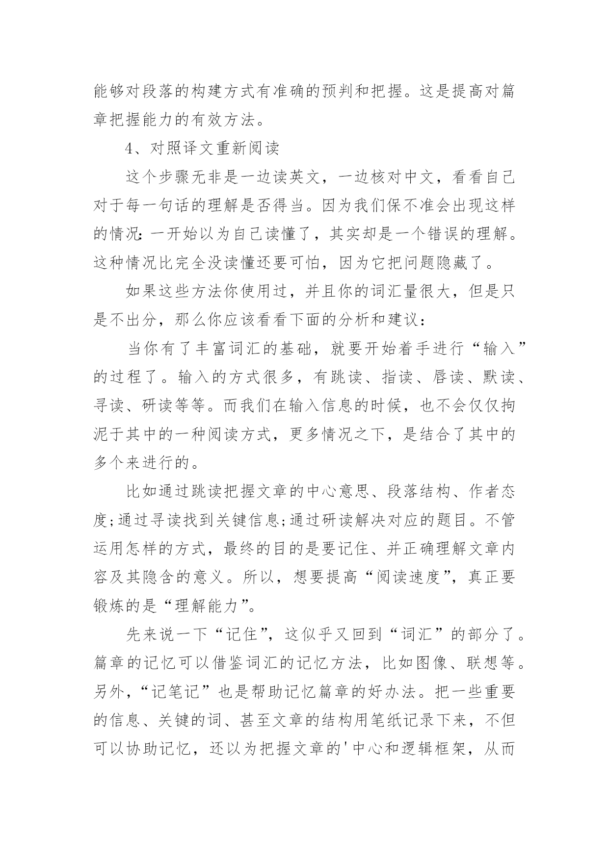 托福阅读词汇 托福阅读词汇1、通过模拟测试训练要求自己在20分钟之内完成一篇文章。期间排除环境干扰,一切都模拟真实考试环境,目的是为了在考试前对真实考试的压力和精力需求有直接的体验。2、错题总结回顾做完题之后还要对题目进行剖析,错误选项为什么错,正确选项为什么对。在这个环节要注意分析自己喜欢错哪个类型的题目,并进行总结。同时,把错题和错题所对应的段落复制到错题文档中。3、深度分析文章这是真正能够提高阅读能力的环节。回到原文之中,逐句逐词读文章,遇到每一个自己不认识的单词都查一下,并且结合文章内容,把它背诵下来。每个意思不确定的词组,也要通过一切手段搞懂。在单词和词组的基础之上,搞懂文章每一句话的意思、每个段落的内部逻辑、段落之间的关系和文章的构成。托福作为一个标准化的考试,它的考点以及文章构造的方式总是固定的。而逻辑的展开方式,无非也就是因果、并列、递进、转折、让步那么几种。我们需要做的无非是多遍熟悉文章的写作和构建方式,之后在考试中,看到一个段落能够对段落的构建方式有准确的预判和把握。这是提高对篇章把握能力的有效方法。4、对照译文重新阅读这个步骤无非是一边读英文,一边核对中文,看看自己对于每一句话的理解是否得当。因为我们保不准会出现这样的情况:一开始以为自己读懂了,其实却是一个错误的理解。这种情况比完全没读懂还要可怕,因为它把问题隐藏了。如果这些方法你使用过,并且你的词汇量很大,但是只是不出分,那么你应该看看下面的分析和建议:当你有了丰富词汇的基础,就要开始着手进行“输入”的过程了。输入的方式很多,有跳读、指读、唇读、默读、寻读、研读等等。而我们在输入信息的时候,也不会仅仅拘泥于其中的一种阅读方式,更多情况之下,是结合了其中的多个来进行的。比如通过跳读把握文章的中心意思、段落结构、作者态度;通过寻读找到关键信息;通过研读解决对应的题目。不管运用怎样的方式,最终的目的是要记住、并正确理解文章内容及其隐含的意义。所以,想要提高“阅读速度”,真正要锻炼的是“理解能力”。先来说一下“记住”,这似乎又回到“词汇”的部分了。篇章的记忆可以借鉴词汇的记忆方法,比如图像、联想等。另外,“记笔记”也是帮助记忆篇章的好办法。把一些重要的信息、关键的词、甚至文章的结构用笔纸记录下来,不但可以协助记忆,还以为把握文章的'中心和逻辑框架,从而更好地理解文章。由此可见,“记住”和“理解”是分不开的。理解了才能记住,记住了才能从更大的角度去理解。那么要如何提高理解能力呢?其一,我们在读句子的时候,要注意理清句子成分和结构,要知道各成分的意思以及它们之间的逻辑关系,要能够正确把握这些成分组合起来所表达的意思。一个句子可以多读上几遍,通过重复的练习,达到能够正确“拆解”和“重组”句子的目的。其二,对于篇章而言,也是一个反复的过程,但是和句子的训练有些不同。先准备一篇合适的文章,掐时间阅读,要求自己在规定的时间之内尽可能多地摄取信息。然后在同样的时间之内,将这篇文章再读一遍,那么第二遍摄取到的信息必然比第一遍多,接着反复进行几次。在这样的过程当中,眼睛是在迅速掠过已知的信息,去寻求新的信息点,其实就是在进行快速阅读。它不是真正强调视线的转移,而是在浏览全篇的同时,怎样去获得更多的新信息,更快、更准地把握整个语篇的主旨。所以,“抓住句子逻辑关系练习”和“反复快速阅读练习”是真正提高理解能力的两大法宝。希望上述对你有帮助!