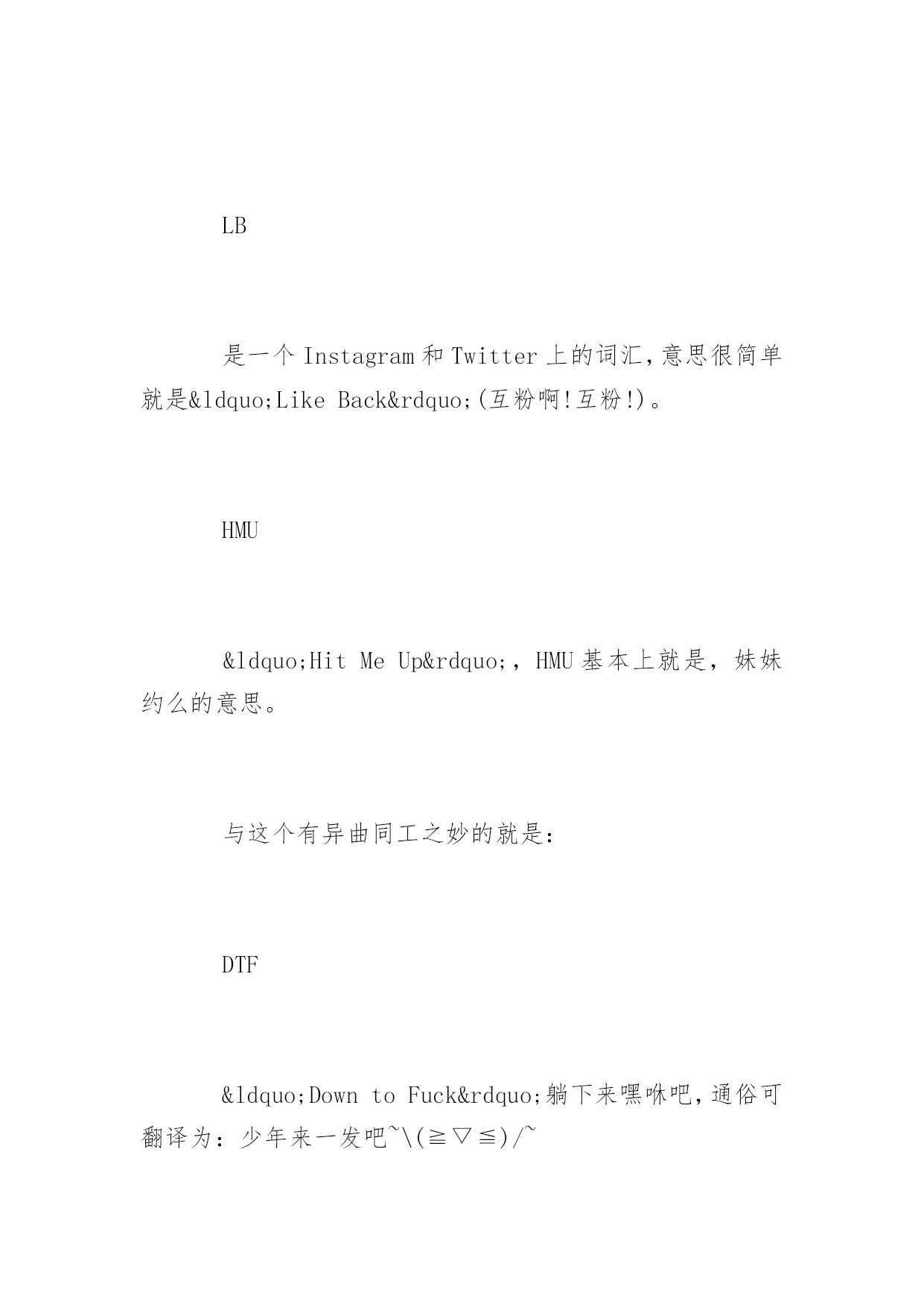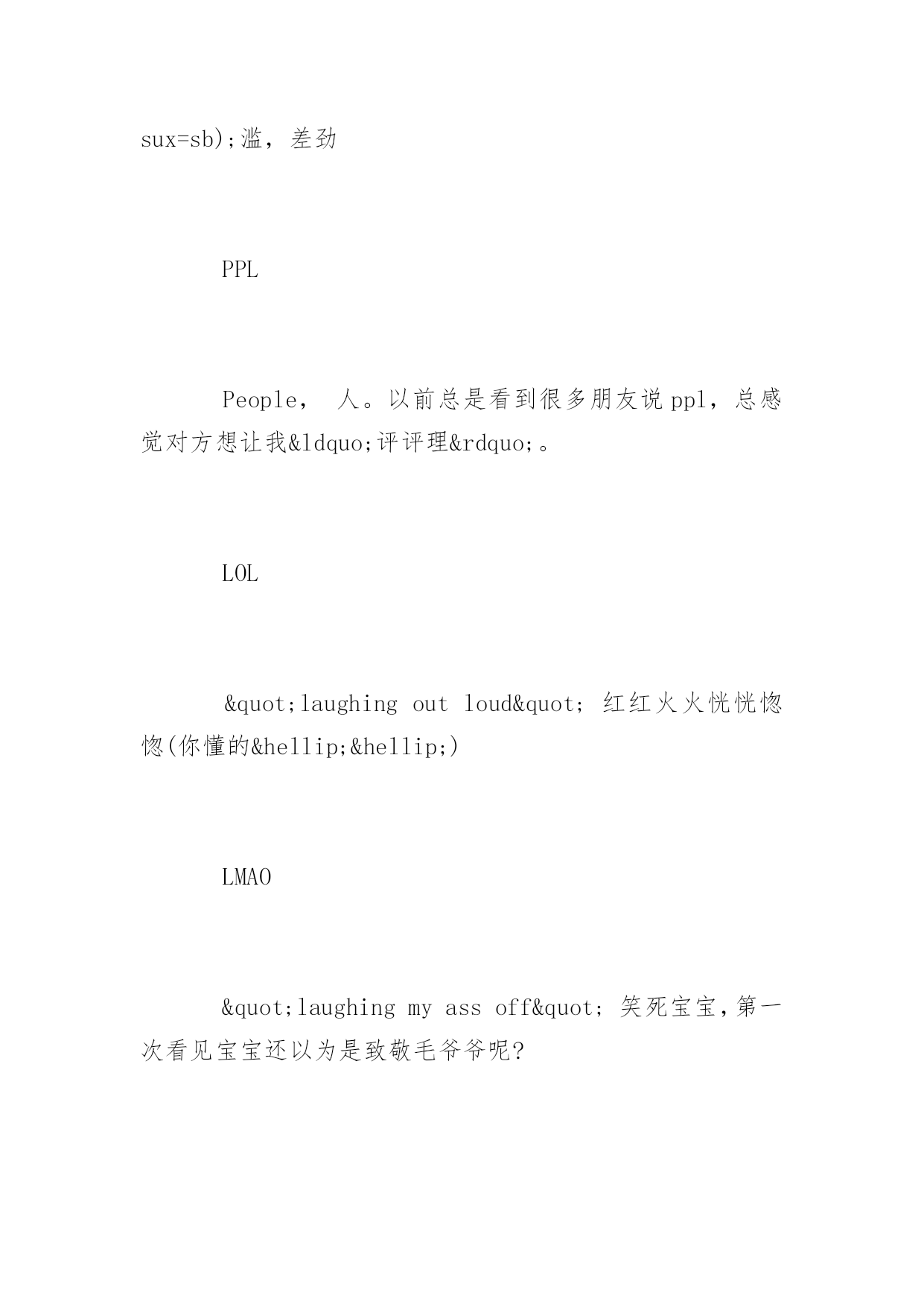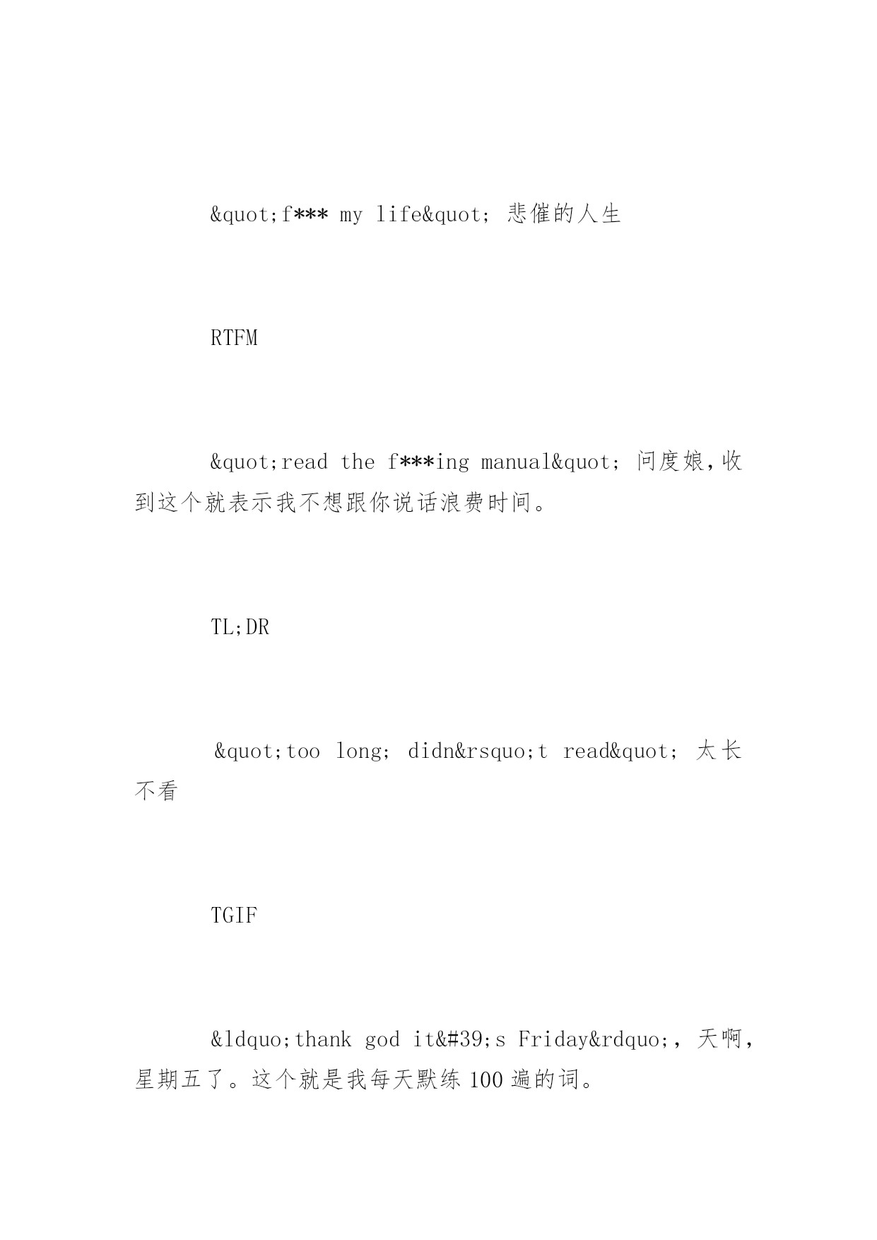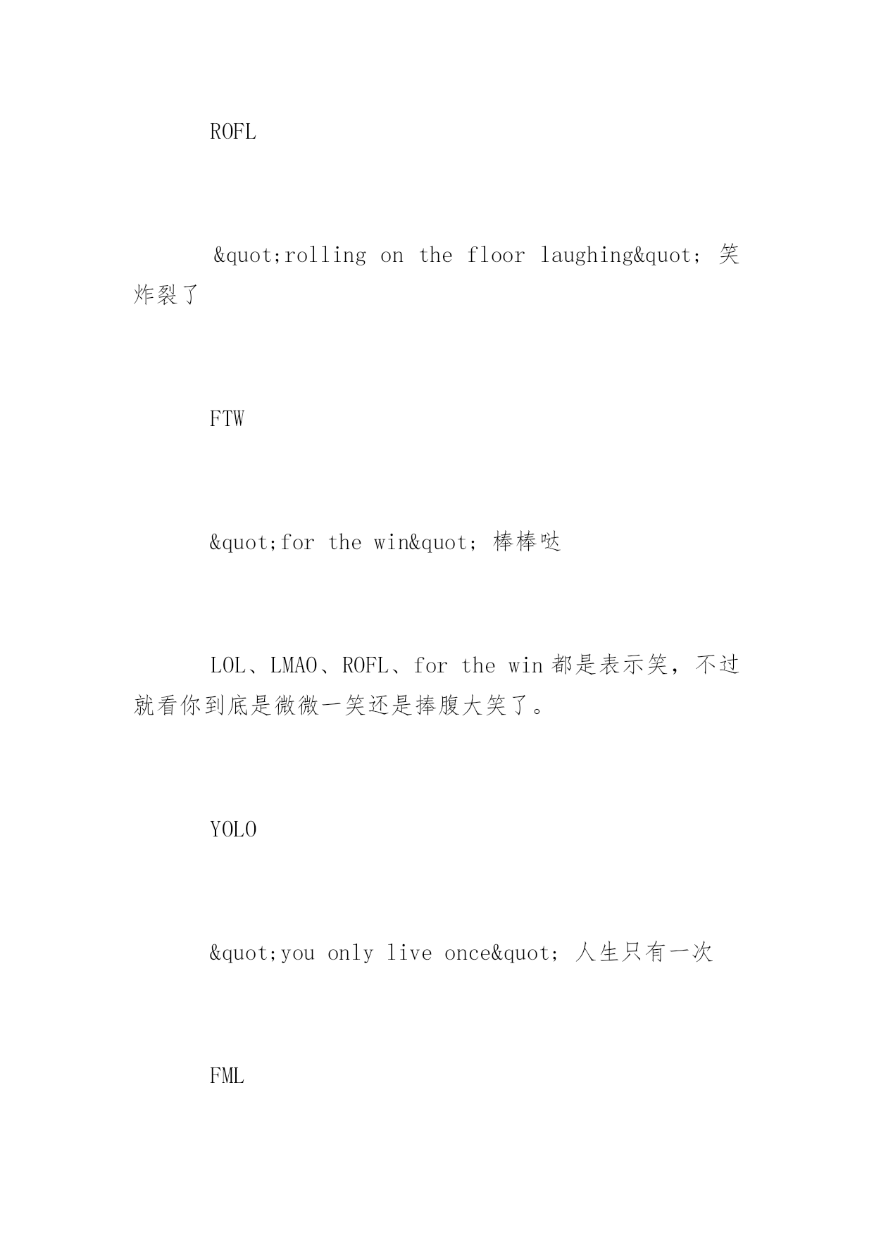 托福词汇专项练习 2017年托福词汇专项练习 像LMAO,YOLO,WTF,LOL之类的,这就是老外常用的字母表情,和我们说然并卵、蓝瘦香菇、厉害了我的哥一样,歪果仁也有一套自己的网络语言缩写系统。以下是小编为大家搜索整理的2017年托福词汇专项练习,希望能给大家带来帮助!更多精彩内容请及时关注我们应届毕业生考试网! ASL Age、Sex、Location.相亲网站的常见对话,你懂的 SUX sux=suck的第3人称单数形势(例句:thatsux=sb);滥,差劲 PPL People,人。以前总是看到很多朋友说ppl,总感觉对方想让我“评评理”。 LOL "laughingoutloud"红红火火恍恍惚惚(你懂的……) LMAO "laughingmyassoff"笑死宝宝,第一次看见宝宝还以为是致敬毛爷爷呢? ROFL "rollingonthefloorlaughing"笑炸裂了 FTW "forthewin"棒棒哒 LOL、LMAO、ROFL、forthewin都是表示笑,不过就看你到底是微微一笑还是捧腹大笑了。 YOLO "youonlyliveonce"人生只有一次 FML "f***mylife"悲催的人生 RTFM "readthef***ingmanual"问度娘,收到这个就表示我不想跟你说话浪费时间。 TL;DR "toolong;didn’tread"太长不看 TGIF “thankgodit'sFriday”,天啊,星期五了。这个就是我每天默练100遍的词。 LB 是一个Instagram和Twitter上的词汇,意思很简单就是“LikeBack”(互粉啊!互粉!)。 HMU “HitMeUp”,HMU基本上就是,妹妹约么的意思。 与这个有异曲同工之妙的就是: DTF “DowntoFuck”躺下来嘿咻吧,通俗可翻译为:少年来一发吧~\(≧▽≦)/~ BRB “Berightback”,就是那个灰太狼的口头禅“我一定会回来的。” 这些也是这个意思:BBL=Bebacklater;BFN=byebyefornow FMAS “Fuckmyass”这个不是叫你真去...是输了比如比赛或者认输后打脸的抱怨。 ffs=forfucksake(这特么的.),意思也差不多。 Meme 不是我们国内说的表情包,而是是“以图片为载体的“梗”。 比如:Philosoraptor(哲思龙) Philosoraptor是由Philosopher(哲学家)和velociraptor(迅猛龙)两个单词合成而来的,Meme的图片就是一只迅猛龙托着下巴作思考状。人们常用这个Meme提出一些有思想性的疑问,当然绝大部分还是一些逗比的问题。