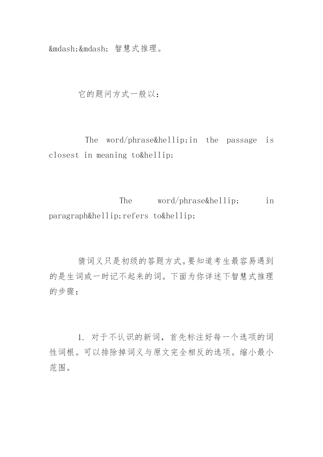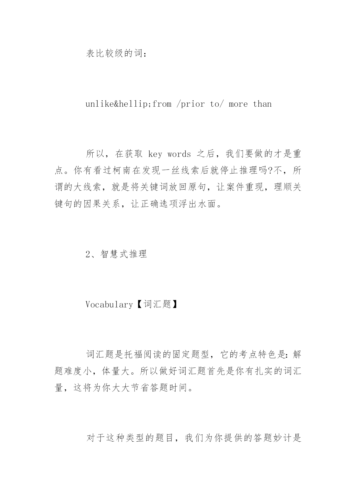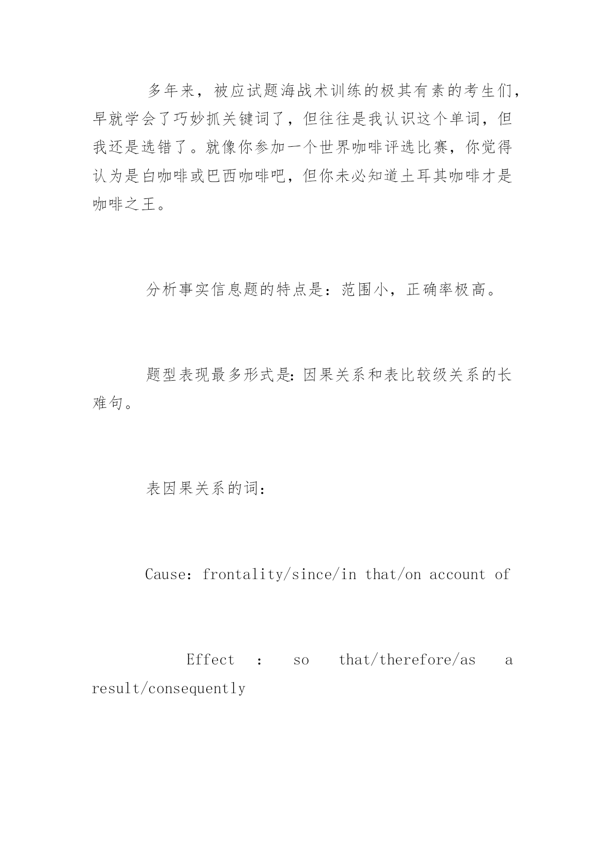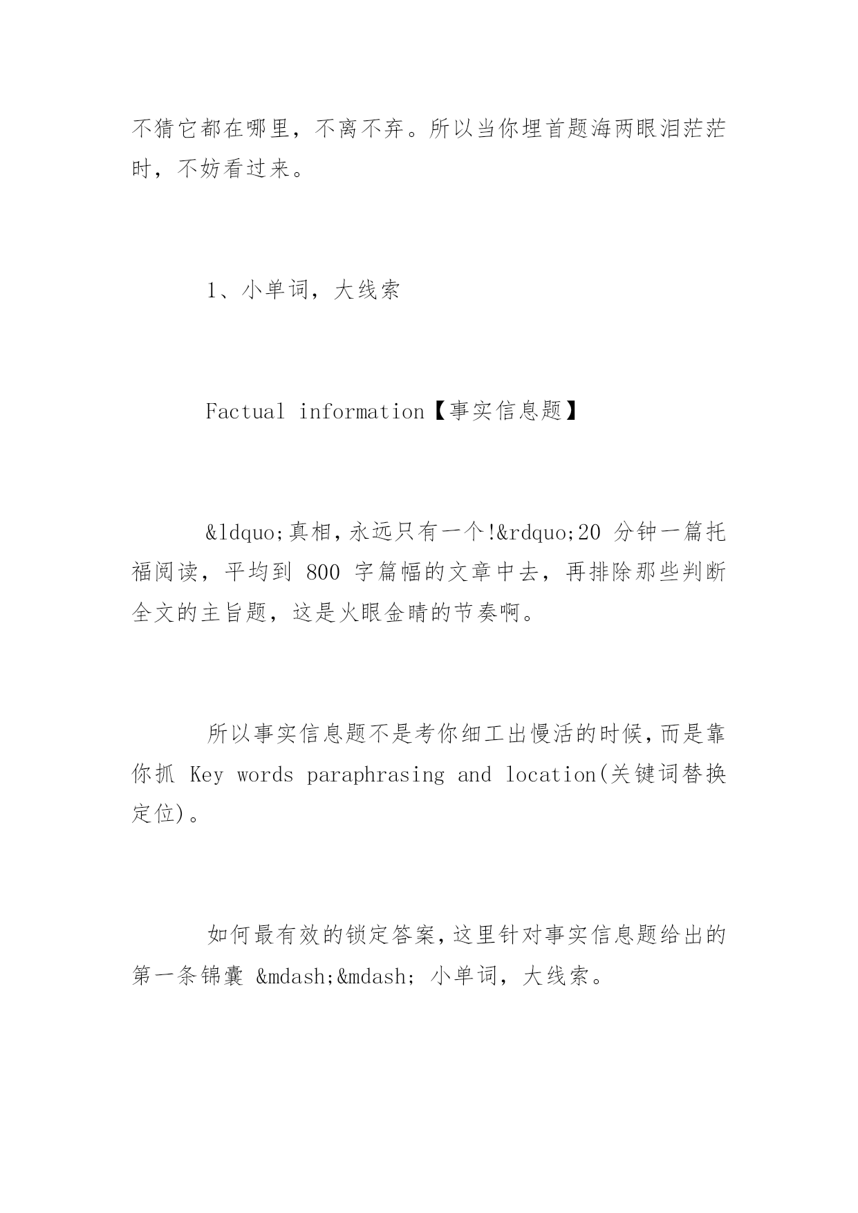 托福阅读答题十大技巧 托福阅读答题十大技巧 “得阅读者,得天下。”托福阅读向来是考生提分必争之地,也是中国考生的传统强项。为了帮助大家高效备考托福阅读,以下是yjbys网小编整理的关于托福阅读答题十大技巧,供大家备考。 基本考生考前会采取题海战术,将自己武装成十万个我都知道。于是,你背完了英文化学周期表;你了解了九大行星排列;你知道了最前沿的科技发展和美国经济新政;你是颗移动的thebigbang云硬盘。你只祈祷考前记住所有的这些信息量,考后再统统delete。 如果考到一个你事先复习过的知识点,你欣喜若狂。如果考到一个你似曾相识却扫视而过,你追悔莫及。如果考到一个全新的知识点,恭喜你,你顿时挂机。 事实上,托福阅读的单词量是浩瀚星尘,无论你猜或不猜它都在哪里,不离不弃。所以当你埋首题海两眼泪茫茫时,不妨看过来。 1、小单词,大线索 Factualinformation【事实信息题】 “真相,永远只有一个!”20分钟一篇托福阅读,平均到800字篇幅的文章中去,再排除那些判断全文的主旨题,这是火眼金睛的节奏啊。 所以事实信息题不是考你细工出慢活的时候,而是靠你抓Keywordsparaphrasingandlocation(关键词替换定位)。 如何最有效的锁定答案,这里针对事实信息题给出的第一条锦囊——小单词,大线索。 多年来,被应试题海战术训练的极其有素的考生们,早就学会了巧妙抓关键词了,但往往是我认识这个单词,但我还是选错了。就像你参加一个世界咖啡评选比赛,你觉得认为是白咖啡或巴西咖啡吧,但你未必知道土耳其咖啡才是咖啡之王。 分析事实信息题的特点是:范围小,正确率极高。 题型表现最多形式是:因果关系和表比较级关系的长难句。 表因果关系的词: Cause:frontality/since/inthat/onaccountof Effect:sothat/therefore/asaresult/consequently 表比较级的词: unlike…from/priorto/morethan 所以,在获取keywords之后,我们要做的才是重点。你有看过柯南在发现一丝线索后就停止推理吗?不,所谓的大线索,就是将关键词放回原句,让案件重现,理顺关键句的因果关系,让正确选项浮出水面。 2、智慧式推理 Vocabulary【词汇题】 词汇题是托福阅读的固定题型,它的考点特色是:解题难度小,体量大。所以做好词汇题首先是你有扎实的词汇量,这将为你大大节省答题时间。 对于这种类型的题目,我们为你提供的答题妙计是——智慧式推理。 它的题问方式一般以: Theword/phrase…inthepassageisclosestinmeaningto… Theword/phrase…inparagraph…refersto… 猜词义只是初级的答题方式。要知道考生最容易遇到的是生词或一时记不起来的词。下面为你详述下智慧式推理的步骤: 1.对于不认识的新词,首先标注好每一个选项的词性词根。可以排除掉词义与原文完全相反的选项。缩小最小范围。 这里需要考生平常多积累prefix和suffix的构词法,小站强烈推荐考生看构词法,因为学习前后缀的构词法,可以瞬间加大你的单词储备量。 2.剩下的选项词义接近,是很容易混淆失分点。一定要吃透关键词的上下文语境,要知道在特定语境时,单词的意思也会有微妙差别。通常意思完全一样或者含绝对肯定的词,往往不是正确选项。比如:undoubtedly/unquestionably/unanticipated 3.最后,需要考生利用常识知识去推理大致意思,锁定正确答案。 遇到词汇题Don'tpanic,标识好每一个单词的词性,然后根据词义放回原文,判断最适合原意的单词。学会一种有效的答题技巧,将助你事半功倍。 3、锁定故意相反信息 Negativefactualinfo【否定事实信息题】 否定事实信息题,顾名思义就是排除题。四个选项中让你排除表述错误、原文中没有描述或与原文描述相矛盾的内容,排除掉的选项即为正确选项。 所以此类题型的锦囊妙计就是——锁定故意相反信息 首先,我们来看一下此类出题常见形式: Accordingtothepassage,allofthefollowingstatementsaretrueEXCEPT… WhichofthefollowingisNOTmentionedas…? WhichofthefollowingaboutXisNOTtrue? 通常,一篇文章中可能