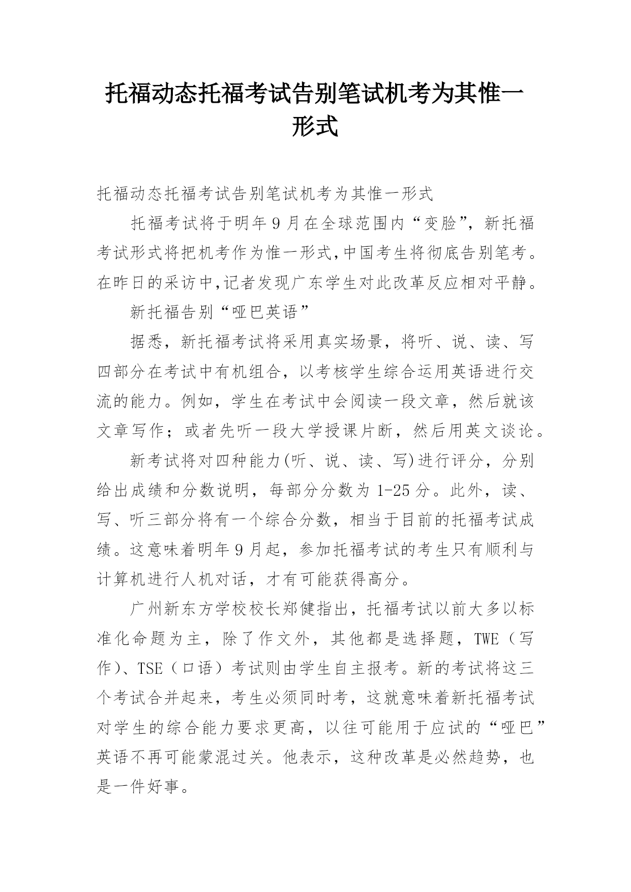托福动态托福考试告别笔试机考为其惟一形式 托福动态托福考试告别笔试机考为其惟一形式托福考试将于明年9月在全球范围内“变脸”,新托福考试形式将把机考作为惟一形式,中国考生将彻底告别笔考。在昨日的采访中,记者发现广东学生对此改革反应相对平静。新托福告别“哑巴英语”据悉,新托福考试将采用真实场景,将听、说、读、写四部分在考试中有机组合,以考核学生综合运用英语进行交流的能力。例如,学生在考试中会阅读一段文章,然后就该文章写作;或者先听一段大学授课片断,然后用英文谈论。新考试将对四种能力(听、说、读、写)进行评分,分别给出成绩和分数说明,每部分分数为1-25分。此外,读、写、听三部分将有一个综合分数,相当于目前的托福考试成绩。这意味着明年9月起,参加托福考试的考生只有顺利与计算机进行人机对话,才有可能获得高分。广州新东方学校校长郑健指出,托福考试以前大多以标准化命题为主,除了作文外,其他都是选择题,TWE(写作)、TSE(口语)考试则由学生自主报考。新的考试将这三个考试合并起来,考生必须同时考,这就意味着新托福考试对学生的综合能力要求更高,以往可能用于应试的“哑巴”英语不再可能蒙混过关。他表示,这种改革是必然趋势,也是一件好事。记者了解到,广东省考生对托福改革大多持平静态度。正在准备明年上半年托福考试的华工大三学生李小建的看法代表了多数学生的心态:“明年托福的改革对考生的影响不大,希望去北美留学的学生大多还是选择托福考试。”他表示:新的托福不会给能力高的考生提高通过的门槛,但是将会给喜欢钻空子的考生带来难题,一时间不容易找到漏洞。