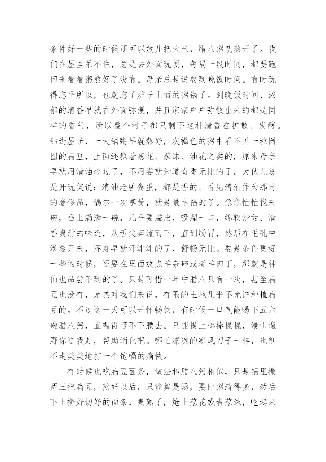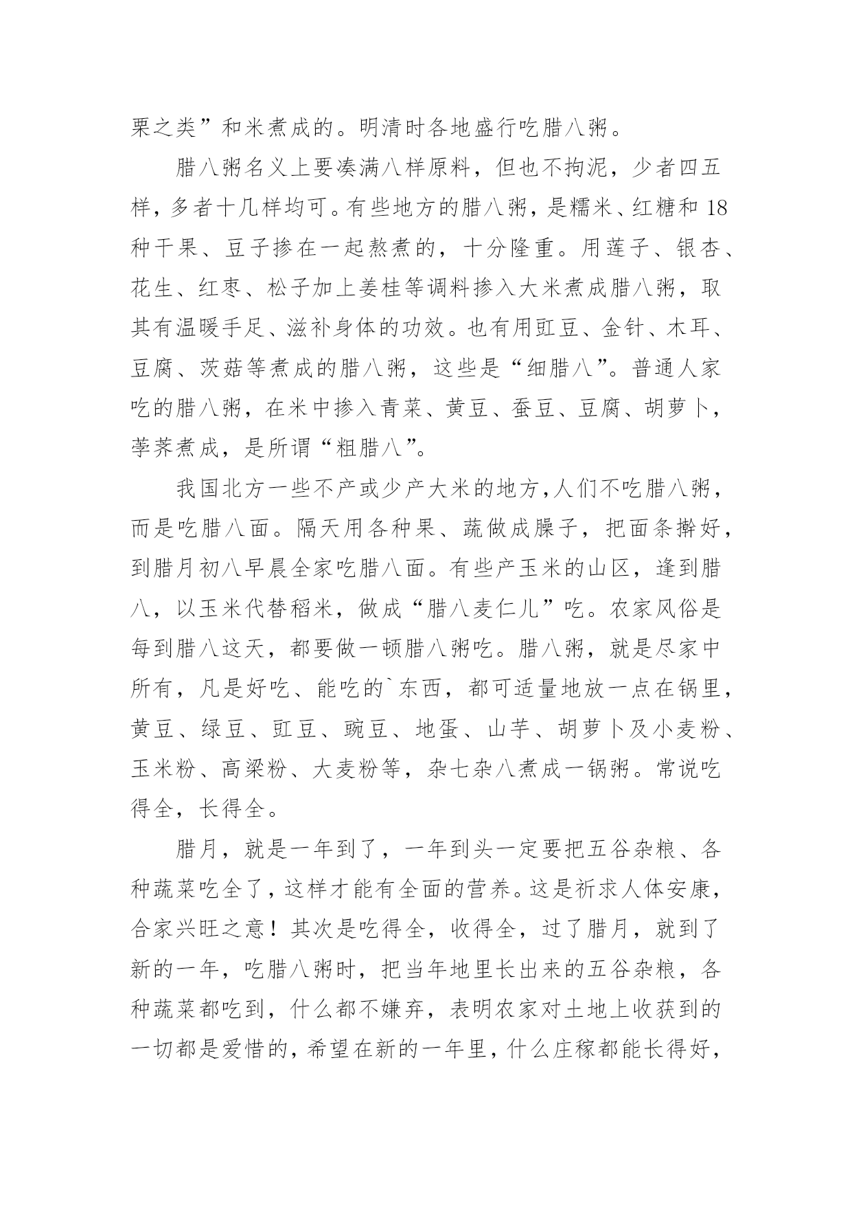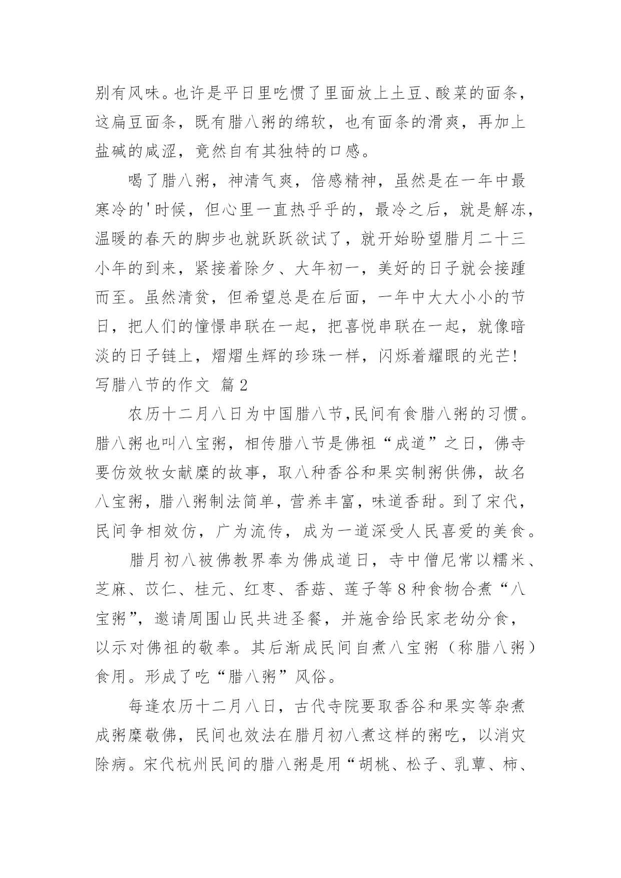 写腊八节的作文 关于写腊八节的作文合集7篇在平时的学习、工作或生活中,大家对作文都再熟悉不过了吧,借助作文人们可以反映客观事物、表达思想感情、传递知识信息。你写作文时总是无从下笔?以下是小编为大家收集的写腊八节的作文7篇,希望对大家有所帮助。写腊八节的作文篇1过冬至,冻鼻子;过腊八,冻下巴。腊八的到来,意味着一年中最冷时刻的来临,但也意味着新年的脚步越来越近,所以,我们还是在凛冽的寒风中,欢喜雀跃,掰着指头数着,离过年再有几天。腊八也是和农业之类的祭祀有关的节日,也意味着辞旧迎新之际的交替,所以,它虽然不是春节一样的大节,我们记忆中也没有什么祭祀的仪式,但这一天还是留在人们的记忆中,谁都会早早就操心腊八的到来,并且以传统的方式庆祝腊八节的。最有名的就是要喝“腊八粥”了,这在前几天就要做好准备的,只是到了腊八这天,煮粥喝,以不同于以往的简单方式完成节日的纪念。早在几天前,母亲就取几碗扁豆,用簸箕颠簸,把草末、灰土、沙子之类的杂物拣干净了,泡在清水中。要是自己家里没有扁豆,就要拿麦子、豌豆之类的到别人家换不然,腊八粥的主要原料就缺了。到了腊八这天,吃过午饭,大冬天一般没有活干,一家人围在热屋子里,锅里倒进水、扁豆,适量撒点盐和食用碱,条件好一些的时候还可以放几把大米,腊八粥就熬开了。我们在屋里呆不住,总是去外面玩耍,每隔一段时间,都要跑回来看看粥熬好了没有。母亲总是说要到晚饭时间。有时玩得忘乎所以,也就忘了炉子上面的粥锅了。到晚饭时间,浓郁的清香早就在外面弥漫,并且家家户户弥散出来的都是同样的香气,所以整个村子都只剩下这种清香在扩散、发酵。钻进屋子,一大锅粥早就熬好,灰褐色的粥中看不见一粒囫囵的扁豆,上面还飘着葱花、葱沫、油花之类的,原来母亲早就用清油炝过了,不用尝就知道奇香无比的了。大伙儿总是开玩笑说:清油炝驴粪蛋,都是香的。看见清油作为那时的奢侈品,偶尔一次享受,就是最幸福的了。急急忙忙找来碗,舀上满满一碗,几乎要溢出,吸溜一口,绵软沙甜、清香爽滑的味道,从舌尖奔流而下,直到肠胃,然后在毛孔中渗透开来,浑身早就汗津津的了,舒畅无比。要是条件更好一些的时候,还要在里面放点羊杂碎或者羊肉丁,那就是神仙也品尝不到的了。只是可惜一年中腊八只有一次,甚至扁豆也没有,尤其对我们来说,有限的土地几乎不允许种植扁豆的。不过这一天可以开怀畅饮,有时候一口气能喝下五六碗腊八粥,直喝得弯不下腰去。只能提上棒棒棍棍,漫山遍野你追我赶,帮助消化吧。哪怕凛冽的寒风刀子一样,也削不走美美地打一个饱嗝的痛快。有时候也吃扁豆面条,做法和腊八粥相似,只是锅里撒两三把扁豆,熬好以后,只能算是汤,要比粥清得多,然后下上擀好切好的面条,煮熟了,炝上葱花或者葱沫,吃起来别有风味。也许是平日里吃惯了里面放上土豆、酸菜的面条,这扁豆面条,既有腊八粥的绵软,也有面条的滑爽,再加上盐碱的咸涩,竟然自有其独特的口感。喝了腊八粥,神清气爽,倍感精神,虽然是在一年中最寒冷的'时候,但心里一直热乎乎的,最冷之后,就是解冻,温暖的春天的脚步也就跃跃欲试了,就开始盼望腊月二十三小年的到来,紧接着除夕、大年初一,美好的日子就会接踵而至。虽然清贫,但希望总是在后面,一年中大大小小的节日,把人们的憧憬串联在一起,把喜悦串联在一起,就像暗淡的日子链上,熠熠生辉的珍珠一样,闪烁着耀眼的光芒!写腊八节的作文篇2农历十二月八日为中国腊八节,民间有食腊八粥的习惯。腊八粥也叫八宝粥,相传腊八节是佛祖“成道”之日,佛寺要仿效牧女献糜的故事,取八种香谷和果实制粥供佛,故名八宝粥,腊八粥制法简单,营养丰富,味道香甜。到了宋代,民间争相效仿,广为流传,成为一道深受人民喜爱的美食。腊月初八被佛教界奉为佛成道日,寺中僧尼常以糯米、芝麻、苡仁、桂元、红枣、香菇、莲子等8种食物合煮“八宝粥”,邀请周围山民共进圣餐,并施舍给民家老幼分食,以示对佛祖的敬奉。其后渐成民间自煮八宝粥(称腊八粥)食用。形成了吃“腊八粥”风俗。每逢农历十二月八日,古代寺院要取香谷和果实等杂煮成粥糜敬佛,民间也效法在腊月初八煮这样的粥吃,以消灾除病。宋代杭州民间的腊八粥是用“胡桃、松子、乳蕈、柿、栗之类”和米煮成的。明清时各地盛行吃腊八粥。腊八粥名义上要凑满八样原料,但也不拘泥,少者四五样,多者十几样均可。有些地方的腊八粥,是糯米、红糖和18种干果、豆子掺在一起熬煮的,十分隆重。用莲子、银杏、花生、红枣、松子加上姜桂等调料掺入大米煮成腊八粥,取其有温暖手足、滋补身体的功效。也有用豇豆、金针、木耳、豆腐、茨菇等煮成的腊八粥,这些是“细腊八”。普通人家吃的腊八粥,在米中掺入青菜、黄豆、蚕豆、豆腐、胡萝卜,荸荠煮成,是所谓“粗腊八”。我国北方一些不产或少产大米的地方,人们不吃腊八粥,而是吃腊八面。隔天用各种果、蔬做成臊子,把面条擀好,到腊月初八早晨全家吃腊