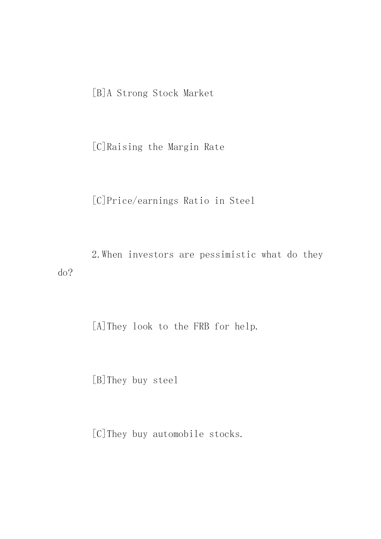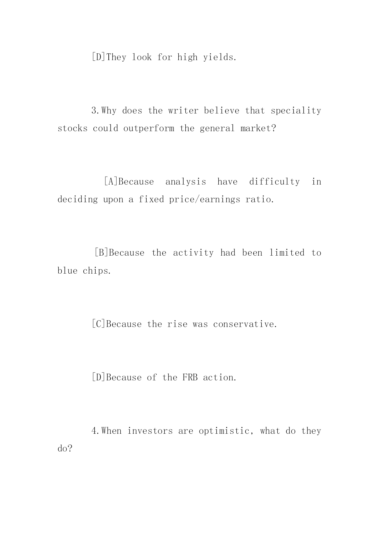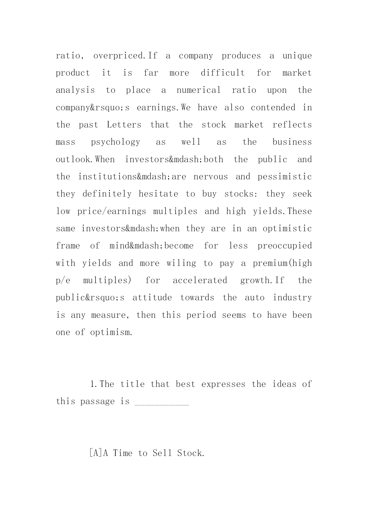 专八英语阅读理解训练题及答案 2018年专八英语阅读理解训练题及答案 一分耕耘,一分收获;要收获的好,必须耕耘的好。以下是小编为大家搜索整理的2018年专八英语阅读理解训练题及答案,希望对正在关注的您有所帮助!更多精彩内容请及时关注我们应届毕业生考试网! Theincreaseinthemarginratefrom50%to70%wasnotanattempttostemanyrampantspeculationonthepartofthepublic—actuallythemarketseemedtechnicallyquitestrong,withpublicparticipationessentiallydignified—butratheranattemptbytheFederalReserveBoardtopreservethesoundunderpinningsthatexistedinthemarket.Naturally,suchamovehadamomentarilychillingeffectuponpricesbutiftheFRBhadbeenpreoccupiedwithunduespeculation,theincreasemighthavebeentothe80%oreven90%level.Suchanincreasesinthemarginrateisaconfirmationofastrongstockmarketandsince19…,suchincreaseshaveresultedininterimmarkethighsovertwelvemonthslater.Obviously,therecouldbenoguaranteethatthiswouldonceagainbethecase,butifhistoryisanyguideline—andifbusinessandcorporateearningsweretocontinueonthesamecourse—continuedoptimismovertheoutlookforthestockmarketwouldseemmoreprudentthanpessimism. Themarginincreaseunderscoredthegoodrisethatstockshadenjoyedforthepreviousyear—andthefactthata50%ratewasmaintainedaslongasitwaspointedupthefactthattherisewasmainlyconservativeinthatitwasconcentratedinthebluechipsforthemostpart.InpastInvestmentLetterswehavevoicedthethoughtthatspecialitystockscouldoutperformthegeneralmarketfromthispoint.Wecontinuetobelievethatthiscouldbethecase.Forexample,steelstockstendtosellatcertainfixedprice/earningsratios.Belowacertainratiotheyareconsideredgoodvalue—aboveacertainratio,overpriced.Ifacompanyproducesauniqueproductitisfarmoredifficultformarketanalysistoplaceanumericalratiouponthecompany’searnings.WehavealsocontendedinthepastLettersthatthestockmarketreflectsmasspsychologyaswellasthebusinessoutlook.Wheninvestors—boththepublicandtheinstitutions—arenervousandpessimistictheydefinitelyhesitatetobuystocks:theyseeklowprice/earningsmultiplesandhighyields.Thesesameinvestors—whentheyareinanoptimisticframeofmind—becomeforlesspreoccupiedwith