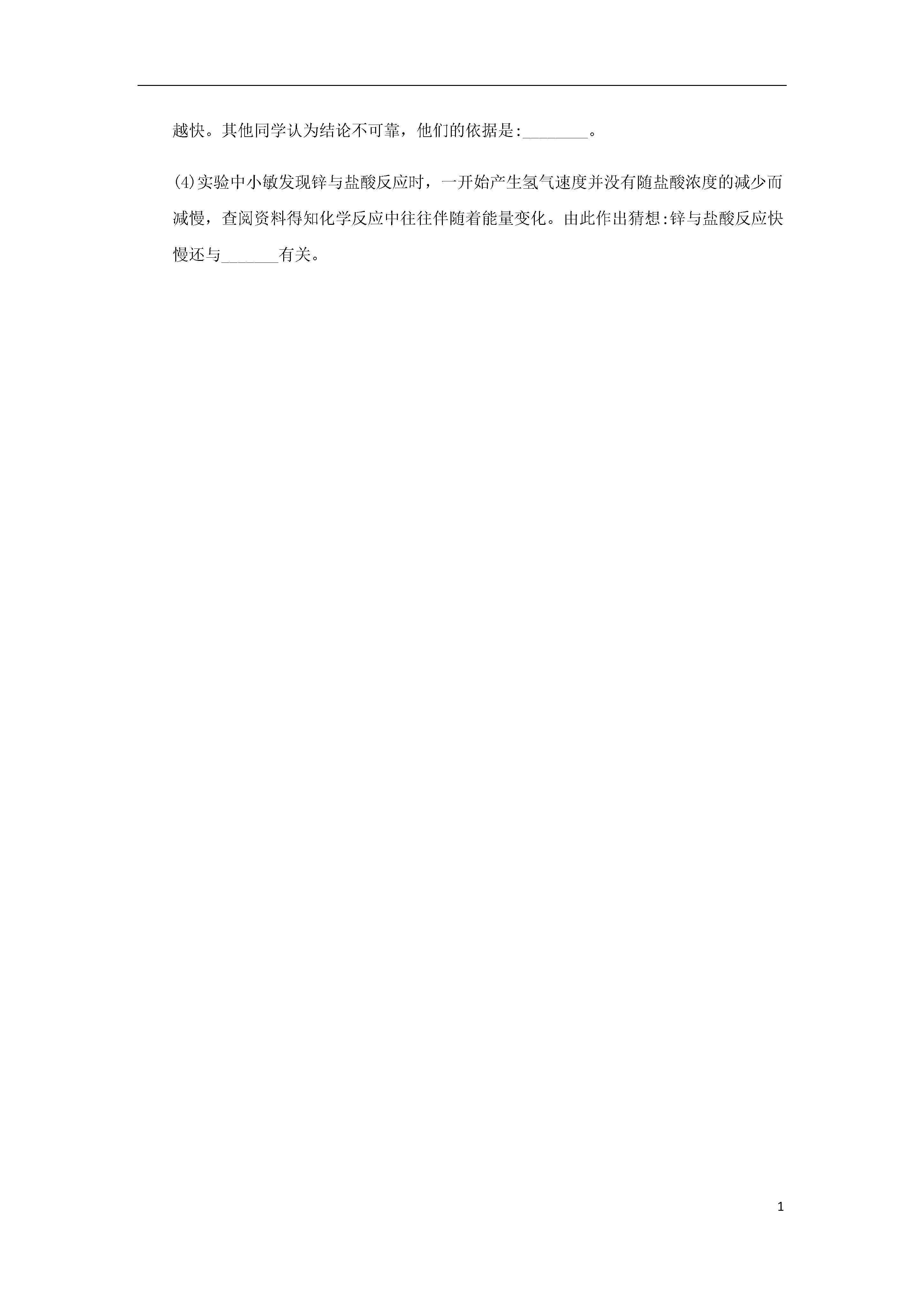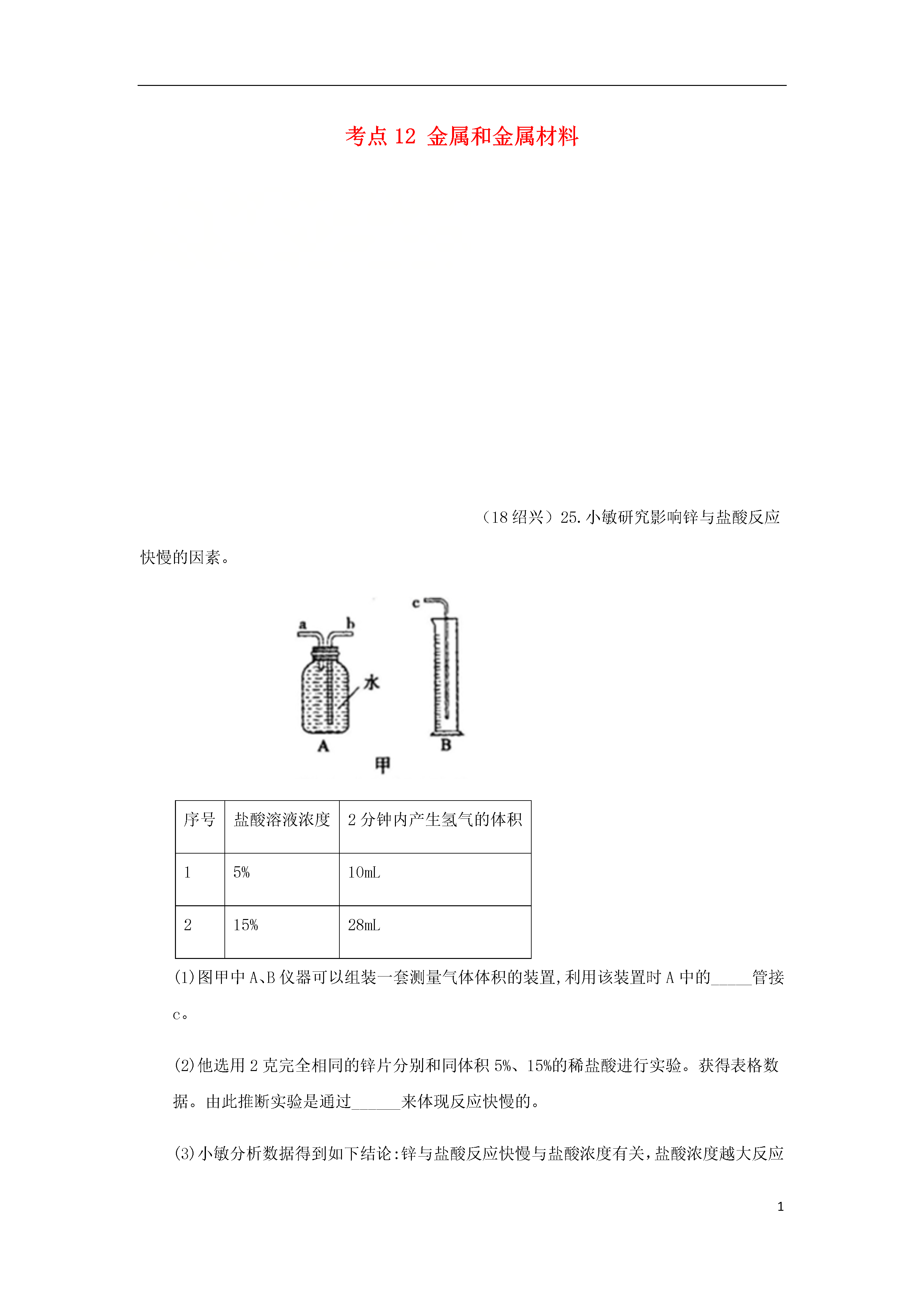 1考点12金属和金属材料(18绍兴)25.小敏研究影响锌与盐酸反应快慢的因素。序号盐酸溶液浓度2分钟内产生氢气的体积15%10mL215%28mL(1)图甲中A、B仪器可以组装一套测量气体体积的装置,利用该装置时A中的_____管接c。(2)他选用2克完全相同的锌片分别和同体积5%、15%的稀盐酸进行实验。获得表格数据。由此推断实验是通过______来体现反应快慢的。(3)小敏分析数据得到如下结论:锌与盐酸反应快慢与盐酸浓度有关,盐酸浓度越大反应越快。其他同学认为结论不可靠,他们的依据是:________。(4)实验中小敏发现锌与盐酸反应时,一开始产生氢气速度并没有随盐酸浓度的减少而减慢,查阅资料得知化学反应中往往伴随着能量变化。由此作出猜想:锌与盐酸反应快慢还与_______有关。