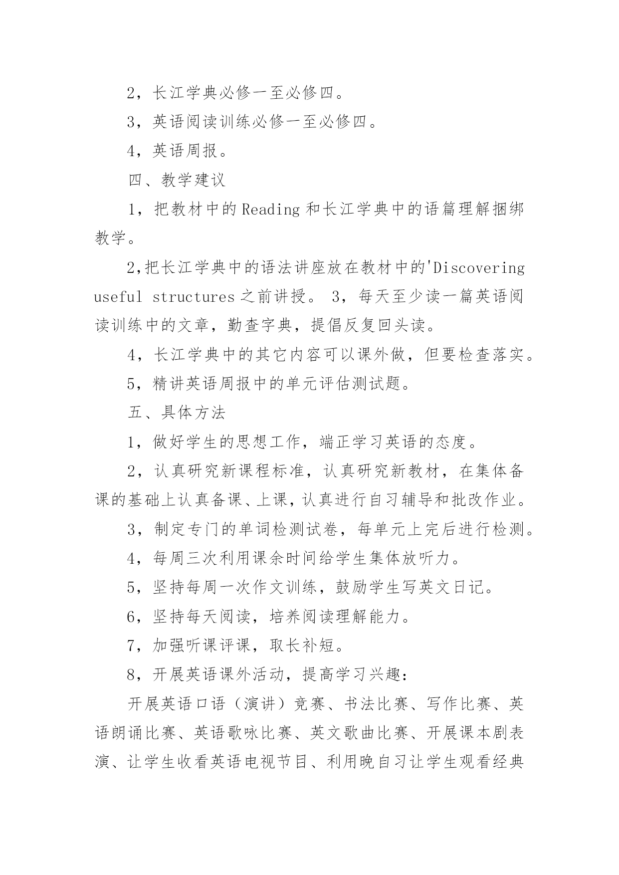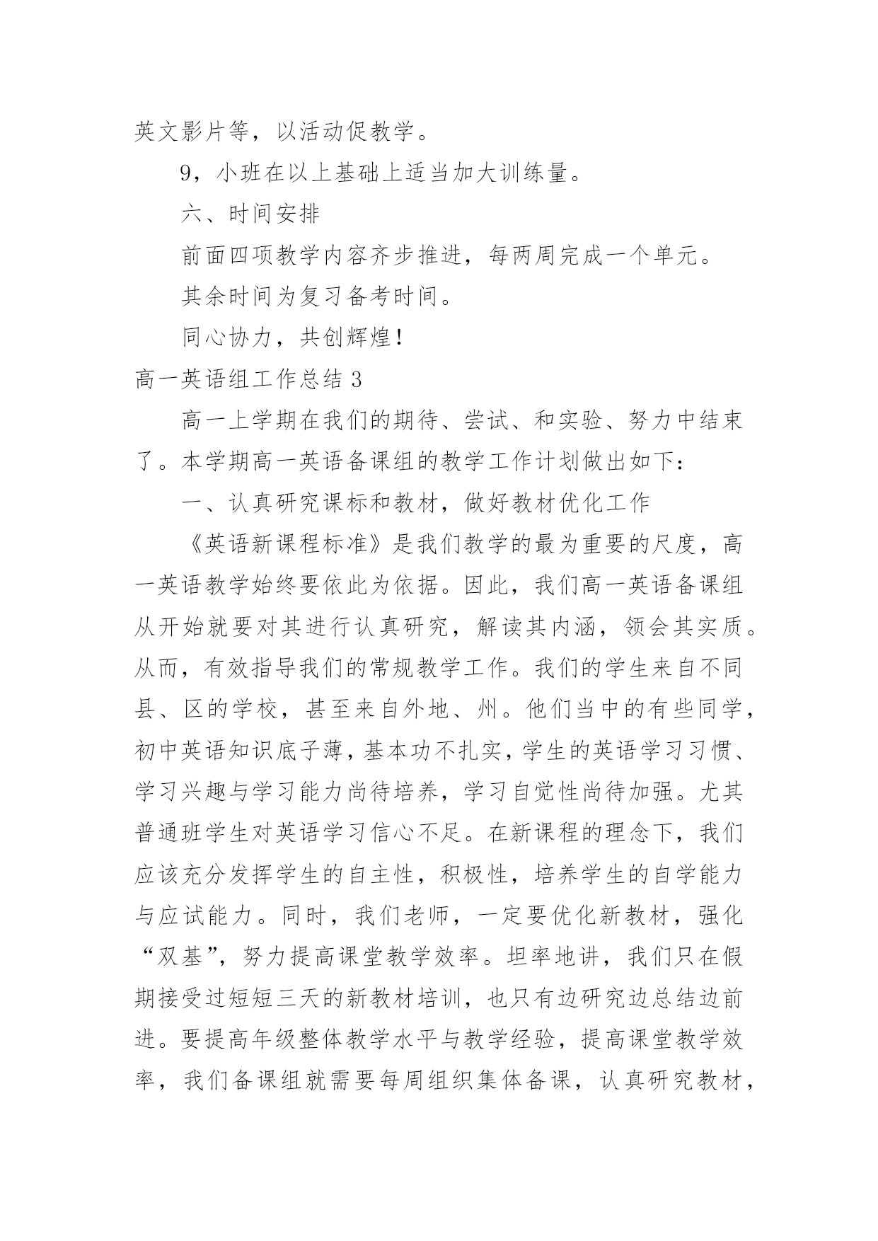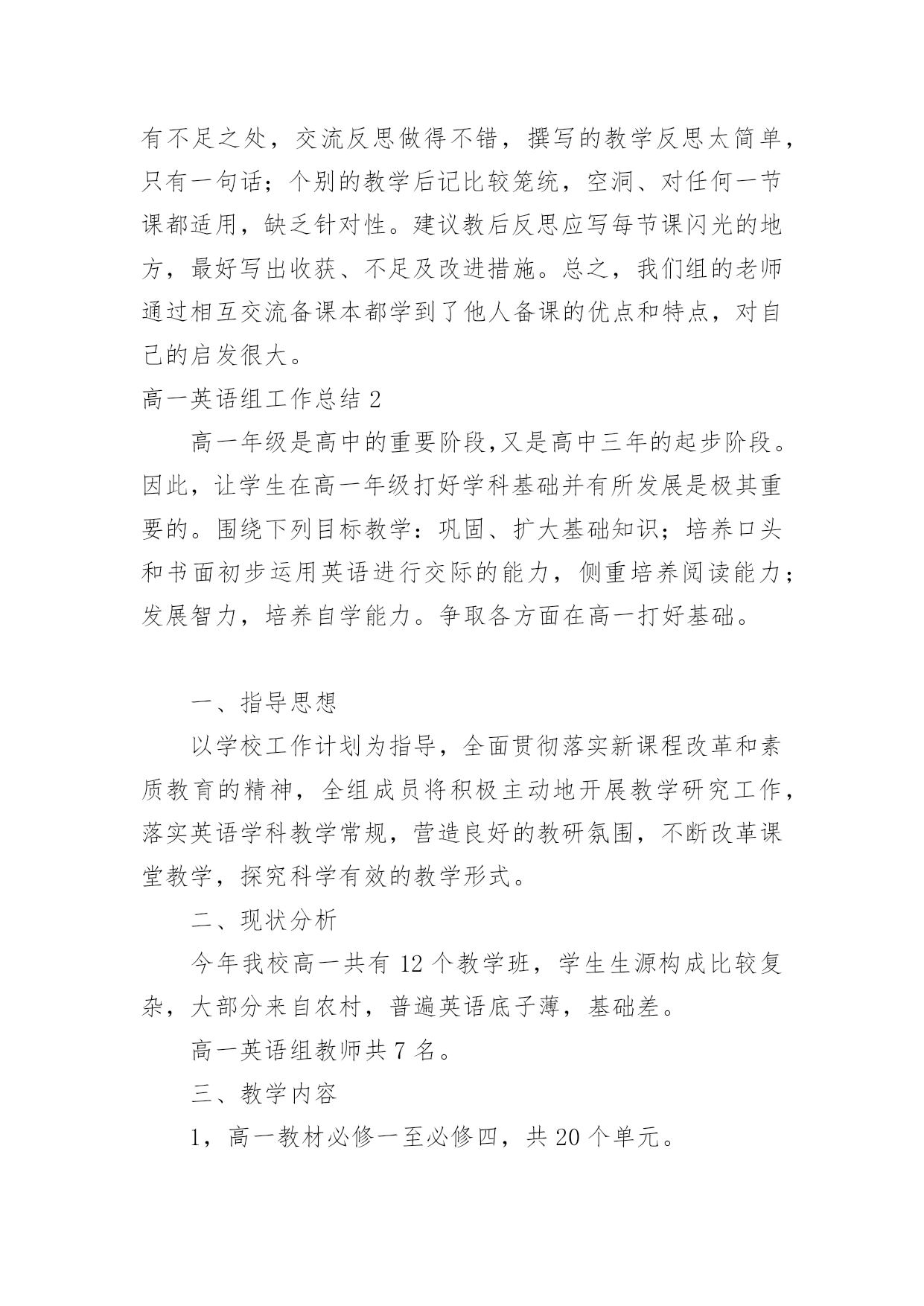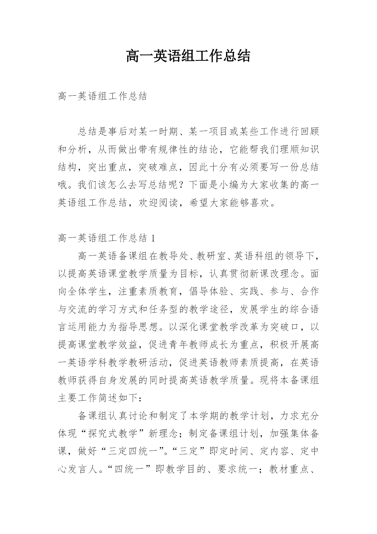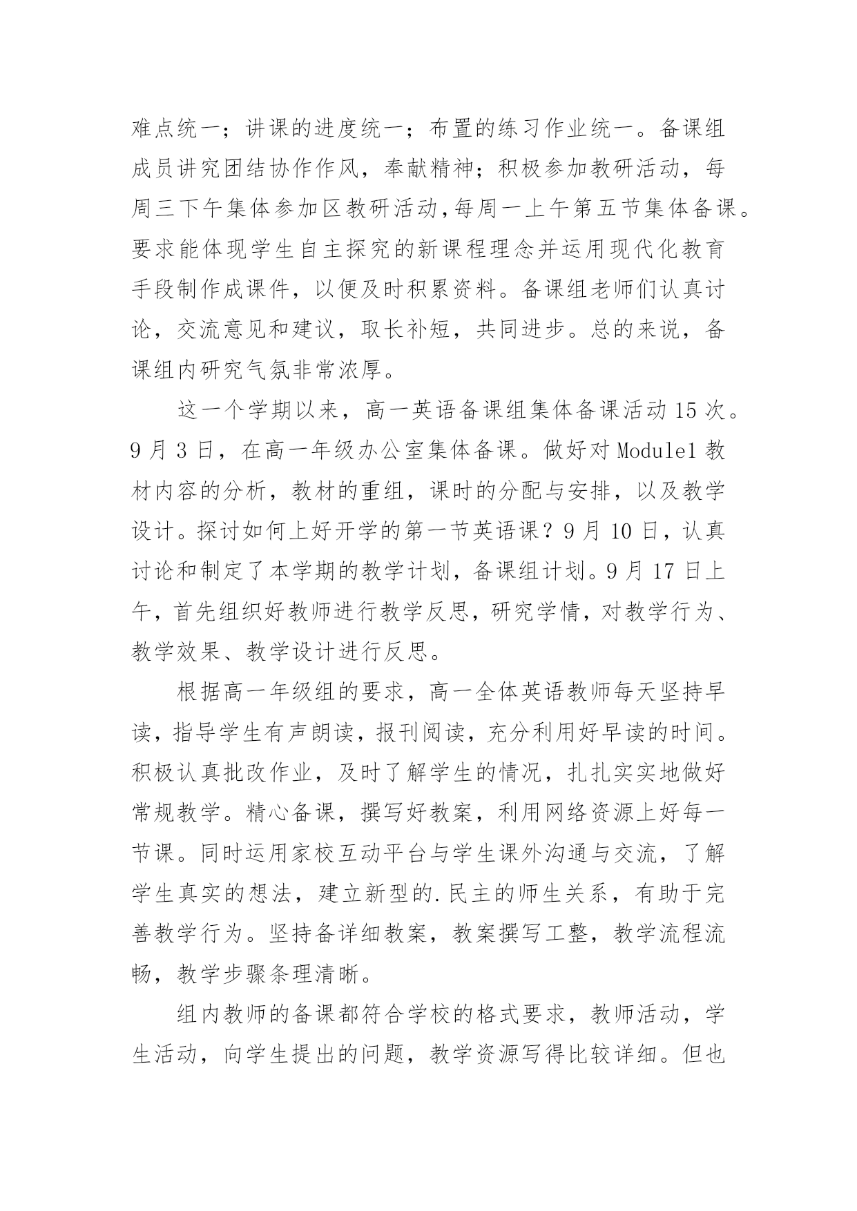 高一英语组工作总结 高一英语组工作总结总结是事后对某一时期、某一项目或某些工作进行回顾和分析,从而做出带有规律性的结论,它能帮我们理顺知识结构,突出重点,突破难点,因此十分有必须要写一份总结哦。我们该怎么去写总结呢?下面是小编为大家收集的高一英语组工作总结,欢迎阅读,希望大家能够喜欢。高一英语组工作总结1高一英语备课组在教导处、教研室、英语科组的领导下,以提高英语课堂教学质量为目标,认真贯彻新课改理念。面向全体学生,注重素质教育,倡导体验、实践、参与、合作与交流的学习方式和任务型的教学途径,发展学生的综合语言运用能力为指导思想。以深化课堂教学改革为突破口,以提高课堂教学效益,促进青年教师成长为重点,积极开展高一英语学科教学教研活动,促进英语教师素质提高,在英语教师获得自身发展的同时提高英语教学质量。现将本备课组主要工作简述如下:备课组认真讨论和制定了本学期的教学计划,力求充分体现“探究式教学”新理念;制定备课组计划,加强集体备课,做好“三定四统一”。“三定”即定时间、定内容、定中心发言人。“四统一”即教学目的、要求统一;教材重点、难点统一;讲课的进度统一;布置的练习作业统一。备课组成员讲究团结协作作风,奉献精神;积极参加教研活动,每周三下午集体参加区教研活动,每周一上午第五节集体备课。要求能体现学生自主探究的新课程理念并运用现代化教育手段制作成课件,以便及时积累资料。备课组老师们认真讨论,交流意见和建议,取长补短,共同进步。总的来说,备课组内研究气氛非常浓厚。这一个学期以来,高一英语备课组集体备课活动15次。9月3日,在高一年级办公室集体备课。做好对Module1教材内容的分析,教材的重组,课时的分配与安排,以及教学设计。探讨如何上好开学的第一节英语课?9月10日,认真讨论和制定了本学期的教学计划,备课组计划。9月17日上午,首先组织好教师进行教学反思,研究学情,对教学行为、教学效果、教学设计进行反思。根据高一年级组的要求,高一全体英语教师每天坚持早读,指导学生有声朗读,报刊阅读,充分利用好早读的时间。积极认真批改作业,及时了解学生的情况,扎扎实实地做好常规教学。精心备课,撰写好教案,利用网络资源上好每一节课。同时运用家校互动平台与学生课外沟通与交流,了解学生真实的想法,建立新型的.民主的师生关系,有助于完善教学行为。坚持备详细教案,教案撰写工整,教学流程流畅,教学步骤条理清晰。组内教师的备课都符合学校的格式要求,教师活动,学生活动,向学生提出的问题,教学资源写得比较详细。但也有不足之处,交流反思做得不错,撰写的教学反思太简单,只有一句话;个别的教学后记比较笼统,空洞、对任何一节课都适用,缺乏针对性。建议教后反思应写每节课闪光的地方,最好写出收获、不足及改进措施。总之,我们组的老师通过相互交流备课本都学到了他人备课的优点和特点,对自己的启发很大。高一英语组工作总结2高一年级是高中的重要阶段,又是高中三年的起步阶段。因此,让学生在高一年级打好学科基础并有所发展是极其重要的。围绕下列目标教学:巩固、扩大基础知识;培养口头和书面初步运用英语进行交际的能力,侧重培养阅读能力;发展智力,培养自学能力。争取各方面在高一打好基础。一、指导思想以学校工作计划为指导,全面贯彻落实新课程改革和素质教育的精神,全组成员将积极主动地开展教学研究工作,落实英语学科教学常规,营造良好的教研氛围,不断改革课堂教学,探究科学有效的教学形式。二、现状分析今年我校高一共有12个教学班,学生生源构成比较复杂,大部分来自农村,普遍英语底子薄,基础差。高一英语组教师共7名。三、教学内容1,高一教材必修一至必修四,共20个单元。2,长江学典必修一至必修四。3,英语阅读训练必修一至必修四。4,英语周报。四、教学建议1,把教材中的Reading和长江学典中的语篇理解捆绑教学。2,把长江学典中的语法讲座放在教材中的'Discoveringusefulstructures之前讲授。3,每天至少读一篇英语阅读训练中的文章,勤查字典,提倡反复回头读。4,长江学典中的其它内容可以课外做,但要检查落实。5,精讲英语周报中的单元评估测试题。五、具体方法1,做好学生的思想工作,端正学习英语的态度。2,认真研究新课程标准,认真研究新教材,在集体备课的基础上认真备课、上课,认真进行自习辅导和批改作业。3,制定专门的单词检测试卷,每单元上完后进行检测。4,每周三次利用课余时间给学生集体放听力。5,坚持每周一次作文训练,鼓励学生写英文日记。6,坚持每天阅读,培养阅读理解能力。7,加强听课评课,取长补短。8,开展英语课外活动,提高学习兴趣:开展英语口语(演讲)竞赛、书法比赛、写作比赛、英语朗诵比赛、英语歌咏比赛、英文歌曲比赛、开展课本剧表演、让学生收看英语电视节目、利用晚自习让学生观看经典英文影片