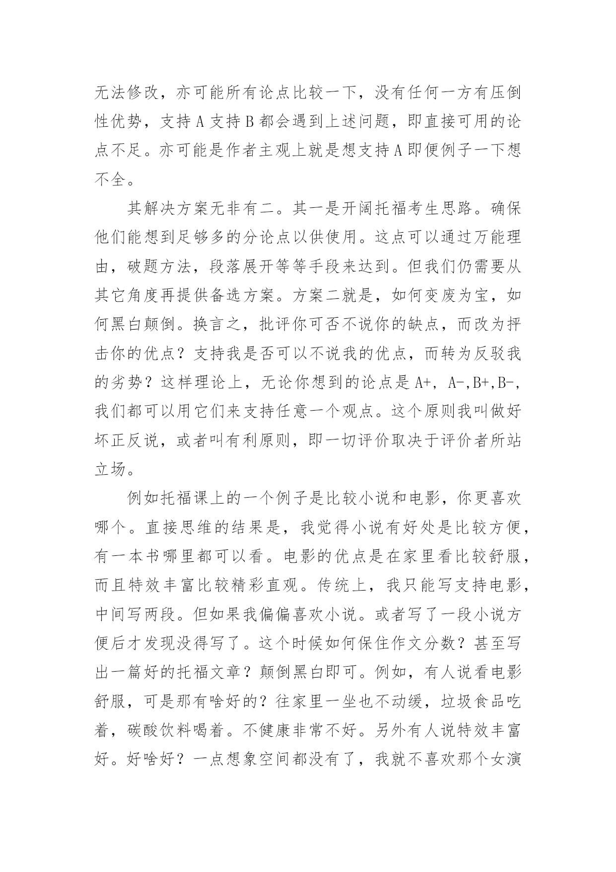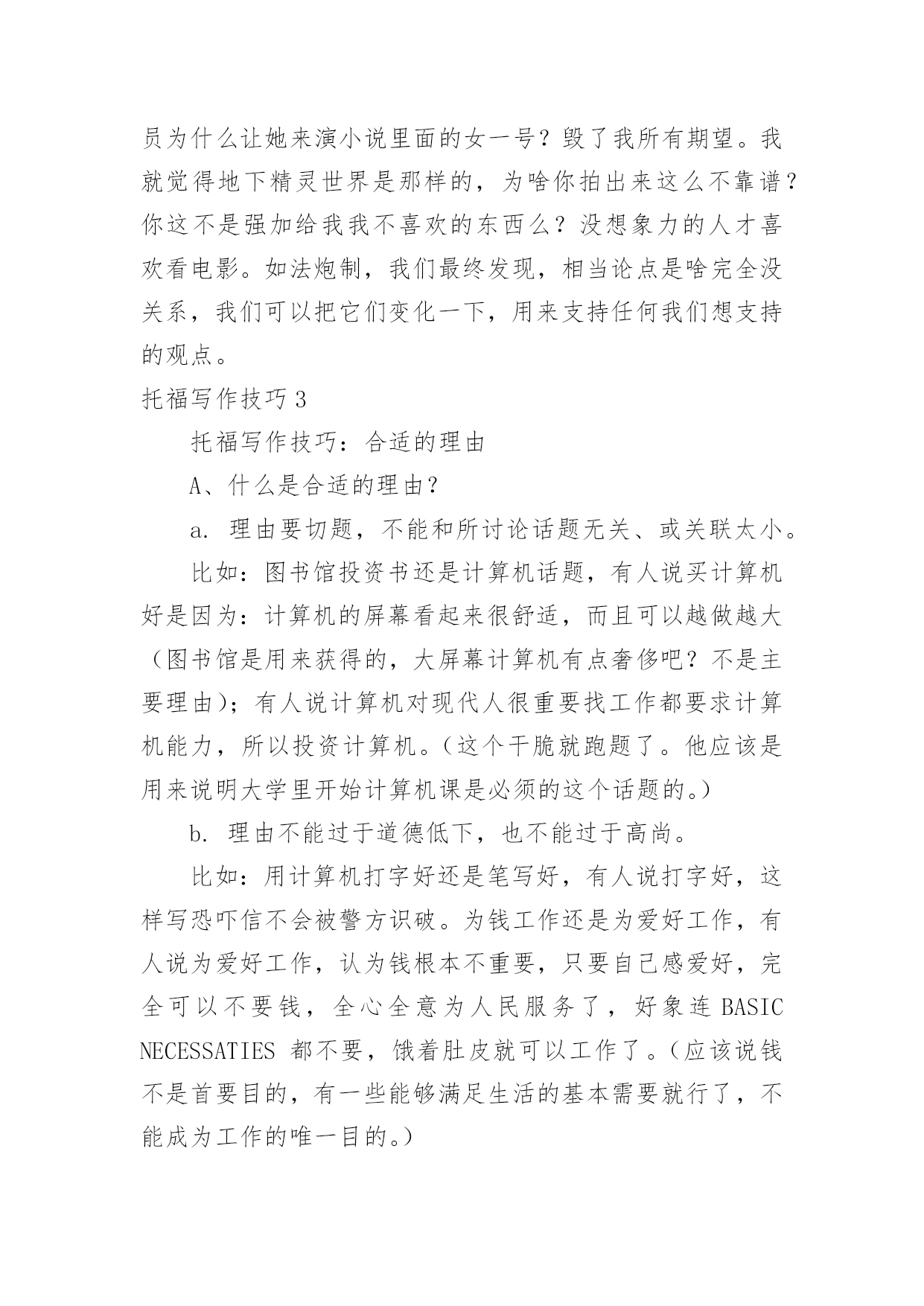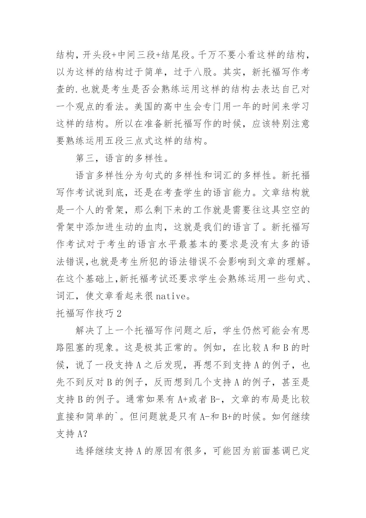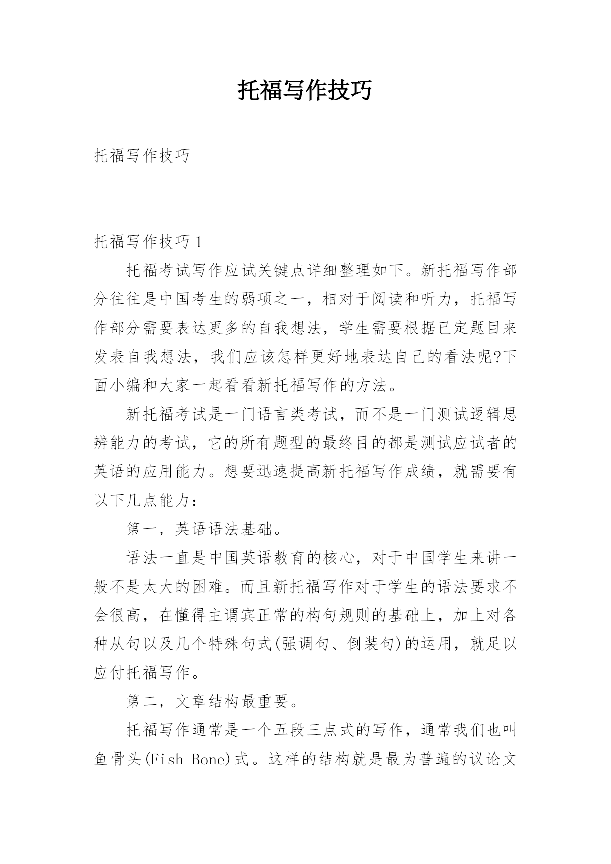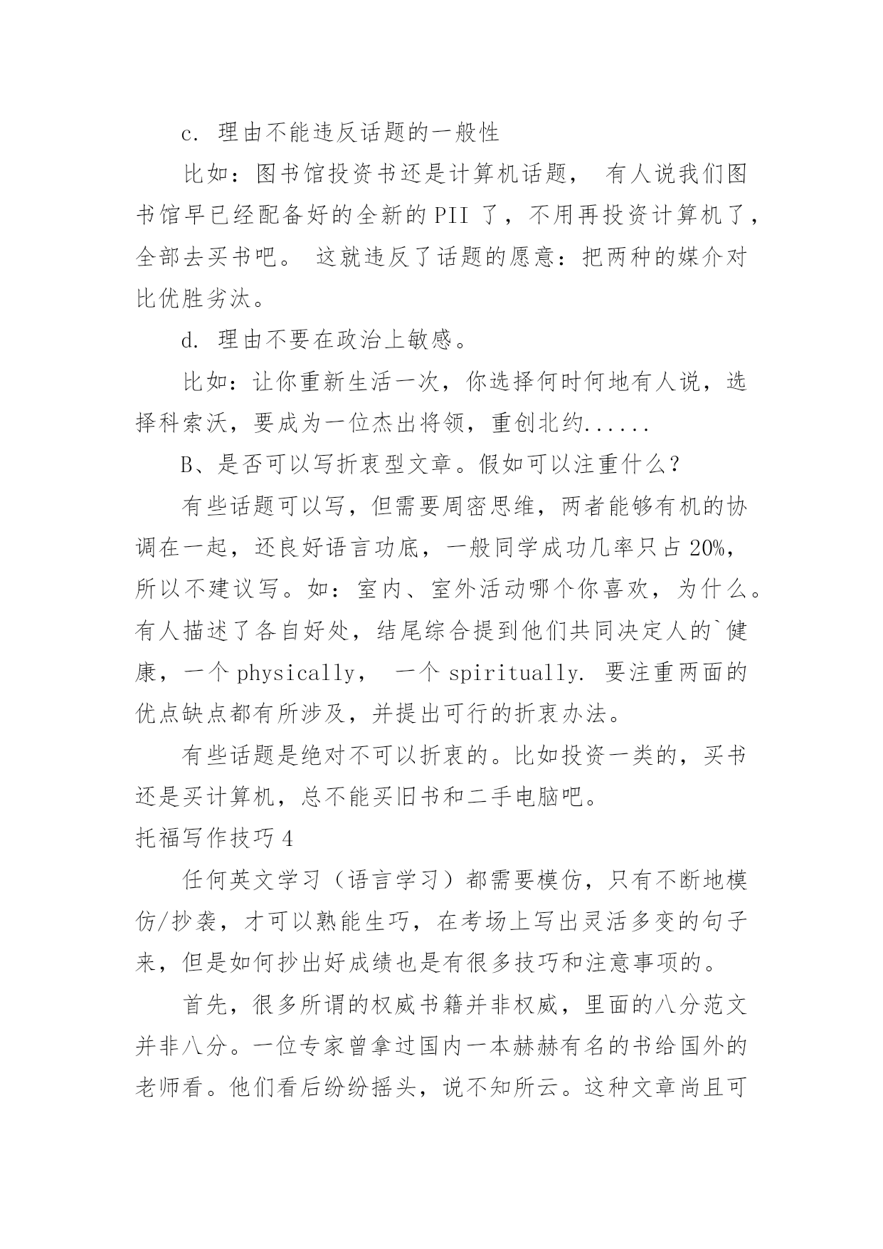 托福写作技巧 托福写作技巧托福写作技巧1托福考试写作应试关键点详细整理如下。新托福写作部分往往是中国考生的弱项之一,相对于阅读和听力,托福写作部分需要表达更多的自我想法,学生需要根据已定题目来发表自我想法,我们应该怎样更好地表达自己的看法呢?下面小编和大家一起看看新托福写作的方法。新托福考试是一门语言类考试,而不是一门测试逻辑思辨能力的考试,它的所有题型的最终目的都是测试应试者的英语的应用能力。想要迅速提高新托福写作成绩,就需要有以下几点能力:第一,英语语法基础。语法一直是中国英语教育的核心,对于中国学生来讲一般不是太大的困难。而且新托福写作对于学生的语法要求不会很高,在懂得主谓宾正常的构句规则的基础上,加上对各种从句以及几个特殊句式(强调句、倒装句)的运用,就足以应付托福写作。第二,文章结构最重要。托福写作通常是一个五段三点式的写作,通常我们也叫鱼骨头(FishBone)式。这样的结构就是最为普遍的议论文结构,开头段+中间三段+结尾段。千万不要小看这样的结构,以为这样的结构过于简单,过于八股。其实,新托福写作考查的.也就是考生是否会熟练运用这样的结构去表达自己对一个观点的看法。美国的高中生会专门用一年的时间来学习这样的结构。所以在准备新托福写作的时候,应该特别注意要熟练运用五段三点式这样的结构。第三,语言的多样性。语言多样性分为句式的多样性和词汇的多样性。新托福写作考试说到底,还是在考查学生的语言能力。文章结构就是一个人的骨架,那么剩下来的工作就是需要往这具空空的骨架中添加进生动的血肉,这就是我们的语言了。新托福写作考试对于考生的语言水平最基本的要求是没有太多的语法错误,也就是考生所犯的语法错误不会影响到文章的理解。在这个基础上,新托福考试还要求学生会熟练运用一些句式、词汇,使文章看起来很native。托福写作技巧2解决了上一个托福写作问题之后,学生仍然可能会有思路阻塞的现象。这是极其正常的。例如,在比较A和B的时候,说了一段支持A之后发现,再想不到支持A的例子,也先不到反对B的例子,反而想到几个支持A的例子,甚至是支持B的例子。通常如果有A+或者B-,文章的布局是比较直接和简单的`。但问题就是只有A-和B+的时候。如何继续支持A?选择继续支持A的原因有很多,可能因为前面基调已定无法修改,亦可能所有论点比较一下,没有任何一方有压倒性优势,支持A支持B都会遇到上述问题,即直接可用的论点不足。亦可能是作者主观上就是想支持A即便例子一下想不全。其解决方案无非有二。其一是开阔托福考生思路。确保他们能想到足够多的分论点以供使用。这点可以通过万能理由,破题方法,段落展开等等手段来达到。但我们仍需要从其它角度再提供备选方案。方案二就是,如何变废为宝,如何黑白颠倒。换言之,批评你可否不说你的缺点,而改为抨击你的优点?支持我是否可以不说我的优点,而转为反驳我的劣势?这样理论上,无论你想到的论点是A+,A-,B+,B-,我们都可以用它们来支持任意一个观点。这个原则我叫做好坏正反说,或者叫有利原则,即一切评价取决于评价者所站立场。例如托福课上的一个例子是比较小说和电影,你更喜欢哪个。直接思维的结果是,我觉得小说有好处是比较方便,有一本书哪里都可以看。电影的优点是在家里看比较舒服,而且特效丰富比较精彩直观。传统上,我只能写支持电影,中间写两段。但如果我偏偏喜欢小说。或者写了一段小说方便后才发现没得写了。这个时候如何保住作文分数?甚至写出一篇好的托福文章?颠倒黑白即可。例如,有人说看电影舒服,可是那有啥好的?往家里一坐也不动缓,垃圾食品吃着,碳酸饮料喝着。不健康非常不好。另外有人说特效丰富好。好啥好?一点想象空间都没有了,我就不喜欢那个女演员为什么让她来演小说里面的女一号?毁了我所有期望。我就觉得地下精灵世界是那样的,为啥你拍出来这么不靠谱?你这不是强加给我我不喜欢的东西么?没想象力的人才喜欢看电影。如法炮制,我们最终发现,相当论点是啥完全没关系,我们可以把它们变化一下,用来支持任何我们想支持的观点。托福写作技巧3托福写作技巧:合适的理由A、什么是合适的理由?a.理由要切题,不能和所讨论话题无关、或关联太小。比如:图书馆投资书还是计算机话题,有人说买计算机好是因为:计算机的屏幕看起来很舒适,而且可以越做越大(图书馆是用来获得的,大屏幕计算机有点奢侈吧?不是主要理由);有人说计算机对现代人很重要找工作都要求计算机能力,所以投资计算机。(这个干脆就跑题了。他应该是用来说明大学里开始计算机课是必须的这个话题的。)b.理由不能过于道德低下,也不能过于高尚。比如:用计算机打字好还是笔写好,有人说打字好,这样写恐吓信不会被警方识破。为钱工作还是为爱好工作,有人说为爱好工作,认为钱根本不重要,只要自己感爱好,完全可以不要钱,全心全意为人民服务了,好象连BASIC