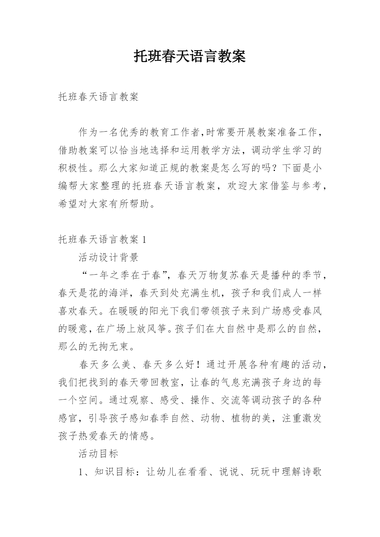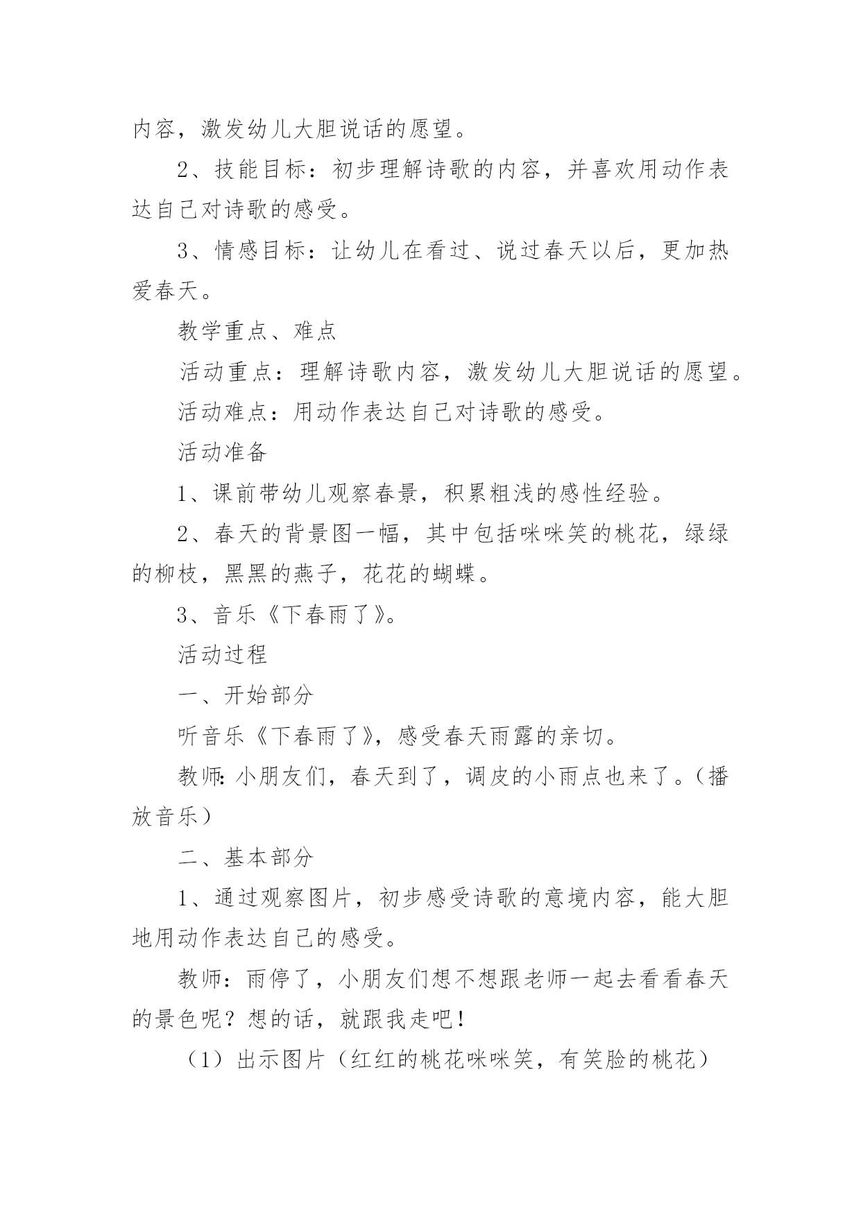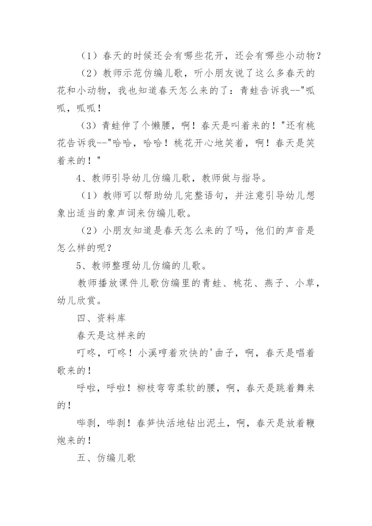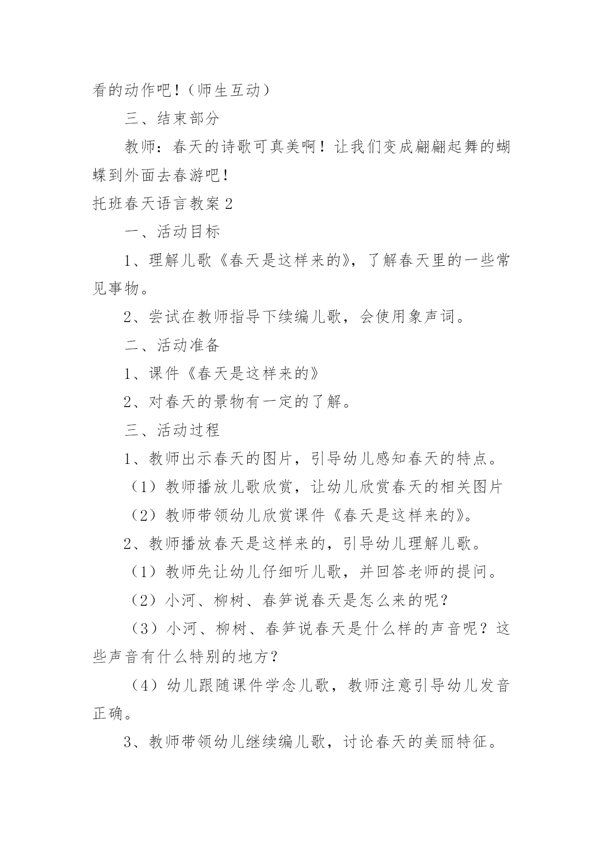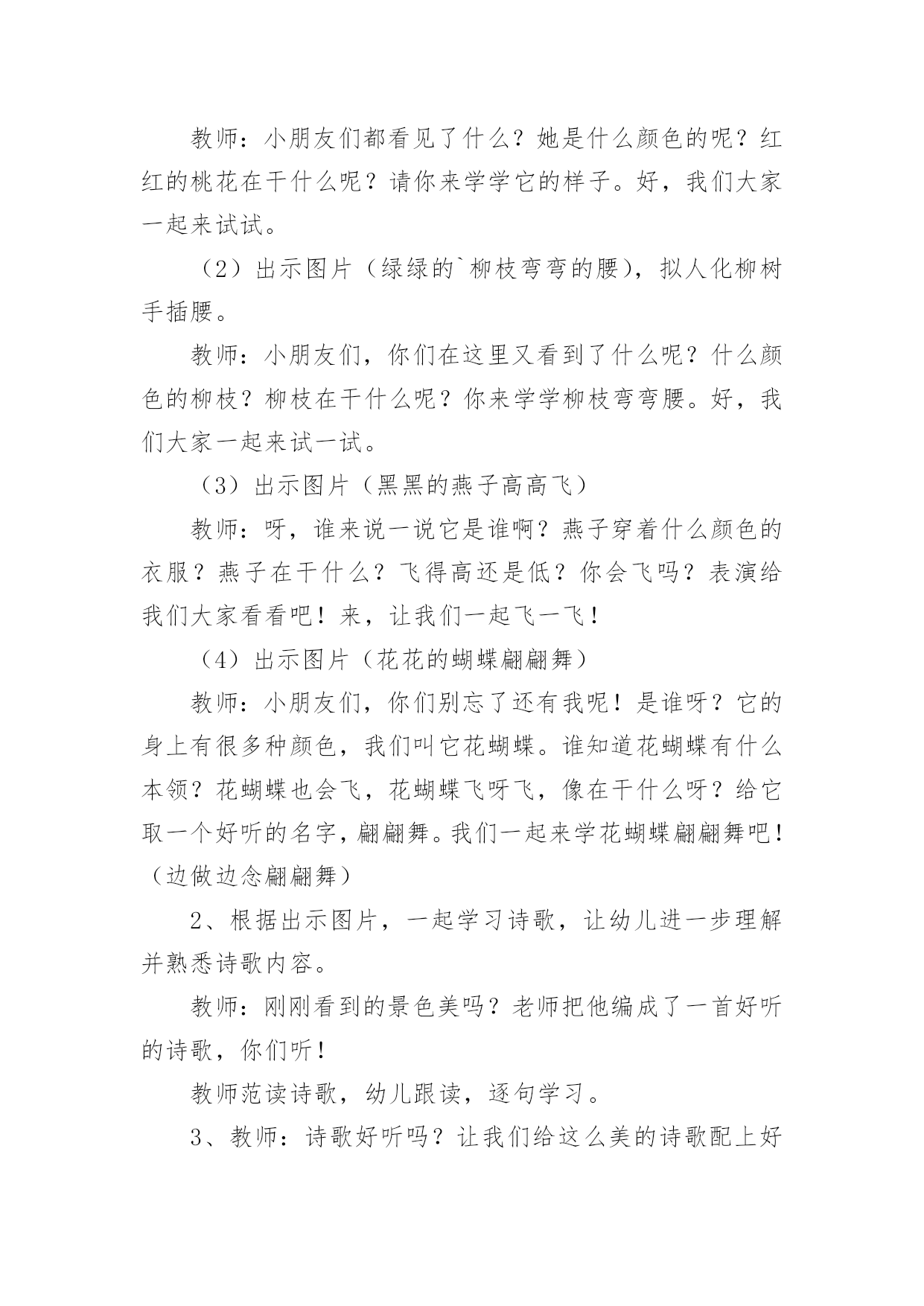 托班春天语言教案 托班春天语言教案作为一名优秀的教育工作者,时常要开展教案准备工作,借助教案可以恰当地选择和运用教学方法,调动学生学习的积极性。那么大家知道正规的教案是怎么写的吗?下面是小编帮大家整理的托班春天语言教案,欢迎大家借鉴与参考,希望对大家有所帮助。托班春天语言教案1活动设计背景“一年之季在于春”,春天万物复苏春天是播种的季节,春天是花的海洋,春天到处充满生机,孩子和我们成人一样喜欢春天。在暖暖的阳光下我们带领孩子来到广场感受春风的暖意,在广场上放风筝。孩子们在大自然中是那么的自然,那么的无拘无束。春天多么美、春天多么好!通过开展各种有趣的活动,我们把找到的春天带回教室,让春的气息充满孩子身边的每一个空间。通过观察、感受、操作、交流等调动孩子的各种感官,引导孩子感知春季自然、动物、植物的美,注重激发孩子热爱春天的情感。活动目标1、知识目标:让幼儿在看看、说说、玩玩中理解诗歌内容,激发幼儿大胆说话的愿望。2、技能目标:初步理解诗歌的内容,并喜欢用动作表达自己对诗歌的感受。3、情感目标:让幼儿在看过、说过春天以后,更加热爱春天。教学重点、难点活动重点:理解诗歌内容,激发幼儿大胆说话的愿望。活动难点:用动作表达自己对诗歌的感受。活动准备1、课前带幼儿观察春景,积累粗浅的感性经验。2、春天的背景图一幅,其中包括咪咪笑的桃花,绿绿的柳枝,黑黑的燕子,花花的蝴蝶。3、音乐《下春雨了》。活动过程一、开始部分听音乐《下春雨了》,感受春天雨露的亲切。教师:小朋友们,春天到了,调皮的小雨点也来了。(播放音乐)二、基本部分1、通过观察图片,初步感受诗歌的意境内容,能大胆地用动作表达自己的感受。教师:雨停了,小朋友们想不想跟老师一起去看看春天的景色呢?想的话,就跟我走吧!(1)出示图片(红红的桃花咪咪笑,有笑脸的桃花)教师:小朋友们都看见了什么?她是什么颜色的呢?红红的桃花在干什么呢?请你来学学它的样子。好,我们大家一起来试试。(2)出示图片(绿绿的`柳枝弯弯的腰),拟人化柳树手插腰。教师:小朋友们,你们在这里又看到了什么呢?什么颜色的柳枝?柳枝在干什么呢?你来学学柳枝弯弯腰。好,我们大家一起来试一试。(3)出示图片(黑黑的燕子高高飞)教师:呀,谁来说一说它是谁啊?燕子穿着什么颜色的衣服?燕子在干什么?飞得高还是低?你会飞吗?表演给我们大家看看吧!来,让我们一起飞一飞!(4)出示图片(花花的蝴蝶翩翩舞)教师:小朋友们,你们别忘了还有我呢!是谁呀?它的身上有很多种颜色,我们叫它花蝴蝶。谁知道花蝴蝶有什么本领?花蝴蝶也会飞,花蝴蝶飞呀飞,像在干什么呀?给它取一个好听的名字,翩翩舞。我们一起来学花蝴蝶翩翩舞吧!(边做边念翩翩舞)2、根据出示图片,一起学习诗歌,让幼儿进一步理解并熟悉诗歌内容。教师:刚刚看到的景色美吗?老师把他编成了一首好听的诗歌,你们听!教师范读诗歌,幼儿跟读,逐句学习。3、教师:诗歌好听吗?让我们给这么美的诗歌配上好看的动作吧!(师生互动)三、结束部分教师:春天的诗歌可真美啊!让我们变成翩翩起舞的蝴蝶到外面去春游吧!托班春天语言教案2一、活动目标1、理解儿歌《春天是这样来的》,了解春天里的一些常见事物。2、尝试在教师指导下续编儿歌,会使用象声词。二、活动准备1、课件《春天是这样来的》2、对春天的景物有一定的了解。三、活动过程1、教师出示春天的图片,引导幼儿感知春天的特点。(1)教师播放儿歌欣赏,让幼儿欣赏春天的相关图片(2)教师带领幼儿欣赏课件《春天是这样来的》。2、教师播放春天是这样来的,引导幼儿理解儿歌。(1)教师先让幼儿仔细听儿歌,并回答老师的提问。(2)小河、柳树、春笋说春天是怎么来的呢?(3)小河、柳树、春笋说春天是什么样的声音呢?这些声音有什么特别的地方?(4)幼儿跟随课件学念儿歌,教师注意引导幼儿发音正确。3、教师带领幼儿继续编儿歌,讨论春天的美丽特征。(1)春天的时候还会有哪些花开,还会有哪些小动物?(2)教师示范仿编儿歌,听小朋友说了这么多春天的花和小动物,我也知道春天怎么来的了:青蛙告诉我--"呱呱,呱呱!(3)青蛙伸了个懒腰,啊!春天是叫着来的!"还有桃花告诉我--"哈哈,哈哈!桃花开心地笑着,啊!春天是笑着来的!"4、教师引导幼儿仿编儿歌,教师做与指导。(1)教师可以帮助幼儿完整语句,并注意引导幼儿想象出适当的象声词来仿编儿歌。(2)小朋友知道是春天怎么来的了吗,他们的声音是怎么样的呢?5、教师整理幼儿仿编的儿歌。教师播放课件儿歌仿编里的青蛙、桃花、燕子、小草,幼儿欣赏。四、资料库春天是这样来的叮咚,叮咚!小溪哼着欢快的'曲子,啊,春天是唱着歌来的!呼啦,呼啦!柳枝弯弯柔软的腰,啊,春天是跳着舞来的!哔剥,哔剥!春笋快活地钻出泥土,啊,春天是放着鞭炮来的!五、仿编儿歌春天是这样来的呱呱,呱呱!青蛙伸了个