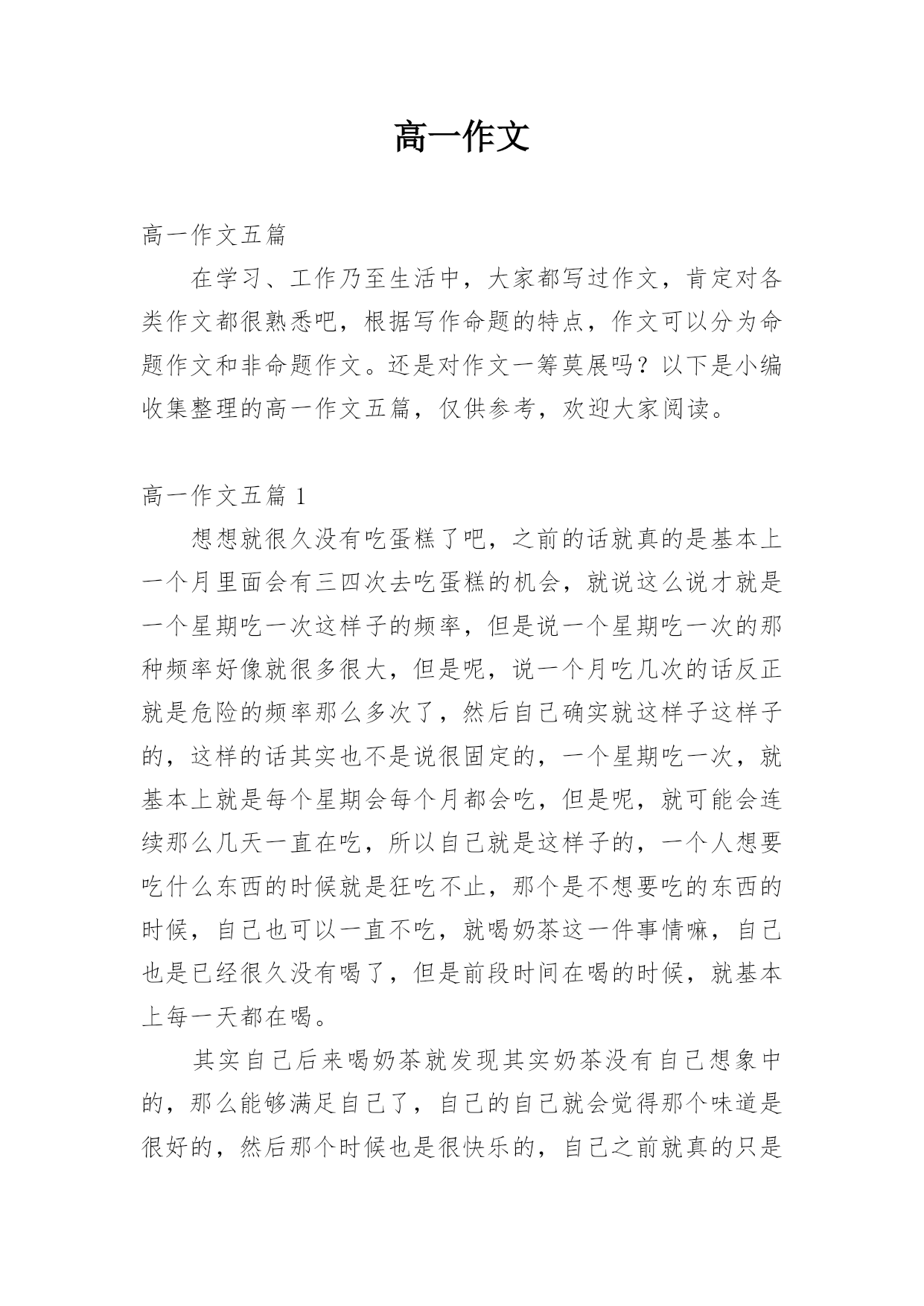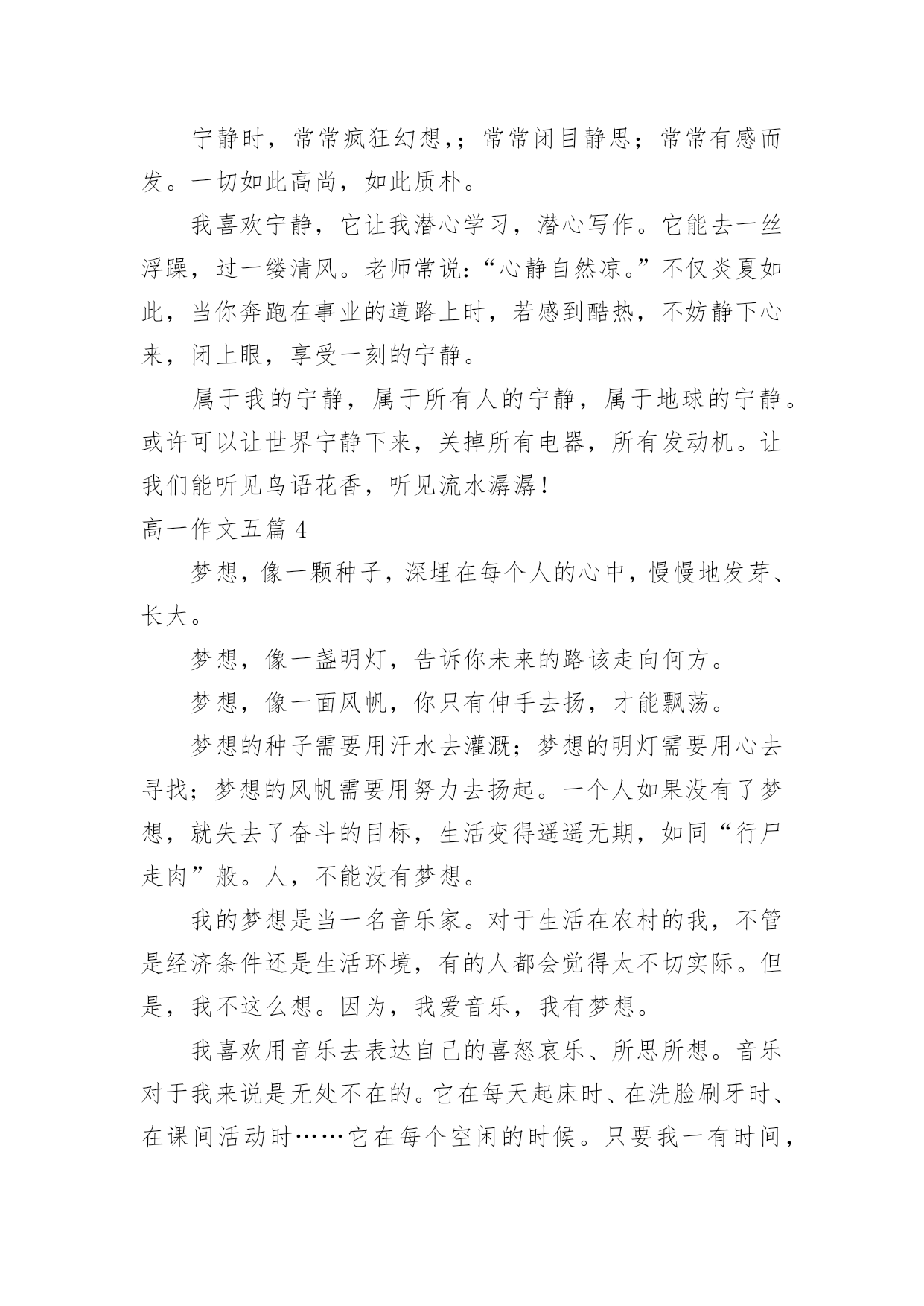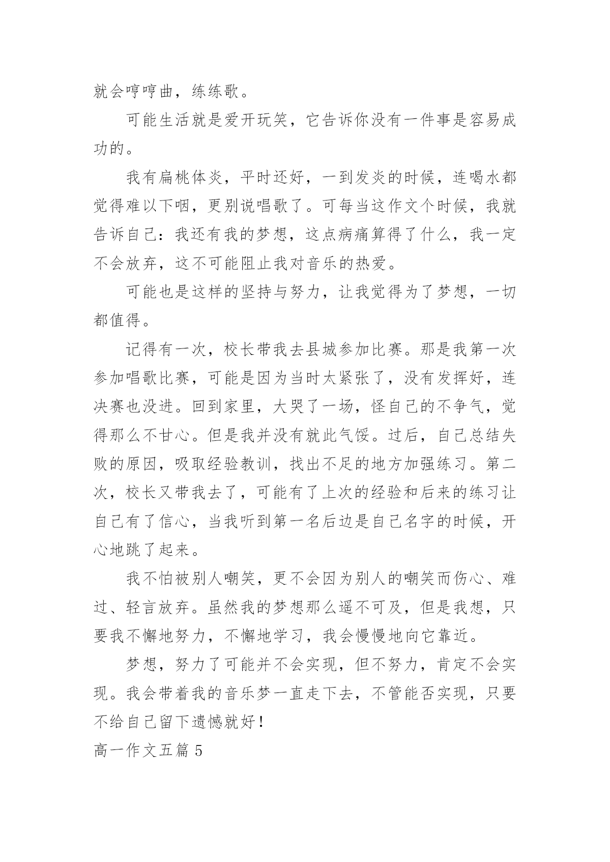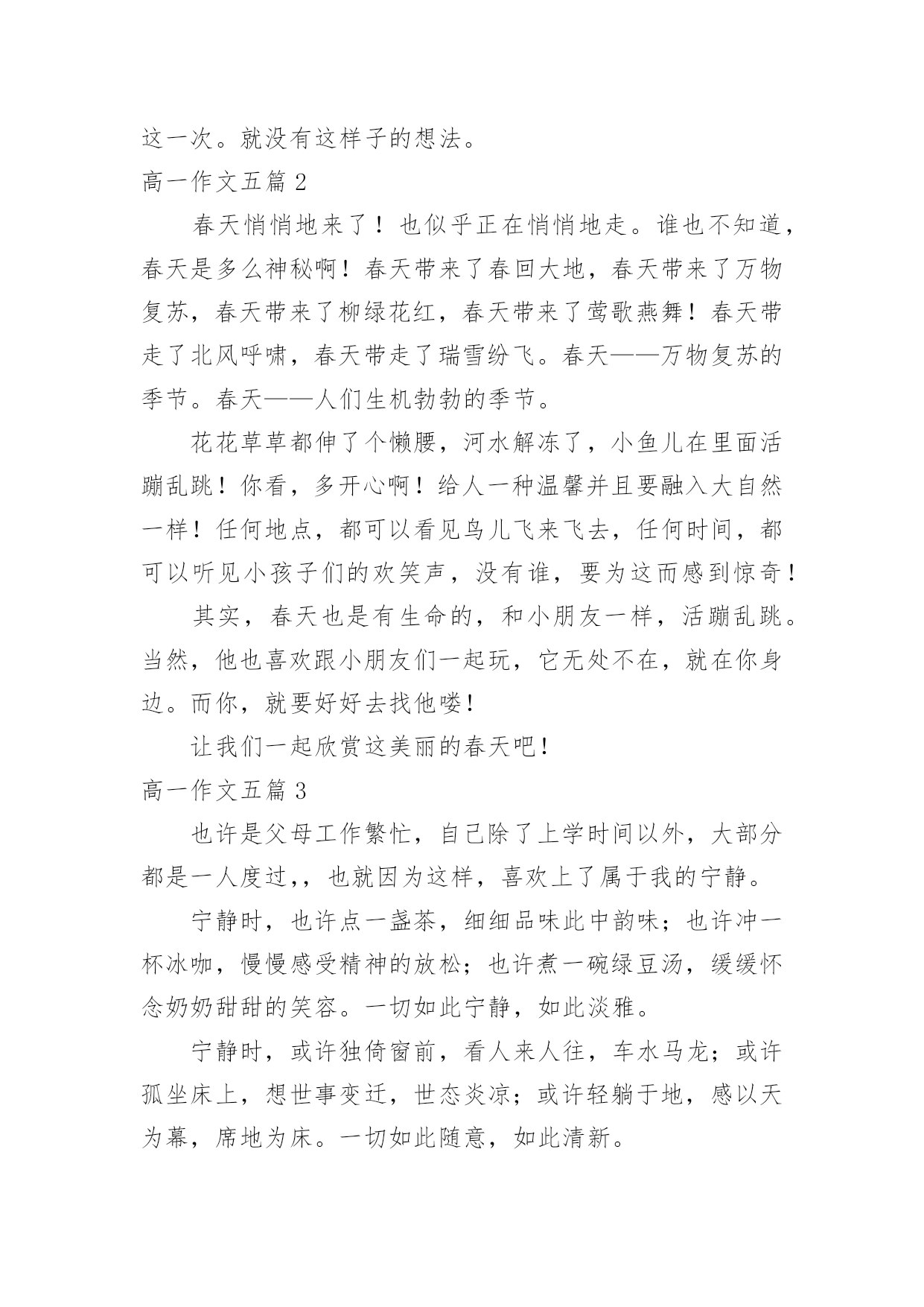 高一作文 高一作文五篇在学习、工作乃至生活中,大家都写过作文,肯定对各类作文都很熟悉吧,根据写作命题的特点,作文可以分为命题作文和非命题作文。还是对作文一筹莫展吗?以下是小编收集整理的高一作文五篇,仅供参考,欢迎大家阅读。高一作文五篇1想想就很久没有吃蛋糕了吧,之前的话就真的是基本上一个月里面会有三四次去吃蛋糕的机会,就说这么说才就是一个星期吃一次这样子的频率,但是说一个星期吃一次的那种频率好像就很多很大,但是呢,说一个月吃几次的话反正就是危险的频率那么多次了,然后自己确实就这样子这样子的,这样的话其实也不是说很固定的,一个星期吃一次,就基本上就是每个星期会每个月都会吃,但是呢,就可能会连续那么几天一直在吃,所以自己就是这样子的,一个人想要吃什么东西的时候就是狂吃不止,那个是不想要吃的东西的时候,自己也可以一直不吃,就喝奶茶这一件事情嘛,自己也是已经很久没有喝了,但是前段时间在喝的时候,就基本上每一天都在喝。其实自己后来喝奶茶就发现其实奶茶没有自己想象中的,那么能够满足自己了,自己的自己就会觉得那个味道是很好的,然后那个时候也是很快乐的,自己之前就真的只是单纯的喝纯纯奶茶的话,自己也会觉得很开心和原味奶茶。但是现在的话就已经不是这样子了,现在的话就值钱了,心里面的珍珠还有里面的燕麦。然后那个谁有很多时候都是让自己觉得特别的棒,然后不想让继续吸下去就感感觉还是挺容易的吧,但是就是还是得努力的觉得去吸那个水,要不然就吃不到那个珍珠,所以呢,后来吃奶喝奶茶的次数也就越来越少了,然后后来也是发现了其他可以替代奶茶的东西嘛,就更健康的一种方式了。然后蛋糕这一方面其实目前还是没有找到,可以其他可以性的代替的,然后现在虽然说来到这个学校,但是一个月还是会有那么一两次去吃蛋糕的机会,然后刚才在群里面看的那一个,他们昨天发的那些消息说的就是在今天晚上的7:00~9:00嘛,就是可以举行那个会议那个派对,然后他们已经准备了蛋糕,还有一些零食,希望我们可以带着真诚的热情真挚的热情去参加这一次活动,就其实这一种环境活动是真的很少的,但是终于有这样子的一个机会的时候,自己反而是很想要逃脱,虽然说在自己身旁也是有一个人可以陪着自己,然后让自己感觉不要那么孤单的,当时自己就觉得这样子的会议其实还是挺无趣的吧,就是没有任何的意义,之前的话自己就会觉得如果有那么一个人是自己想要去幸运的话,那这里会觉得参加这个会议是很有意义的,因为在通过这一个会议的过程中,自己可以更深刻的去了解到那一个人,而且呢这些可以通过这个会议,然后哪怕那个人没有感受到自己的爱,但是至少可以让那一个人感受和开心,但是这一次。就没有这样子的想法。高一作文五篇2春天悄悄地来了!也似乎正在悄悄地走。谁也不知道,春天是多么神秘啊!春天带来了春回大地,春天带来了万物复苏,春天带来了柳绿花红,春天带来了莺歌燕舞!春天带走了北风呼啸,春天带走了瑞雪纷飞。春天——万物复苏的季节。春天——人们生机勃勃的季节。花花草草都伸了个懒腰,河水解冻了,小鱼儿在里面活蹦乱跳!你看,多开心啊!给人一种温馨并且要融入大自然一样!任何地点,都可以看见鸟儿飞来飞去,任何时间,都可以听见小孩子们的欢笑声,没有谁,要为这而感到惊奇!其实,春天也是有生命的,和小朋友一样,活蹦乱跳。当然,他也喜欢跟小朋友们一起玩,它无处不在,就在你身边。而你,就要好好去找他喽!让我们一起欣赏这美丽的春天吧!高一作文五篇3也许是父母工作繁忙,自己除了上学时间以外,大部分都是一人度过,,也就因为这样,喜欢上了属于我的宁静。宁静时,也许点一盏茶,细细品味此中韵味;也许冲一杯冰咖,慢慢感受精神的放松;也许煮一碗绿豆汤,缓缓怀念奶奶甜甜的笑容。一切如此宁静,如此淡雅。宁静时,或许独倚窗前,看人来人往,车水马龙;或许孤坐床上,想世事变迁,世态炎凉;或许轻躺于地,感以天为幕,席地为床。一切如此随意,如此清新。宁静时,常常疯狂幻想,;常常闭目静思;常常有感而发。一切如此高尚,如此质朴。我喜欢宁静,它让我潜心学习,潜心写作。它能去一丝浮躁,过一缕清风。老师常说:“心静自然凉。”不仅炎夏如此,当你奔跑在事业的道路上时,若感到酷热,不妨静下心来,闭上眼,享受一刻的宁静。属于我的宁静,属于所有人的宁静,属于地球的宁静。或许可以让世界宁静下来,关掉所有电器,所有发动机。让我们能听见鸟语花香,听见流水潺潺!高一作文五篇4梦想,像一颗种子,深埋在每个人的心中,慢慢地发芽、长大。梦想,像一盏明灯,告诉你未来的路该走向何方。梦想,像一面风帆,你只有伸手去扬,才能飘荡。梦想的种子需要用汗水去灌溉;梦想的明灯需要用心去寻找;梦想的风帆需要用努力去扬起。一个人如果没有了梦想,就失去了奋斗的目标,生活变得遥遥无期,如同“行尸走肉”般。人,不能没有梦想。我的梦想是当一名音乐家。对于生活在农村