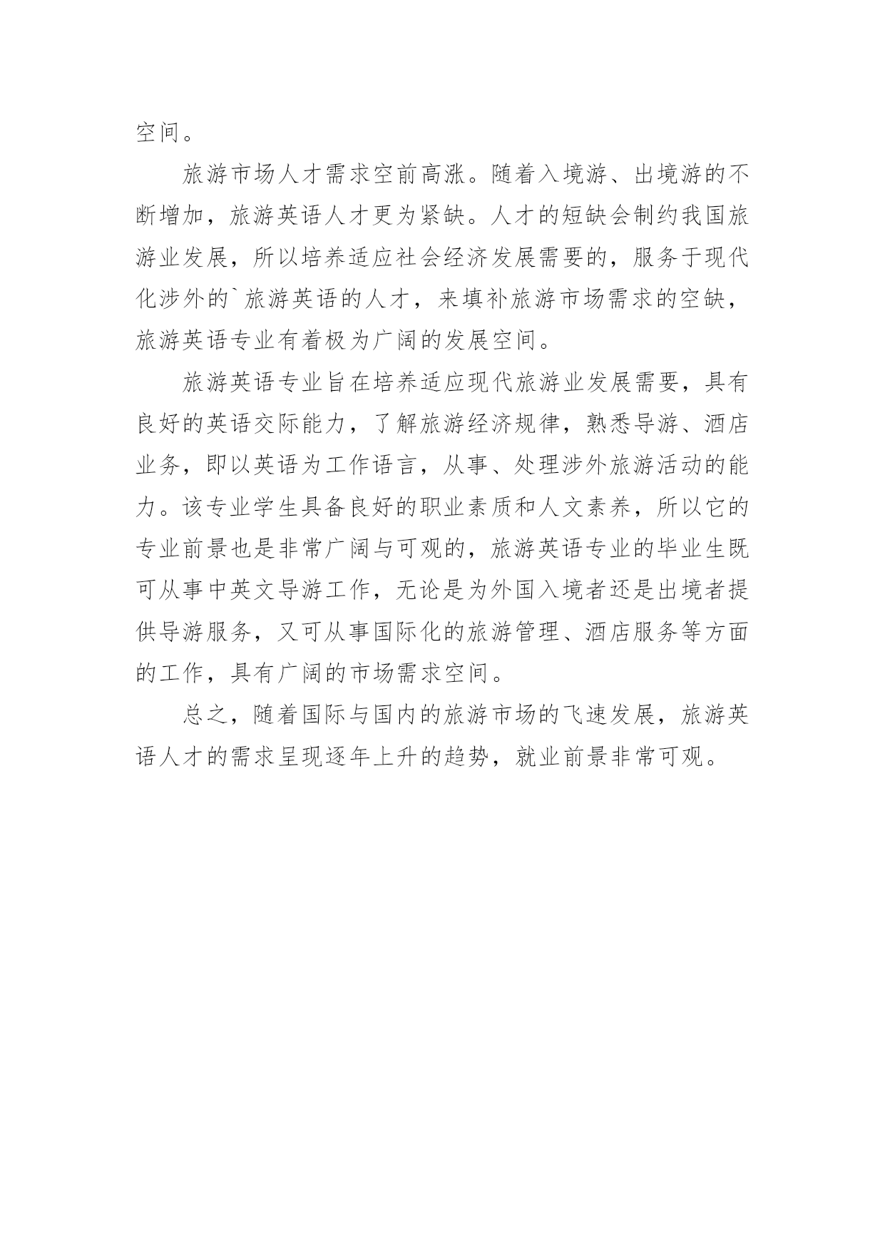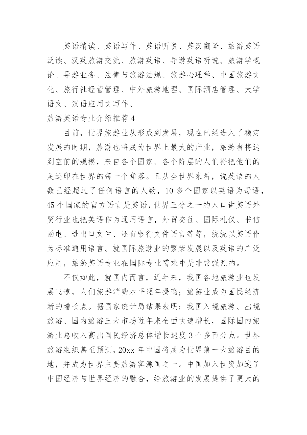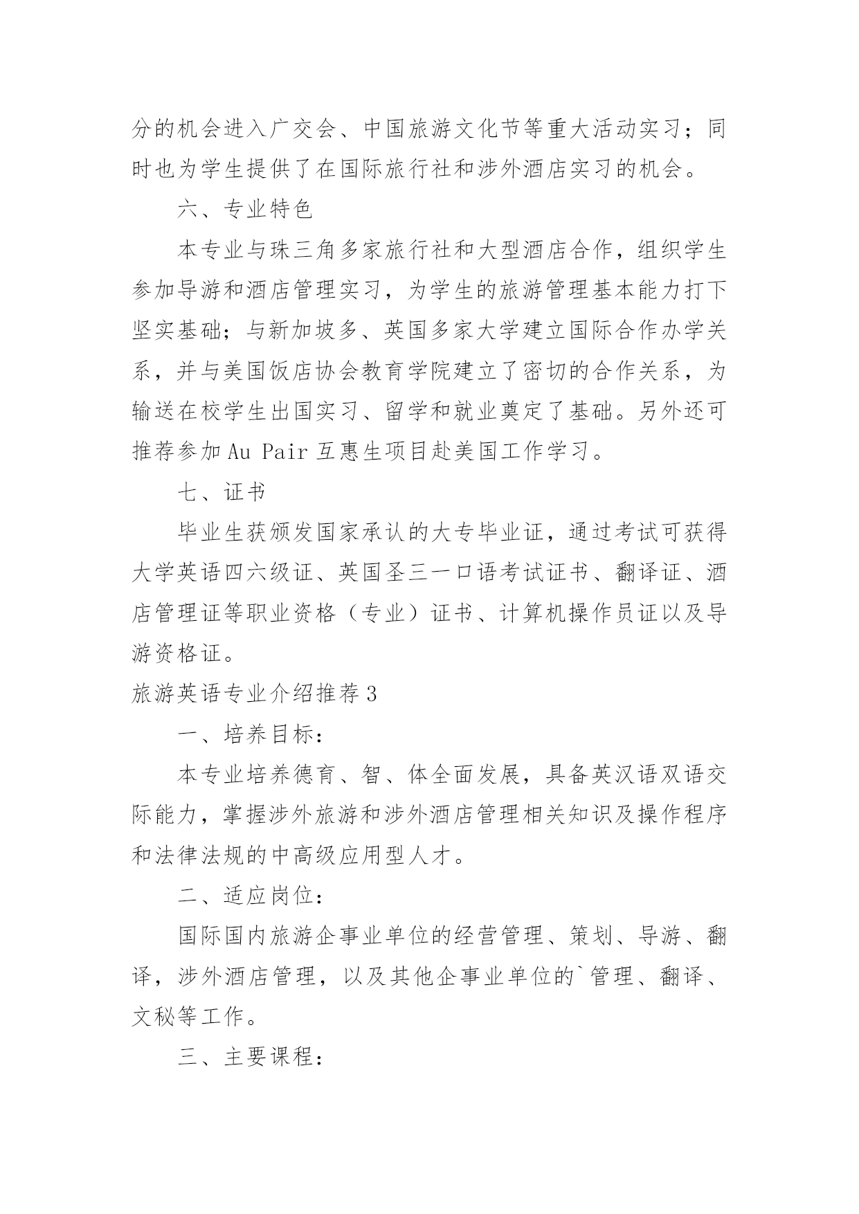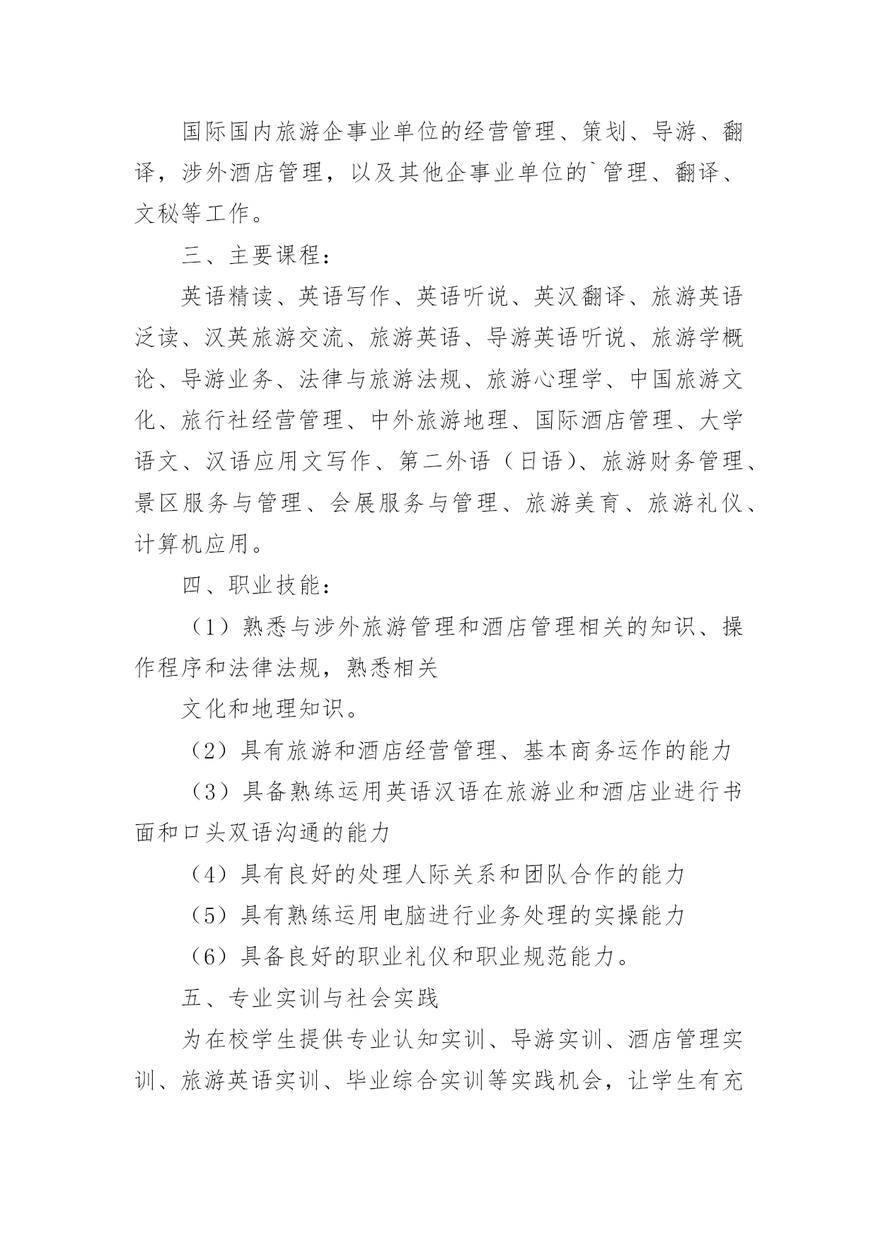 旅游英语专业介绍 旅游英语专业介绍推荐旅游英语专业介绍推荐1旅游、商英专业部由旅游服务与管理和商务英语两个专业组成。本专业部秉承“以就业为导向,使学生学有所长、发展有后劲”的宗旨,为学生搭建可持续发展的平台,拓宽其就业渠道。作为教育局批准的区级旅游实训基地,旅游专业拥有全市最先进的虚拟实景导游教室、实体旅行社等硬件设施。旅游专业与英国旅游学院、新加坡TMS旅游学院建立合作伙伴关系,为学生创造出国学习与就业的`机会。旅游专业参加了两届全国青少年世界遗产知识大赛,在重点中学高手云集的情况下,取得了团体优秀奖及“世界遗产保卫使者”的荣誉称号。商务英语专业作为我校20xx年成立的新兴专业,第一次参加北京市中职院校英语技能大赛,就取得了1个二等奖、1个三等奖的好成绩。旅游英语专业介绍推荐2一、培养目标:本专业培养德育、智、体全面发展,具备英汉语双语交际能力,掌握涉外旅游和涉外酒店管理相关知识及操作程序和法律法规的中高级应用型人才。二、适应岗位:国际国内旅游企事业单位的经营管理、策划、导游、翻译,涉外酒店管理,以及其他企事业单位的`管理、翻译、文秘等工作。三、主要课程:英语精读、英语写作、英语听说、英汉翻译、旅游英语泛读、汉英旅游交流、旅游英语、导游英语听说、旅游学概论、导游业务、法律与旅游法规、旅游心理学、中国旅游文化、旅行社经营管理、中外旅游地理、国际酒店管理、大学语文、汉语应用文写作、第二外语(日语)、旅游财务管理、景区服务与管理、会展服务与管理、旅游美育、旅游礼仪、计算机应用。四、职业技能:(1)熟悉与涉外旅游管理和酒店管理相关的知识、操作程序和法律法规,熟悉相关文化和地理知识。(2)具有旅游和酒店经营管理、基本商务运作的能力(3)具备熟练运用英语汉语在旅游业和酒店业进行书面和口头双语沟通的能力(4)具有良好的处理人际关系和团队合作的能力(5)具有熟练运用电脑进行业务处理的实操能力(6)具备良好的职业礼仪和职业规范能力。五、专业实训与社会实践为在校学生提供专业认知实训、导游实训、酒店管理实训、旅游英语实训、毕业综合实训等实践机会,让学生有充分的机会进入广交会、中国旅游文化节等重大活动实习;同时也为学生提供了在国际旅行社和涉外酒店实习的机会。六、专业特色本专业与珠三角多家旅行社和大型酒店合作,组织学生参加导游和酒店管理实习,为学生的旅游管理基本能力打下坚实基础;与新加坡多、英国多家大学建立国际合作办学关系,并与美国饭店协会教育学院建立了密切的合作关系,为输送在校学生出国实习、留学和就业奠定了基础。另外还可推荐参加AuPair互惠生项目赴美国工作学习。七、证书毕业生获颁发国家承认的大专毕业证,通过考试可获得大学英语四六级证、英国圣三一口语考试证书、翻译证、酒店管理证等职业资格(专业)证书、计算机操作员证以及导游资格证。旅游英语专业介绍推荐3一、培养目标:本专业培养德育、智、体全面发展,具备英汉语双语交际能力,掌握涉外旅游和涉外酒店管理相关知识及操作程序和法律法规的中高级应用型人才。二、适应岗位:国际国内旅游企事业单位的经营管理、策划、导游、翻译,涉外酒店管理,以及其他企事业单位的`管理、翻译、文秘等工作。三、主要课程:英语精读、英语写作、英语听说、英汉翻译、旅游英语泛读、汉英旅游交流、旅游英语、导游英语听说、旅游学概论、导游业务、法律与旅游法规、旅游心理学、中国旅游文化、旅行社经营管理、中外旅游地理、国际酒店管理、大学语文、汉语应用文写作、旅游英语专业介绍推荐4目前,世界旅游业从形成到发展,现在已经进入了稳定发展的时期,旅游也将成为世界上最大的产业,旅游者将达到空前的规模,来自各个国家、各个阶层的人们将把他们的足迹印在世界的每一个角落。且从全世界来看,说英语的人数已经超过了任何语言的人数,10多个国家以英语为母语,45个国家的官方语言是英语,世界三分之一的人口讲英语外贸行业也把英语作为通用语言,外贸交往、国际礼仪、书信函电、进出口文件、还有银行文件语言等等,统统以英语作为标准通用语言。就国际旅游业的繁荣发展以及英语的广泛应用,旅游英语专业在国际专业需求中是非常强烈的。不仅如此,就国内而言,近年来,我国各地旅游业也发展飞速,人们旅游消费水平逐年提高;旅游业成为国民经济新的增长点。据国家统计局结果表明:我国入境旅游、出境旅游、国内旅游三大市场近年来全面快速增长,国际国内旅游业总收入高出国民经济总体增长速度3个多百分点。世界旅游组织甚至预测,20xx年中国将成为世界第一大旅游目的地,并成为世界主要旅游客源国之一。中国加入世贸加速了中国经济与世界经济的融合,给旅游业的发展提供了更大的空间。旅游市场人才需求空前高涨。随着入境游、出境游的不断增加,旅游英语人才更为紧缺。人才的短缺会制约我国旅游业发展,所以培养适应社会经济发展需要的,服务于现代化
