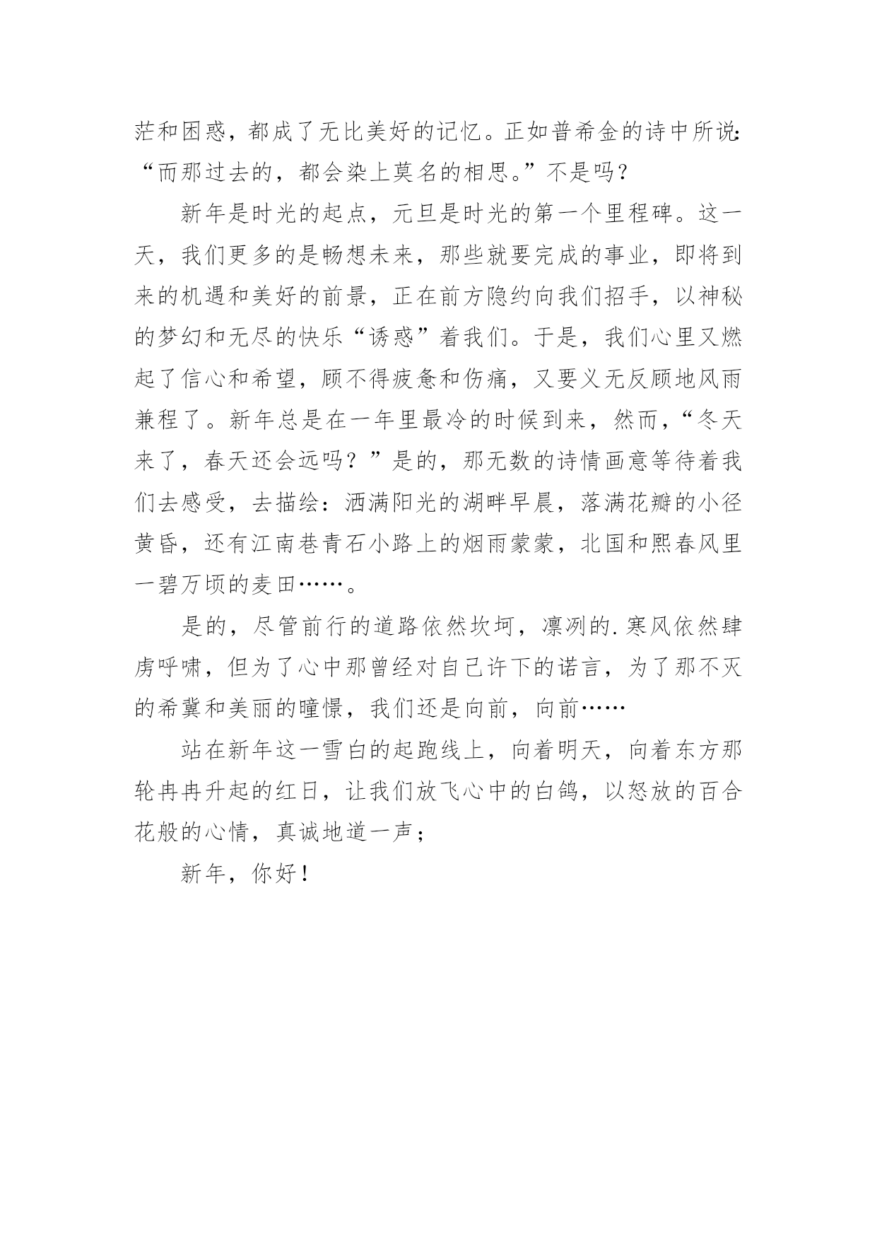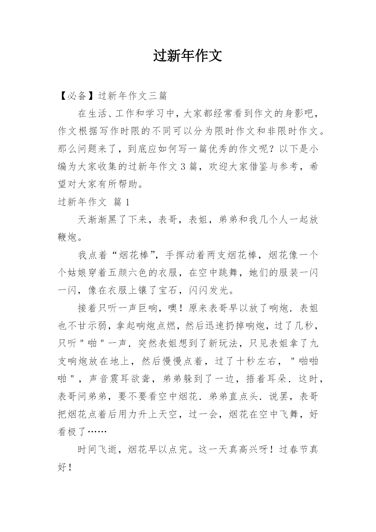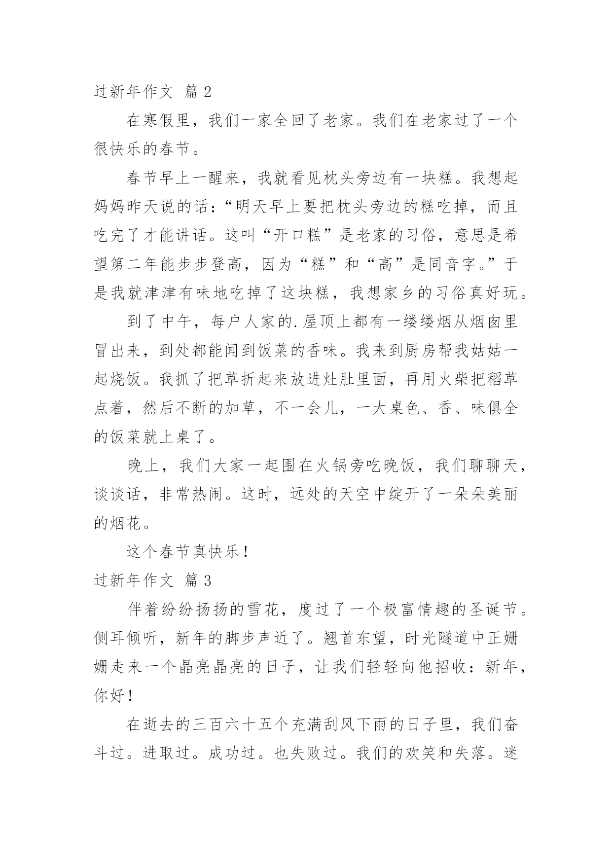 过新年作文 【必备】过新年作文三篇在生活、工作和学习中,大家都经常看到作文的身影吧,作文根据写作时限的不同可以分为限时作文和非限时作文。那么问题来了,到底应如何写一篇优秀的作文呢?以下是小编为大家收集的过新年作文3篇,欢迎大家借鉴与参考,希望对大家有所帮助。过新年作文篇1天渐渐黑了下来,表哥,表姐,弟弟和我几个人一起放鞭炮。我点着“烟花棒”,手挥动着两支烟花棒,烟花像一个个姑娘穿着五颜六色的衣服,在空中跳舞,她们的服装一闪一闪,像在衣服上镶了宝石,闪闪发光。接着只听一声巨响,噢!原来表哥早以放了响炮.表姐也不甘示弱,拿起响炮点燃,然后迅速扔掉响炮,过了几秒,只听"啪"一声.突然表姐想到了新玩法,只见表姐拿了九支响炮放在地上,然后慢慢点着,过了十秒左右,"啪啪啪",声音震耳欲聋,弟弟躲到了一边,捂着耳朵.这时,表哥问弟弟,要不要看空中烟花.弟弟直点头.说罢,表哥把烟花点着后用力升上天空,过一会,烟花在空中飞舞,好看极了……时间飞逝,烟花早以点完。这一天真高兴呀!过春节真好!过新年作文篇2在寒假里,我们一家全回了老家。我们在老家过了一个很快乐的春节。春节早上一醒来,我就看见枕头旁边有一块糕。我想起妈妈昨天说的话:“明天早上要把枕头旁边的糕吃掉,而且吃完了才能讲话。这叫“开口糕”是老家的习俗,意思是希望第二年能步步登高,因为“糕”和“高”是同音字。”于是我就津津有味地吃掉了这块糕,我想家乡的习俗真好玩。到了中午,每户人家的.屋顶上都有一缕缕烟从烟囱里冒出来,到处都能闻到饭菜的香味。我来到厨房帮我姑姑一起烧饭。我抓了把草折起来放进灶肚里面,再用火柴把稻草点着,然后不断的加草,不一会儿,一大桌色、香、味俱全的饭菜就上桌了。晚上,我们大家一起围在火锅旁吃晚饭,我们聊聊天,谈谈话,非常热闹。这时,远处的天空中绽开了一朵朵美丽的烟花。这个春节真快乐!过新年作文篇3伴着纷纷扬扬的雪花,度过了一个极富情趣的圣诞节。侧耳倾听,新年的脚步声近了。翘首东望,时光隧道中正姗姗走来一个晶亮晶亮的日子,让我们轻轻向他招收:新年,你好!在逝去的三百六十五个充满刮风下雨的日子里,我们奋斗过。进取过。成功过。也失败过。我们的欢笑和失落。迷茫和困惑,都成了无比美好的记忆。正如普希金的诗中所说:“而那过去的,都会染上莫名的相思。”不是吗?新年是时光的起点,元旦是时光的第一个里程碑。这一天,我们更多的是畅想未来,那些就要完成的事业,即将到来的机遇和美好的前景,正在前方隐约向我们招手,以神秘的梦幻和无尽的快乐“诱惑”着我们。于是,我们心里又燃起了信心和希望,顾不得疲惫和伤痛,又要义无反顾地风雨兼程了。新年总是在一年里最冷的时候到来,然而,“冬天来了,春天还会远吗?”是的,那无数的诗情画意等待着我们去感受,去描绘:洒满阳光的湖畔早晨,落满花瓣的小径黄昏,还有江南巷青石小路上的烟雨蒙蒙,北国和熙春风里一碧万顷的麦田……。是的,尽管前行的道路依然坎坷,凛冽的.寒风依然肆虏呼啸,但为了心中那曾经对自己许下的诺言,为了那不灭的希冀和美丽的曈憬,我们还是向前,向前……站在新年这一雪白的起跑线上,向着明天,向着东方那轮冉冉升起的红日,让我们放飞心中的白鸽,以怒放的百合花般的心情,真诚地道一声;新年,你好!