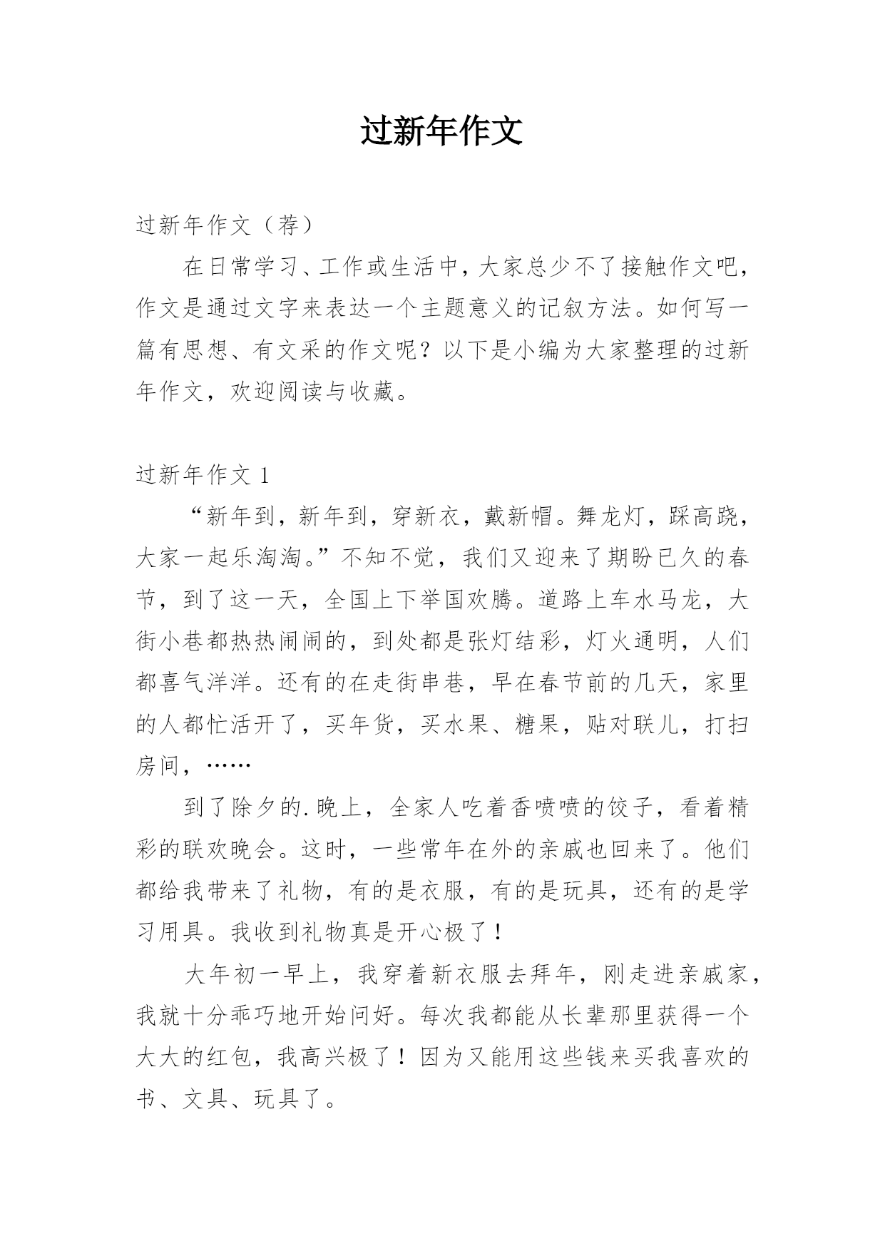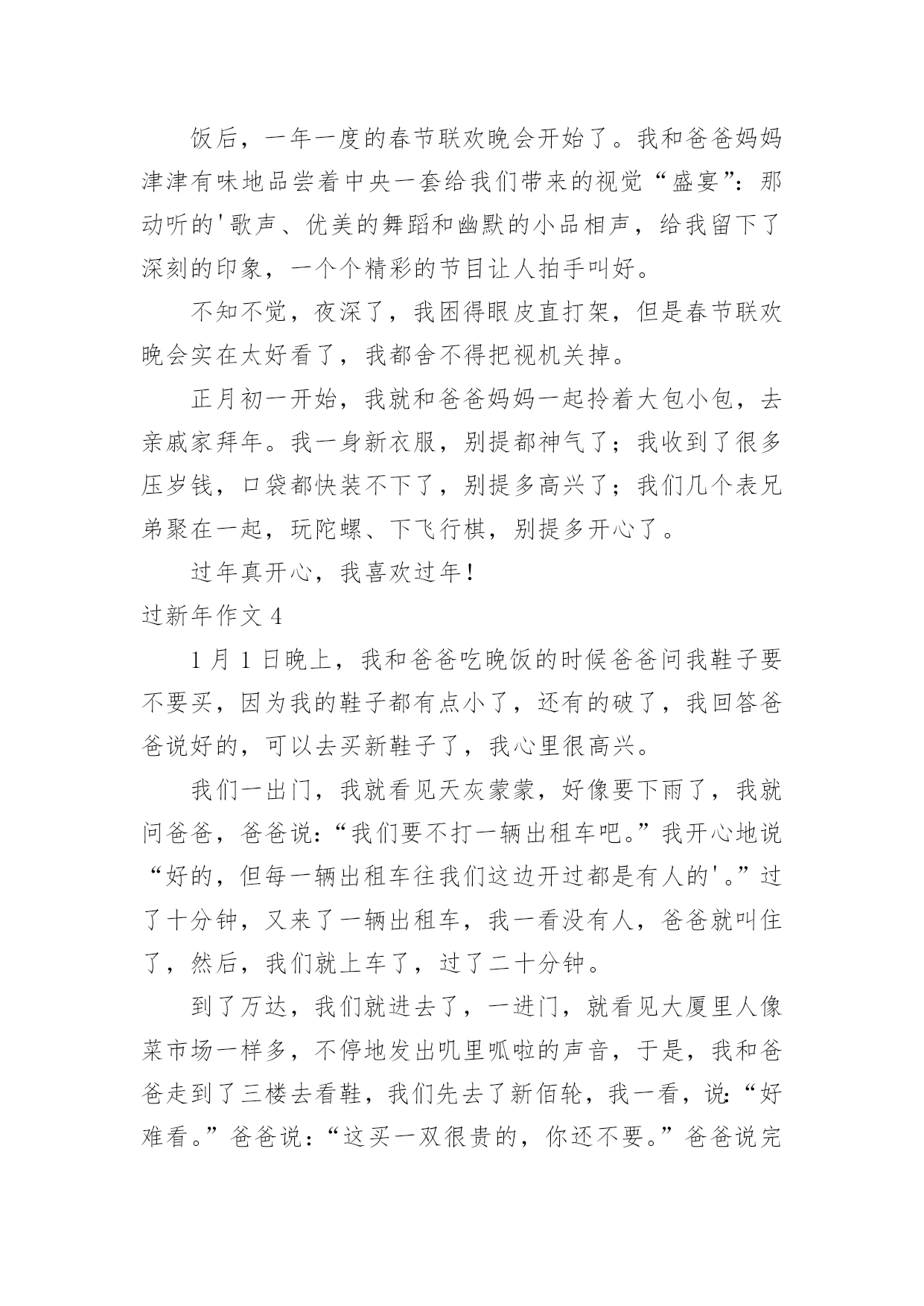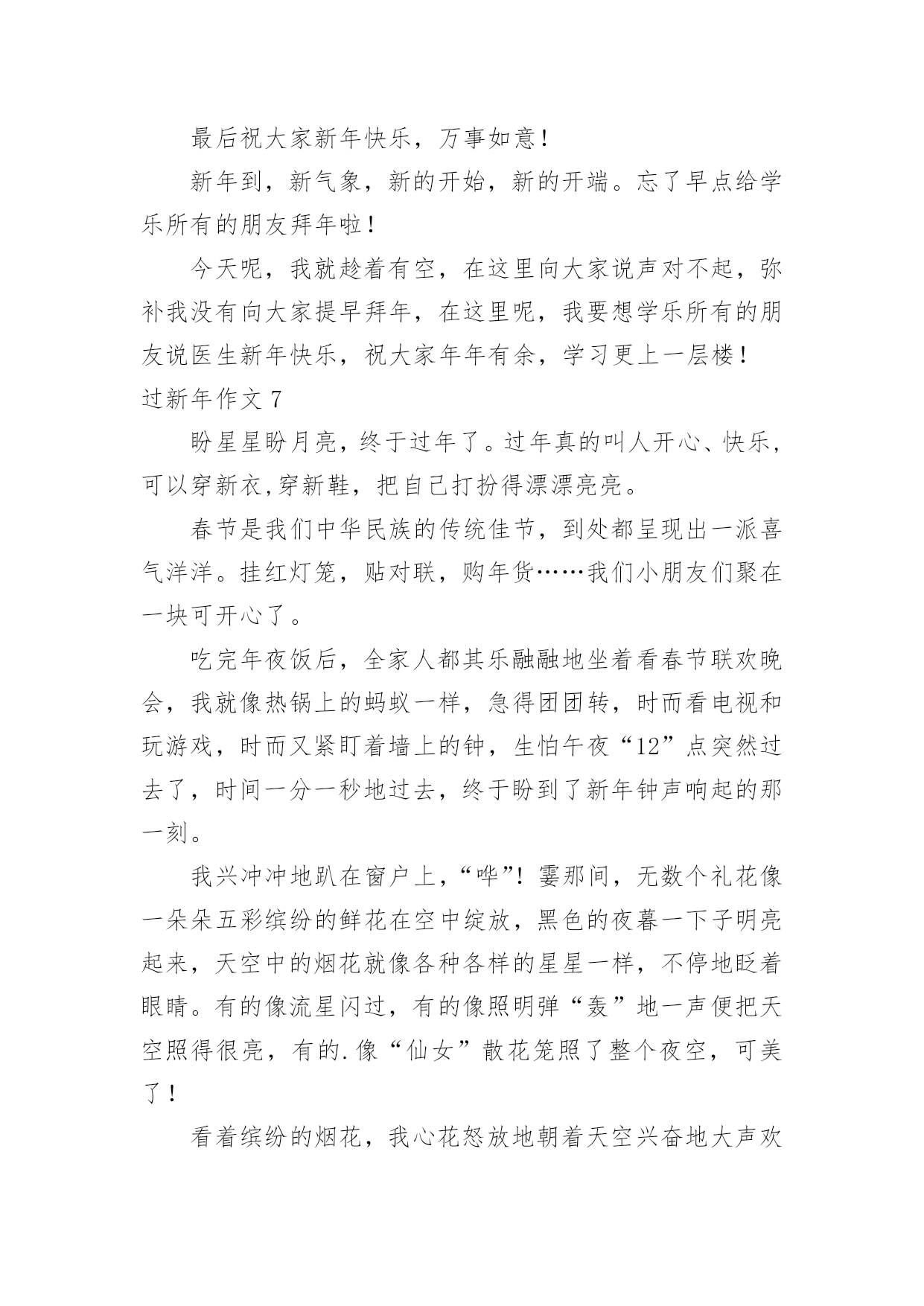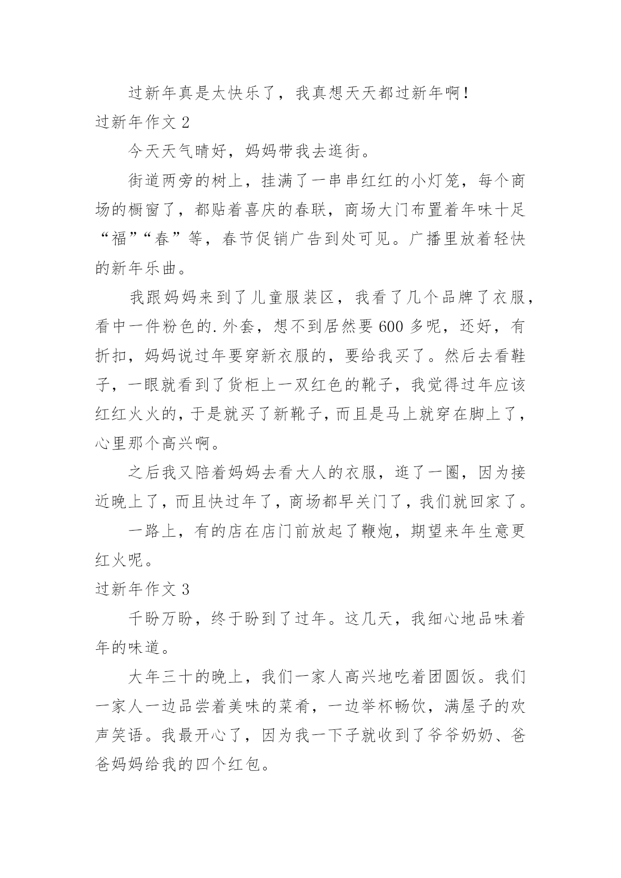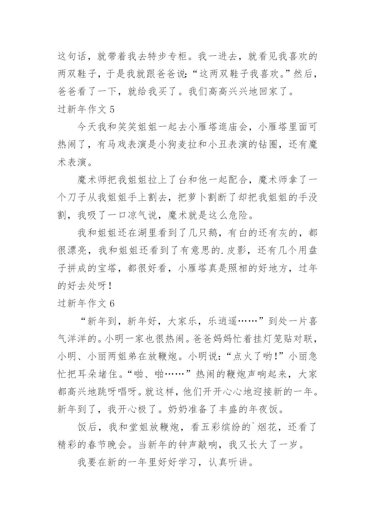 过新年作文 过新年作文(荐)在日常学习、工作或生活中,大家总少不了接触作文吧,作文是通过文字来表达一个主题意义的记叙方法。如何写一篇有思想、有文采的作文呢?以下是小编为大家整理的过新年作文,欢迎阅读与收藏。过新年作文1“新年到,新年到,穿新衣,戴新帽。舞龙灯,踩高跷,大家一起乐淘淘。”不知不觉,我们又迎来了期盼已久的春节,到了这一天,全国上下举国欢腾。道路上车水马龙,大街小巷都热热闹闹的,到处都是张灯结彩,灯火通明,人们都喜气洋洋。还有的在走街串巷,早在春节前的几天,家里的人都忙活开了,买年货,买水果、糖果,贴对联儿,打扫房间,……到了除夕的.晚上,全家人吃着香喷喷的饺子,看着精彩的联欢晚会。这时,一些常年在外的亲戚也回来了。他们都给我带来了礼物,有的是衣服,有的是玩具,还有的是学习用具。我收到礼物真是开心极了!大年初一早上,我穿着新衣服去拜年,刚走进亲戚家,我就十分乖巧地开始问好。每次我都能从长辈那里获得一个大大的红包,我高兴极了!因为又能用这些钱来买我喜欢的书、文具、玩具了。过新年真是太快乐了,我真想天天都过新年啊!过新年作文2今天天气晴好,妈妈带我去逛街。街道两旁的树上,挂满了一串串红红的小灯笼,每个商场的橱窗了,都贴着喜庆的春联,商场大门布置着年味十足“福”“春”等,春节促销广告到处可见。广播里放着轻快的新年乐曲。我跟妈妈来到了儿童服装区,我看了几个品牌了衣服,看中一件粉色的.外套,想不到居然要600多呢,还好,有折扣,妈妈说过年要穿新衣服的,要给我买了。然后去看鞋子,一眼就看到了货柜上一双红色的靴子,我觉得过年应该红红火火的,于是就买了新靴子,而且是马上就穿在脚上了,心里那个高兴啊。之后我又陪着妈妈去看大人的衣服,逛了一圈,因为接近晚上了,而且快过年了,商场都早关门了,我们就回家了。一路上,有的店在店门前放起了鞭炮,期望来年生意更红火呢。过新年作文3千盼万盼,终于盼到了过年。这几天,我细心地品味着年的味道。大年三十的晚上,我们一家人高兴地吃着团圆饭。我们一家人一边品尝着美味的菜肴,一边举杯畅饮,满屋子的欢声笑语。我最开心了,因为我一下子就收到了爷爷奶奶、爸爸妈妈给我的四个红包。饭后,一年一度的春节联欢晚会开始了。我和爸爸妈妈津津有味地品尝着中央一套给我们带来的视觉“盛宴”:那动听的'歌声、优美的舞蹈和幽默的小品相声,给我留下了深刻的印象,一个个精彩的节目让人拍手叫好。不知不觉,夜深了,我困得眼皮直打架,但是春节联欢晚会实在太好看了,我都舍不得把视机关掉。正月初一开始,我就和爸爸妈妈一起拎着大包小包,去亲戚家拜年。我一身新衣服,别提都神气了;我收到了很多压岁钱,口袋都快装不下了,别提多高兴了;我们几个表兄弟聚在一起,玩陀螺、下飞行棋,别提多开心了。过年真开心,我喜欢过年!过新年作文41月1日晚上,我和爸爸吃晚饭的时候爸爸问我鞋子要不要买,因为我的鞋子都有点小了,还有的破了,我回答爸爸说好的,可以去买新鞋子了,我心里很高兴。我们一出门,我就看见天灰蒙蒙,好像要下雨了,我就问爸爸,爸爸说:“我们要不打一辆出租车吧。”我开心地说“好的,但每一辆出租车往我们这边开过都是有人的'。”过了十分钟,又来了一辆出租车,我一看没有人,爸爸就叫住了,然后,我们就上车了,过了二十分钟。到了万达,我们就进去了,一进门,就看见大厦里人像菜市场一样多,不停地发出叽里呱啦的声音,于是,我和爸爸走到了三楼去看鞋,我们先去了新佰轮,我一看,说:“好难看。”爸爸说:“这买一双很贵的,你还不要。”爸爸说完这句话,就带着我去特步专柜。我一进去,就看见我喜欢的两双鞋子,于是我就跟爸爸说:“这两双鞋子我喜欢。”然后,爸爸看了一下,就给我买了。我们高高兴兴地回家了。过新年作文5今天我和笑笑姐姐一起去小雁塔逛庙会,小雁塔里面可热闹了,有马戏表演是小狗麦拉和小丑表演的钻圈,还有魔术表演。魔术师把我姐姐拉上了台和他一起配合,魔术师拿了一个刀子从我姐姐手上割去,把萝卜割断了却把我姐姐的手没割,我吸了一口凉气说,魔术就是这么危险。我和姐姐还在湖里看到了几只鹅,有白的还有灰的,都很漂亮,我和姐姐还看到了有意思的.皮影,还有几个用盘子拼成的宝塔,都很好看,小雁塔真是照相的好地方,过年的好去处呀!过新年作文6“新年到,新年好,大家乐,乐逍遥……”到处一片喜气洋洋的。小明一家也很热闹。爸爸妈妈忙着挂灯笼贴对联,小明、小丽两姐弟在放鞭炮。小明说:“点火了哟!”小丽急忙把耳朵堵住。“啪、啪……”热闹的鞭炮声响起来,大家都高兴地跳呀唱呀。就这样,他们开开心心地迎接新的一年。新年到了,我开心极了。奶奶准备了丰盛的年夜饭。饭后,我和堂姐放鞭炮,看五彩缤纷的`烟花,还看了精彩的春节晚会。当新年的钟声敲响,我又长大了一岁。我要在新的一年里好好学习,认真听讲。最后祝大家新年快乐,万事如意!新年到