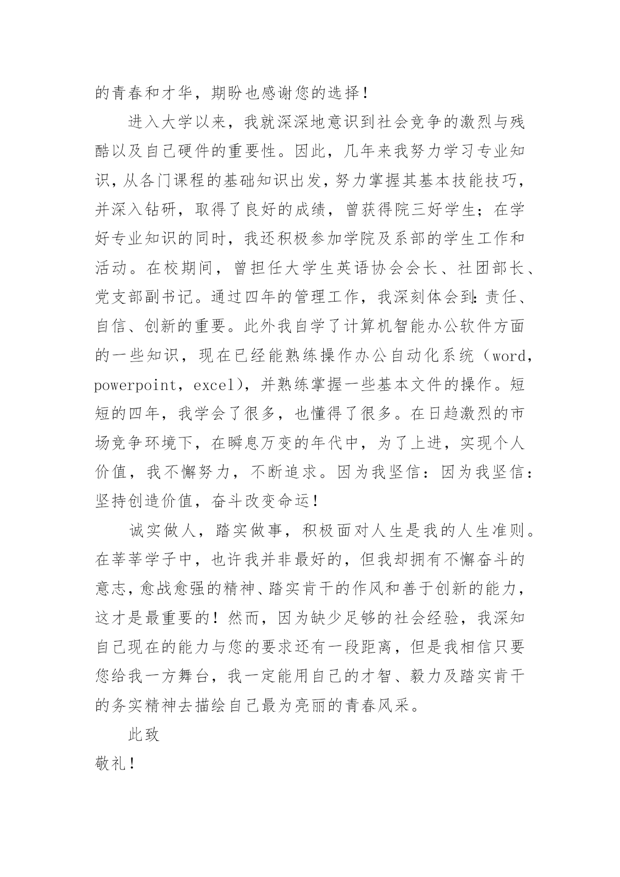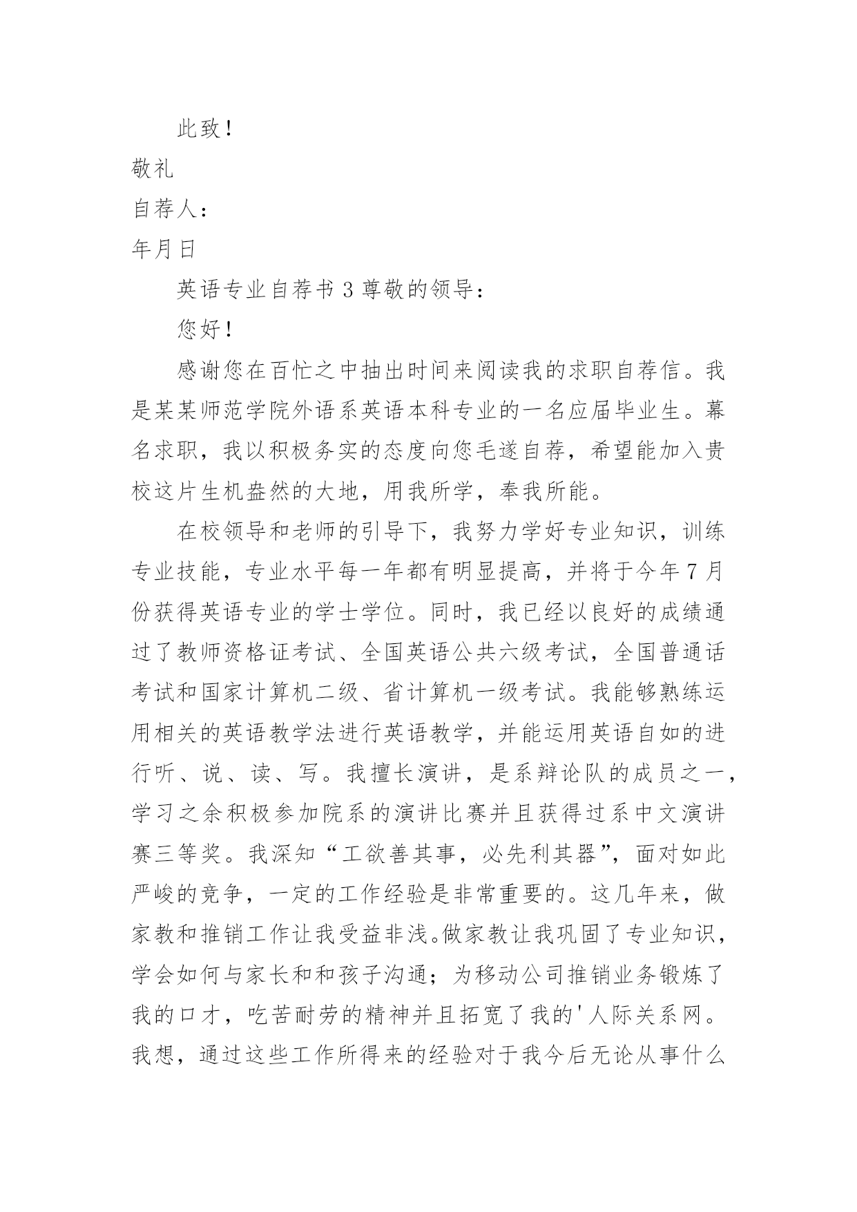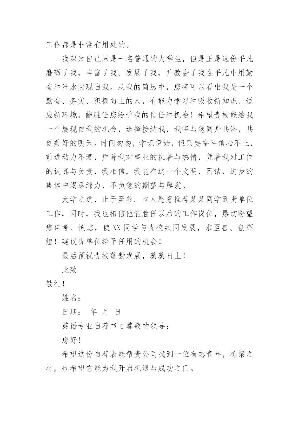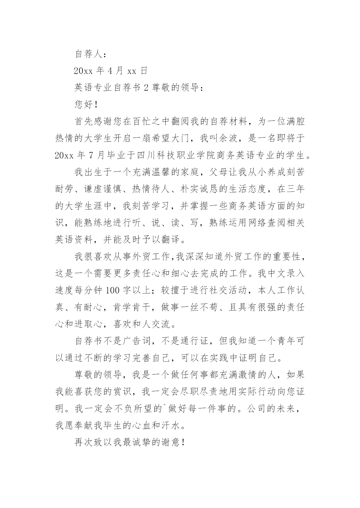 英语专业自荐书 英语专业自荐书(通用10篇)在充满活力,日益开放的今天,越来越多地方需要用到自荐书,自荐书是自我推销采用的一种形式。你知道自荐书怎样写才规范吗?下面是小编为大家整理的英语专业自荐书(通用10篇),欢迎阅读,希望大家能够喜欢。英语专业自荐书1尊敬的领导:您好!我是xxxx外语系的一名20xx届毕业生,主修英语专业。在即将叩响社会这扇大门时,我怀着无比的真诚和高度责任感把我的人生向您靠拢。看了贵公司的招聘信息后,我想应聘贵公司的外贸业务员。我来自一个农村家庭,求学路上我接受了"磨砺"与"苦寒"的考验,学习上取得了优异的成绩,大学初步给了我能力的锻炼的机会,但我的宝剑还没有亮出它的"锋"、梅花还没有飘出它的"香"。我相信"锋"、"香"能在我的职业生涯中得到扬洒。我想物色一个有较强工作能力和组织能力并会做人的优秀部下,是您的愿望。而谋求一个充分发挥自己专业特长的工作岗位,并能得到您的关照,是我的期盼。得力的'助手,有助于您工作顺心。合适的工作岗位,有助于我施展才华!或许我们会为一个共同的目标而站在一起,那就是:将贵公司的辉煌写得更加缤纷!愿为贵公司服务,并奉献自己的青春和才华,期盼也感谢您的选择!进入大学以来,我就深深地意识到社会竞争的激烈与残酷以及自己硬件的重要性。因此,几年来我努力学习专业知识,从各门课程的基础知识出发,努力掌握其基本技能技巧,并深入钻研,取得了良好的成绩,曾获得院三好学生;在学好专业知识的同时,我还积极参加学院及系部的学生工作和活动。在校期间,曾担任大学生英语协会会长、社团部长、党支部副书记。通过四年的管理工作,我深刻体会到:责任、自信、创新的重要。此外我自学了计算机智能办公软件方面的一些知识,现在已经能熟练操作办公自动化系统(word,powerpoint,excel),并熟练掌握一些基本文件的操作。短短的四年,我学会了很多,也懂得了很多。在日趋激烈的市场竞争环境下,在瞬息万变的年代中,为了上进,实现个人价值,我不懈努力,不断追求。因为我坚信:因为我坚信:坚持创造价值,奋斗改变命运!诚实做人,踏实做事,积极面对人生是我的人生准则。在莘莘学子中,也许我并非最好的,但我却拥有不懈奋斗的意志,愈战愈强的精神、踏实肯干的作风和善于创新的能力,这才是最重要的!然而,因为缺少足够的社会经验,我深知自己现在的能力与您的要求还有一段距离,但是我相信只要您给我一方舞台,我一定能用自己的才智、毅力及踏实肯干的务实精神去描绘自己最为亮丽的青春风采。此致敬礼!自荐人:20xx年4月xx日英语专业自荐书2尊敬的领导:您好!首先感谢您在百忙之中翻阅我的自荐材料,为一位满腔热情的大学生开启一扇希望大门,我叫余波,是一名即将于20xx年7月毕业于四川科技职业学院商务英语专业的学生。我出生于一个充满温馨的家庭,父母让我从小养成刻苦耐劳、谦虚谨慎、热情待人、朴实诚恳的生活态度,在三年的大学生涯中,我刻苦学习,并掌握一些商务英语方面的知识,能熟练地进行听、说、读、写,熟练运用网络查阅相关英语资料,并能及时予以翻译。我很喜欢从事外贸工作,我深深知道外贸工作的重要性,这是一个需要更多责任心和细心去完成的工作。我中文录入速度每分钟100字以上;较擅于进行社交活动,本人工作认真、有耐心,肯学肯干,做事一丝不苟、且具有很强的责任心和进取心,喜欢和人交流。自荐书不是广告词,不是通行证,但我知道一个青年可以通过不断的学习完善自己,可以在实践中证明自己。尊敬的领导,我是一个做任何事都充满激情的人,如果我能喜获您的赏识,我一定会尽职尽责地用实际行动向您证明。我一定会不负所望的`做好每一件事的。公司的未来,我愿奉献我毕生的心血和汗水。再次致以我最诚挚的谢意!此致!敬礼自荐人:年月日英语专业自荐书3尊敬的领导:您好!感谢您在百忙之中抽出时间来阅读我的求职自荐信。我是某某师范学院外语系英语本科专业的一名应届毕业生。幕名求职,我以积极务实的态度向您毛遂自荐,希望能加入贵校这片生机盎然的大地,用我所学,奉我所能。在校领导和老师的引导下,我努力学好专业知识,训练专业技能,专业水平每一年都有明显提高,并将于今年7月份获得英语专业的学士学位。同时,我已经以良好的成绩通过了教师资格证考试、全国英语公共六级考试,全国普通话考试和国家计算机二级、省计算机一级考试。我能够熟练运用相关的英语教学法进行英语教学,并能运用英语自如的进行听、说、读、写。我擅长演讲,是系辩论队的成员之一,学习之余积极参加院系的演讲比赛并且获得过系中文演讲赛三等奖。我深知“工欲善其事,必先利其器”,面对如此严峻的竞争,一定的工作经验是非常重要的。这几年来,做家教和推销工作让我受益非浅。做家教让我巩固了专业知识,学会如何与家长和和孩子沟通;为移动公司推销业务锻炼了我的口才,吃苦耐劳的精神并且拓宽了我的