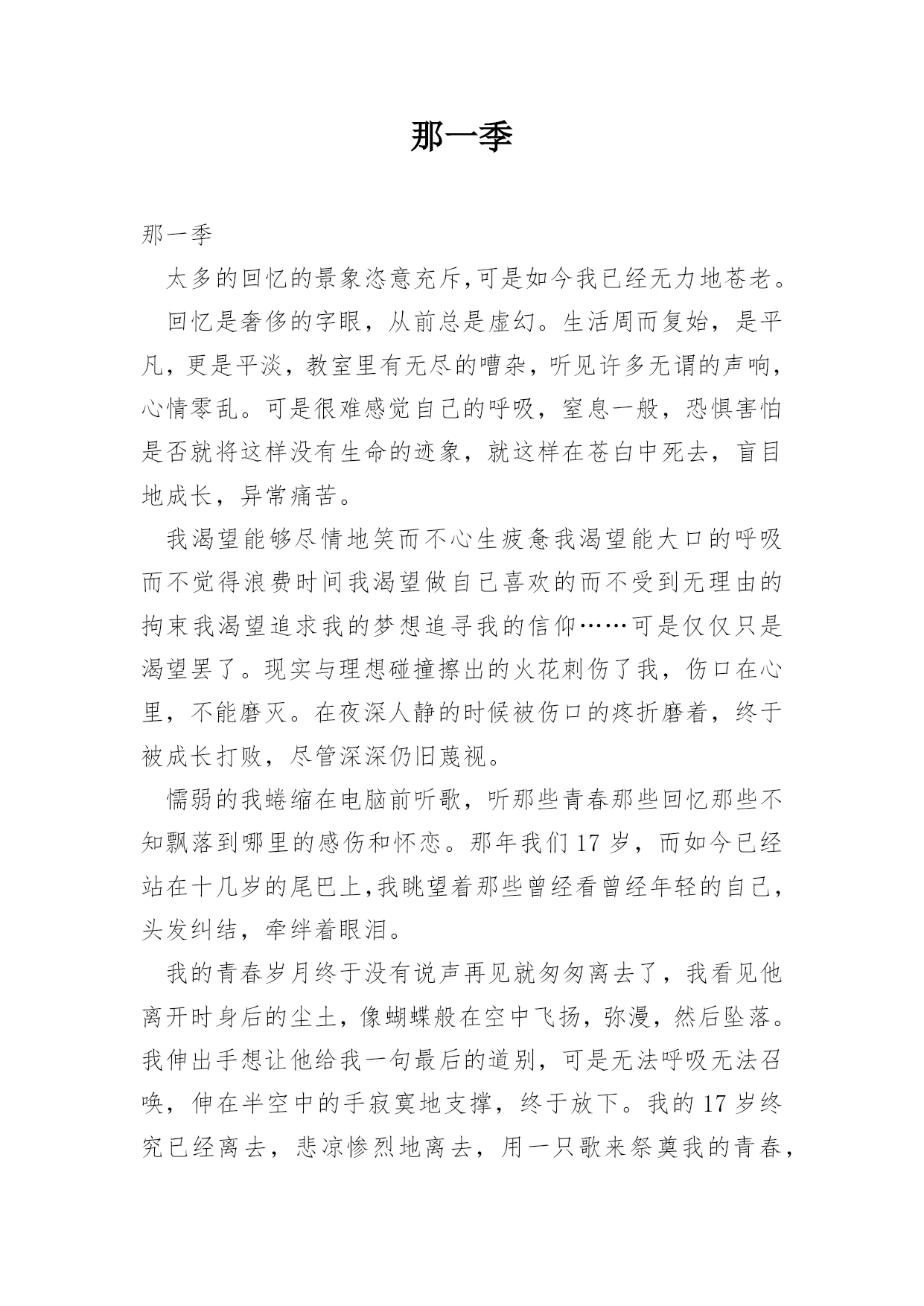 那一季 那一季太多的回忆的景象恣意充斥,可是如今我已经无力地苍老。回忆是奢侈的字眼,从前总是虚幻。生活周而复始,是平凡,更是平淡,教室里有无尽的嘈杂,听见许多无谓的声响,心情零乱。可是很难感觉自己的呼吸,窒息一般,恐惧害怕是否就将这样没有生命的迹象,就这样在苍白中死去,盲目地成长,异常痛苦。我渴望能够尽情地笑而不心生疲惫我渴望能大口的呼吸而不觉得浪费时间我渴望做自己喜欢的而不受到无理由的拘束我渴望追求我的梦想追寻我的信仰……可是仅仅只是渴望罢了。现实与理想碰撞擦出的火花刺伤了我,伤口在心里,不能磨灭。在夜深人静的时候被伤口的疼折磨着,终于被成长打败,尽管深深仍旧蔑视。懦弱的我蜷缩在电脑前听歌,听那些青春那些回忆那些不知飘落到哪里的感伤和怀恋。那年我们17岁,而如今已经站在十几岁的尾巴上,我眺望着那些曾经看曾经年轻的自己,头发纠结,牵绊着眼泪。我的青春岁月终于没有说声再见就匆匆离去了,我看见他离开时身后的尘土,像蝴蝶般在空中飞扬,弥漫,然后坠落。我伸出手想让他给我一句最后的道别,可是无法呼吸无法召唤,伸在半空中的手寂寞地支撑,终于放下。我的17岁终究已经离去,悲凉惨烈地离去,用一只歌来祭奠我的青春,虽然苍白,却也无奈。只要在多年以后,当我们看见夏天的美丽线条,仍能记得,那年我们17岁……是不是,这些就是完美的记忆,是否拥有曾经的片段,也就足够了?只是,只是过去了的真的不能重来,所以即使还不够,也不能做些什么了吧!