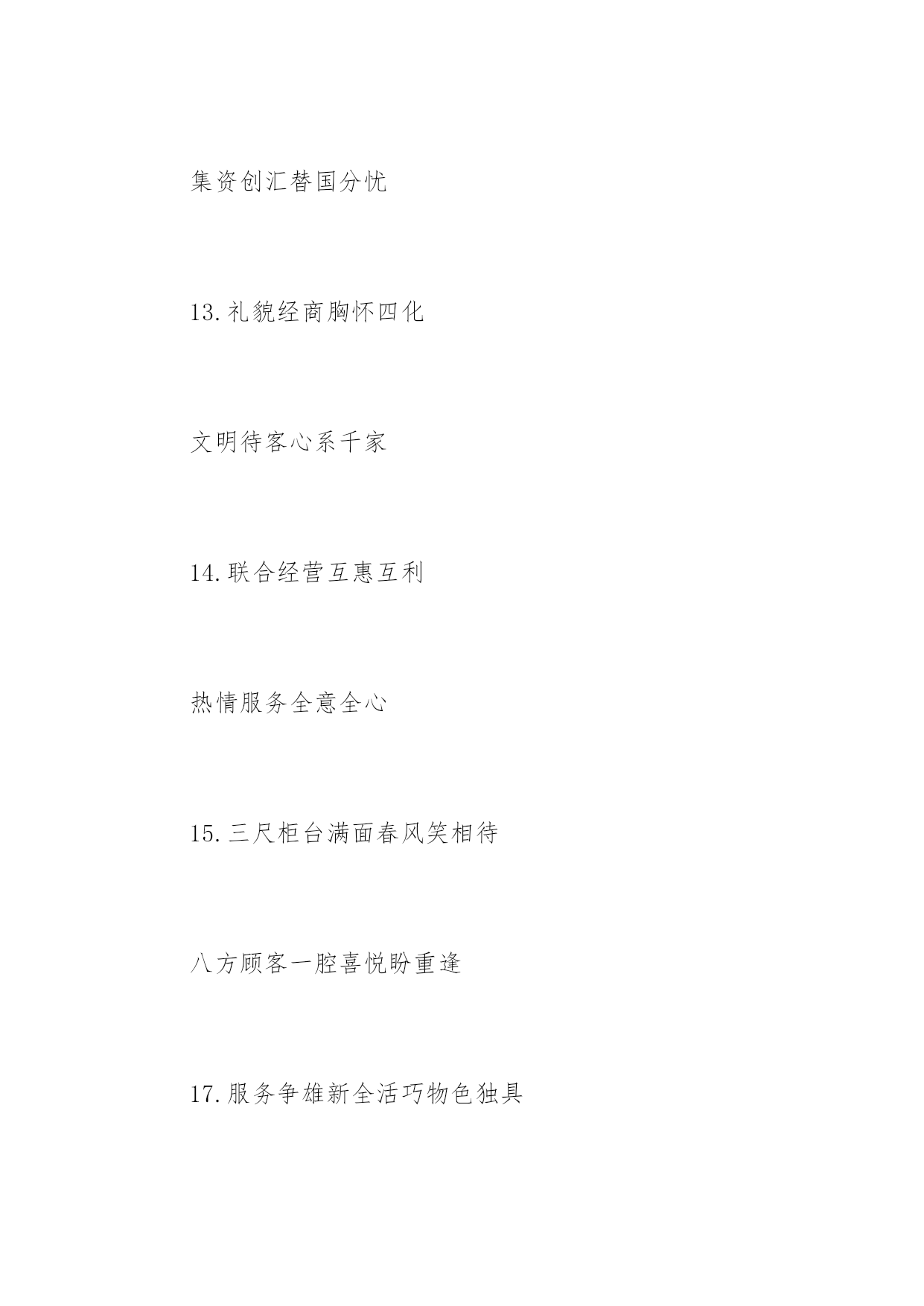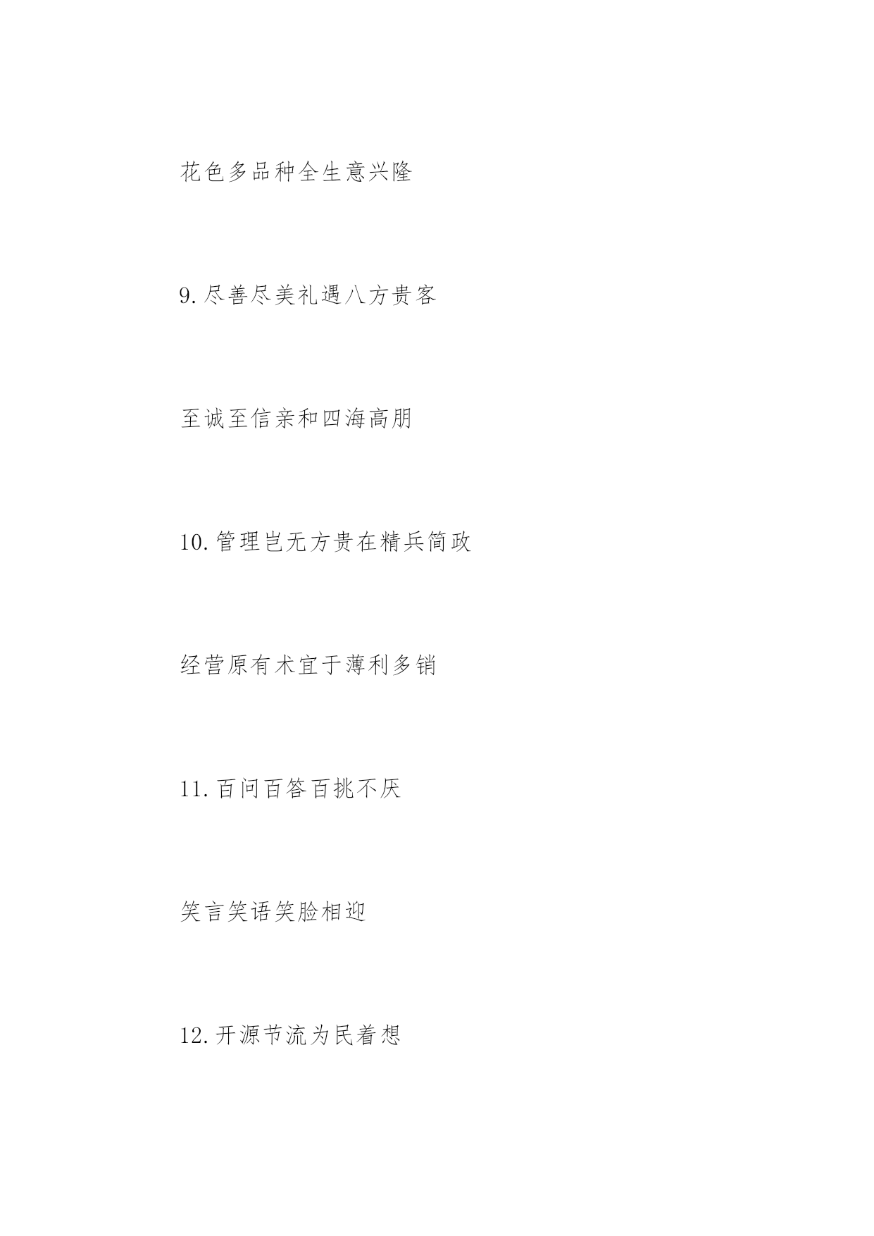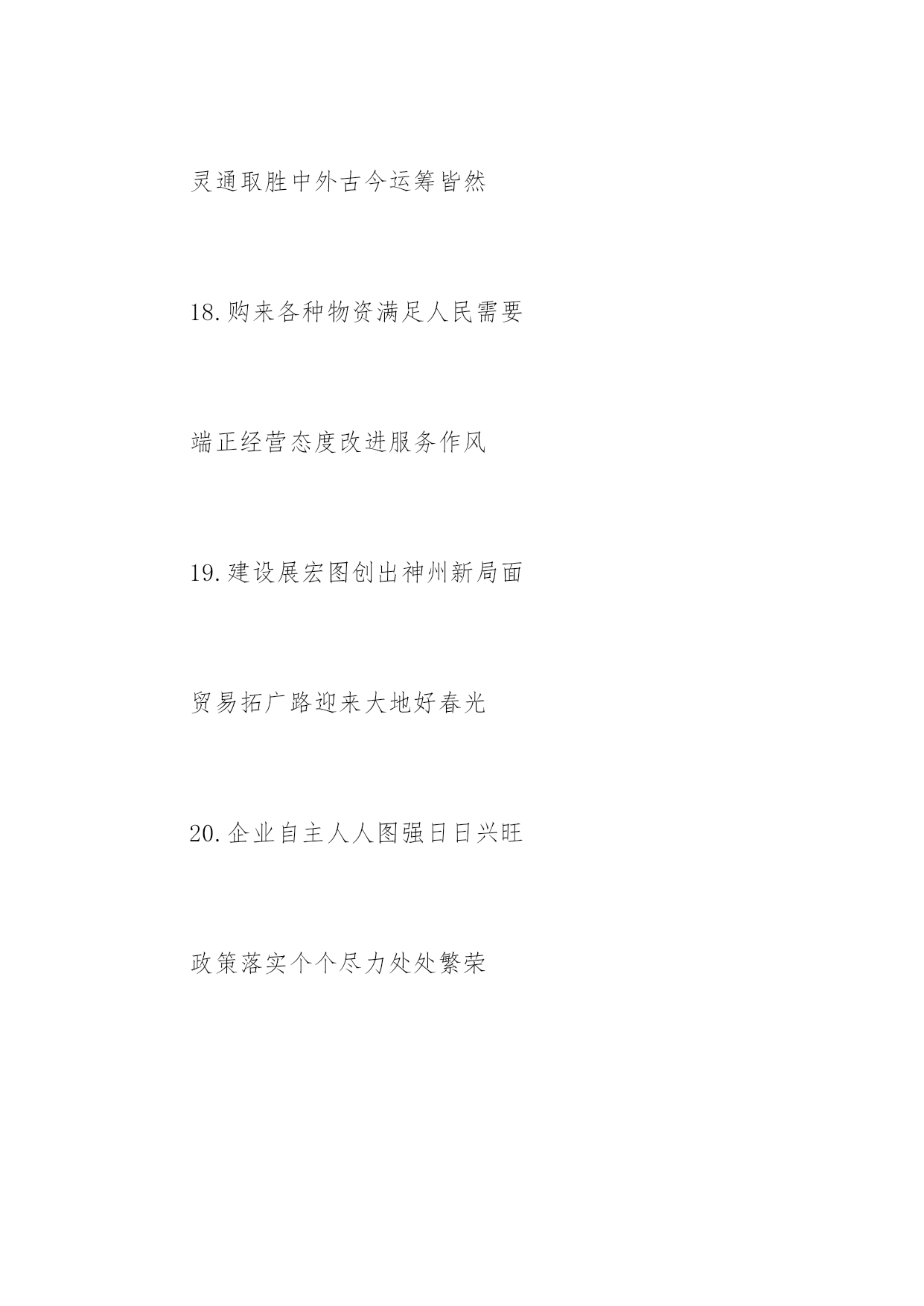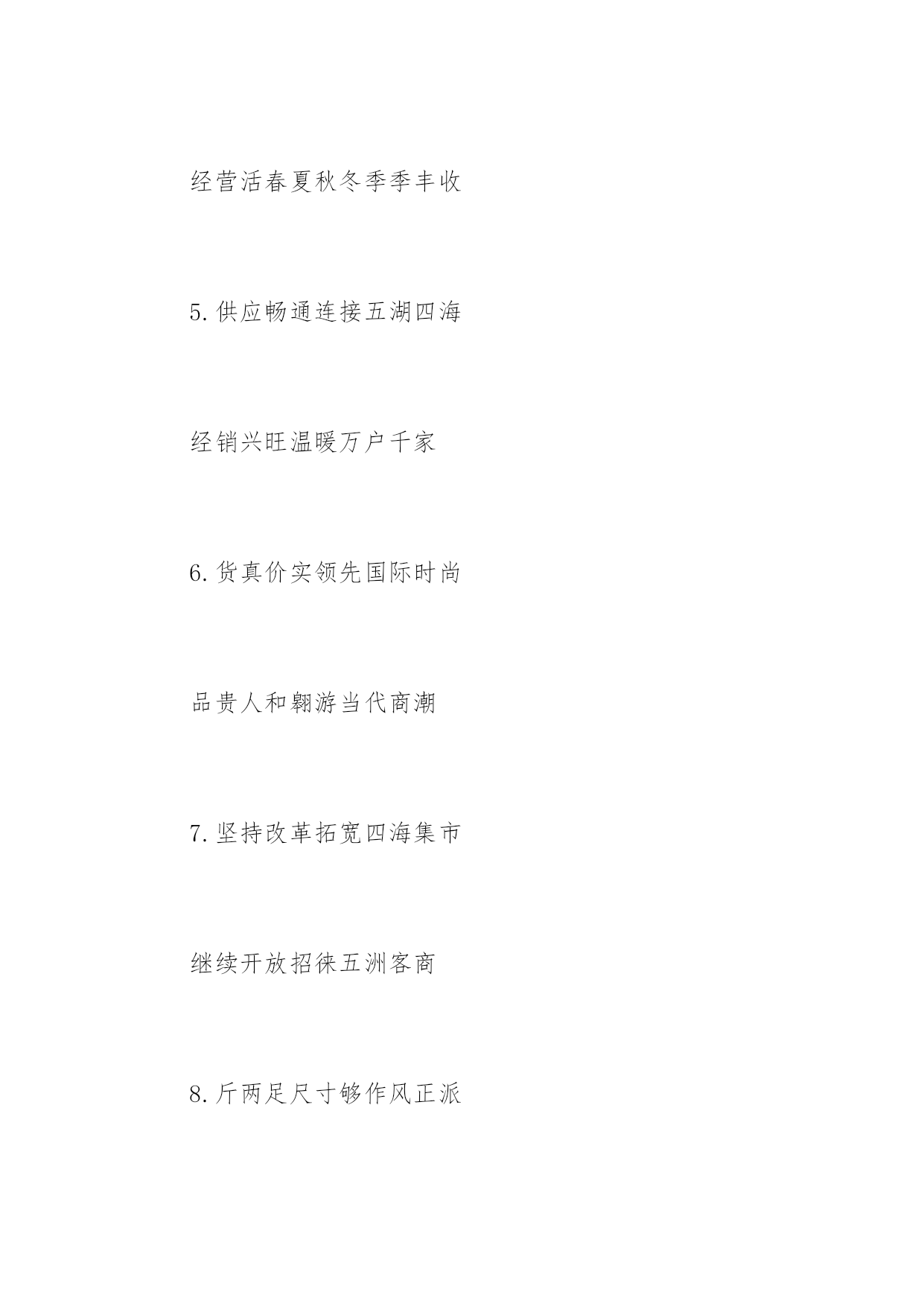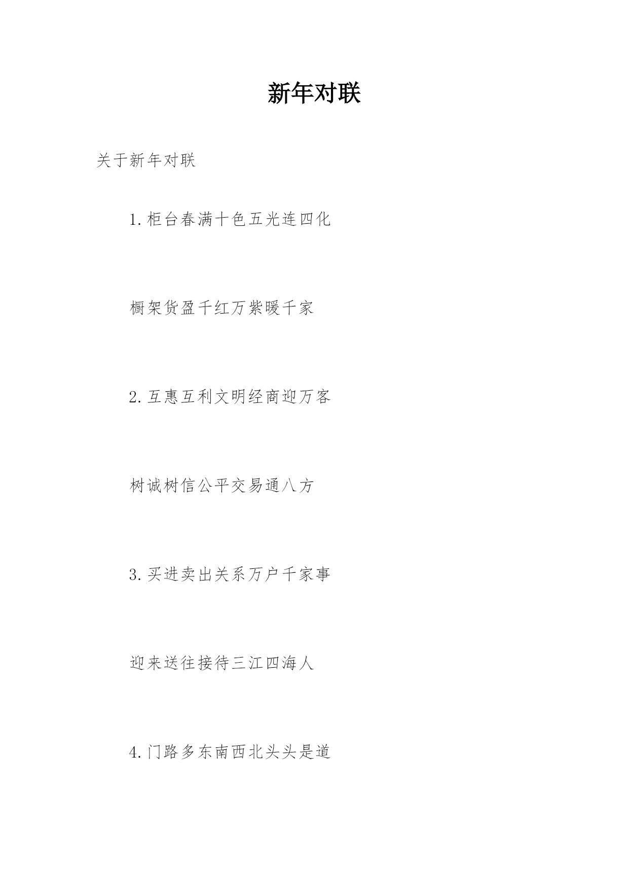 新年对联 关于新年对联1.柜台春满十色五光连四化橱架货盈千红万紫暖千家2.互惠互利文明经商迎万客树诚树信公平交易通八方3.买进卖出关系万户千家事迎来送往接待三江四海人4.门路多东南西北头头是道经营活春夏秋冬季季丰收5.供应畅通连接五湖四海经销兴旺温暖万户千家6.货真价实领先国际时尚品贵人和翱游当代商潮7.坚持改革拓宽四海集市继续开放招徕五洲客商8.斤两足尺寸够作风正派花色多品种全生意兴隆9.尽善尽美礼遇八方贵客至诚至信亲和四海高朋10.管理岂无方贵在精兵简政经营原有术宜于薄利多销11.百问百答百挑不厌笑言笑语笑脸相迎12.开源节流为民着想集资创汇替国分忧13.礼貌经商胸怀四化文明待客心系千家14.联合经营互惠互利热情服务全意全心15.三尺柜台满面春风笑相待八方顾客一腔喜悦盼重逢17.服务争雄新全活巧物色独具灵通取胜中外古今运筹皆然18.购来各种物资满足人民需要端正经营态度改进服务作风19.建设展宏图创出神州新局面贸易拓广路迎来大地好春光20.企业自主人人图强日日兴旺政策落实个个尽力处处繁荣