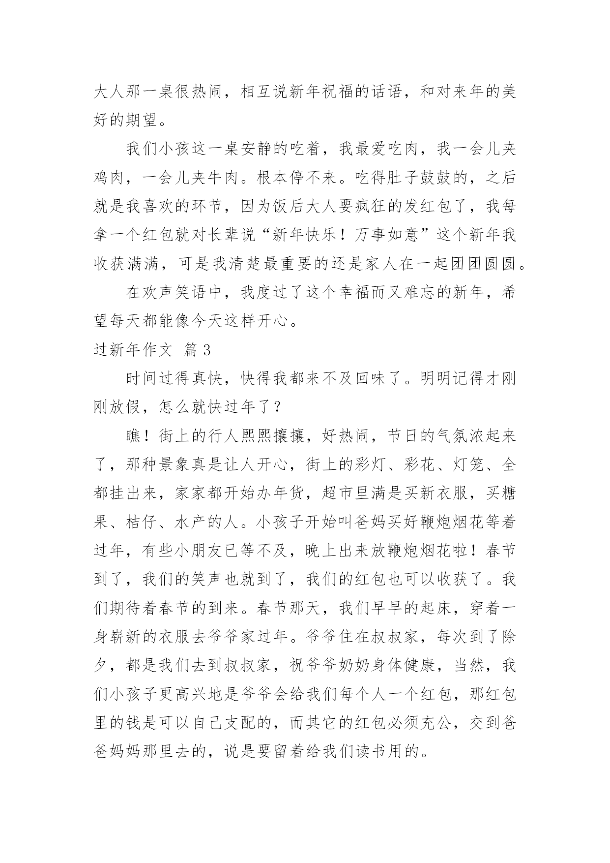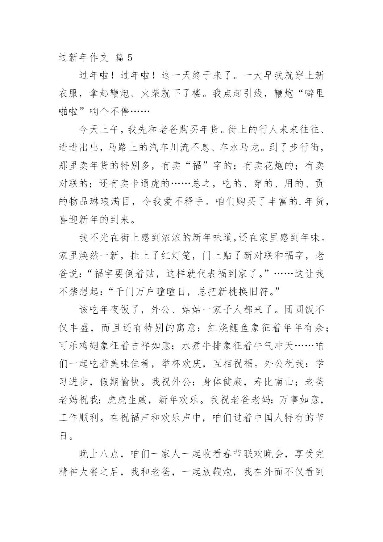 过新年作文 有关过新年作文6篇无论在学习、工作或是生活中,大家都有写作文的经历,对作文很是熟悉吧,写作文可以锻炼我们的独处习惯,让自己的心静下来,思考自己未来的方向。相信写作文是一个让许多人都头痛的问题,以下是小编帮大家整理的过新年作文6篇,仅供参考,大家一起来看看吧。过新年作文篇1春节快到了,大街小巷人流如潮,人们都在兴高采列地购买着各自所需的年货。今天是腊月三十,我早早地起床看见妈妈将新衣服放在我的枕边,心情格外舒爽,吃完早餐,跟爸爸将春联贴好,这时才突然发现上下左右的邻居都已将春联贴好。下午我和爸爸妈妈走出家门,看见男女老少个个脸上都洋溢着欢快的笑容,只见各种商家标语,条幅迎风招展,我和爸爸妈妈进入商场买礼物,我们给爷爷买了两瓶酒,给奶奶买了两袋麦片,给表哥表姐买了两瓶椰子汁。提着礼品,我们就去爷爷奶奶家吃年夜饭,到了爷爷家,好热闹呀!大姑妈,小姑妈,哥哥,姐姐都在爷爷奶奶家聊天。到了六点钟的`时候,爷爷做了一大桌丰盛的年夜饭。我和爸爸一起到楼下放鞭炮,此时震耳欲聋的鞭炮声此起彼伏!大家围坐在一起吃年夜饭,年夜饭可丰富了,有春卷,热气腾腾的粉蒸肉,最后爷爷端上了一盘红烧鱼,它象征着我们的生活年年有余。我和哥哥姐姐们立刻狼吞虎咽地吃起来,我和爸爸妈妈大姑妈小姑妈他们一起向爷爷奶奶敬酒,祝爷爷奶奶万事如意,身体健康。爷爷奶奶拿出压岁钱,分给了我和哥哥姐姐。吃完年夜饭,我和哥哥姐姐在楼底下放花炮,我们拿了三个降落伞出来同时点燃,一声炮响,我们奋力拼抢着,谁也不让谁,蹦着跳着,好热闹啊!每次过春节,我总是十分高兴,春节有红包有鞭炮,更有喜气洋洋的气氛陪伴我,使我快乐。过新年作文篇2我们来到了老家,先在奶奶家住几天就去姥姥家住了。去姥姥家住的原因是今年我姐姐和老妈的本命年,当然要去姥姥家住一住。姥姥家住在乡下,那里风景优美,山清水秀,走进姥姥家的院子,我就看见一群黄色的鸡雏,毛茸茸,胖乎乎,像肚子里装着一个大大的汤圆可爱极了。它们围着姥姥家的那口水井自由自在的走来走去。发像在觅食。穿过院子我直奔厨房,因为我老远就被浓浓的香味级吸引住了,一进厨房就发现姥姥在灶边做菜,已经二个菜做好了,我忍不住想上前去抓一个吃。姥姥看见开心极了一把抱住我说:“宝贝,新年快乐!有没有想姥姥呀?”我甜滋滋的说:“有,姥姥新年快乐!”之后姥姥又忙碌了起来。等最后开饭的时候居然有两大桌的`菜,这些菜色香味俱全,让人看了不禁食指大动,大人一桌,小孩一桌,开吃了,大人喝酒,小孩喝饮料。大人那一桌很热闹,相互说新年祝福的话语,和对来年的美好的期望。我们小孩这一桌安静的吃着,我最爱吃肉,我一会儿夹鸡肉,一会儿夹牛肉。根本停不来。吃得肚子鼓鼓的,之后就是我喜欢的环节,因为饭后大人要疯狂的发红包了,我每拿一个红包就对长辈说“新年快乐!万事如意”这个新年我收获满满,可是我清楚最重要的还是家人在一起团团圆圆。在欢声笑语中,我度过了这个幸福而又难忘的新年,希望每天都能像今天这样开心。过新年作文篇3时间过得真快,快得我都来不及回味了。明明记得才刚刚放假,怎么就快过年了?瞧!街上的行人熙熙攘攘,好热闹,节日的气氛浓起来了,那种景象真是让人开心,街上的彩灯、彩花、灯笼、全都挂出来,家家都开始办年货,超市里满是买新衣服,买糖果、桔仔、水产的人。小孩子开始叫爸妈买好鞭炮烟花等着过年,有些小朋友已等不及,晚上出来放鞭炮烟花啦!春节到了,我们的笑声也就到了,我们的红包也可以收获了。我们期待着春节的到来。春节那天,我们早早的起床,穿着一身崭新的衣服去爷爷家过年。爷爷住在叔叔家,每次到了除夕,都是我们去到叔叔家,祝爷爷奶奶身体健康,当然,我们小孩子更高兴地是爷爷会给我们每个人一个红包,那红包里的钱是可以自己支配的,而其它的红包必须充公,交到爸爸妈妈那里去的,说是要留着给我们读书用的。过新年可是真好呀!但时间过得很快,再过几天我就要开学了,我也在新的一年里拟定了我的.新学期打算。快要步入高年级的我,为了保持良好的成绩我必须付出更多的努力才行。过新年作文篇4嘭嘭嘭……啪啪啪……此起彼伏的鞭炮声,敲响了新年的钟声。我一觉醒来,就看见爸爸拉着妈妈的手到了门外。我很好奇,马上爬起来,轻轻地走到门口,偷偷的在门缝听。爸爸对妈妈说:“你看贴歪没有,对不对称……”哇!原来爸爸是在贴春联呀!一大早,妈妈、二伯娘、三伯娘在厨房里走来走去,一会儿煮鱼,一会儿饨鸡,一会儿炒虾,忙过不停。中午时分,一桌香喷喷的菜做好了,桌上有鲜味的鱼汤,红红的虾子,细细的土豆丝,绿绿的青菜……真香啊!大伯、二伯、三伯、爸爸…都坐在一张大桌子旁边,还有在外面辛苦工作了一年的大哥哥、大姐姐们坐几十个小时的车也围座在了这张大桌子边吃团圆饭。在吃饭的`时候,大家互相送祝福,道平安,还送了红包。亳不疑问,当然数我的红包最多了。吃完饭后,爸爸说