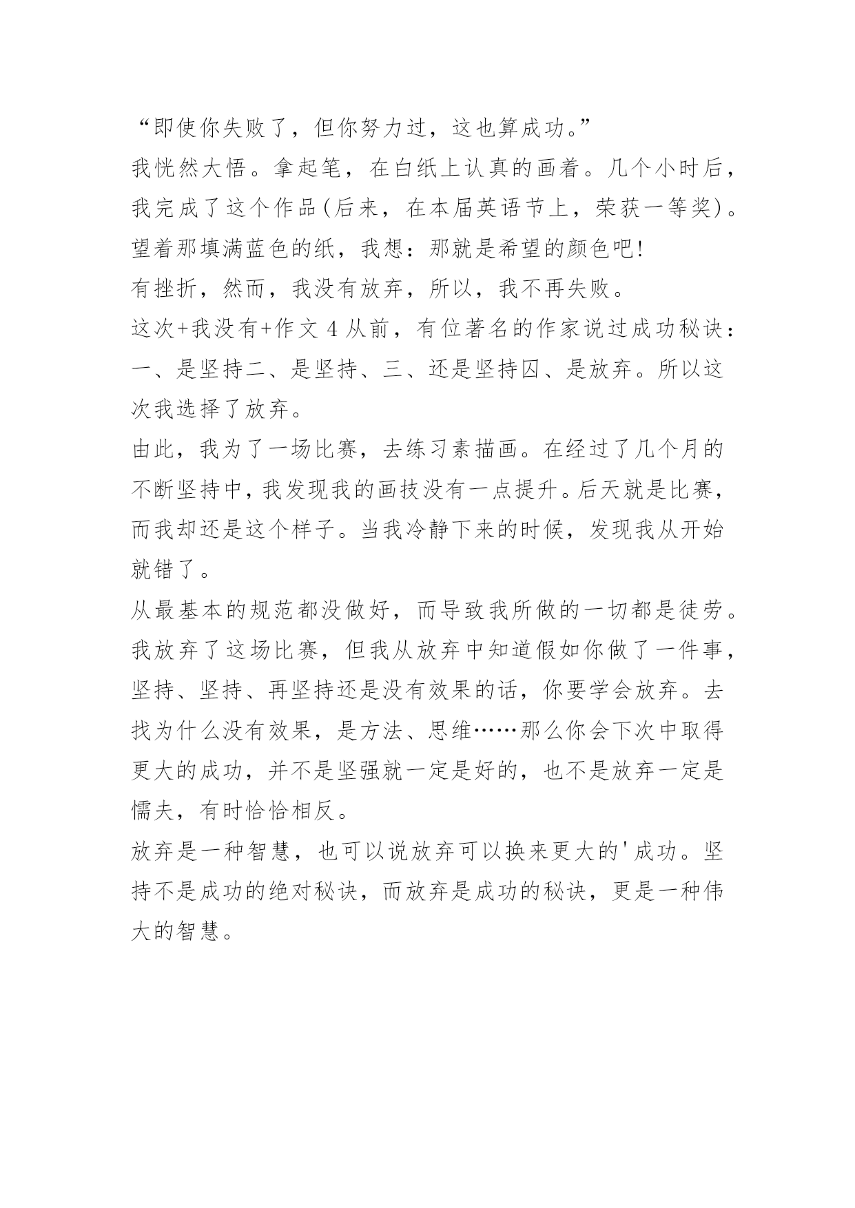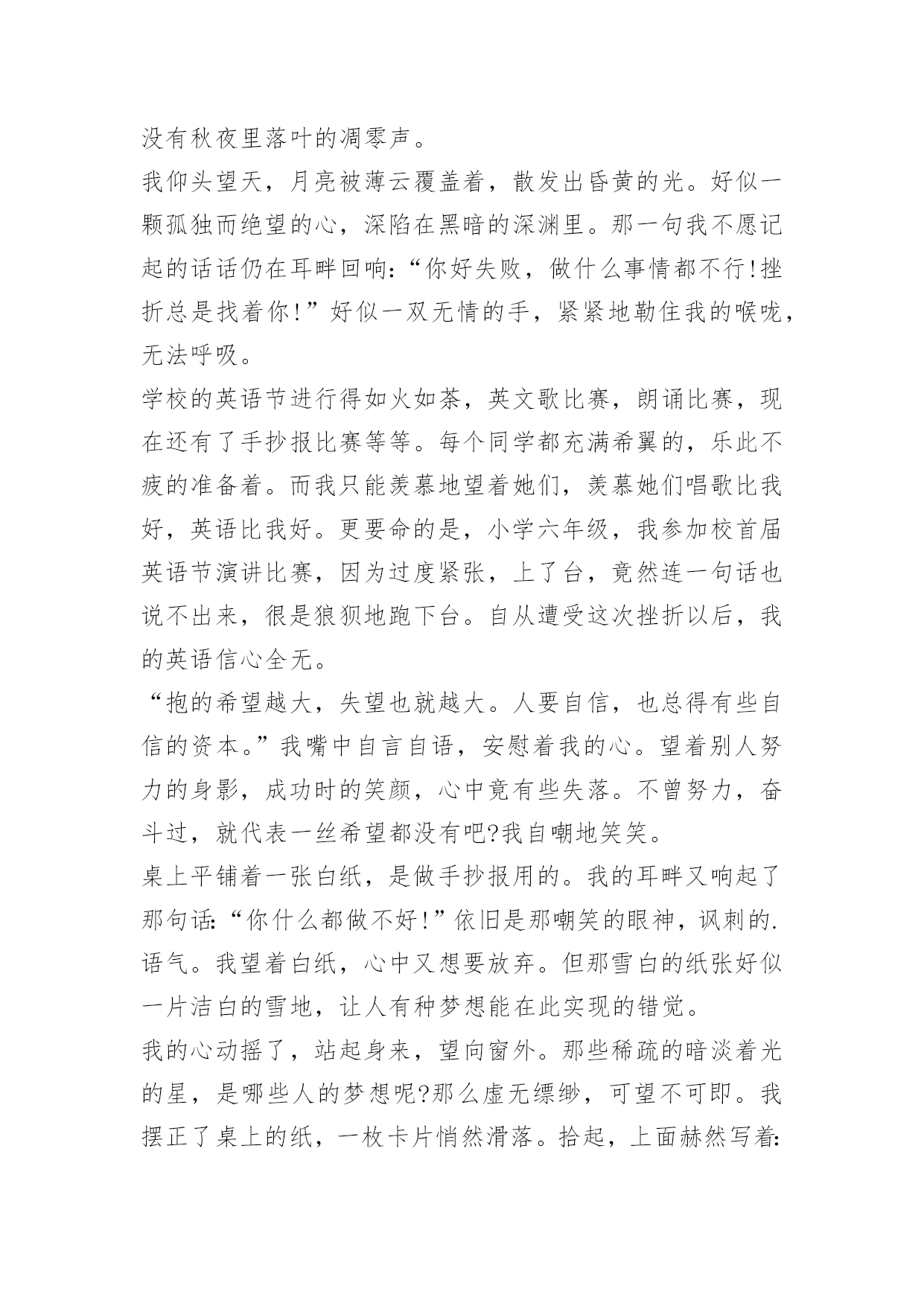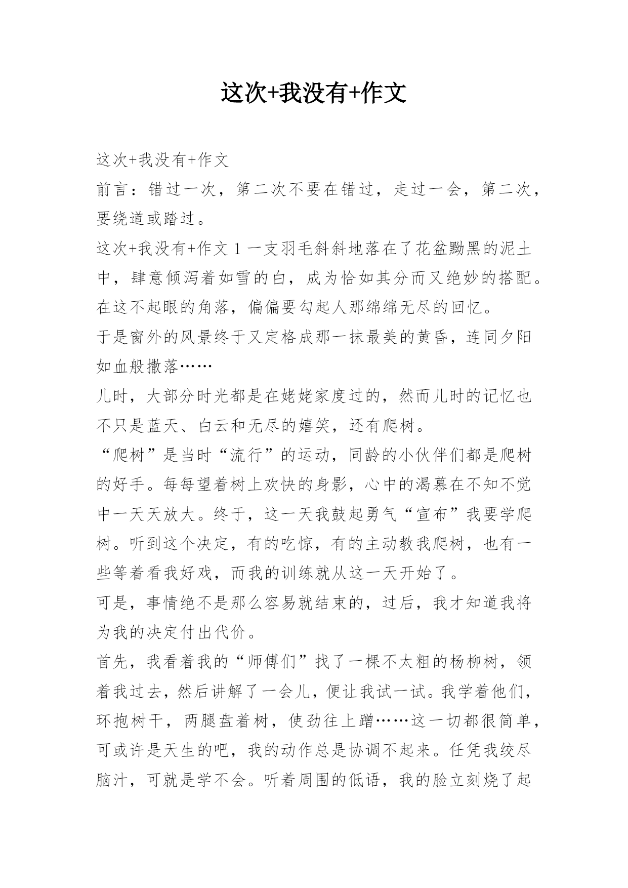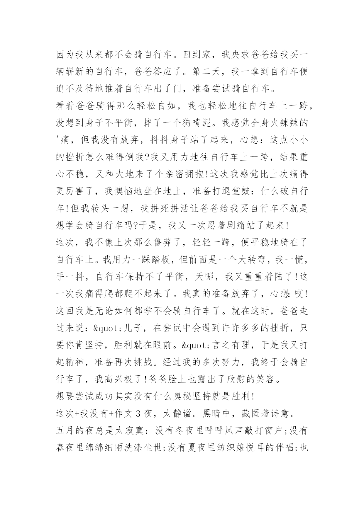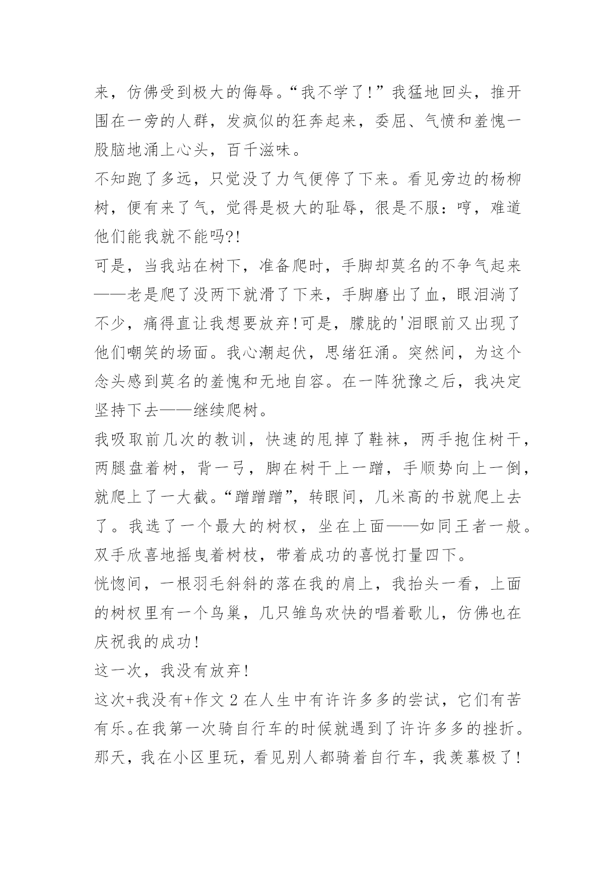 这次+我没有+作文 这次+我没有+作文前言:错过一次,第二次不要在错过,走过一会,第二次,要绕道或踏过。这次+我没有+作文1一支羽毛斜斜地落在了花盆黝黑的泥土中,肆意倾泻着如雪的白,成为恰如其分而又绝妙的搭配。在这不起眼的角落,偏偏要勾起人那绵绵无尽的回忆。于是窗外的风景终于又定格成那一抹最美的黄昏,连同夕阳如血般撒落……儿时,大部分时光都是在姥姥家度过的,然而儿时的记忆也不只是蓝天、白云和无尽的嬉笑,还有爬树。“爬树”是当时“流行”的运动,同龄的小伙伴们都是爬树的好手。每每望着树上欢快的身影,心中的渴慕在不知不觉中一天天放大。终于,这一天我鼓起勇气“宣布”我要学爬树。听到这个决定,有的吃惊,有的主动教我爬树,也有一些等着看我好戏,而我的训练就从这一天开始了。可是,事情绝不是那么容易就结束的,过后,我才知道我将为我的决定付出代价。首先,我看着我的“师傅们”找了一棵不太粗的杨柳树,领着我过去,然后讲解了一会儿,便让我试一试。我学着他们,环抱树干,两腿盘着树,使劲往上蹭……这一切都很简单,可或许是天生的吧,我的动作总是协调不起来。任凭我绞尽脑汁,可就是学不会。听着周围的低语,我的脸立刻烧了起来,仿佛受到极大的侮辱。“我不学了!”我猛地回头,推开围在一旁的人群,发疯似的狂奔起来,委屈、气愤和羞愧一股脑地涌上心头,百千滋味。不知跑了多远,只觉没了力气便停了下来。看见旁边的杨柳树,便有来了气,觉得是极大的耻辱,很是不服:哼,难道他们能我就不能吗?!可是,当我站在树下,准备爬时,手脚却莫名的不争气起来——老是爬了没两下就滑了下来,手脚磨出了血,眼泪淌了不少,痛得直让我想要放弃!可是,朦胧的'泪眼前又出现了他们嘲笑的场面。我心潮起伏,思绪狂涌。突然间,为这个念头感到莫名的羞愧和无地自容。在一阵犹豫之后,我决定坚持下去——继续爬树。我吸取前几次的教训,快速的甩掉了鞋袜,两手抱住树干,两腿盘着树,背一弓,脚在树干上一蹭,手顺势向上一倒,就爬上了一大截。“蹭蹭蹭”,转眼间,几米高的书就爬上去了。我选了一个最大的树杈,坐在上面——如同王者一般。双手欣喜地摇曳着树枝,带着成功的喜悦打量四下。恍惚间,一根羽毛斜斜的落在我的肩上,我抬头一看,上面的树杈里有一个鸟巢,几只雏鸟欢快的唱着歌儿,仿佛也在庆祝我的成功!这一次,我没有放弃!这次+我没有+作文2在人生中有许许多多的尝试,它们有苦有乐。在我第一次骑自行车的时候就遇到了许许多多的挫折。那天,我在小区里玩,看见别人都骑着自行车,我羡慕极了!因为我从来都不会骑自行车。回到家,我央求爸爸给我买一辆崭新的自行车,爸爸答应了。第二天,我一拿到自行车便迫不及待地推着自行车出了门,准备尝试骑自行车。看着爸爸骑得那么轻松自如,我也轻松地往自行车上一跨,没想到身子不平衡,摔了一个狗啃泥。我感觉全身火辣辣的'痛,但我没有放弃,抖抖身子站了起来,心想:这点小小的挫折怎么难得倒我?我又用力地往自行车上一跨,结果重心不稳,又和大地来了个亲密拥抱!这次我感觉比上次痛得更厉害了,我懊恼地坐在地上,准备打退堂鼓:什么破自行车!但我转头一想,我拼死拼活让爸爸给我买自行车不就是想学会骑自行车吗?于是,我又一次忍着剧痛站了起来!这次,我不像上次那么鲁莽了,轻轻一跨,便平稳地骑在了自行车上。我用力一踩踏板,但前面是一个大转弯,我一慌,手一抖,自行车保持不了平衡,天哪,我又重重着陆了!这一次我痛得爬都爬不起来了。我真的准备放弃了,心想:哎!这回我是无论如何都学不会骑自行车了。就在这时,爸爸走过来说:"儿子,在尝试中会遇到许许多多的挫折,只要你肯坚持,胜利就在眼前。"言之有理,于是我又打起精神,准备再次挑战。经过我的多次努力,我终于会骑自行车了,我高兴极了!爸爸脸上也露出了欣慰的笑容。想要尝试成功其实没有什么奥秘坚持就是胜利!这次+我没有+作文3夜,太静谧。黑暗中,藏匿着诗意。五月的夜总是太寂寞:没有冬夜里呼呼风声敲打窗户;没有春夜里绵绵细雨洗涤尘世;没有夏夜里纺织娘悦耳的伴唱;也没有秋夜里落叶的凋零声。我仰头望天,月亮被薄云覆盖着,散发出昏黄的光。好似一颗孤独而绝望的心,深陷在黑暗的深渊里。那一句我不愿记起的话话仍在耳畔回响:“你好失败,做什么事情都不行!挫折总是找着你!”好似一双无情的手,紧紧地勒住我的喉咙,无法呼吸。学校的英语节进行得如火如荼,英文歌比赛,朗诵比赛,现在还有了手抄报比赛等等。每个同学都充满希翼的,乐此不疲的准备着。而我只能羡慕地望着她们,羡慕她们唱歌比我好,英语比我好。更要命的是,小学六年级,我参加校首届英语节演讲比赛,因为过度紧张,上了台,竟然连一句话也说不出来,很是狼狈地跑下台。自从遭受这次挫折以后,我的英语信心全无。“抱的希望越大,失望也就越大。人要自信,也总得有些自信的资本。”我嘴中自言自语,安