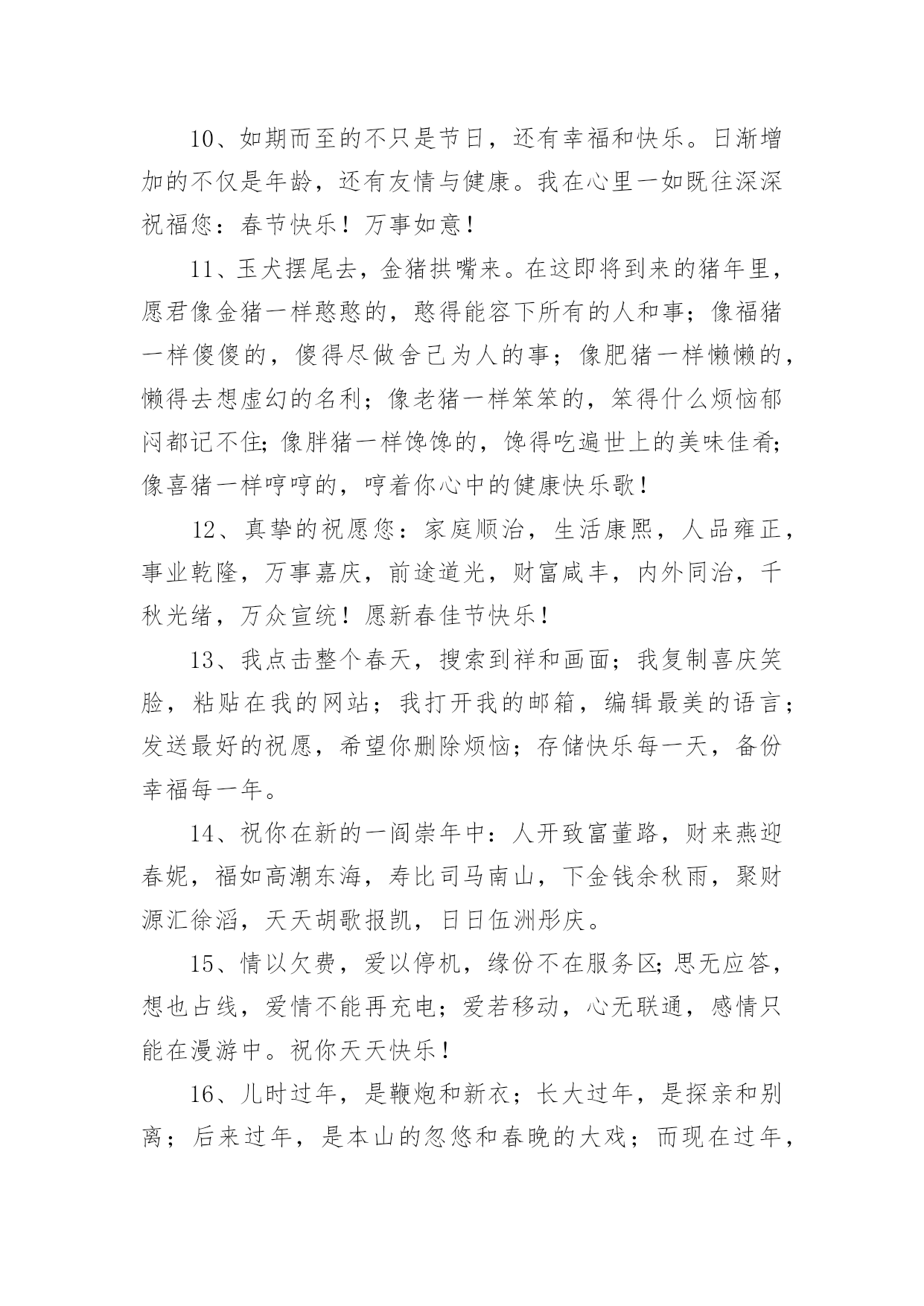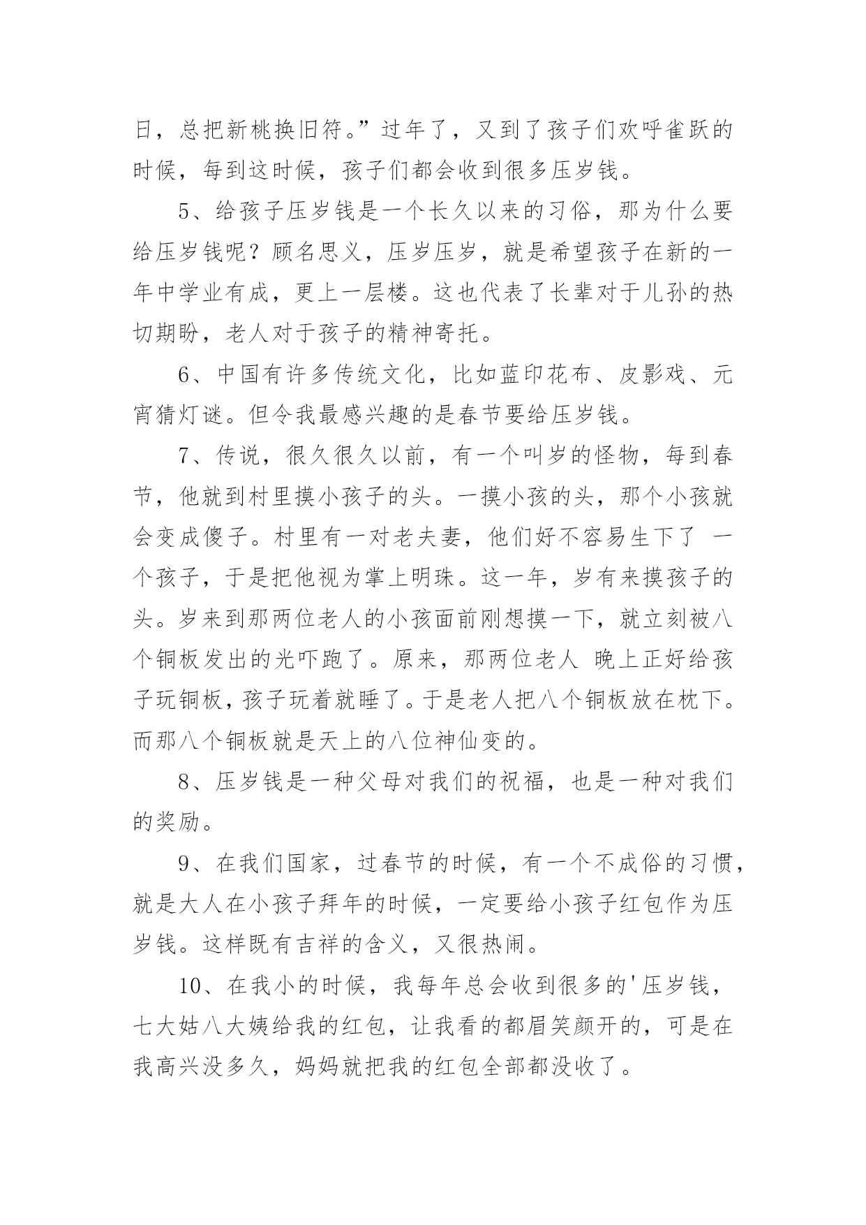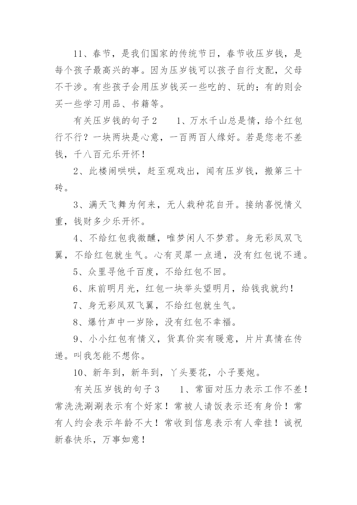 有关压岁钱的句子 有关压岁钱的句子在平平淡淡的日常中,大家都对那些朗朗上口的句子很是熟悉吧,在不同类型的文章里,不同位置的句子的作用也是不同的。那么什么样的句子才更具感染力呢?以下是小编整理的有关压岁钱的句子,欢迎大家分享。有关压岁钱的句子11、每年过春节都是我最开心的时候,因为可以收到压岁钱。今年春节我收到的压岁钱可多了,爷爷、奶奶、姥姥、姥爷、舅舅、姨姨等都给了我很多的压岁钱。比往年的还要多。因为随着时间的流转,我渐渐的长大了,压岁钱当然要增加了!2、我想,我的压岁钱要花的有意义一点。经过我的深思熟虑终于想到了要怎么花:首先,我要先留下来一部分存起来,也不能全部花光呀!剩下的一部分我准备为妈妈买一件礼物,妈妈辛辛苦苦把我养大,我一定要给她个惊喜;然后,我要捐给绿色基金会一部分,用来购买树苗,让我们的地球多一份绿色,多一点清新空气;最后,剩下的压岁钱我就要买些自己喜欢看的书,看书不仅可以增加阅读范围,也可以搜集各类的好词好句,使自己的写作水平大大提高!3、快到过年了,我特别高兴。因为过年可以穿新衣服,买鞭炮,还可以睡懒觉。但是我最高兴的是过年可以收压岁钱。4、“爆竹声中一岁除,春风送暖入屠苏。千门万户曈曈日,总把新桃换旧符。”过年了,又到了孩子们欢呼雀跃的时候,每到这时候,孩子们都会收到很多压岁钱。5、给孩子压岁钱是一个长久以来的习俗,那为什么要给压岁钱呢?顾名思义,压岁压岁,就是希望孩子在新的一年中学业有成,更上一层楼。这也代表了长辈对于儿孙的热切期盼,老人对于孩子的精神寄托。6、中国有许多传统文化,比如蓝印花布、皮影戏、元宵猜灯谜。但令我最感兴趣的是春节要给压岁钱。7、传说,很久很久以前,有一个叫岁的怪物,每到春节,他就到村里摸小孩子的头。一摸小孩的头,那个小孩就会变成傻子。村里有一对老夫妻,他们好不容易生下了一个孩子,于是把他视为掌上明珠。这一年,岁有来摸孩子的头。岁来到那两位老人的小孩面前刚想摸一下,就立刻被八个铜板发出的光吓跑了。原来,那两位老人晚上正好给孩子玩铜板,孩子玩着就睡了。于是老人把八个铜板放在枕下。而那八个铜板就是天上的八位神仙变的。8、压岁钱是一种父母对我们的祝福,也是一种对我们的奖励。9、在我们国家,过春节的时候,有一个不成俗的习惯,就是大人在小孩子拜年的时候,一定要给小孩子红包作为压岁钱。这样既有吉祥的含义,又很热闹。10、在我小的时候,我每年总会收到很多的'压岁钱,七大姑八大姨给我的红包,让我看的都眉笑颜开的,可是在我高兴没多久,妈妈就把我的红包全部都没收了。11、春节,是我们国家的传统节日,春节收压岁钱,是每个孩子最高兴的事。因为压岁钱可以孩子自行支配,父母不干涉。有些孩子会用压岁钱买一些吃的、玩的;有的则会买一些学习用品、书籍等。有关压岁钱的句子21、万水千山总是情,给个红包行不行?一块两块是心意,一百两百人缘好。若是您老不差钱,千八百元乐开怀!2、此楼闹哄哄,赶至观戏出,闻有压岁钱,搬第三十砖。3、满天飞舞为何来,无人栽种花自开。接纳喜悦情义重,钱财多少乐开怀。4、不给红包我微醺,唯梦闲人不梦君。身无彩凤双飞翼,不给红包就生气。心有灵犀一点通,没有红包说不通。5、众里寻他千百度,不给红包不回。6、床前明月光,红包一块举头望明月,给钱我就约!7、身无彩凤双飞翼,不给红包就生气。8、爆竹声中一岁除,没有红包不幸福。9、小小红包有情义,货真价实有暖意,片片真情在传递。叫我怎能不想你。10、新年到,新年到,丫头要花,小子要炮。有关压岁钱的句子31、常面对压力表示工作不差!常洗洗涮涮表示有个好家!常被人请饭表示还有身价!常有人约会表示年龄不大!常收到信息表示有人牵挂!诚祝新春快乐,万事如意!2、人生因为朋友而酣畅,因有事业而从容,因有成就而自豪,因有家庭而温馨,因希望而奋发,因健康而快乐,祝你新的一年应有尽有!新春愉快!3、短信会变成美味,文字会开出玫瑰,相互发送是一种约会,细读是为了体会寂寞滋味,不是没酒喝,只怪一个人喝不醉,人世间,只有朋友最珍贵!祝新年大吉。4、夜幕有星星显得迷人,大海有涛声显得渊博,冬季有雪花倍感浪漫,朋友中有你深感幸福!把最美好的祝福送给你,新年快乐!5、冰在水上,云在风上,朋友记在心上!鸳鸯在湖上,蝴蝶在花上,愿你快乐在我之上!念在心上,喜在脸上,诚心祝愿写在短信上!真挚祝你:生活快乐!6、派2007头野猪,快递新年祝福;派2007头香猪,积聚快乐幸福;派2007头小猪,尽情撒欢祈福;派2007头金猪,恭贺猪年万福!7、朋友是天,朋友是地,有了朋友可以顶天立地;朋友是风,朋友是雨,有了朋友可以呼风唤雨;财富不是永远的朋友,朋友却是永远的财富。8、友不贵多,得一人,可胜百人;友不论久,得一日,可喻千古;友不择时,得一缘,可益一世;有您一友,是缘,是运,是福!9、从未做过贼
