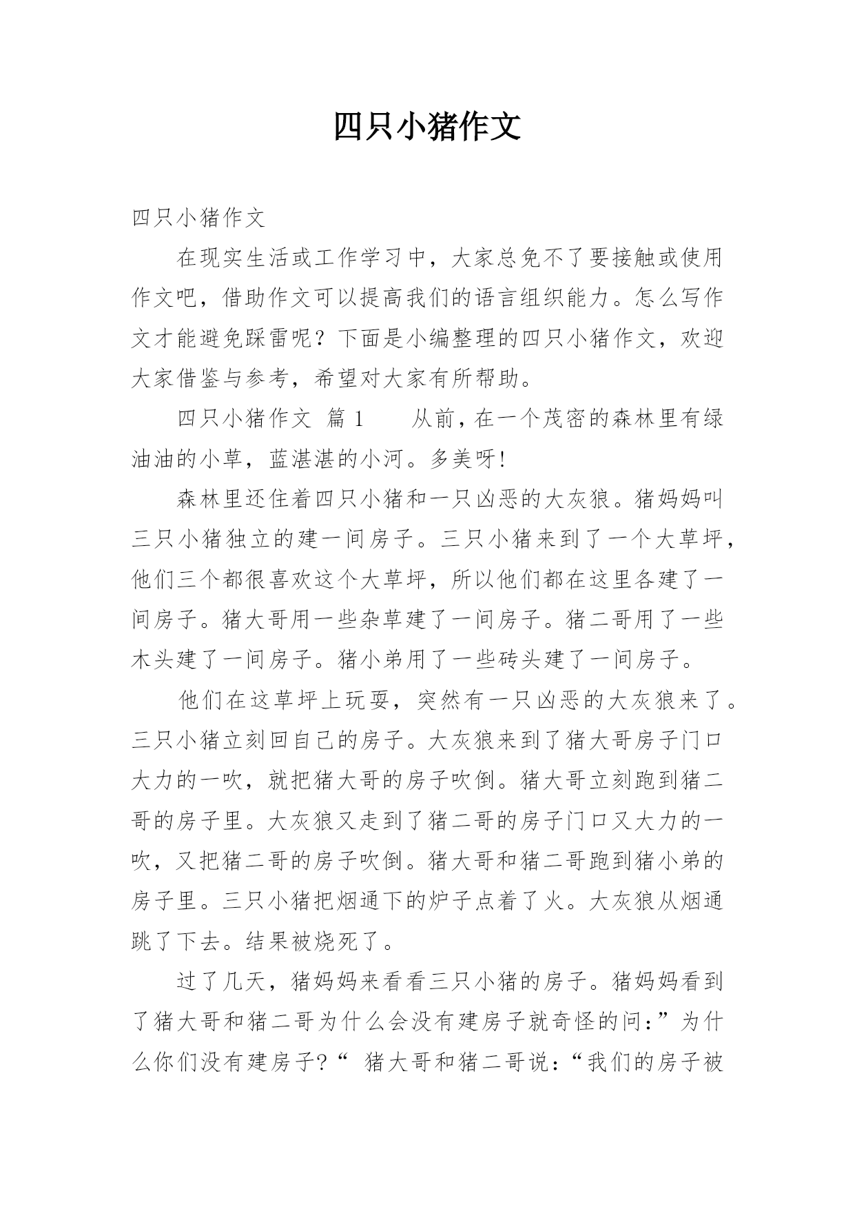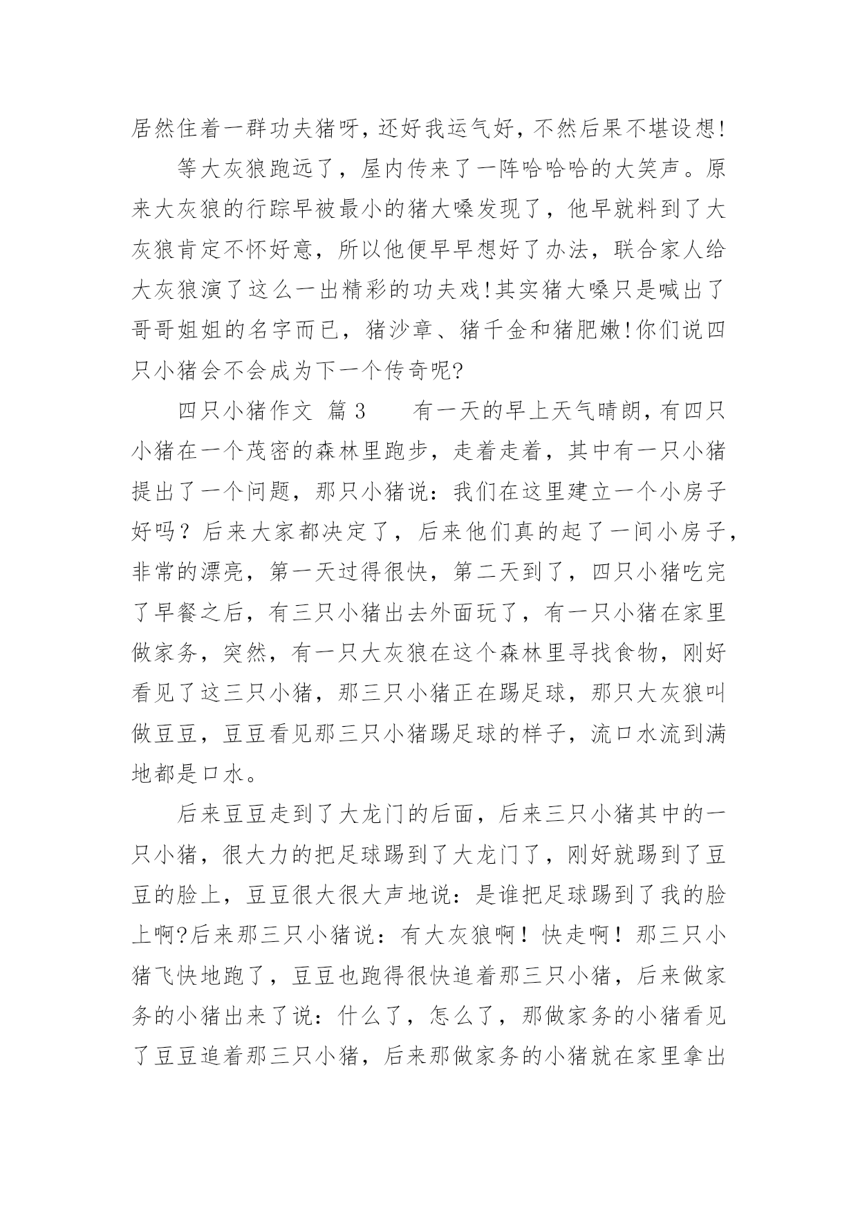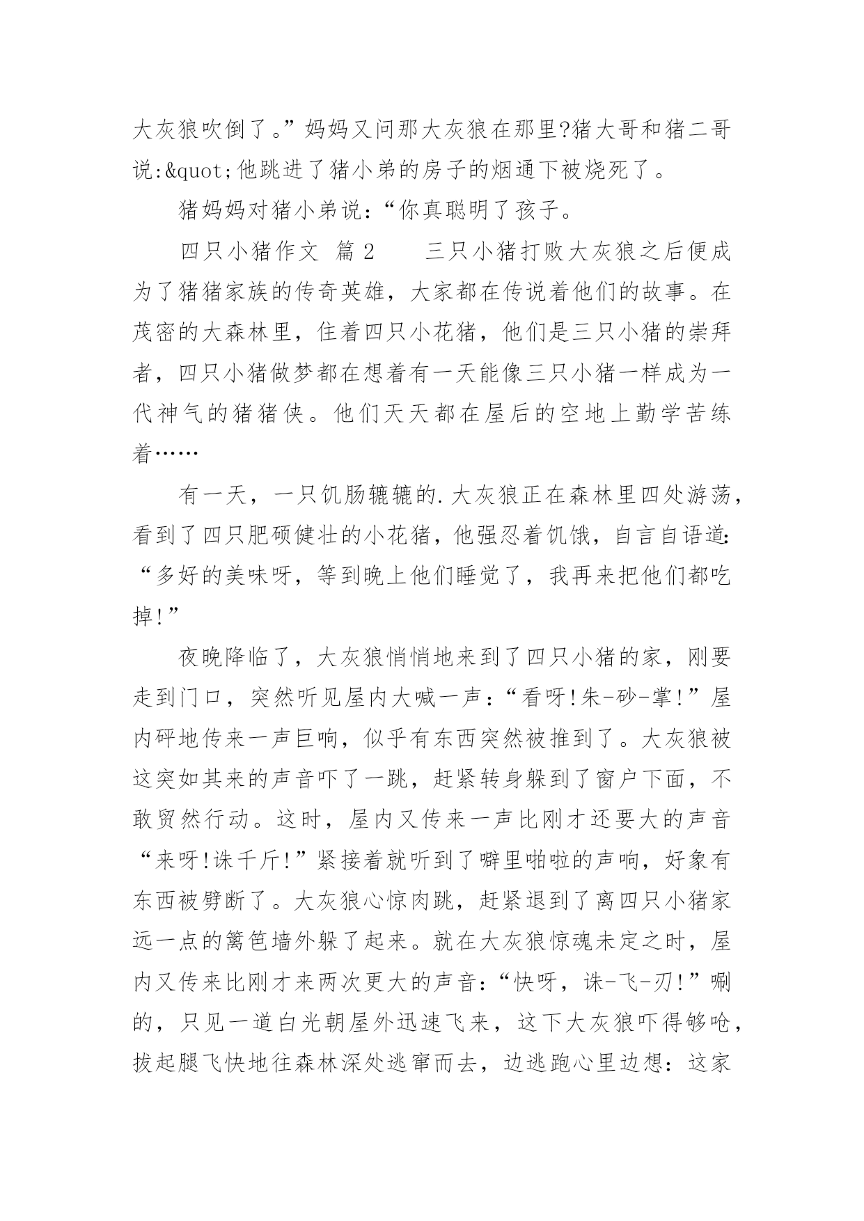 四只小猪作文 四只小猪作文在现实生活或工作学习中,大家总免不了要接触或使用作文吧,借助作文可以提高我们的语言组织能力。怎么写作文才能避免踩雷呢?下面是小编整理的四只小猪作文,欢迎大家借鉴与参考,希望对大家有所帮助。四只小猪作文篇1从前,在一个茂密的森林里有绿油油的小草,蓝湛湛的小河。多美呀!森林里还住着四只小猪和一只凶恶的大灰狼。猪妈妈叫三只小猪独立的建一间房子。三只小猪来到了一个大草坪,他们三个都很喜欢这个大草坪,所以他们都在这里各建了一间房子。猪大哥用一些杂草建了一间房子。猪二哥用了一些木头建了一间房子。猪小弟用了一些砖头建了一间房子。他们在这草坪上玩耍,突然有一只凶恶的大灰狼来了。三只小猪立刻回自己的房子。大灰狼来到了猪大哥房子门口大力的一吹,就把猪大哥的房子吹倒。猪大哥立刻跑到猪二哥的房子里。大灰狼又走到了猪二哥的房子门口又大力的一吹,又把猪二哥的房子吹倒。猪大哥和猪二哥跑到猪小弟的房子里。三只小猪把烟通下的炉子点着了火。大灰狼从烟通跳了下去。结果被烧死了。过了几天,猪妈妈来看看三只小猪的房子。猪妈妈看到了猪大哥和猪二哥为什么会没有建房子就奇怪的问:”为什么你们没有建房子?“猪大哥和猪二哥说:“我们的房子被大灰狼吹倒了。”妈妈又问那大灰狼在那里?猪大哥和猪二哥说:"他跳进了猪小弟的房子的烟通下被烧死了。猪妈妈对猪小弟说:“你真聪明了孩子。四只小猪作文篇2三只小猪打败大灰狼之后便成为了猪猪家族的传奇英雄,大家都在传说着他们的故事。在茂密的大森林里,住着四只小花猪,他们是三只小猪的崇拜者,四只小猪做梦都在想着有一天能像三只小猪一样成为一代神气的猪猪侠。他们天天都在屋后的空地上勤学苦练着……有一天,一只饥肠辘辘的.大灰狼正在森林里四处游荡,看到了四只肥硕健壮的小花猪,他强忍着饥饿,自言自语道:“多好的美味呀,等到晚上他们睡觉了,我再来把他们都吃掉!”夜晚降临了,大灰狼悄悄地来到了四只小猪的家,刚要走到门口,突然听见屋内大喊一声:“看呀!朱-砂-掌!”屋内砰地传来一声巨响,似乎有东西突然被推到了。大灰狼被这突如其来的声音吓了一跳,赶紧转身躲到了窗户下面,不敢贸然行动。这时,屋内又传来一声比刚才还要大的声音“来呀!诛千斤!”紧接着就听到了噼里啪啦的声响,好象有东西被劈断了。大灰狼心惊肉跳,赶紧退到了离四只小猪家远一点的篱笆墙外躲了起来。就在大灰狼惊魂未定之时,屋内又传来比刚才来两次更大的声音:“快呀,诛-飞-刃!”唰的,只见一道白光朝屋外迅速飞来,这下大灰狼吓得够呛,拔起腿飞快地往森林深处逃窜而去,边逃跑心里边想:这家居然住着一群功夫猪呀,还好我运气好,不然后果不堪设想!等大灰狼跑远了,屋内传来了一阵哈哈哈的大笑声。原来大灰狼的行踪早被最小的猪大嗓发现了,他早就料到了大灰狼肯定不怀好意,所以他便早早想好了办法,联合家人给大灰狼演了这么一出精彩的功夫戏!其实猪大嗓只是喊出了哥哥姐姐的名字而已,猪沙章、猪千金和猪肥嫩!你们说四只小猪会不会成为下一个传奇呢?四只小猪作文篇3有一天的早上天气晴朗,有四只小猪在一个茂密的森林里跑步,走着走着,其中有一只小猪提出了一个问题,那只小猪说:我们在这里建立一个小房子好吗?后来大家都决定了,后来他们真的起了一间小房子,非常的漂亮,第一天过得很快,第二天到了,四只小猪吃完了早餐之后,有三只小猪出去外面玩了,有一只小猪在家里做家务,突然,有一只大灰狼在这个森林里寻找食物,刚好看见了这三只小猪,那三只小猪正在踢足球,那只大灰狼叫做豆豆,豆豆看见那三只小猪踢足球的样子,流口水流到满地都是口水。后来豆豆走到了大龙门的后面,后来三只小猪其中的一只小猪,很大力的把足球踢到了大龙门了,刚好就踢到了豆豆的脸上,豆豆很大很大声地说:是谁把足球踢到了我的脸上啊?后来那三只小猪说:有大灰狼啊!快走啊!那三只小猪飞快地跑了,豆豆也跑得很快追着那三只小猪,后来做家务的小猪出来了说:什么了,怎么了,那做家务的小猪看见了豆豆追着那三只小猪,后来那做家务的小猪就在家里拿出了很热很热的水来向豆豆奔去,小猪走到了豆豆的后面,豆豆就不知道有一只小猪在他的后面,后来豆豆给那只小猪给热死了,然后那四只小猪非常的高兴,最后他们四个高高兴兴地回家了。