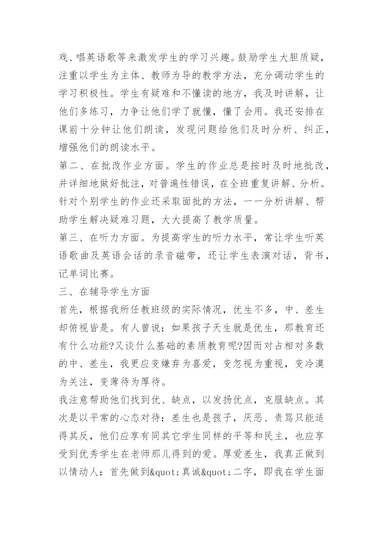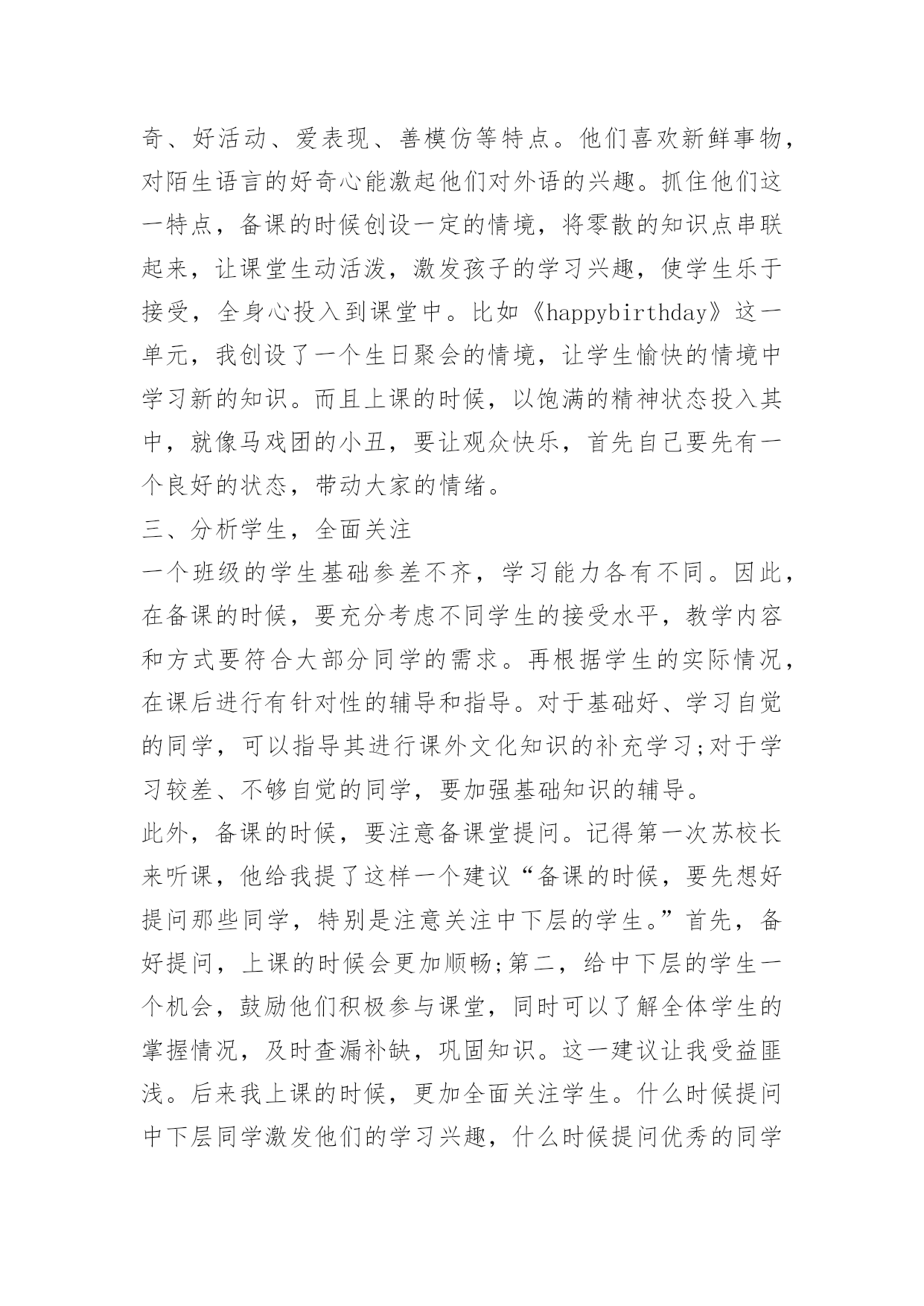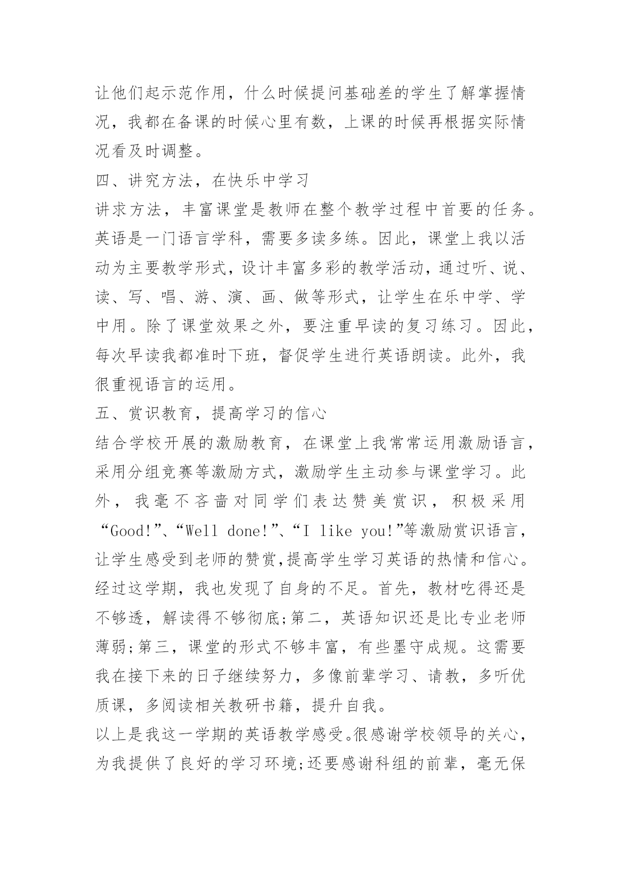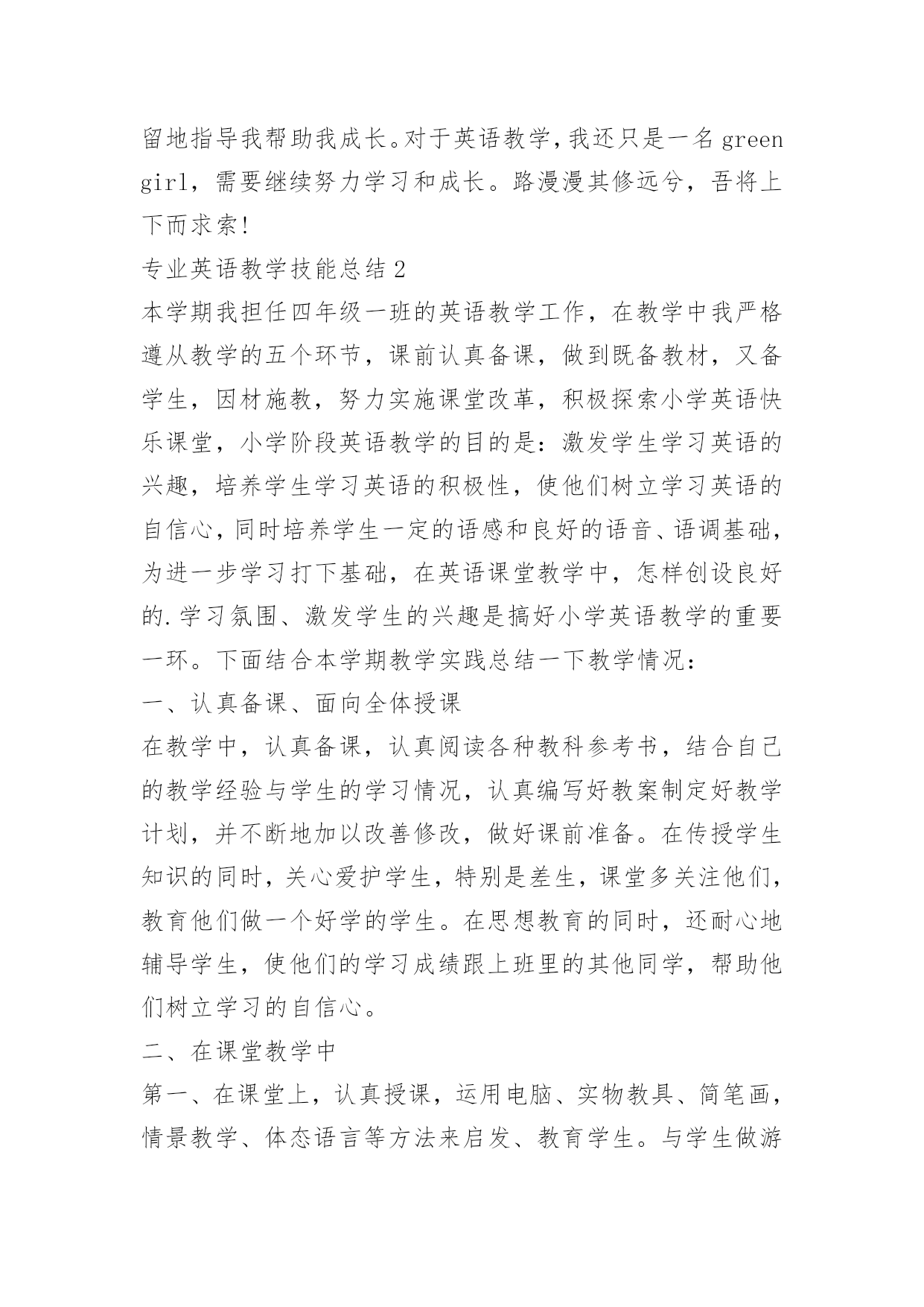 专业英语教学技能总结 总结是事后对某一阶段的学习或工作情况作加以回顾检查并分析评价的书面材料,通过它可以正确认识以往学习和工作中的优缺点,不妨坐下来好好写写总结吧。我们该怎么写总结呢?下面是小编整理的专业英语教学技能总结,仅供参考,大家一起来看看吧。专业英语教学技能总结1这学期我担任三年级的英语教学工作。作为一名毫无经验的新人,我感受到压力,丝毫不敢怠慢,认真向各位前辈学习取经,努力成长。经过这一学期的学习,我获得许多宝贵的经验,现总结如下:一、解读教材、抓住重点解读教材,掌握教学重点,是教学中最基础的环节。作为一名新手,一开始最担心的就是对教材了解不够,抓不住重点,教学没有方向。因此,我积极向前辈请教、听课,阅读相关的教育教学论文和书籍,尝试着分析教材,提炼重点,认真备课,以积极的心态和良好的状态面对教学。现在,我对于教材已经有一定的了解,基本掌握重点,有了方向,备课的感觉也不再像起初那样吃力了。二、创设情境、快乐教学三年级的英语课本共有八个单元,包括问候语、询问姓名、年龄、物品名称、数字1—10、食物、运动,加上字母的学习,文化单元,知识点基础而零散。这个年纪的孩子具有好奇、好活动、爱表现、善模仿等特点。他们喜欢新鲜事物,对陌生语言的好奇心能激起他们对外语的兴趣。抓住他们这一特点,备课的时候创设一定的情境,将零散的知识点串联起来,让课堂生动活泼,激发孩子的学习兴趣,使学生乐于接受,全身心投入到课堂中。比如《happybirthday》这一单元,我创设了一个生日聚会的情境,让学生愉快的情境中学习新的知识。而且上课的时候,以饱满的精神状态投入其中,就像马戏团的小丑,要让观众快乐,首先自己要先有一个良好的状态,带动大家的情绪。三、分析学生,全面关注一个班级的学生基础参差不齐,学习能力各有不同。因此,在备课的时候,要充分考虑不同学生的接受水平,教学内容和方式要符合大部分同学的需求。再根据学生的实际情况,在课后进行有针对性的辅导和指导。对于基础好、学习自觉的同学,可以指导其进行课外文化知识的补充学习;对于学习较差、不够自觉的同学,要加强基础知识的辅导。此外,备课的时候,要注意备课堂提问。记得第一次苏校长来听课,他给我提了这样一个建议“备课的时候,要先想好提问那些同学,特别是注意关注中下层的学生。”首先,备好提问,上课的时候会更加顺畅;第二,给中下层的学生一个机会,鼓励他们积极参与课堂,同时可以了解全体学生的掌握情况,及时查漏补缺,巩固知识。这一建议让我受益匪浅。后来我上课的时候,更加全面关注学生。什么时候提问中下层同学激发他们的学习兴趣,什么时候提问优秀的同学让他们起示范作用,什么时候提问基础差的学生了解掌握情况,我都在备课的时候心里有数,上课的时候再根据实际情况看及时调整。四、讲究方法,在快乐中学习讲求方法,丰富课堂是教师在整个教学过程中首要的任务。英语是一门语言学科,需要多读多练。因此,课堂上我以活动为主要教学形式,设计丰富多彩的教学活动,通过听、说、读、写、唱、游、演、画、做等形式,让学生在乐中学、学中用。除了课堂效果之外,要注重早读的复习练习。因此,每次早读我都准时下班,督促学生进行英语朗读。此外,我很重视语言的运用。五、赏识教育,提高学习的信心结合学校开展的激励教育,在课堂上我常常运用激励语言,采用分组竞赛等激励方式,激励学生主动参与课堂学习。此外,我毫不吝啬对同学们表达赞美赏识,积极采用“Good!”、“Welldone!”、“Ilikeyou!”等激励赏识语言,让学生感受到老师的赞赏,提高学生学习英语的热情和信心。经过这学期,我也发现了自身的不足。首先,教材吃得还是不够透,解读得不够彻底;第二,英语知识还是比专业老师薄弱;第三,课堂的形式不够丰富,有些墨守成规。这需要我在接下来的日子继续努力,多像前辈学习、请教,多听优质课,多阅读相关教研书籍,提升自我。以上是我这一学期的英语教学感受。很感谢学校领导的关心,为我提供了良好的学习环境;还要感谢科组的前辈,毫无保留地指导我帮助我成长。对于英语教学,我还只是一名greengirl,需要继续努力学习和成长。路漫漫其修远兮,吾将上下而求索!专业英语教学技能总结2本学期我担任四年级一班的英语教学工作,在教学中我严格遵从教学的五个环节,课前认真备课,做到既备教材,又备学生,因材施教,努力实施课堂改革,积极探索小学英语快乐课堂,小学阶段英语教学的目的是:激发学生学习英语的兴趣,培养学生学习英语的积极性,使他们树立学习英语的自信心,同时培养学生一定的语感和良好的语音、语调基础,为进一步学习打下基础,在英语课堂教学中,怎样创设良好的.学习氛围、激发学生的兴趣是搞好小学英语教学的重要一环。下面结合本学期教学实践总结一下教学情况:一、认真备课、面向全体授课在教学中,认真备课,认真阅读各种教科