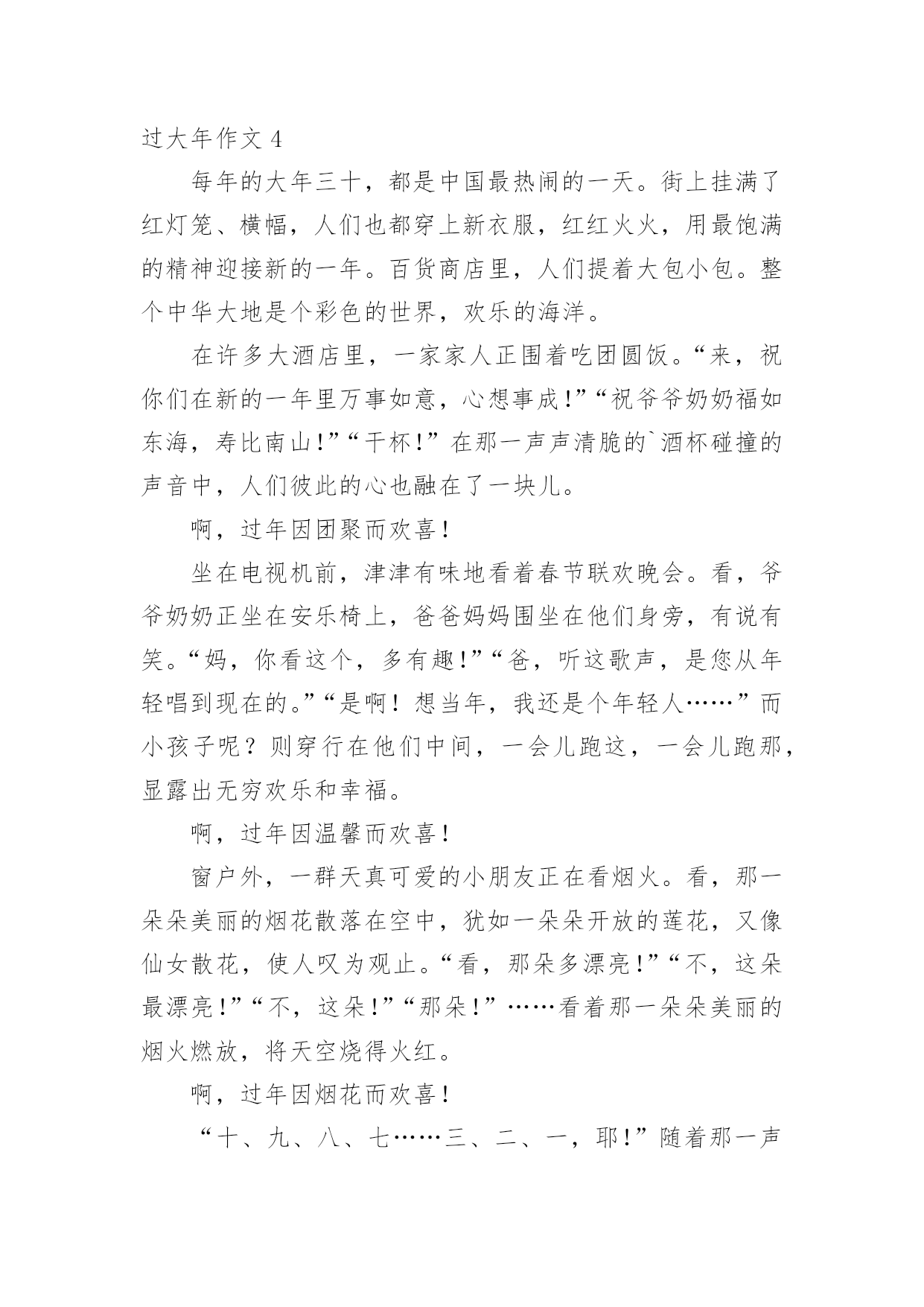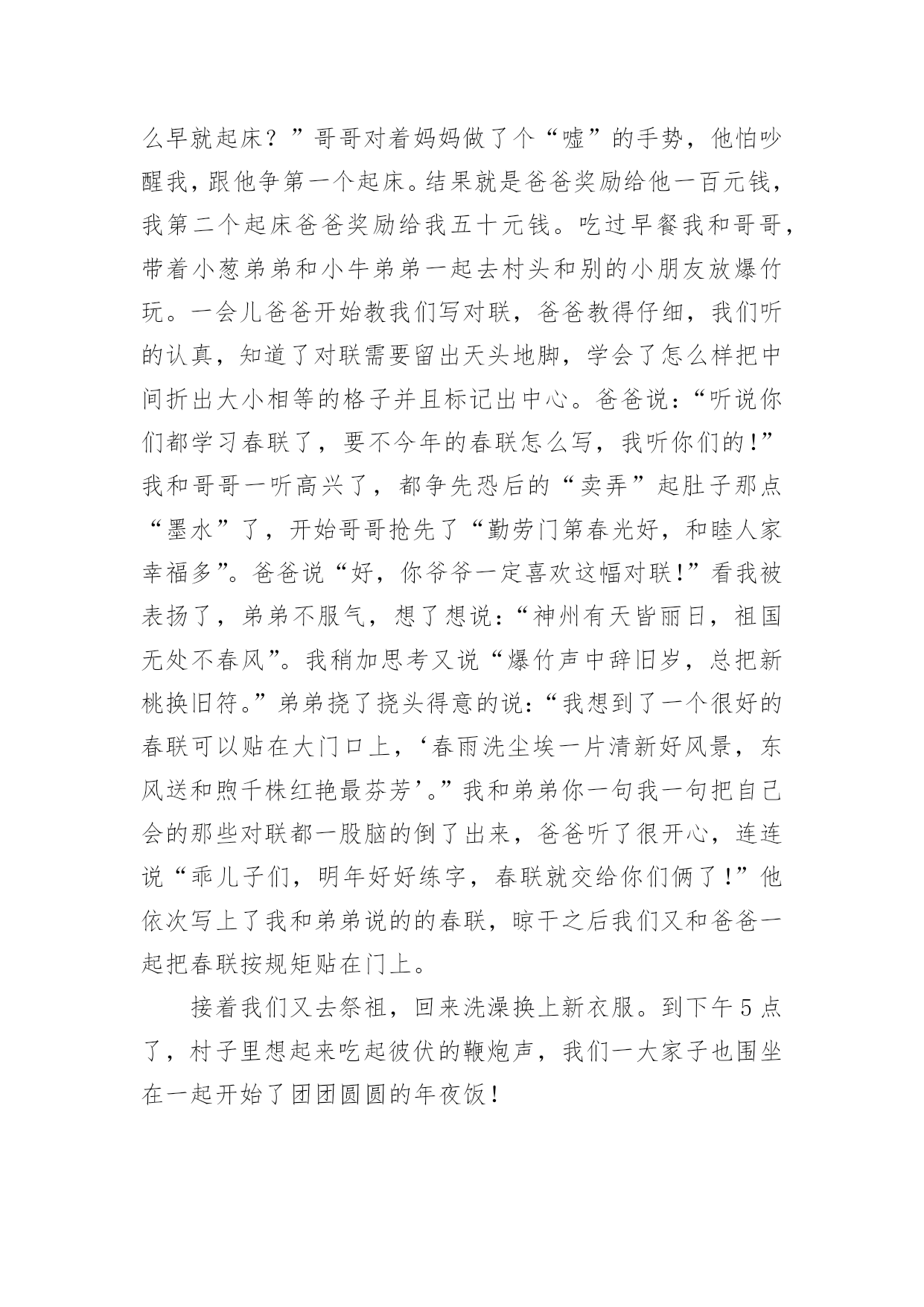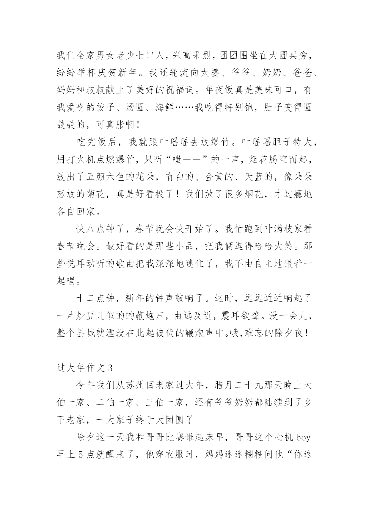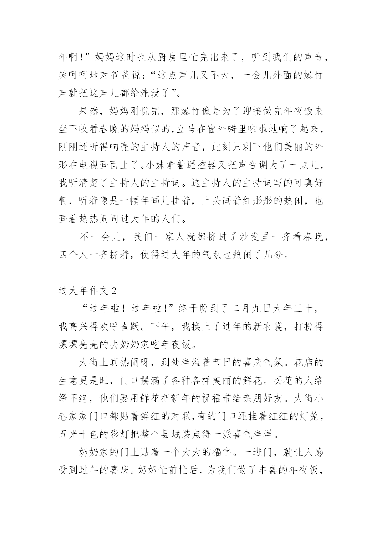 过大年作文 过大年作文通用15篇在现实生活或工作学习中,大家都经常接触到作文吧,通过作文可以把我们那些零零散散的思想,聚集在一块。你写作文时总是无从下笔?以下是小编收集整理的过大年作文,欢迎阅读,希望大家能够喜欢。过大年作文1“快点,快点,春晚开始啦!”小妹在家里大声嚷嚷着,我们在家里洗的洗碗,洗的洗澡,摆盘的摆盘,忙得不亦乐乎,听到她的呼唤,大家赶紧加快了手头的事。小妹在家不用干什么活,吃完年夜饭,她负责把家里所有的灯都打开,然后坐在电视前等着春晚的到来。时不时她也会听到外面的爆竹声而从窗口往外眺望,只是她不下楼去玩,她想要留在家里和家人过大年。“来啦,来啦,小妹,你把声音开大点儿!”妈妈从厨房里做着收尾工作,同时冲小妹喊着把电视的声音调大点。“哎呀,咱家可真是热闹啊!”爸爸洗完澡出来第一句就是这个,大概是洗澡的时候就听到小妹把电视音量给调大了好几个分贝吧。我忙着把过年茶几上的零食重新填满,听到爸爸的这句话,赶紧回应说:“这样才有过年的气氛啊!”小妹凑到我面前来补充道:“对对对,就是要热热闹闹过大年啊!”妈妈这时也从厨房里忙完出来了,听到我们的声音,笑呵呵地对爸爸说:“这点声儿又不大,一会儿外面的爆竹声就把这声儿都给淹没了”。果然,妈妈刚说完,那爆竹像是为了迎接做完年夜饭来坐下收看春晚的妈妈似的,立马在窗外噼里啪啦地响了起来,刚刚还听得响亮的主持人的声音,此刻只剩下他们美丽的外形在电视画面上了。小妹拿着遥控器又把声音调大了一点儿,我听清楚了主持人的主持词。这主持人的主持词写的可真好啊,听着像是一幅年画儿挂着,上头画着红彤彤的热闹,也画着热热闹闹过大年的人们。不一会儿,我们一家人就都挤进了沙发里一齐看春晚,四个人一齐挤着,使得过大年的气氛也热闹了几分。过大年作文2“过年啦!过年啦!”终于盼到了二月九日大年三十,我高兴得欢呼雀跃。下午,我换上了过年的新衣裳,打扮得漂漂亮亮的去奶奶家吃年夜饭。大街上真热闹呀,到处洋溢着节日的喜庆气氛。花店的生意更是旺,门口摆满了各种各样美丽的鲜花。买花的人络绎不绝,他们要用鲜花把新年的祝福带给亲朋好友。大街小巷家家门口都贴着鲜红的对联,有的门口还挂着红红的灯笼,五光十色的彩灯把整个县城装点得一派喜气洋洋。奶奶家的门上贴着一个大大的福字。一进门,就让人感受到过年的喜庆。奶奶忙前忙后,为我们做了丰盛的年夜饭,我们全家男女老少七口人,兴高采烈,团团围坐在大圆桌旁,纷纷举杯庆贺新年。我还轮流向太婆、爷爷、奶奶、爸爸、妈妈和叔叔献上了美好的祝福词。年夜饭真是美味可口,有我爱吃的饺子、汤圆、海鲜……我吃得特别饱,肚子变得圆鼓鼓的,可真胀啊!吃完饭后,我就跟叶瑶瑶去放爆竹。叶瑶瑶胆子特大,用打火机点燃爆竹,只听“嗤――”的一声,烟花腾空而起,放出了五颜六色的花朵,有白的、金黄的、天蓝的,像朵朵怒放的菊花,真是好看极了!我们放了很多烟花,才过瘾地各自回家。快八点钟了,春节晚会快开始了。我忙跑到叶满枝家看春节晚会。最好看的是那些小品,把我俩逗得哈哈大笑。那些悦耳动听的歌曲把我深深地迷住了,我不由自主地跟着一起唱。十二点钟,新年的钟声敲响了。这时,远远近近响起了一片炒豆儿似的的鞭炮声,由远及近,震耳欲聋。没一会儿,整个县城就湮没在此起彼伏的鞭炮声中。哦,难忘的除夕夜!过大年作文3今年我们从苏州回老家过大年,腊月二十九那天晚上大伯一家、二伯一家、三伯一家,还有爷爷奶奶都陆续到了乡下老家,一大家子终于大团圆了除夕这一天我和哥哥比赛谁起床早,哥哥这个心机boy早上5点就醒来了,他穿衣服时,妈妈迷迷糊糊问他“你这么早就起床?”哥哥对着妈妈做了个“嘘”的手势,他怕吵醒我,跟他争第一个起床。结果就是爸爸奖励给他一百元钱,我第二个起床爸爸奖励给我五十元钱。吃过早餐我和哥哥,带着小葱弟弟和小牛弟弟一起去村头和别的小朋友放爆竹玩。一会儿爸爸开始教我们写对联,爸爸教得仔细,我们听的认真,知道了对联需要留出天头地脚,学会了怎么样把中间折出大小相等的格子并且标记出中心。爸爸说:“听说你们都学习春联了,要不今年的春联怎么写,我听你们的!”我和哥哥一听高兴了,都争先恐后的“卖弄”起肚子那点“墨水”了,开始哥哥抢先了“勤劳门第春光好,和睦人家幸福多”。爸爸说“好,你爷爷一定喜欢这幅对联!”看我被表扬了,弟弟不服气,想了想说:“神州有天皆丽日,祖国无处不春风”。我稍加思考又说“爆竹声中辞旧岁,总把新桃换旧符。”弟弟挠了挠头得意的说:“我想到了一个很好的春联可以贴在大门口上,‘春雨洗尘埃一片清新好风景,东风送和煦千株红艳最芬芳’。”我和弟弟你一句我一句把自己会的那些对联都一股脑的倒了出来,爸爸听了很开心,连连说“乖儿子们,明年好好练字,春联就交给你们俩了!”他依次写上了我和弟弟说的的春联,晾干之后我们又和爸爸一起把春联按规矩贴在门上。接着我们又去祭