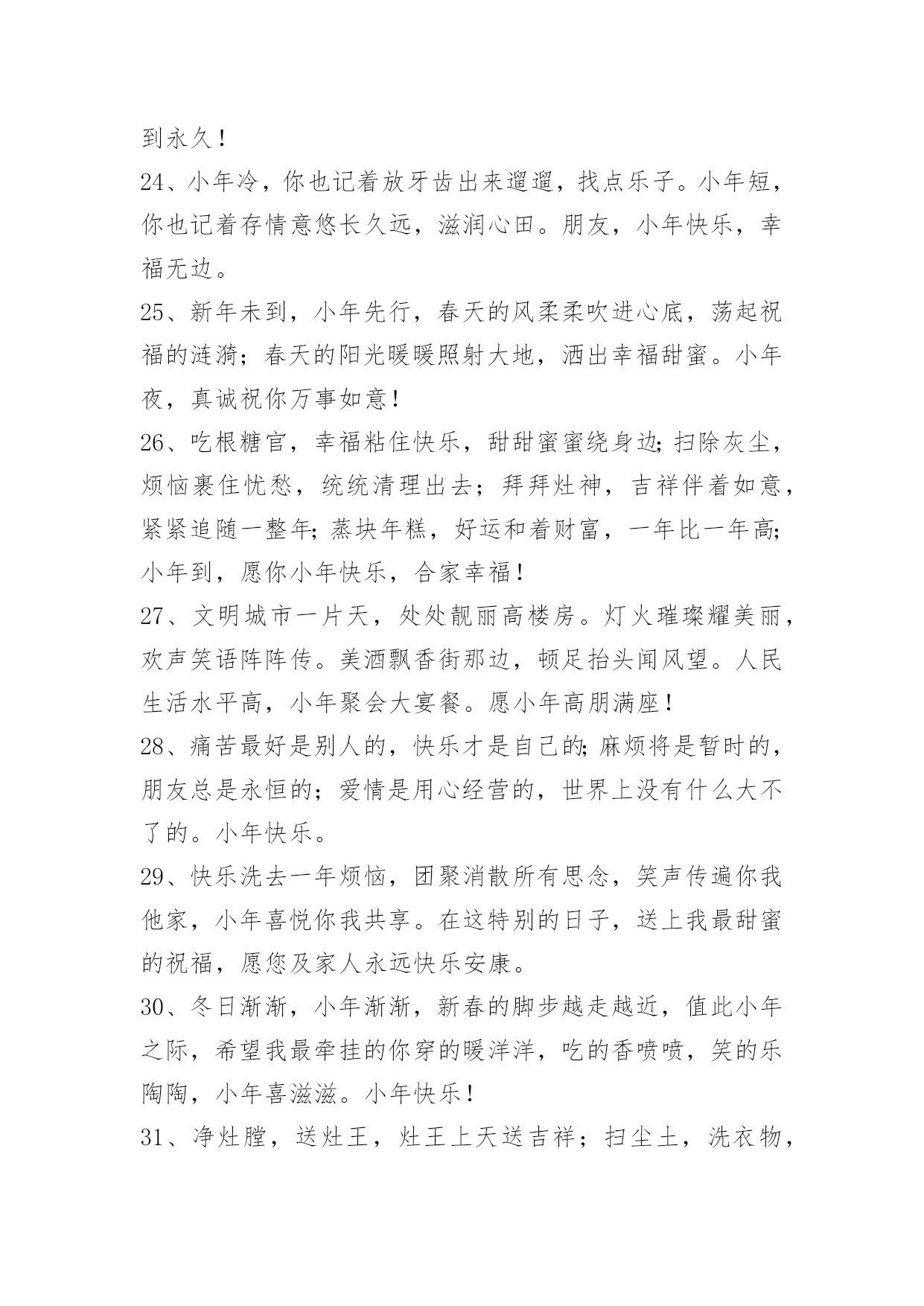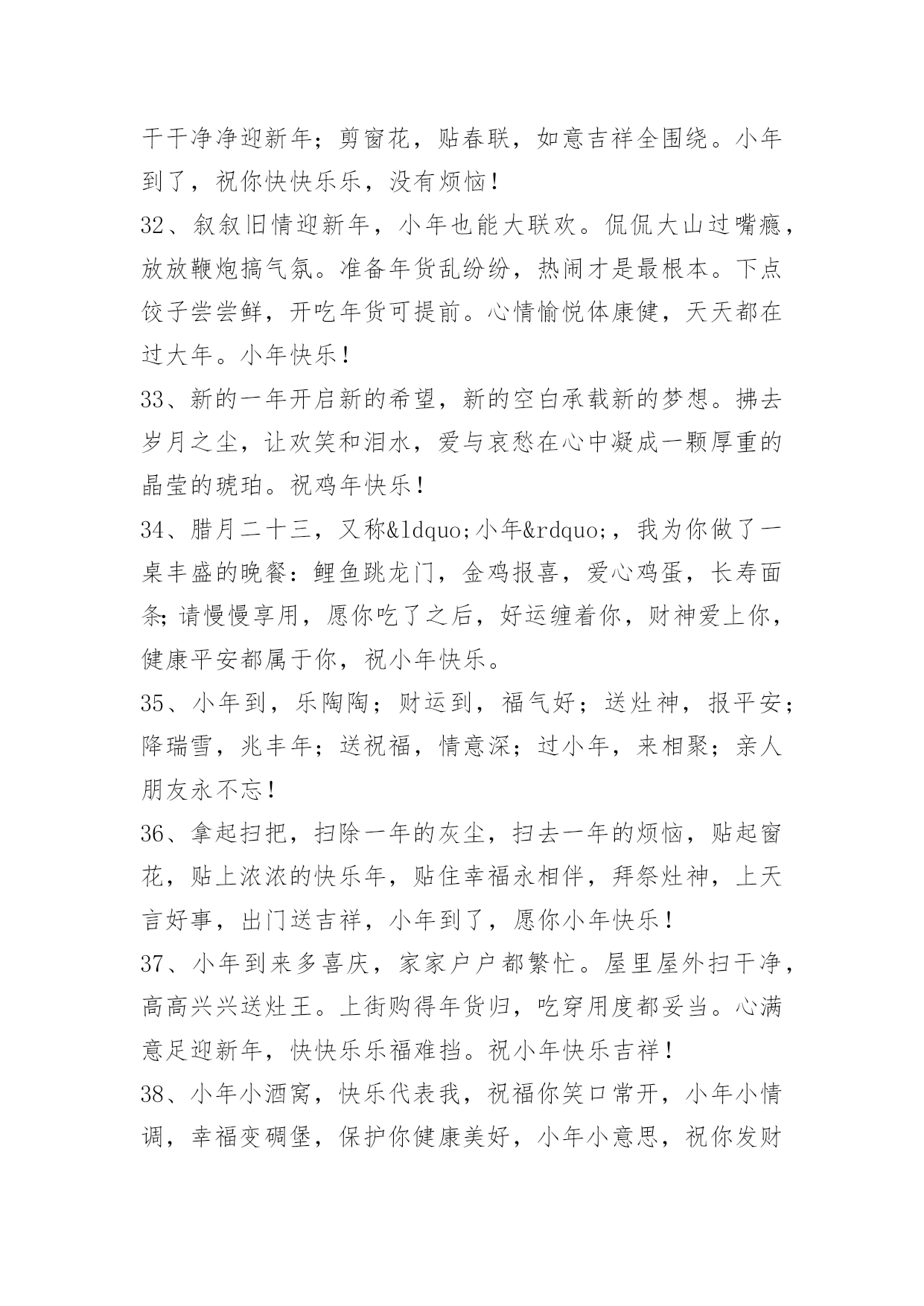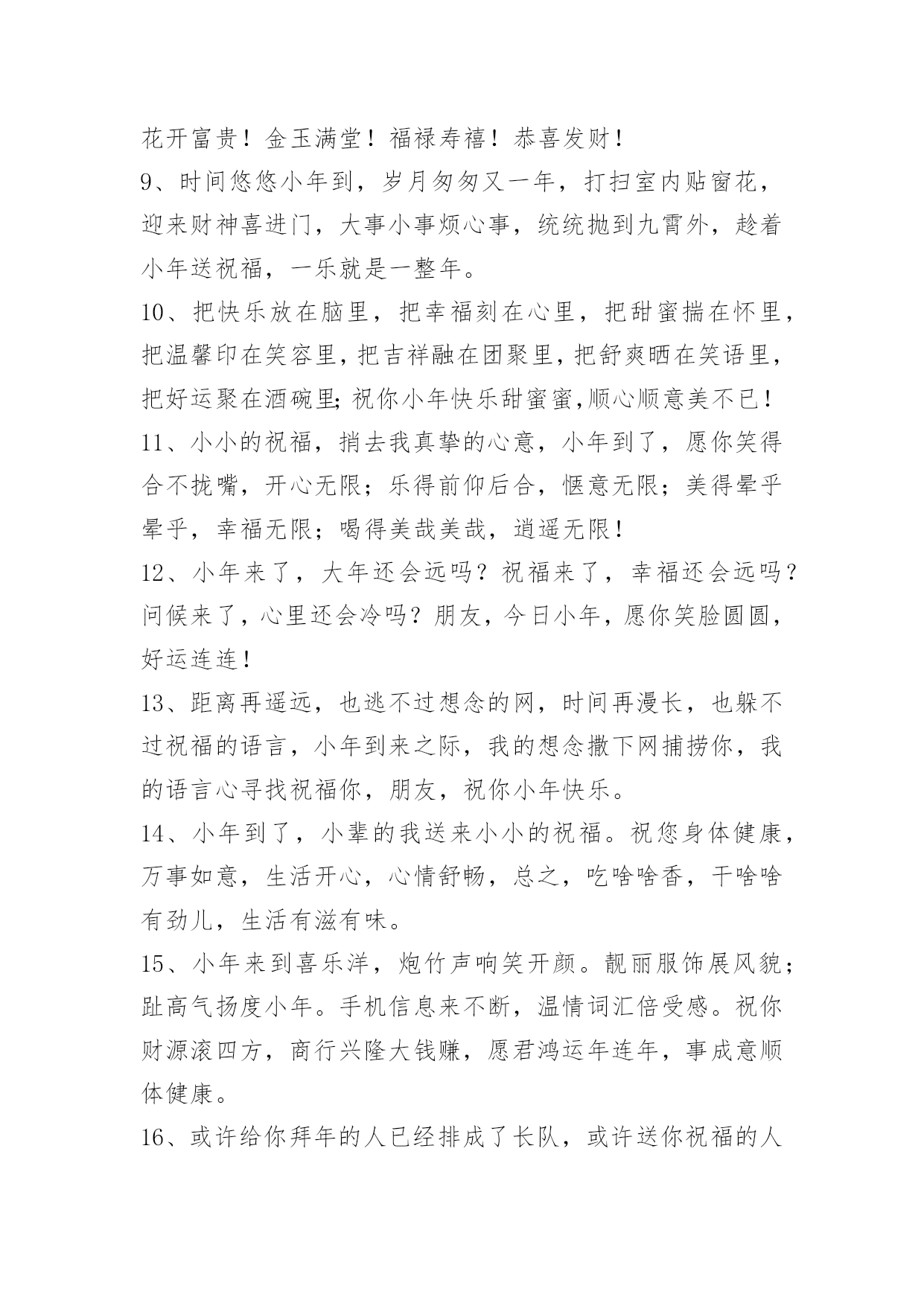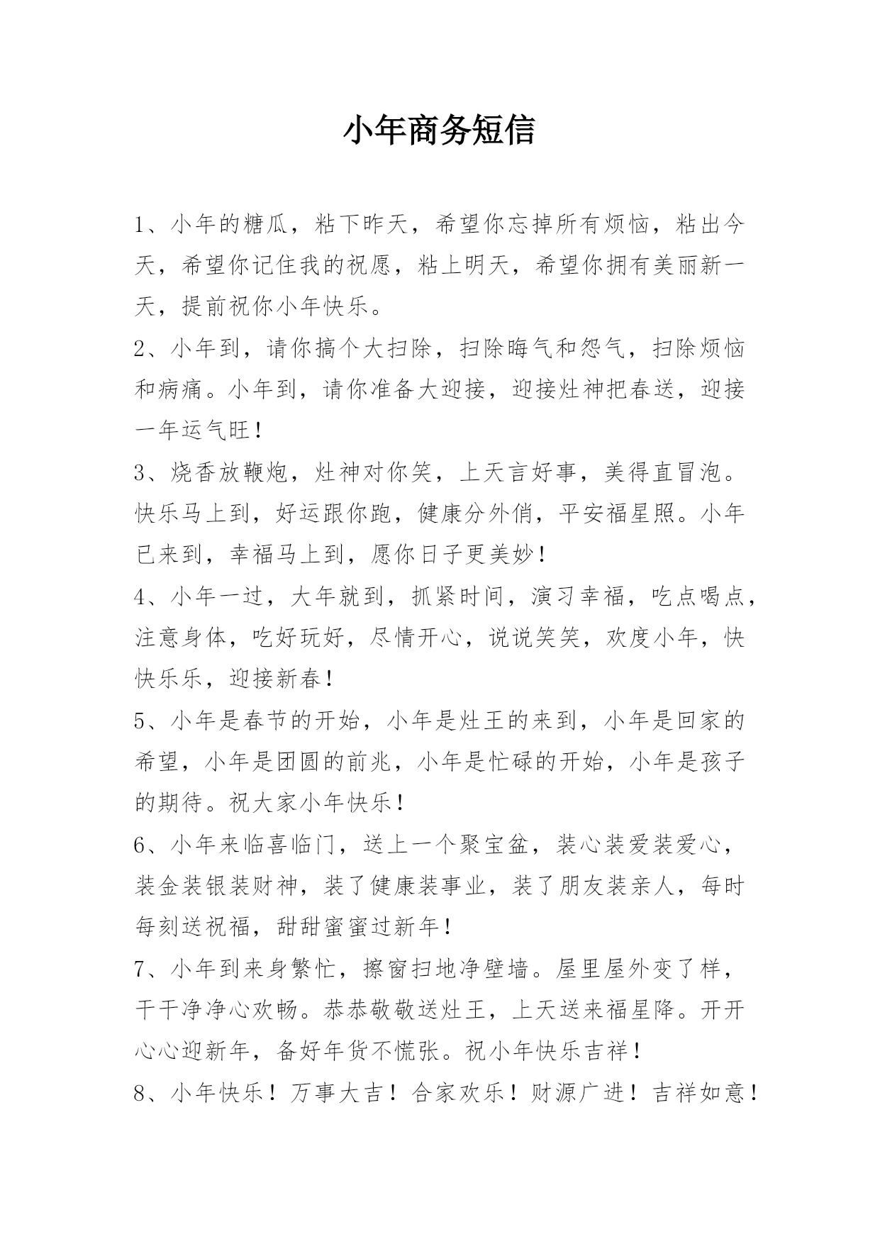 小年商务短信 1、小年的糖瓜,粘下昨天,希望你忘掉所有烦恼,粘出今天,希望你记住我的祝愿,粘上明天,希望你拥有美丽新一天,提前祝你小年快乐。2、小年到,请你搞个大扫除,扫除晦气和怨气,扫除烦恼和病痛。小年到,请你准备大迎接,迎接灶神把春送,迎接一年运气旺!3、烧香放鞭炮,灶神对你笑,上天言好事,美得直冒泡。快乐马上到,好运跟你跑,健康分外俏,平安福星照。小年已来到,幸福马上到,愿你日子更美妙!4、小年一过,大年就到,抓紧时间,演习幸福,吃点喝点,注意身体,吃好玩好,尽情开心,说说笑笑,欢度小年,快快乐乐,迎接新春!5、小年是春节的开始,小年是灶王的来到,小年是回家的希望,小年是团圆的前兆,小年是忙碌的开始,小年是孩子的期待。祝大家小年快乐!6、小年来临喜临门,送上一个聚宝盆,装心装爱装爱心,装金装银装财神,装了健康装事业,装了朋友装亲人,每时每刻送祝福,甜甜蜜蜜过新年!7、小年到来身繁忙,擦窗扫地净壁墙。屋里屋外变了样,干干净净心欢畅。恭恭敬敬送灶王,上天送来福星降。开开心心迎新年,备好年货不慌张。祝小年快乐吉祥!8、小年快乐!万事大吉!合家欢乐!财源广进!吉祥如意!花开富贵!金玉满堂!福禄寿禧!恭喜发财!9、时间悠悠小年到,岁月匆匆又一年,打扫室内贴窗花,迎来财神喜进门,大事小事烦心事,统统抛到九霄外,趁着小年送祝福,一乐就是一整年。10、把快乐放在脑里,把幸福刻在心里,把甜蜜揣在怀里,把温馨印在笑容里,把吉祥融在团聚里,把舒爽晒在笑语里,把好运聚在酒碗里;祝你小年快乐甜蜜蜜,顺心顺意美不已!11、小小的祝福,捎去我真挚的心意,小年到了,愿你笑得合不拢嘴,开心无限;乐得前仰后合,惬意无限;美得晕乎晕乎,幸福无限;喝得美哉美哉,逍遥无限!12、小年来了,大年还会远吗?祝福来了,幸福还会远吗?问候来了,心里还会冷吗?朋友,今日小年,愿你笑脸圆圆,好运连连!13、距离再遥远,也逃不过想念的网,时间再漫长,也躲不过祝福的语言,小年到来之际,我的想念撒下网捕捞你,我的语言心寻找祝福你,朋友,祝你小年快乐。14、小年到了,小辈的我送来小小的祝福。祝您身体健康,万事如意,生活开心,心情舒畅,总之,吃啥啥香,干啥啥有劲儿,生活有滋有味。15、小年来到喜乐洋,炮竹声响笑开颜。靓丽服饰展风貌;趾高气扬度小年。手机信息来不断,温情词汇倍受感。祝你财源滚四方,商行兴隆大钱赚,愿君鸿运年连年,事成意顺体健康。16、或许给你拜年的人已经排成了长队,或许送你祝福的人已经济济一堂,趁着小年夜,新春还未到来,赶紧送上最早最真挚的祝福,愿你小年愉快,万事如意!17、小年到,吃粘糖,黏住快乐幸福长;小年到,扫尘土,扫去烦恼悲伤除;小年到,发祝福,送去吉祥事事好;小年来到,快乐逍遥。18、小年到了,里外打扫,整洁;祭灶供糖,嘴甜;祈求灶神,平安;盼亲人回,过年;其乐融融,团圆;财源茂盛,事业;全家幸福,心愿;小年快乐,我的祝愿。19、温一壶好酒,让幸福在肚里悄悄冒泡;喝一口好茶,让温馨在心里持续伴绕;办一桌佳肴,让喜庆在身边长久照耀,写一段祝福,让幸运在小年不断升高;小年已经到,祝你万事顺心快乐不消!20、小年到来新年临,屋内屋外打扫净。窗户明亮旧如新,事事如意人顺心。恭送灶王迎福音,快快乐乐新年迎。祝小年快乐!21、小年许下小小心愿,祝你天天快乐没有心烦,小年发送小小祝福,祝你身体健康心能如愿,小年朋友小小相聚,共饮一杯交心交情,小年快乐。22、送你一件外套,前面是平安,后面是幸福,吉祥是领子,如意是袖子,快乐是扣子,口袋里满是温暖,穿上吧,让它相伴你的每一天!小年快乐!23、窗明几净迎小年,欢欢喜喜笑开怀;扫清污浊心欢喜,忧烦尽去乐陶陶;吃顿饺子福满屋,喝杯美酒乐逍遥;出门走走交好运,送份祝福情更浓:祝君小年走鸿运,福寿安康到永久!24、小年冷,你也记着放牙齿出来遛遛,找点乐子。小年短,你也记着存情意悠长久远,滋润心田。朋友,小年快乐,幸福无边。25、新年未到,小年先行,春天的风柔柔吹进心底,荡起祝福的涟漪;春天的阳光暖暖照射大地,洒出幸福甜蜜。小年夜,真诚祝你万事如意!26、吃根糖官,幸福粘住快乐,甜甜蜜蜜绕身边;扫除灰尘,烦恼裹住忧愁,统统清理出去;拜拜灶神,吉祥伴着如意,紧紧追随一整年;蒸块年糕,好运和着财富,一年比一年高;小年到,愿你小年快乐,合家幸福!27、文明城市一片天,处处靓丽高楼房。灯火璀璨耀美丽,欢声笑语阵阵传。美酒飘香街那边,顿足抬头闻风望。人民生活水平高,小年聚会大宴餐。愿小年高朋满座!28、痛苦最好是别人的,快乐才是自己的;麻烦将是暂时的,朋友总是永恒的;爱情是用心经营的,世界上没有什么大不了的。小年快乐。29、快乐洗去一年烦恼,团聚消散所有思念,笑声传遍你我他家,小年喜悦你我共享。在这特别的日子,送上我最甜蜜的祝福,愿您及家人永远快